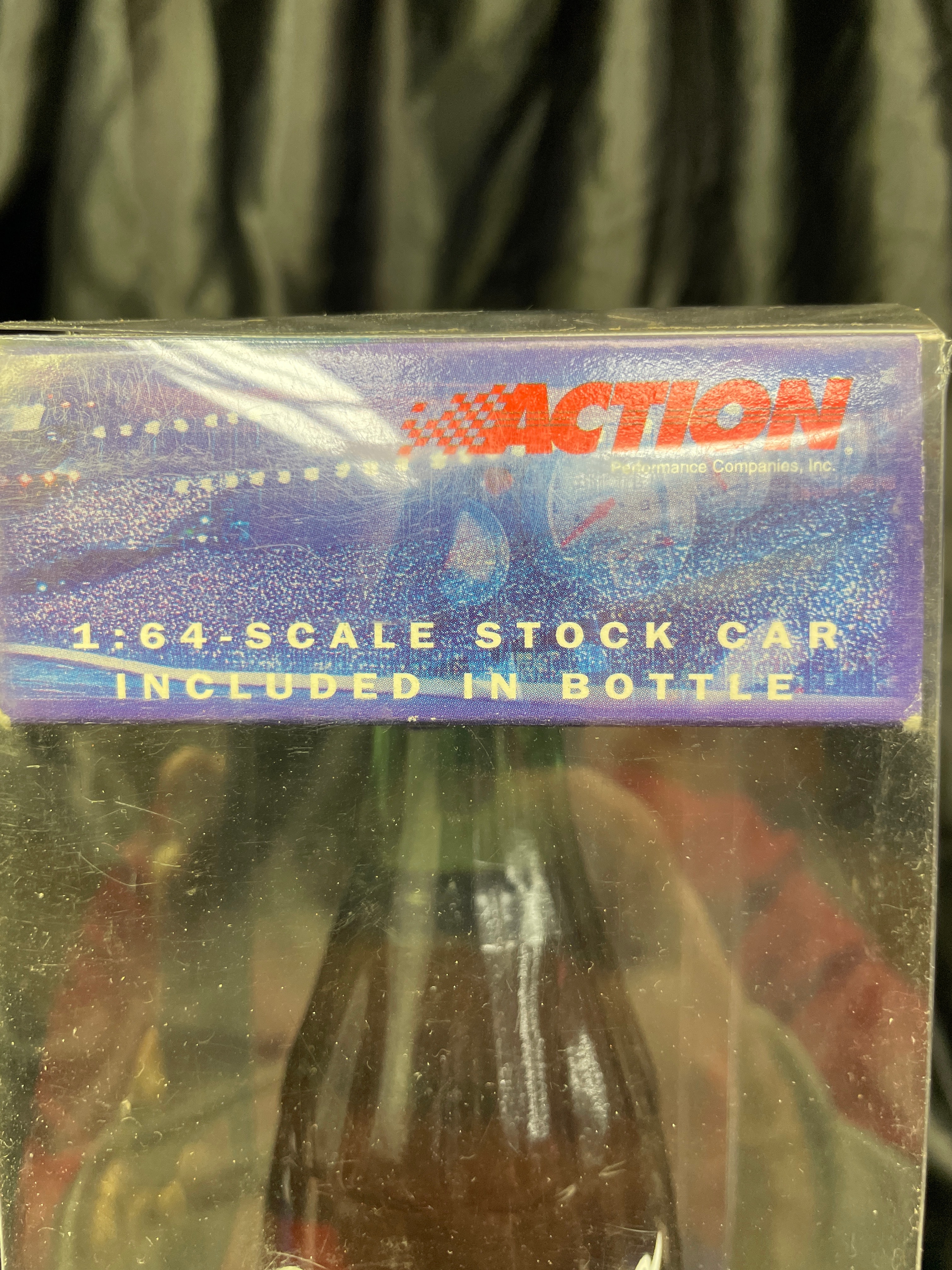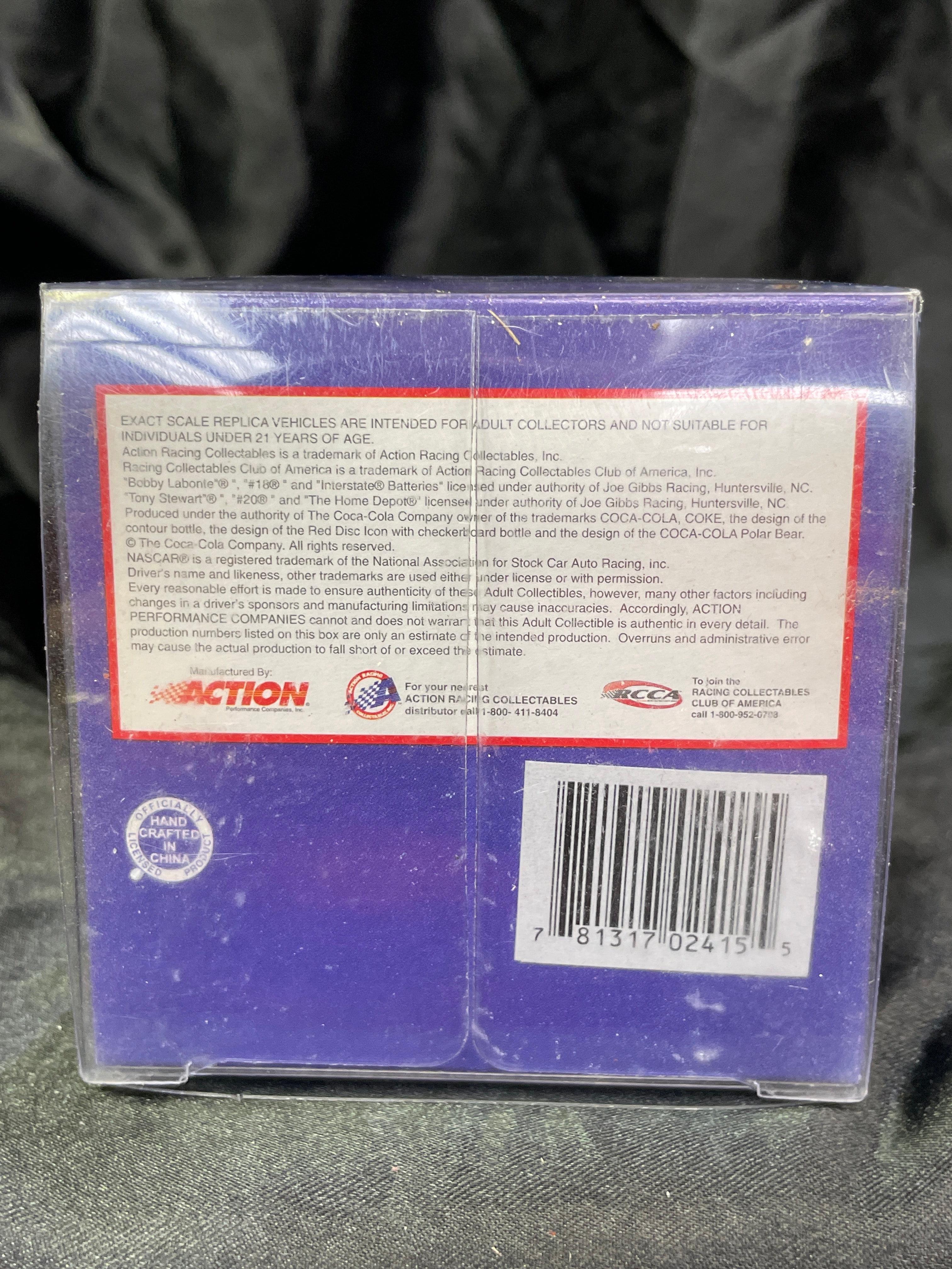 This modern collectible features a Bobby Labonte 2001 Coca-Cola Polar Bear 1:64 diecast car, produced by Action Racing Collectables. The miniature dark-colored glass contour bottle, bearing the iconic white “Coca-Cola” script, houses the 1:64-scale stock car. It is presented within a clear plastic display box, accented with blue and purple patterned cardboard elements. The packaging prominently displays “ACTION” and “NASCAR” logos, indicating an officially licensed product. Further details on the packaging identify it as “MADE IN CHINA” and intended for adult collectors, referencing “Bobby Labonte” and “Joe Gibbs Racing Collectables.” A UPC barcode, 7 81317 02415 5, is visible on the reverse.