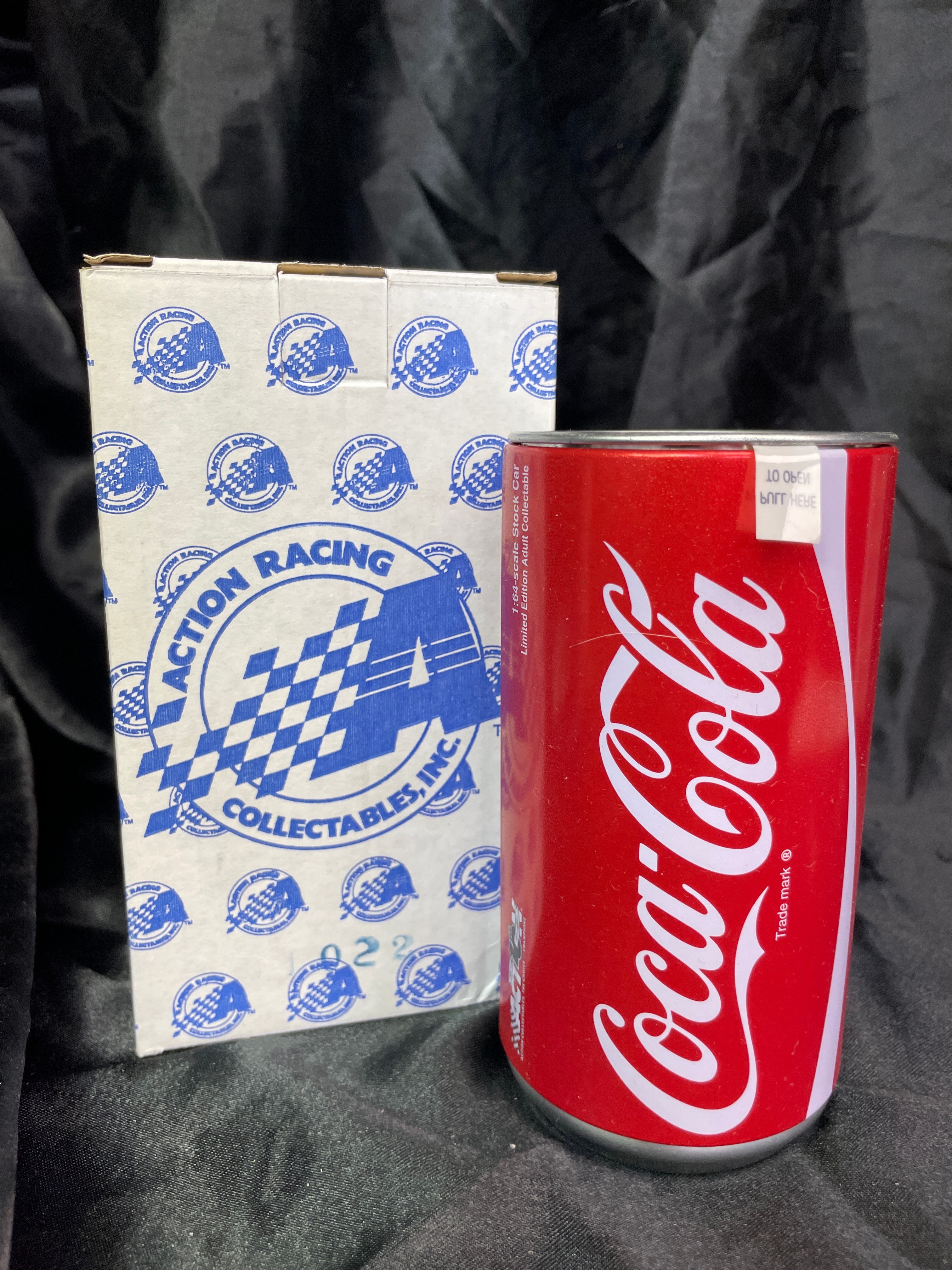 A limited edition collectible Coca-Cola beverage can, identified as containing a 1/64 scale diecast model of Dale Earnhardt’s #2 1980 Ventura. The can is standard red and white with the classic Coca-Cola script logo. It is housed in its original branded cardboard box. Both the can’s base and the box’s side feature identical silver labels, clearly stating “Dale Earnhardt #2 Coke 1980 Ventura, ” identifying it as “1 of 61,680” with P/N 102058. The white box is adorned with repeating blue “ACTION RACING COLLECTABLES, INC.” logos, which include a stylized “A” integrated with a checkered flag design.