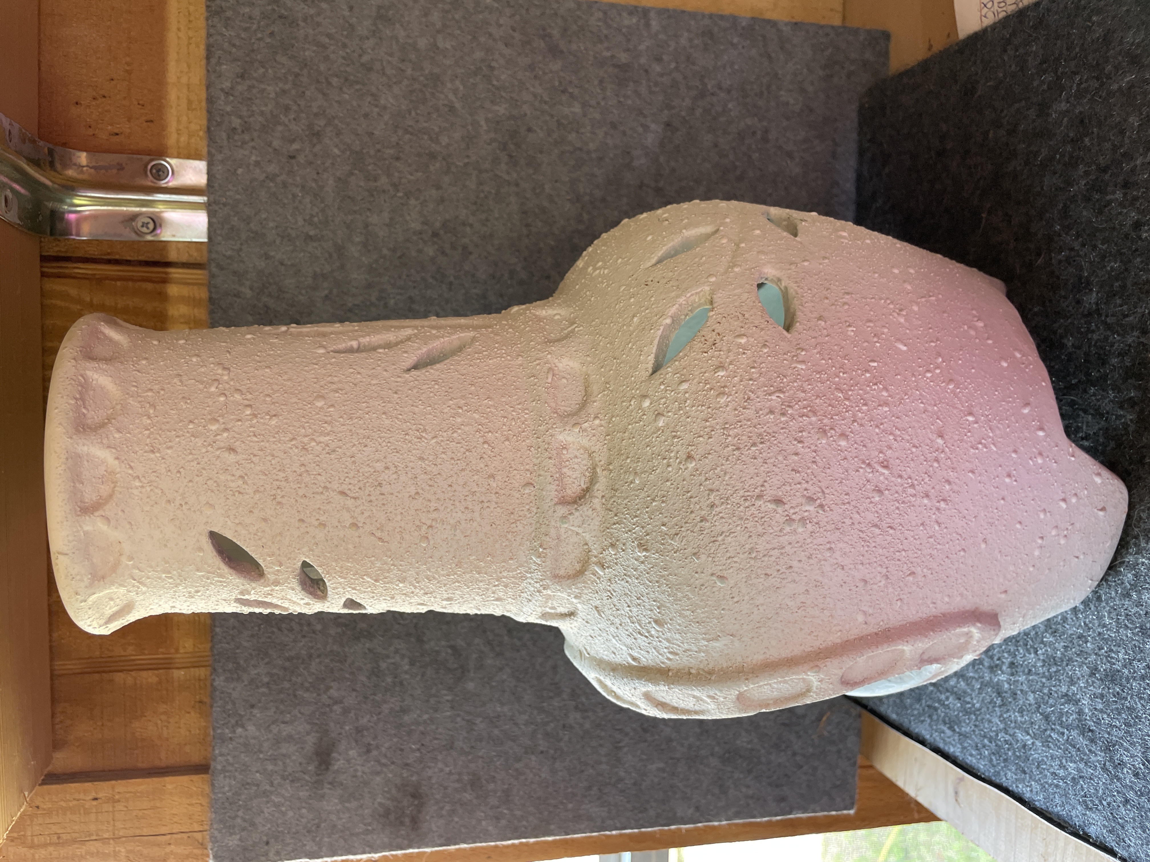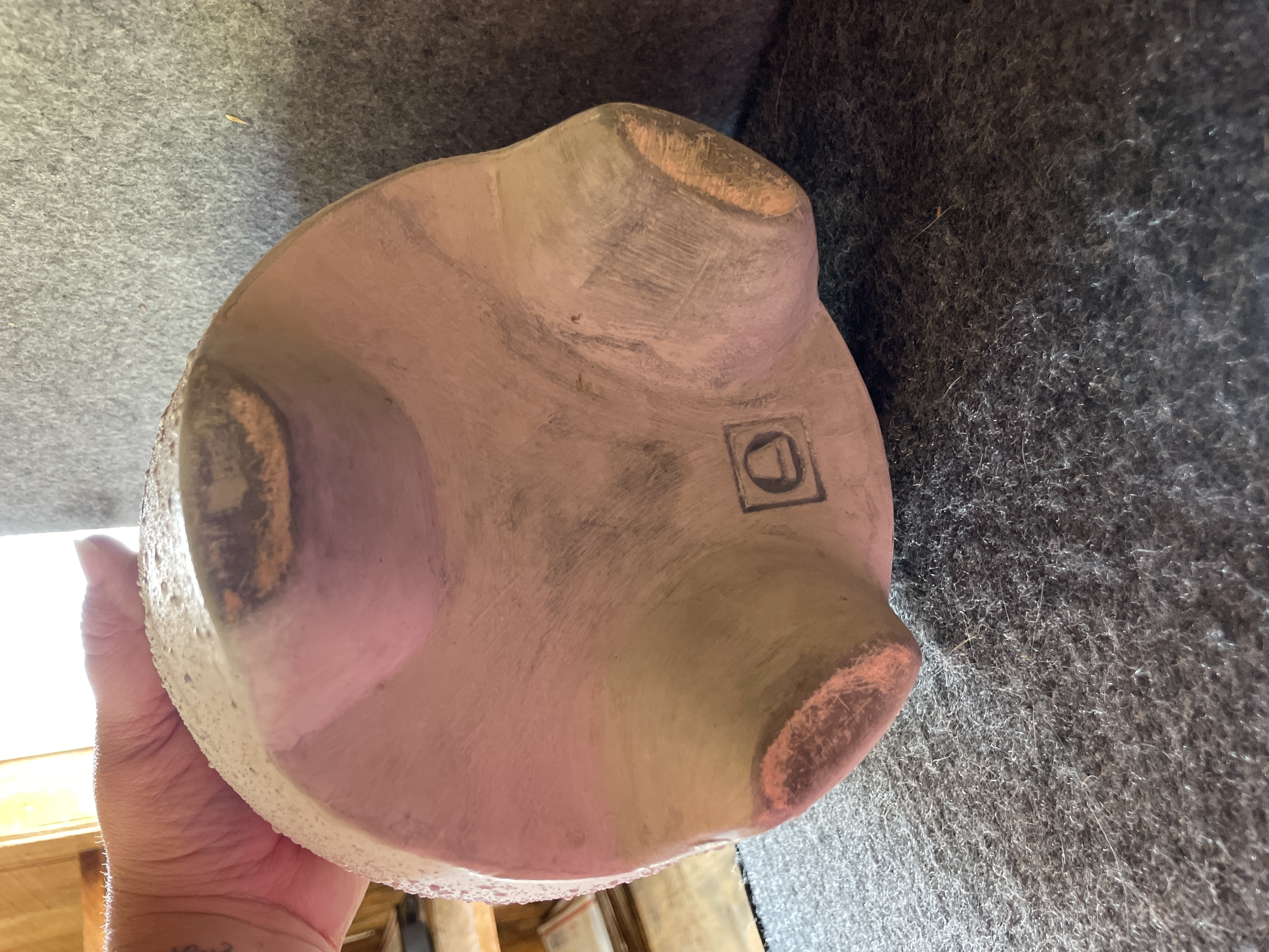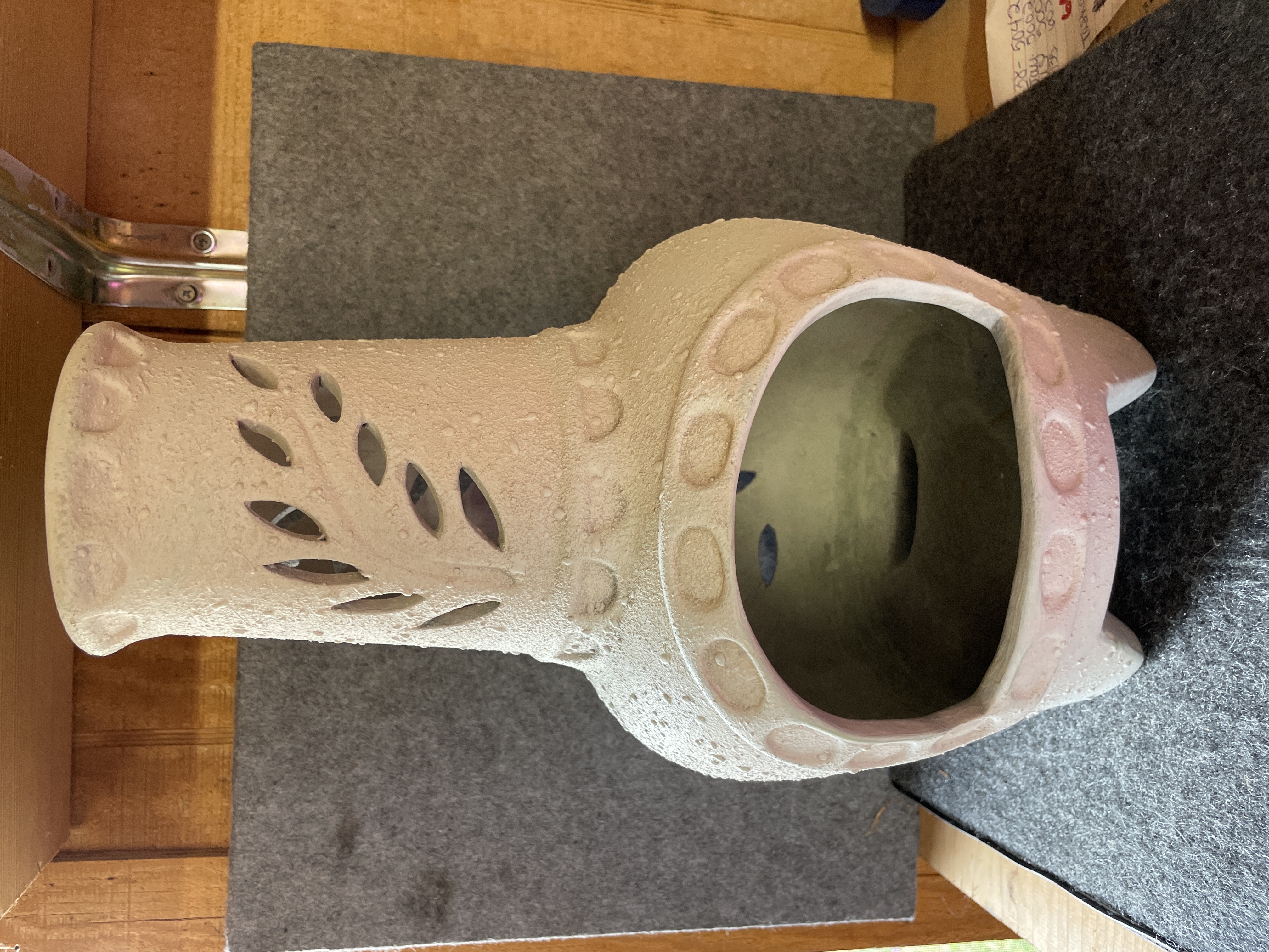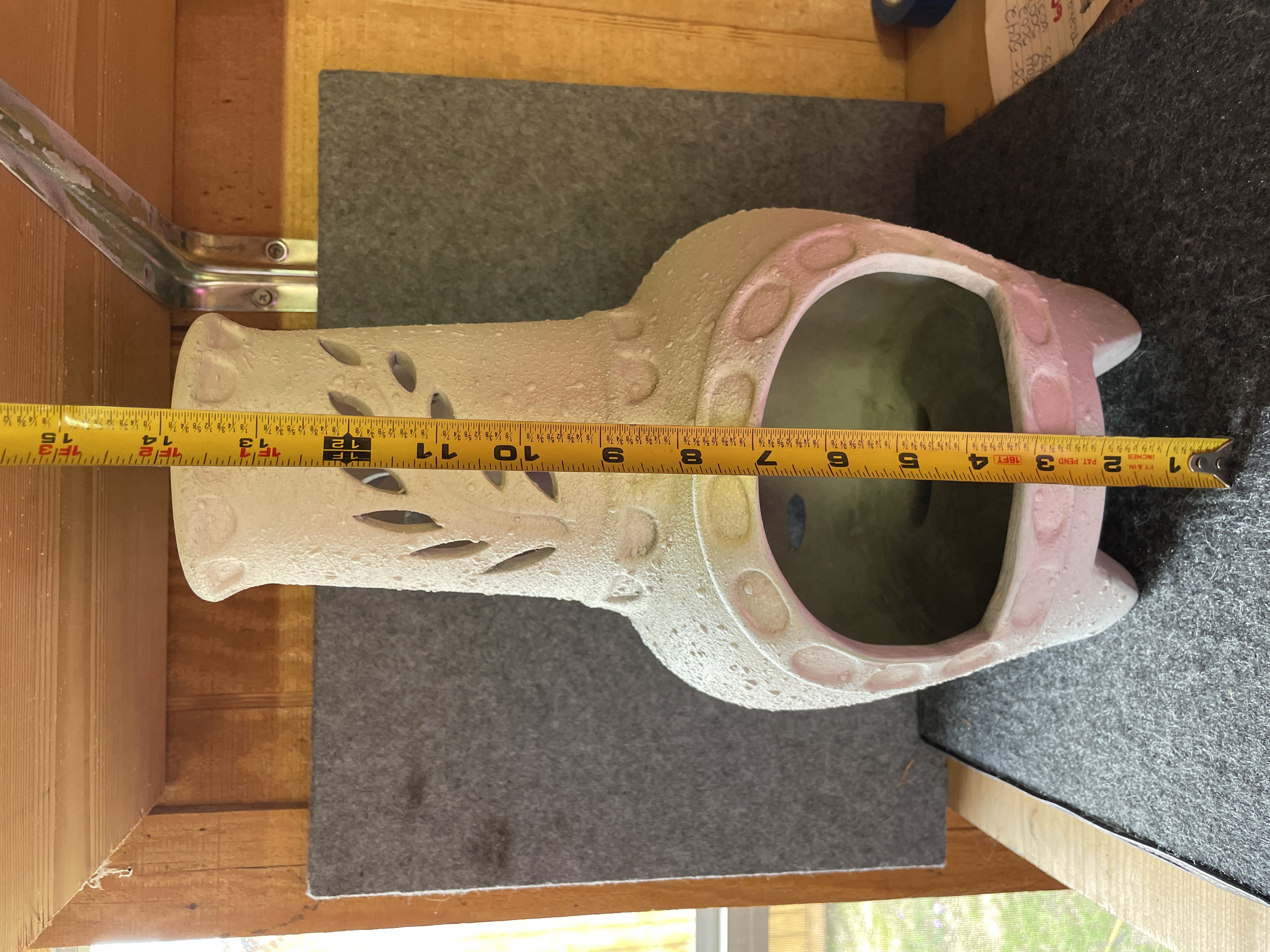 A cream-colored textured ceramic Palo Santo mini chiminea featuring leaf-shaped cutouts and a tripod base with a stamped maker’s mark, measuring approximately 13 inches in length.