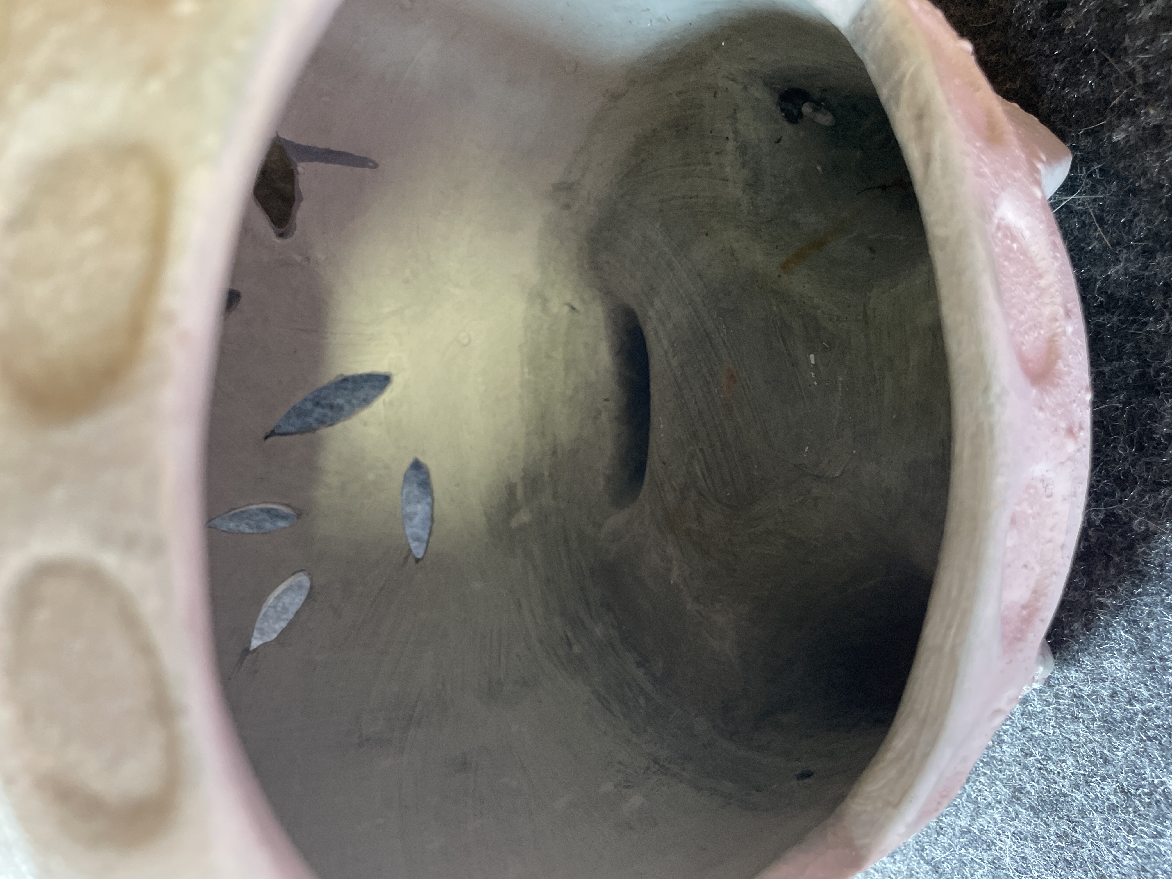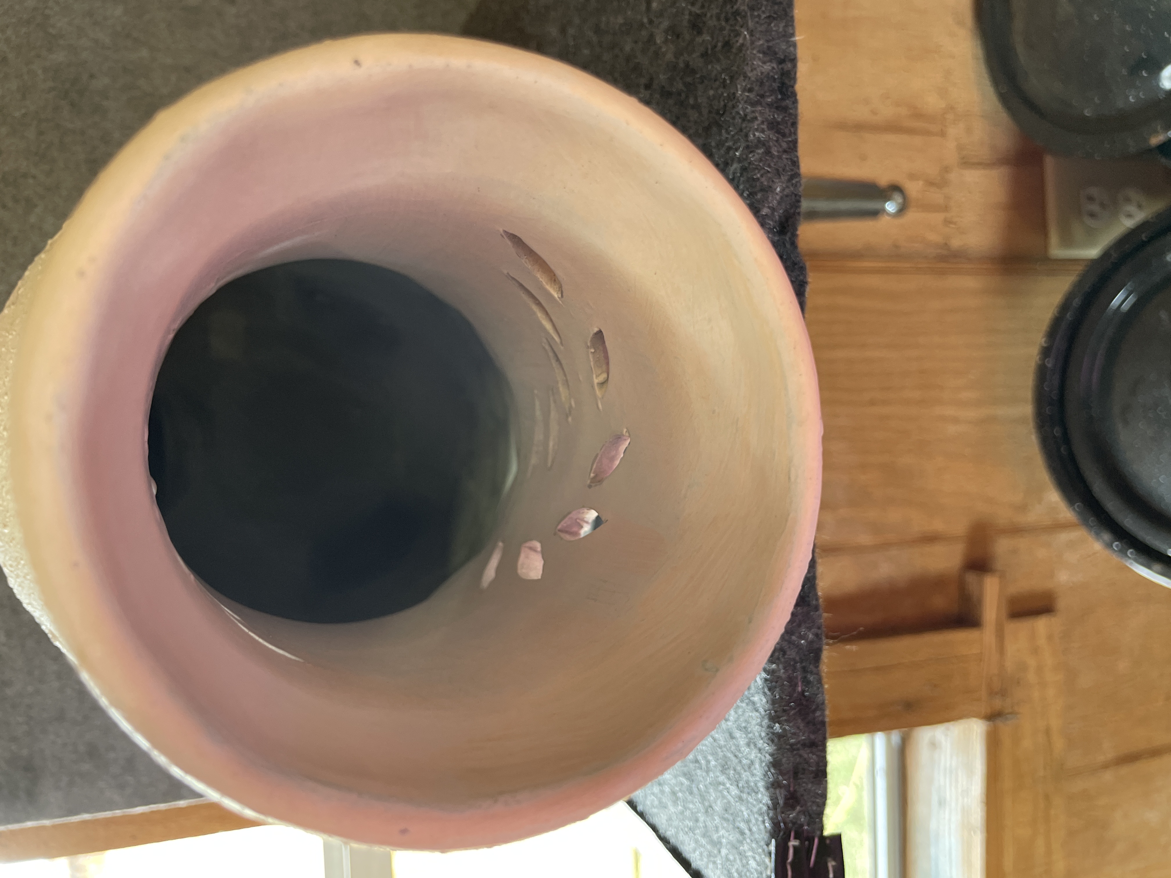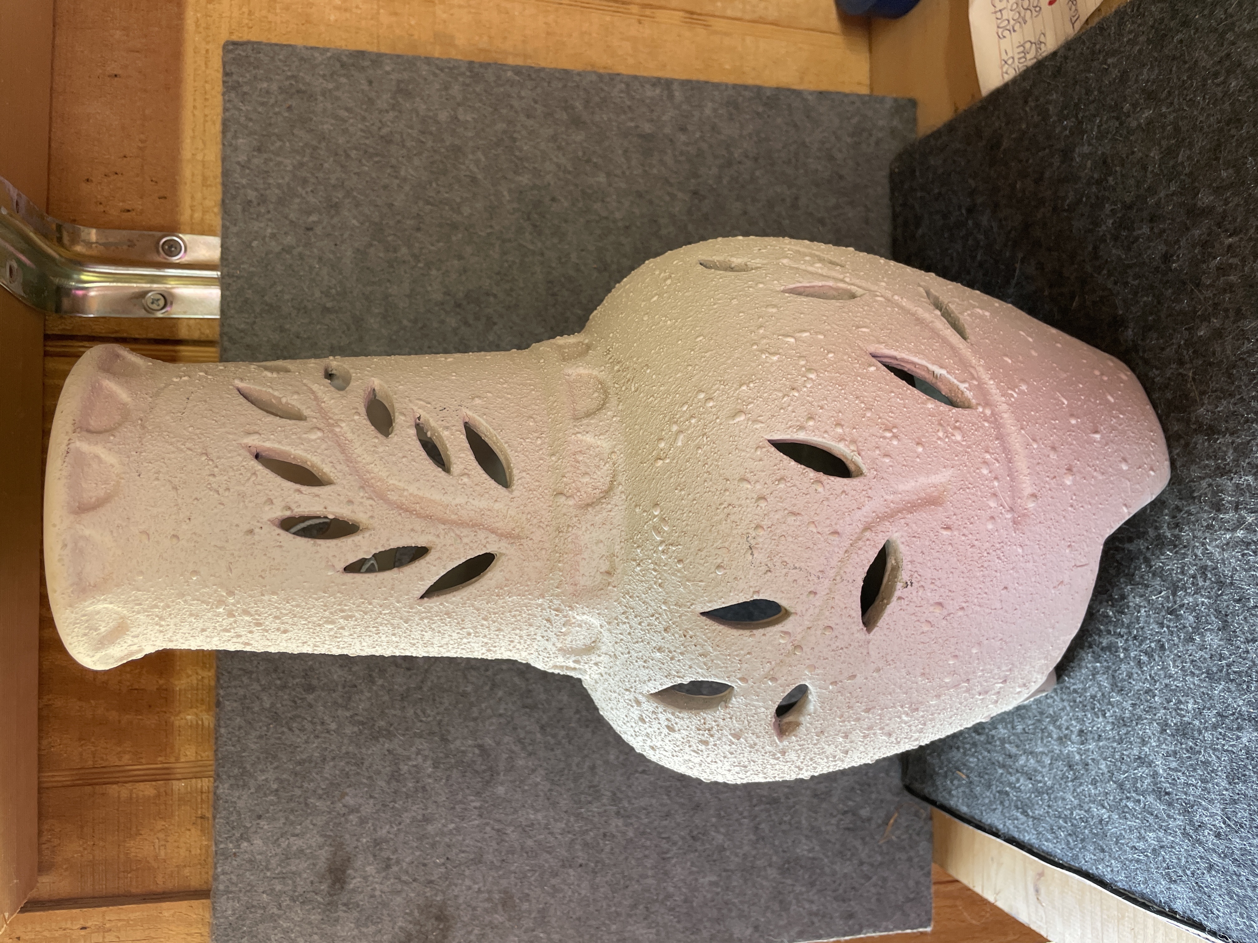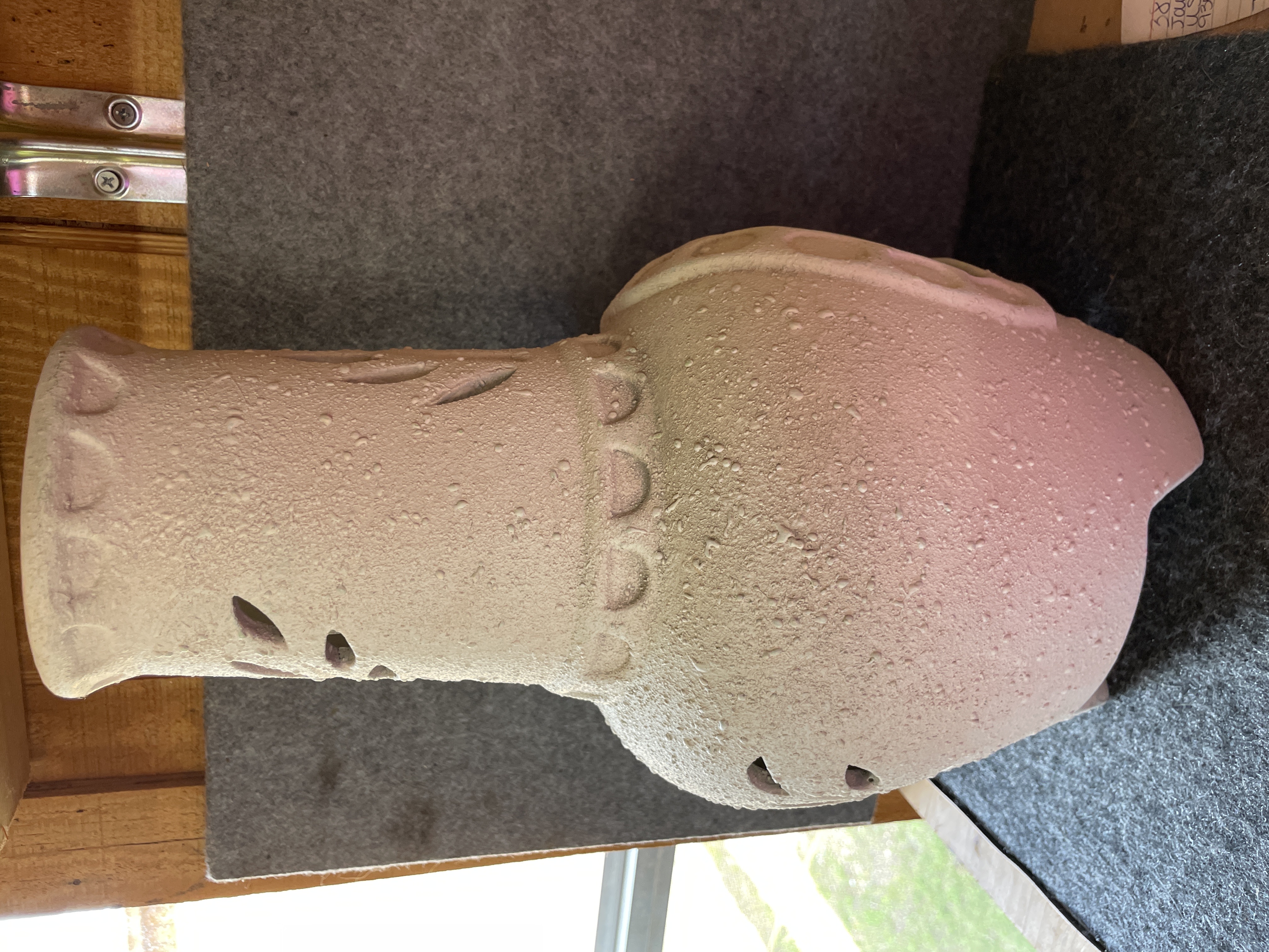 A cream-colored textured ceramic Palo Santo mini chiminea featuring leaf-shaped cutouts and a tripod base with a stamped maker’s mark, measuring approximately 13 inches in length.