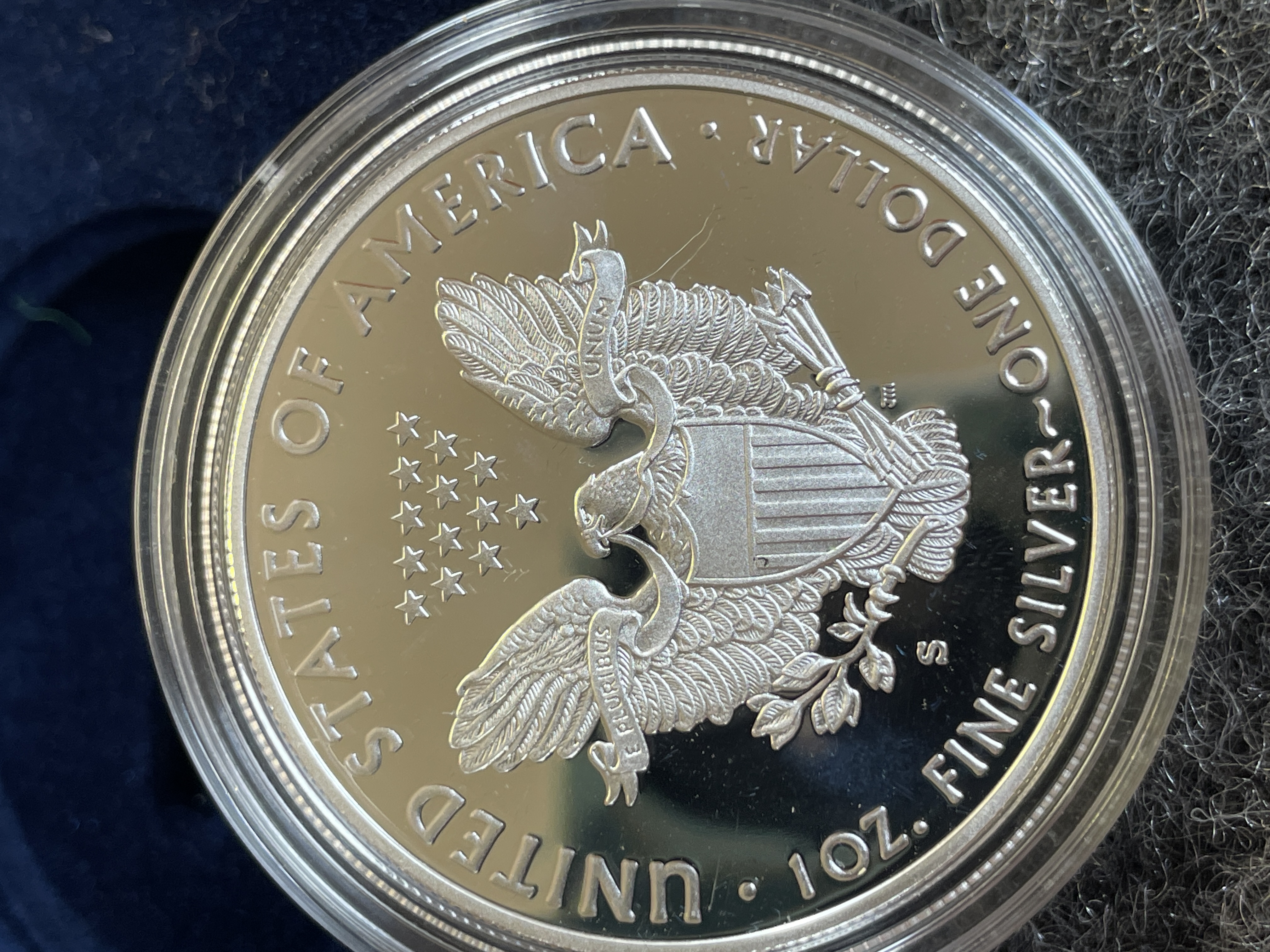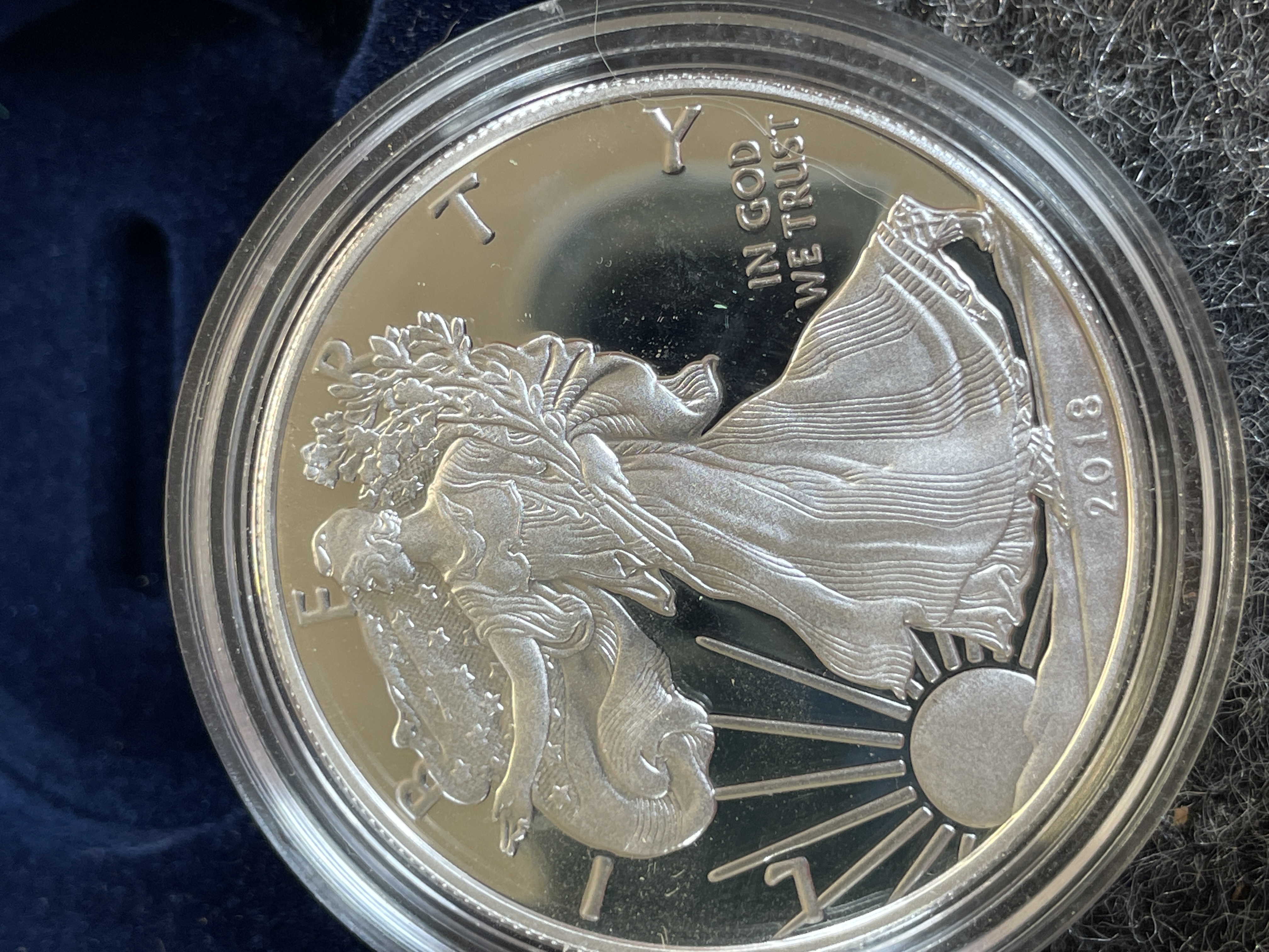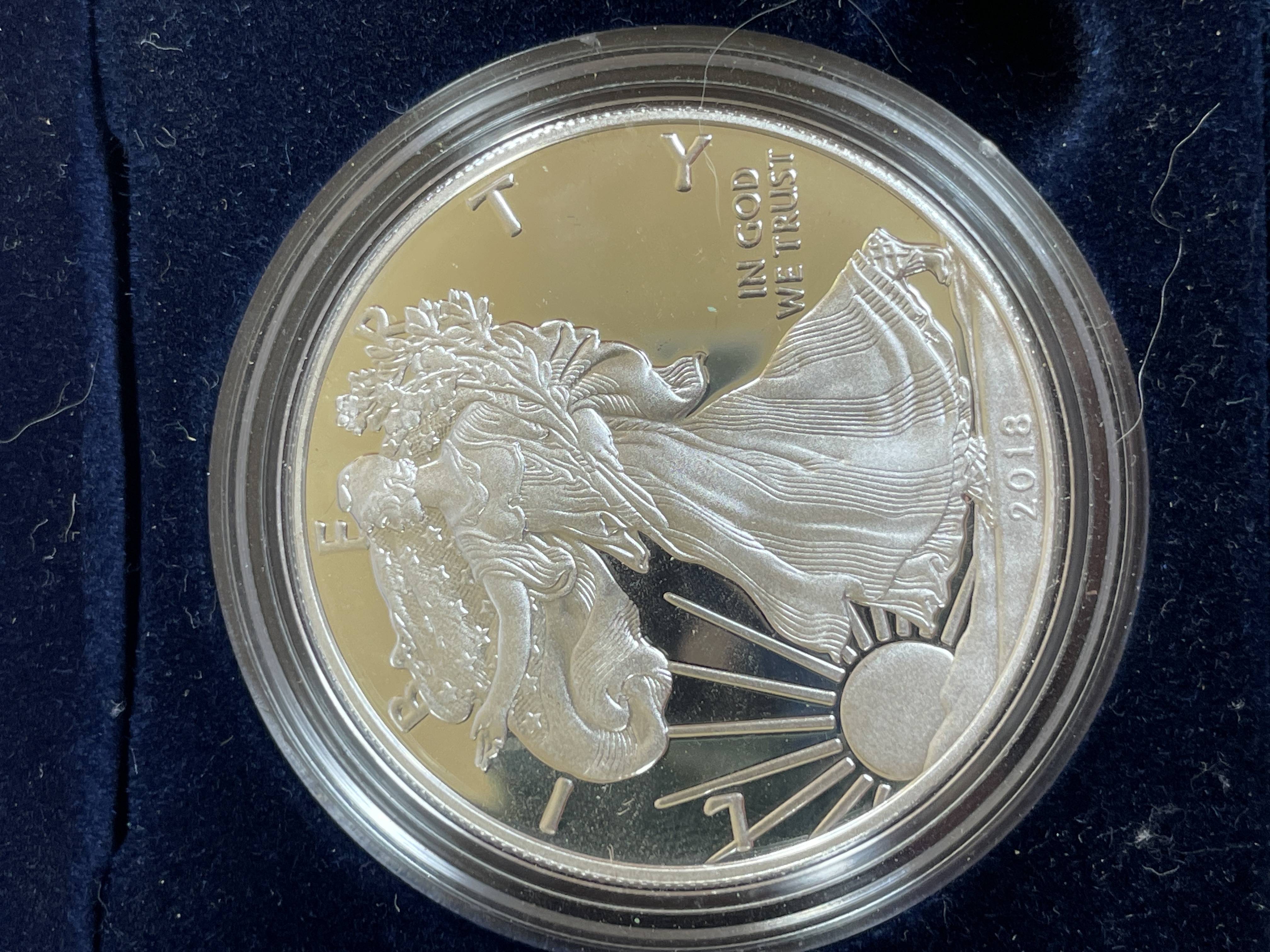 A 2018-S American Eagle one ounce silver proof coin from the United States Mint housed in its original blue presentation box.