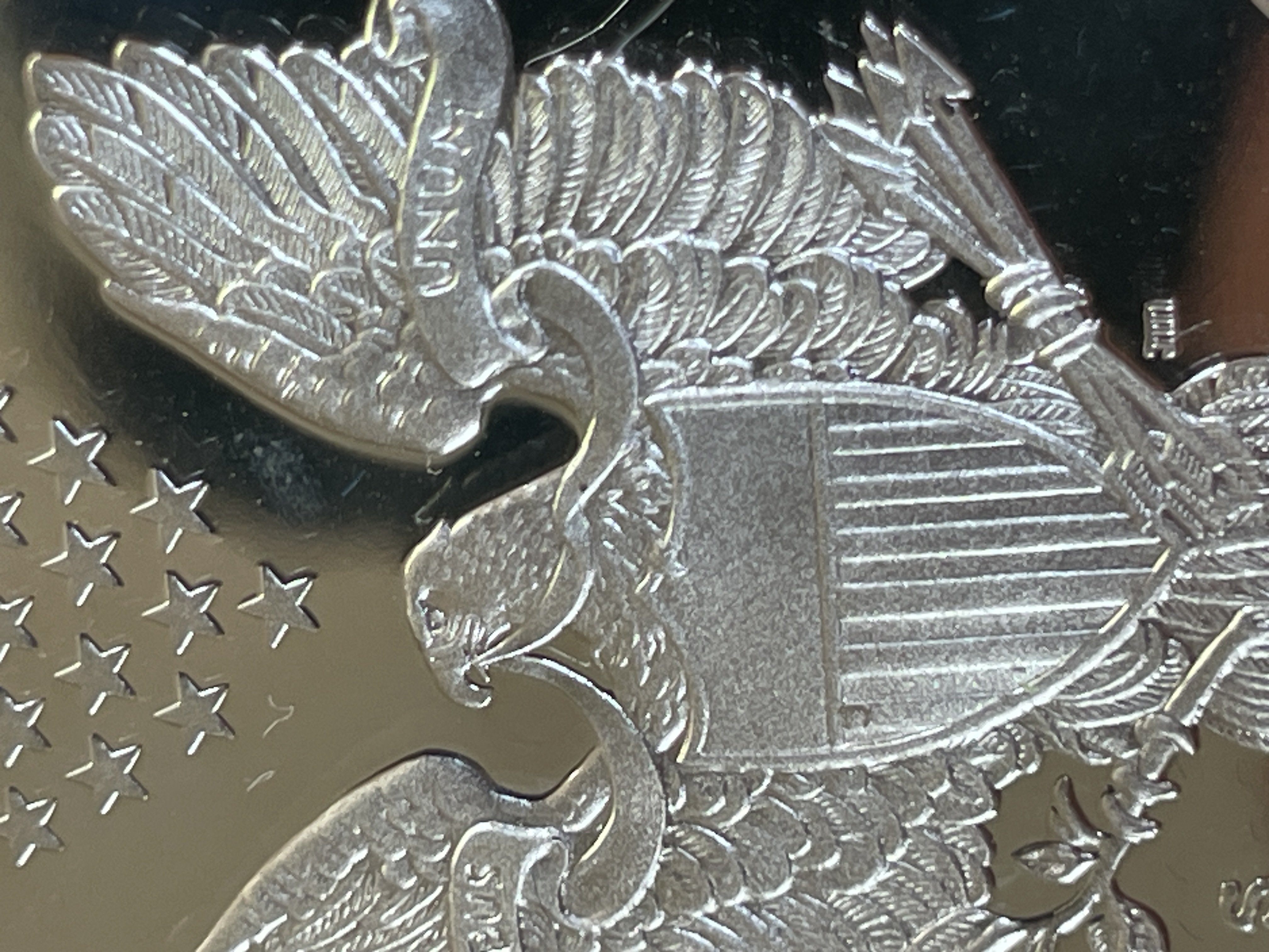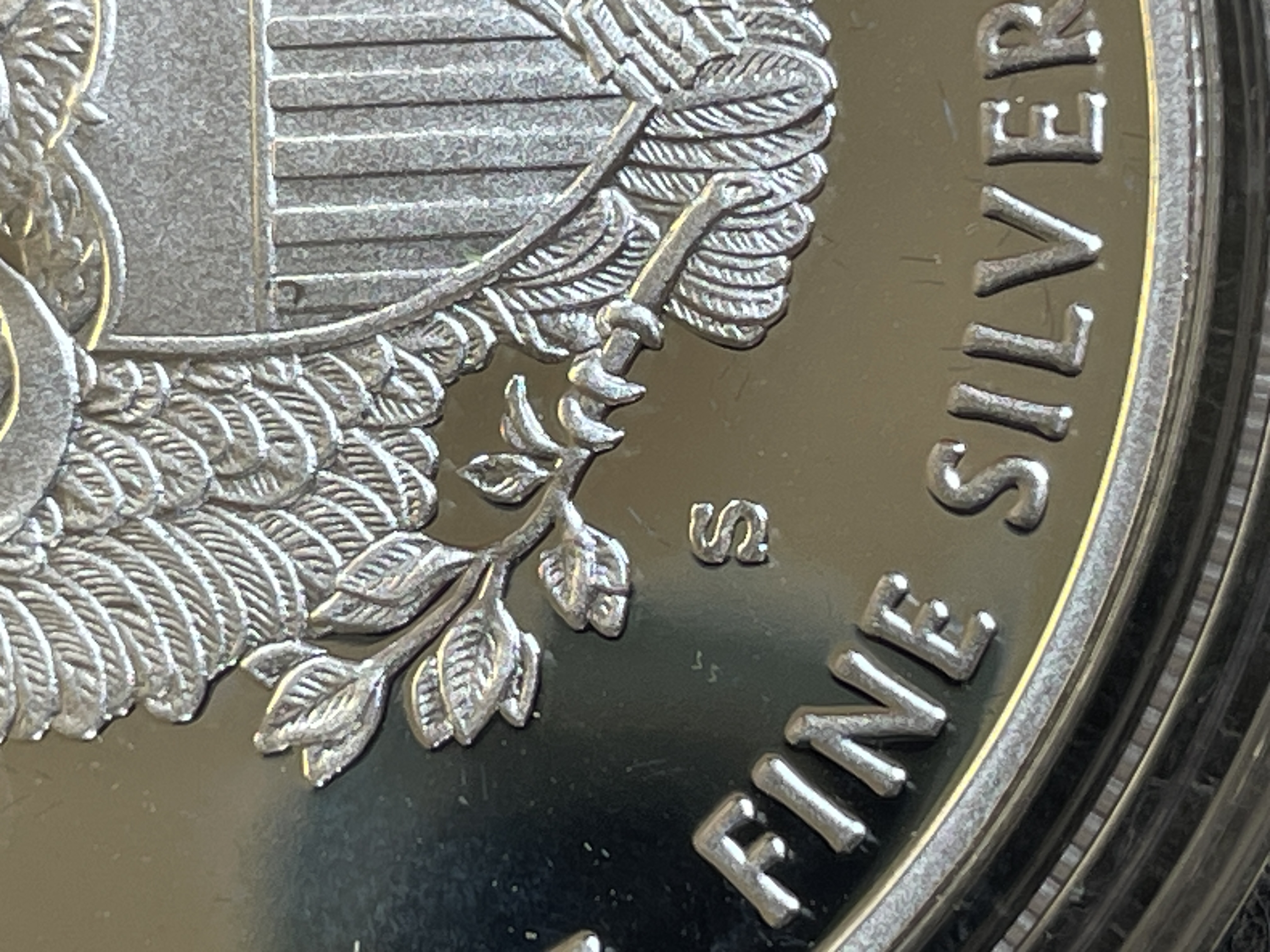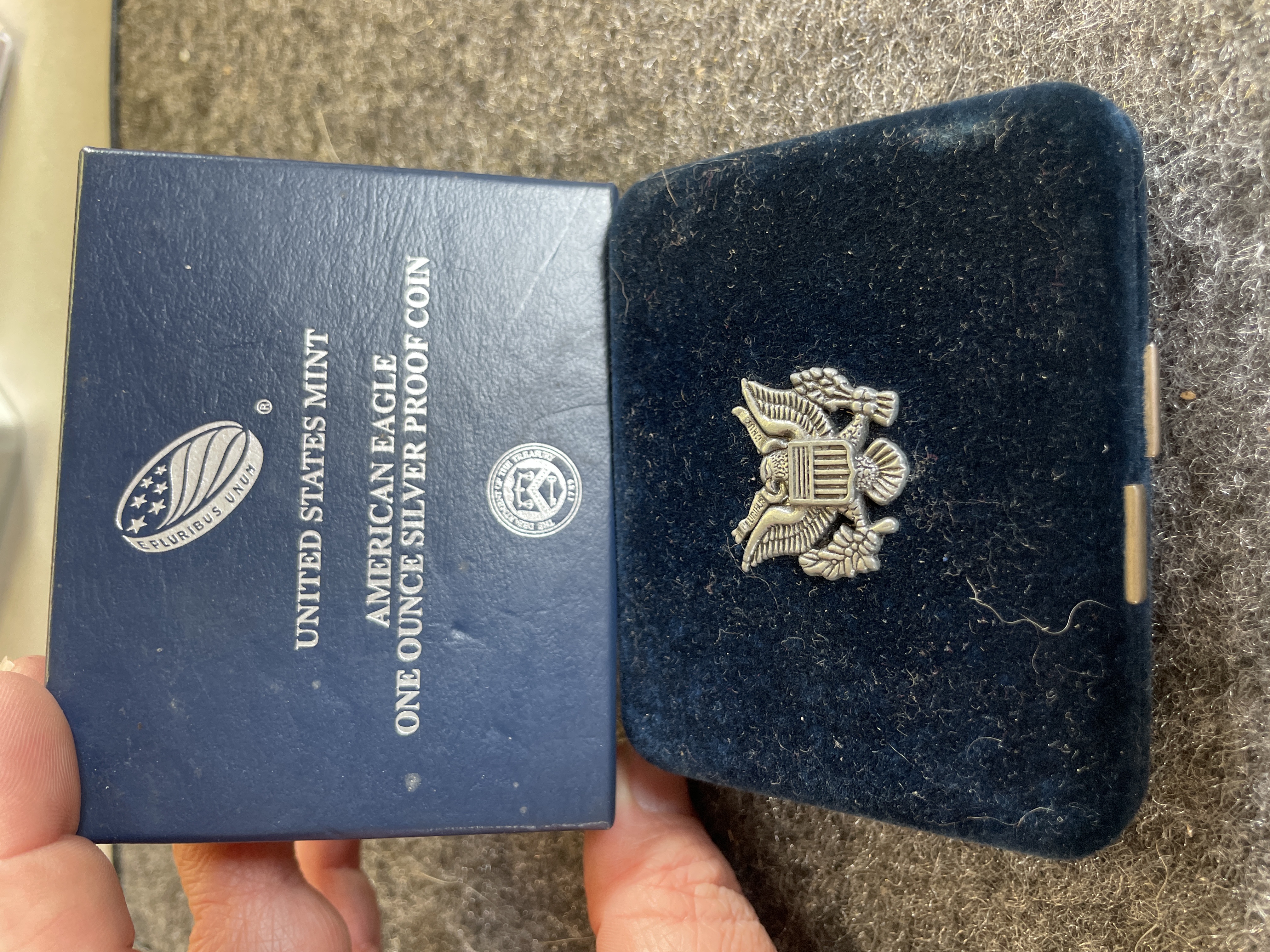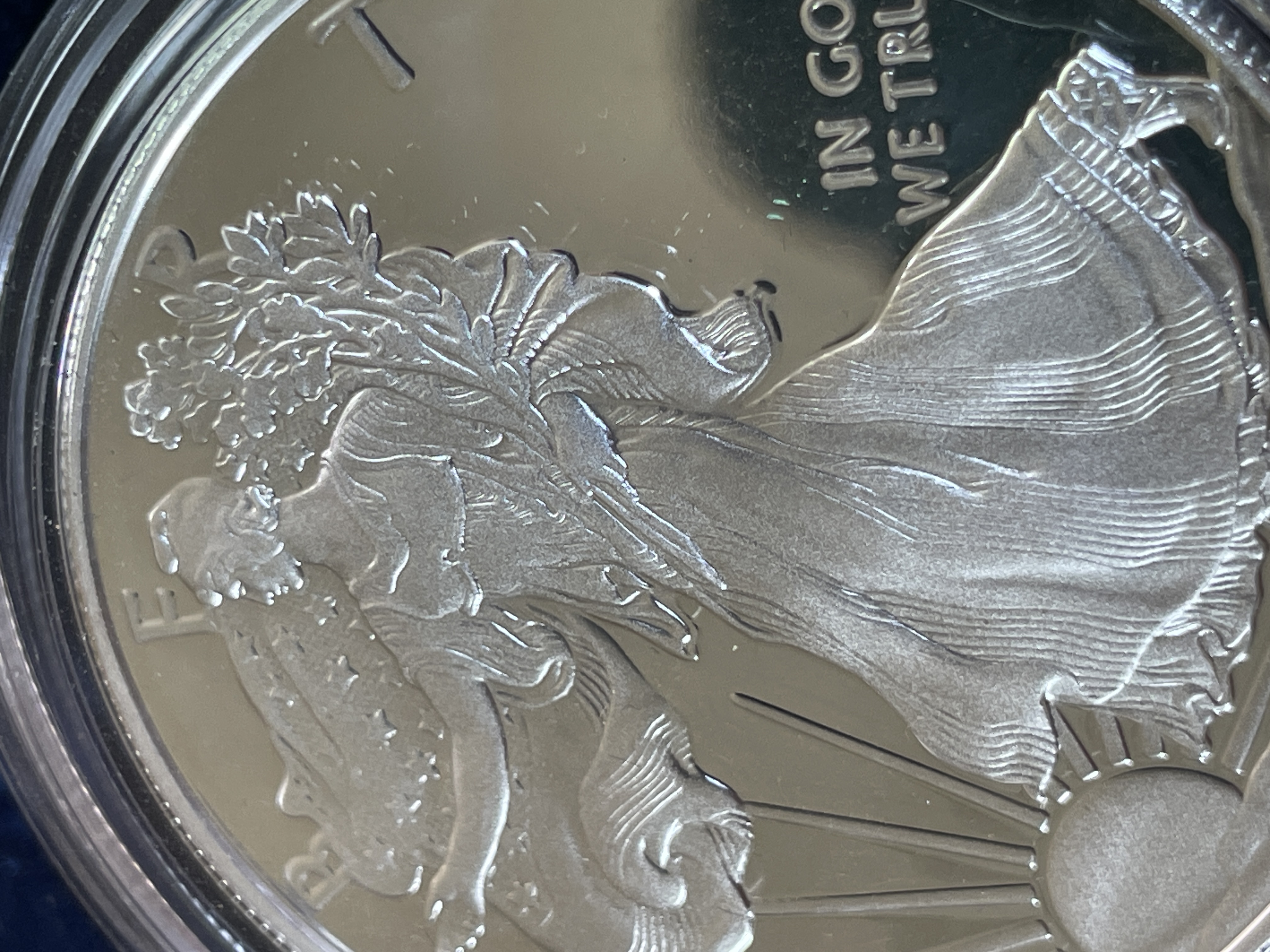 A 2018-S American Eagle one ounce silver proof coin from the United States Mint housed in its original blue presentation box.