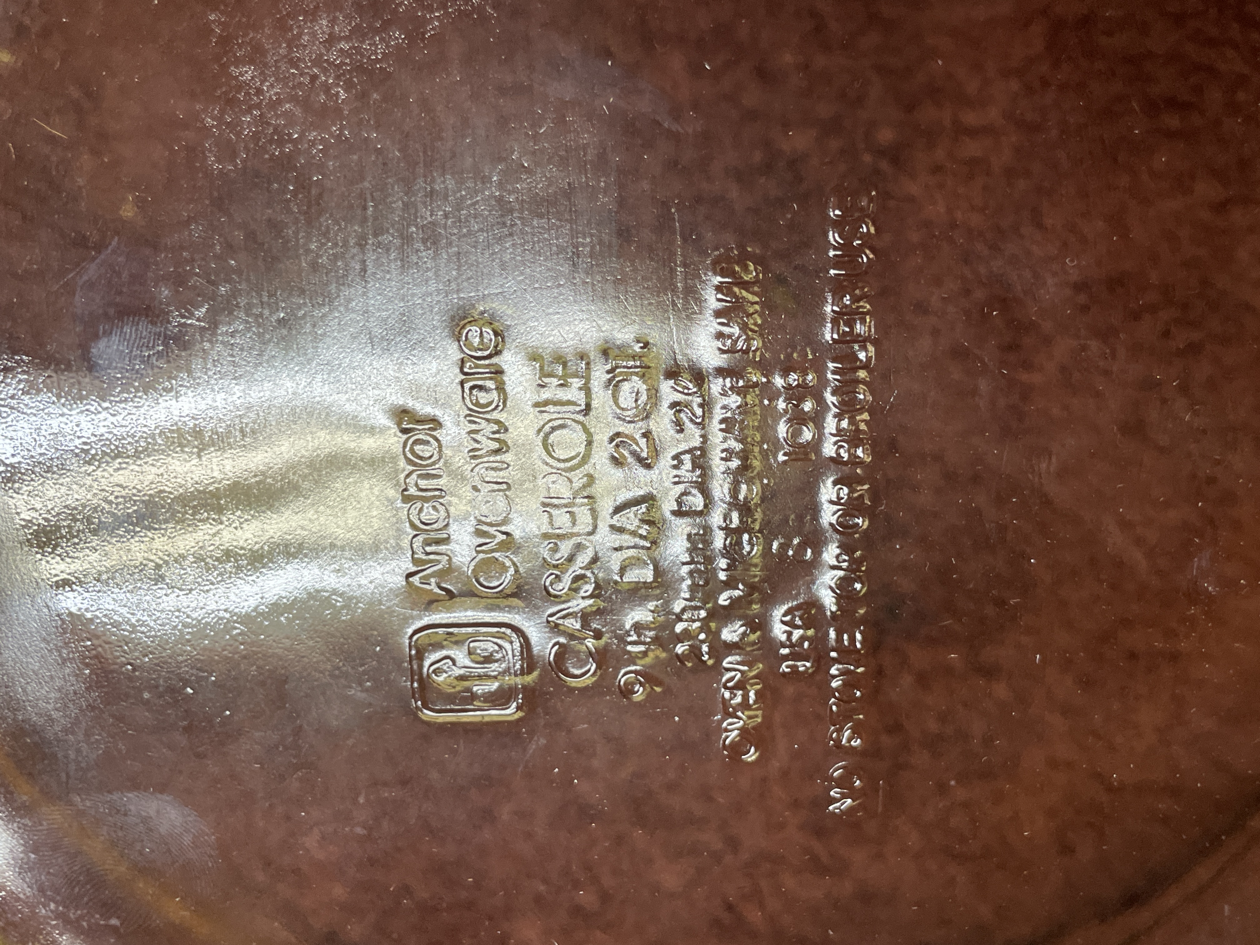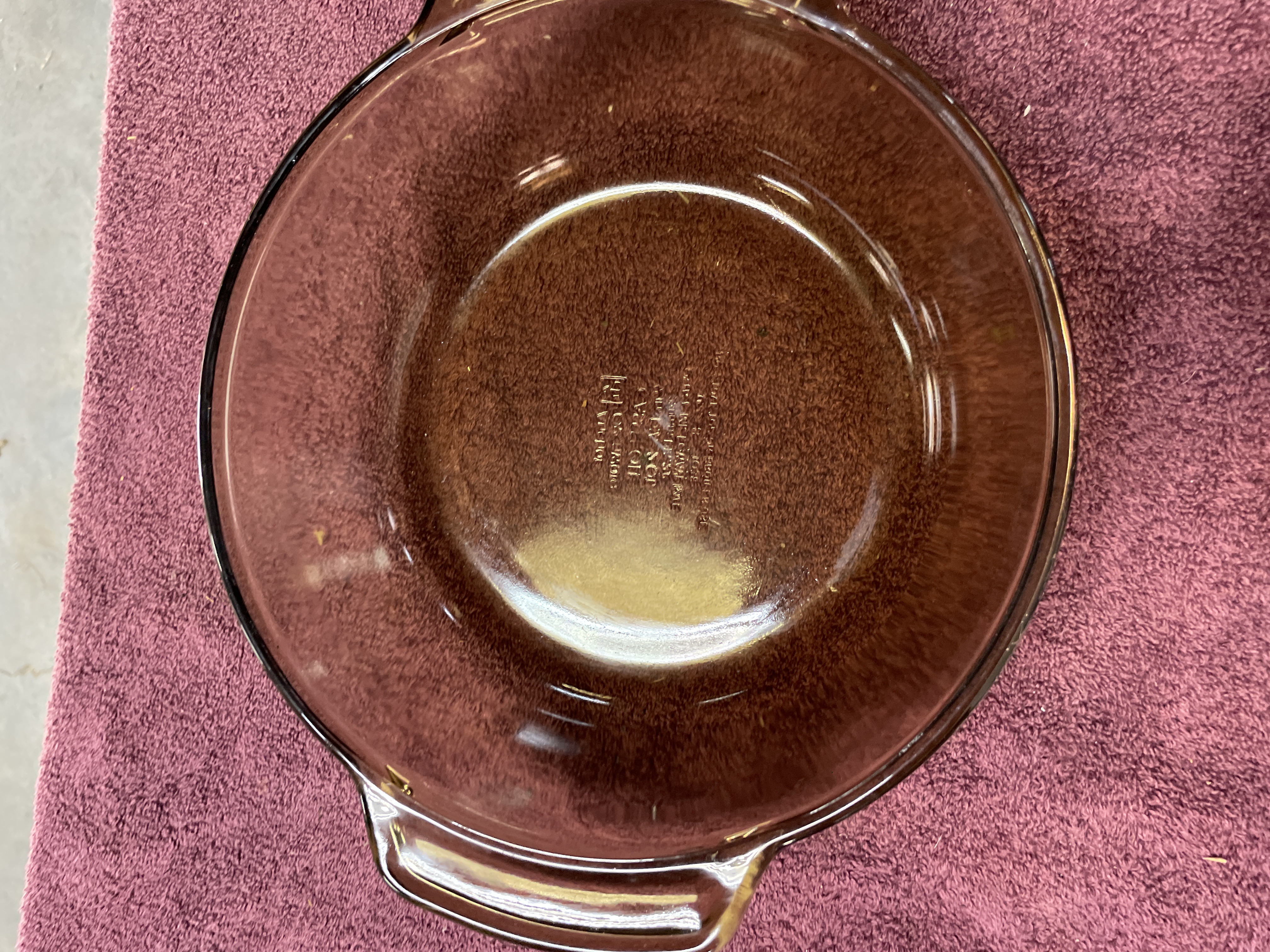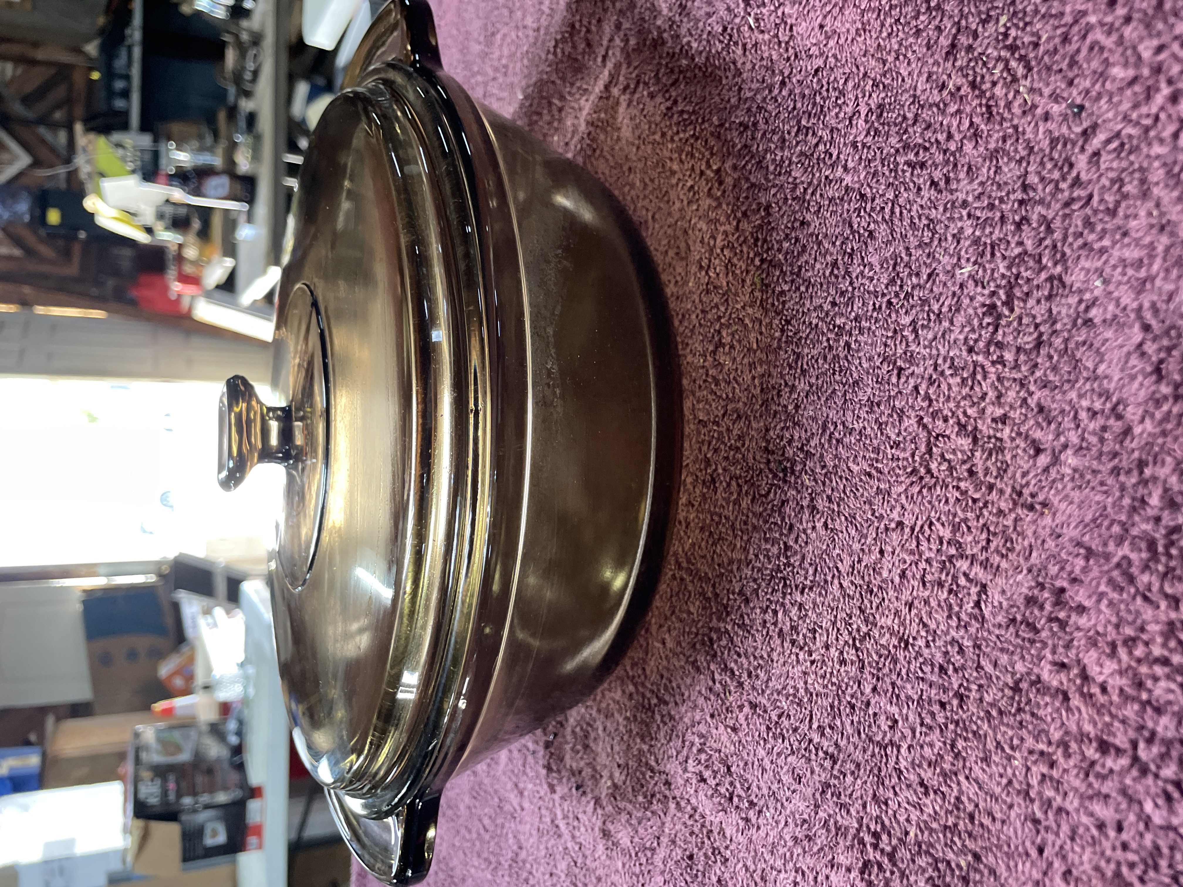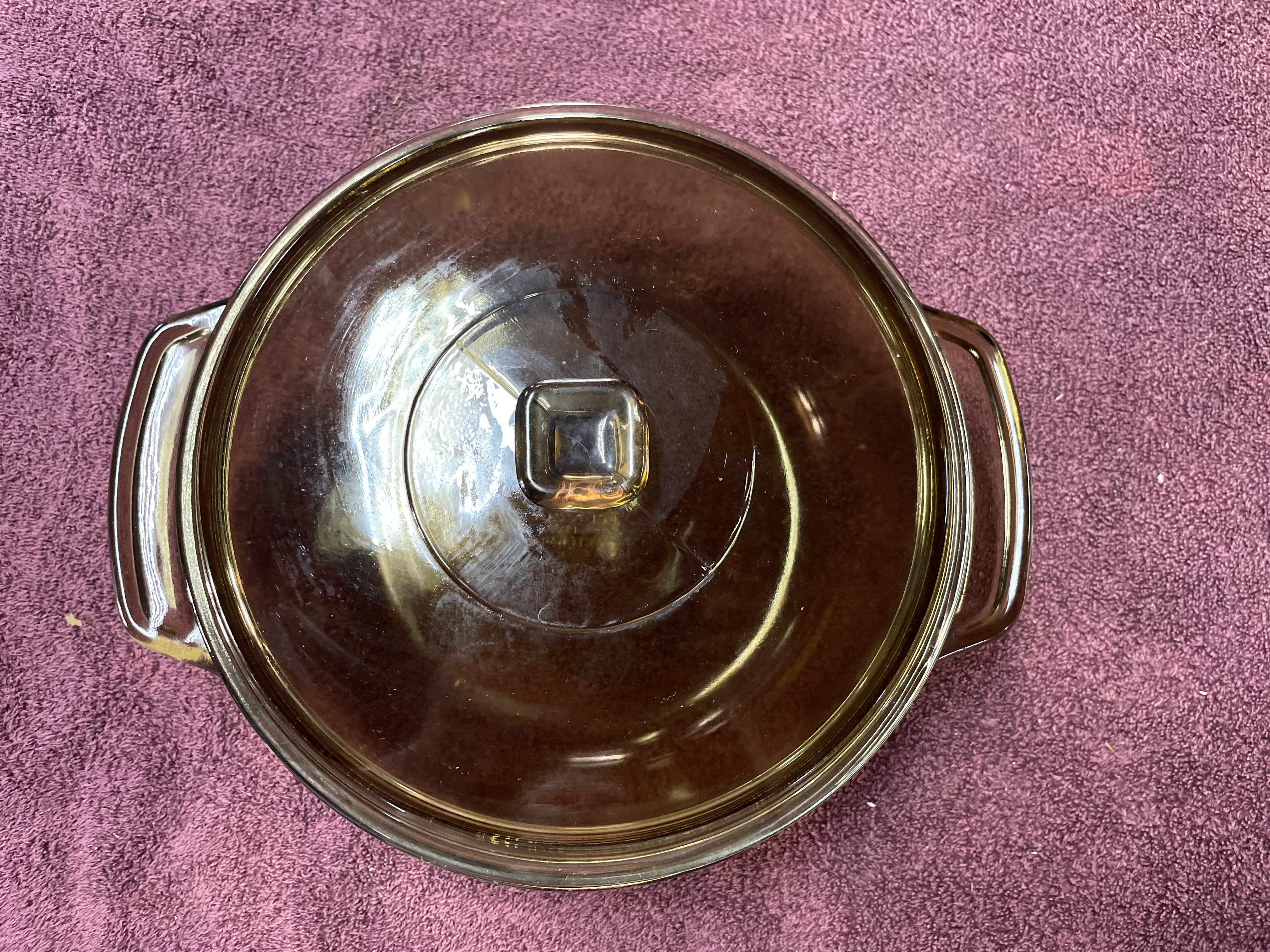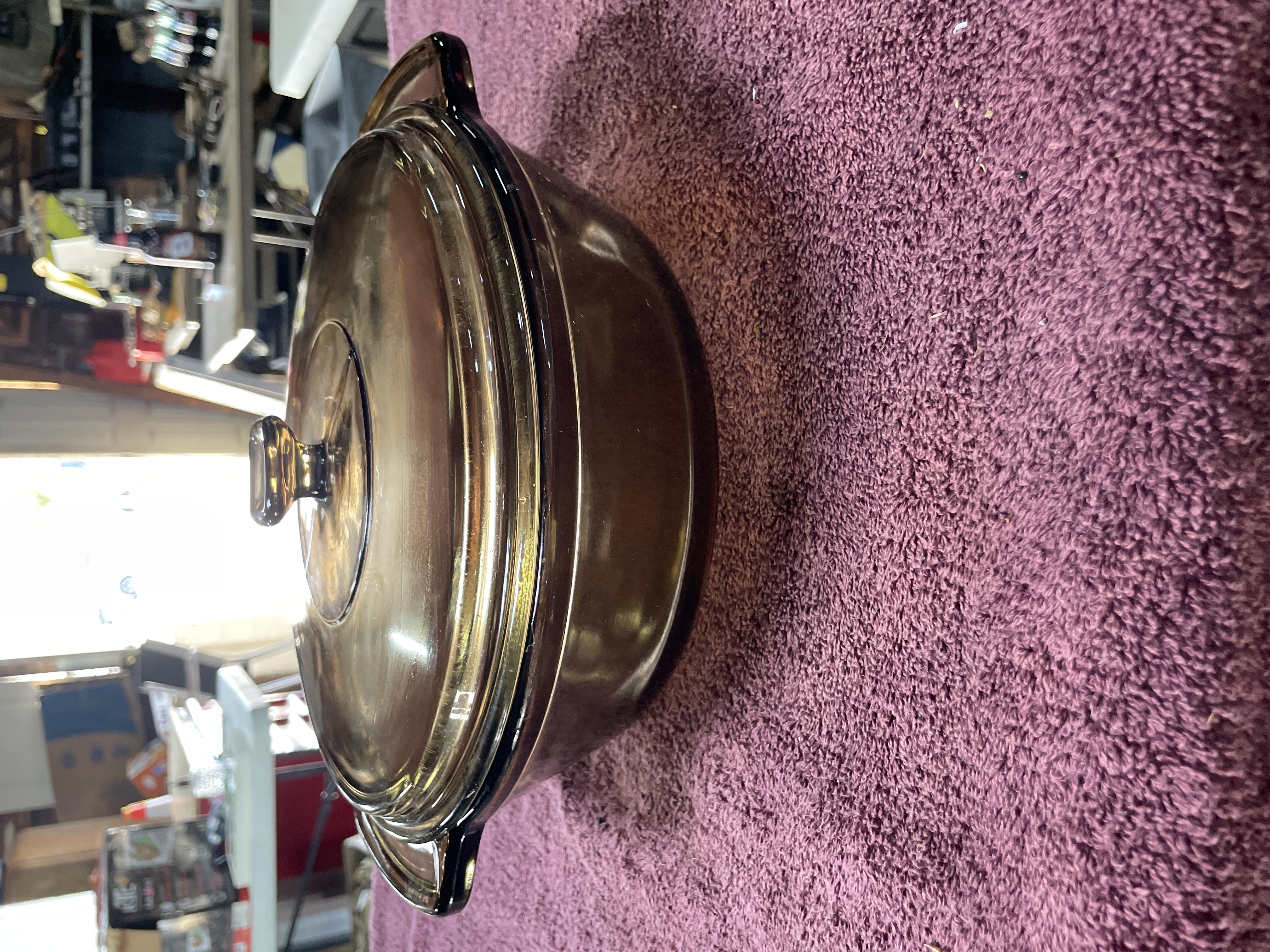 An amber glass round casserole dish with a matching lid, measuring 9 inches in diameter with a 2-quart capacity.