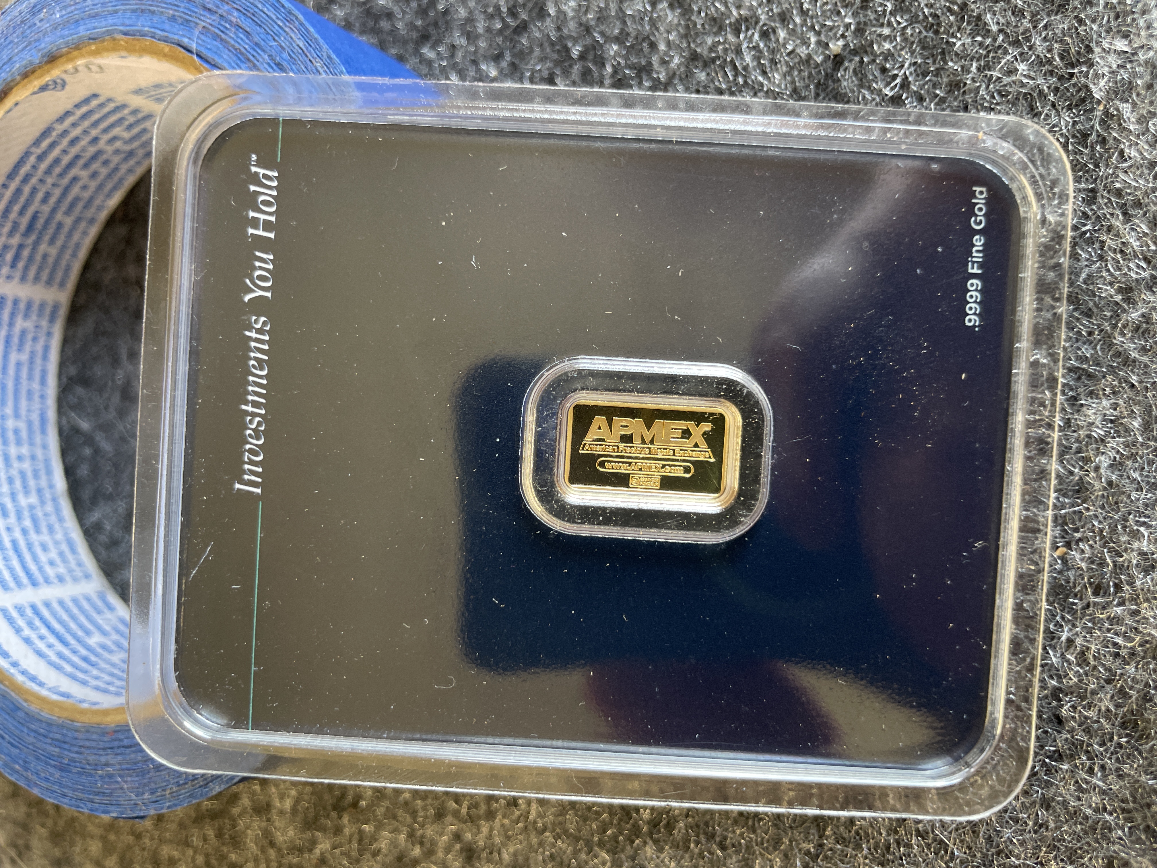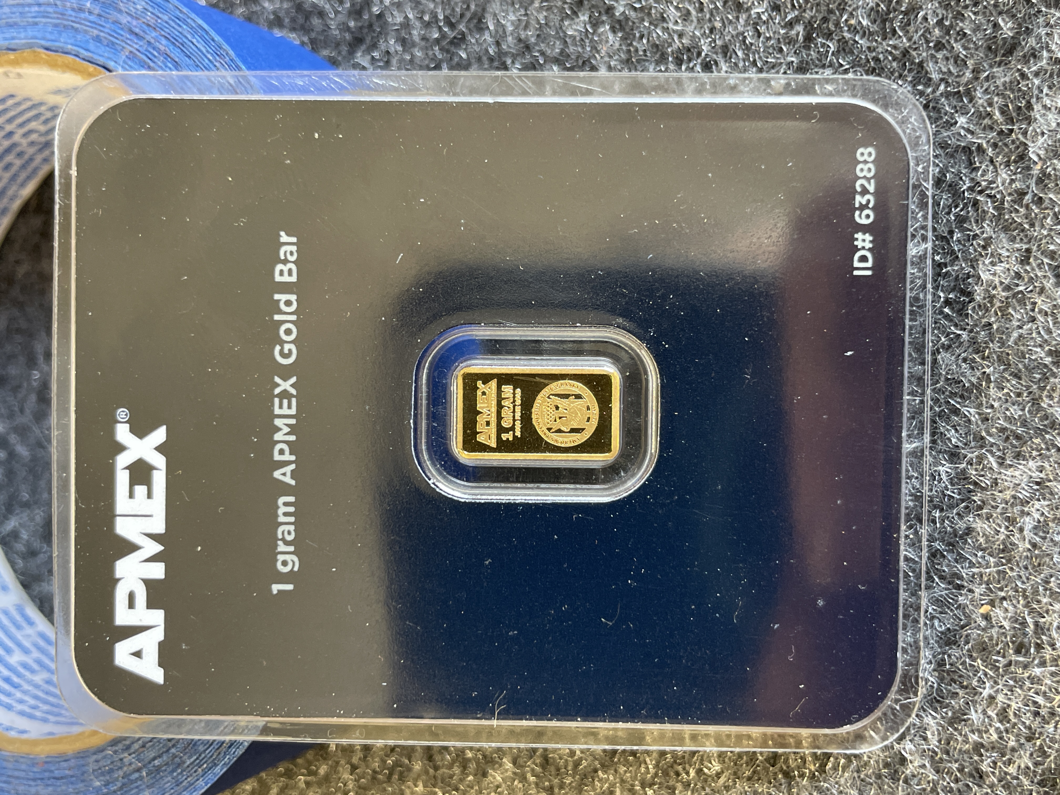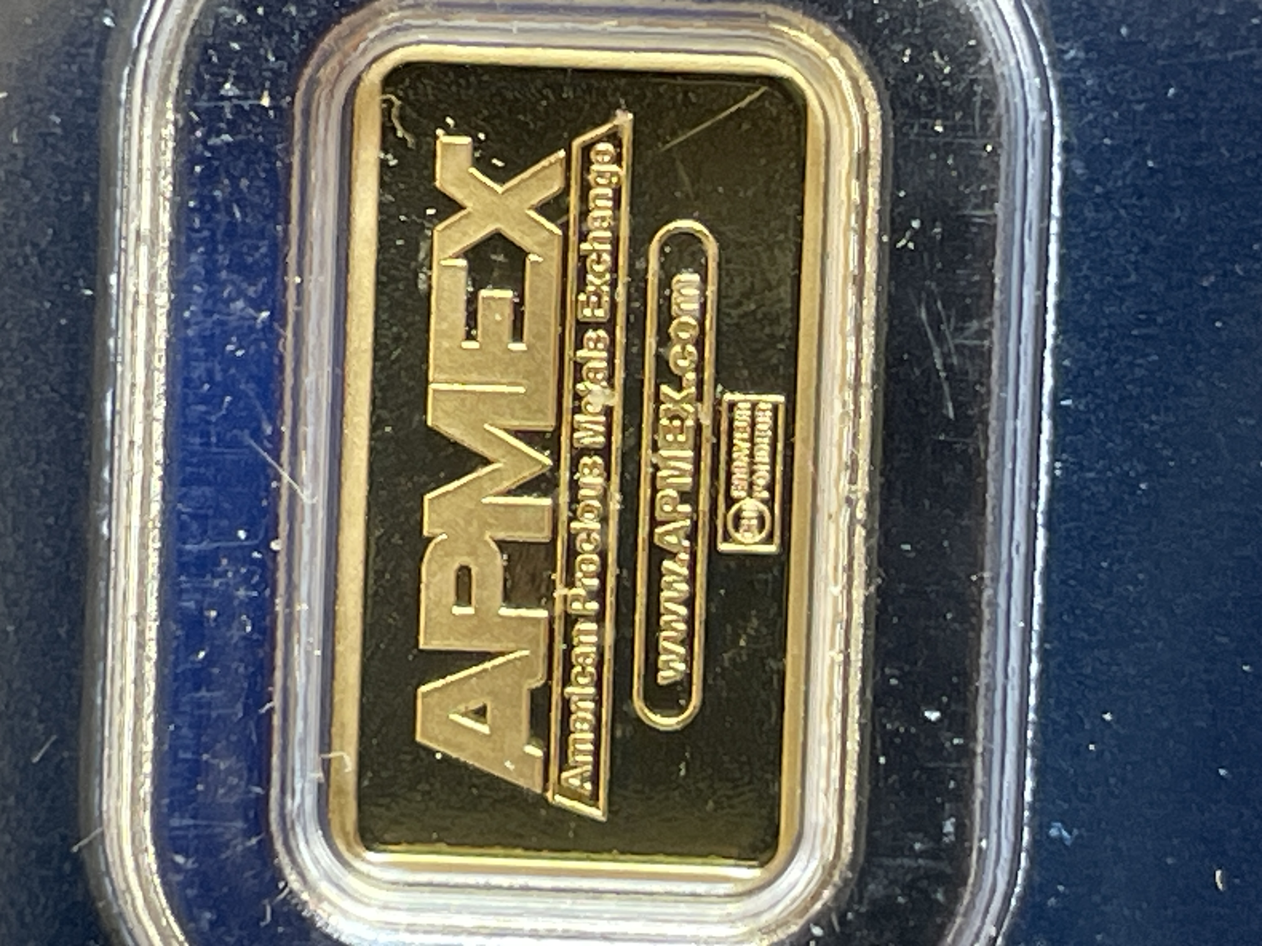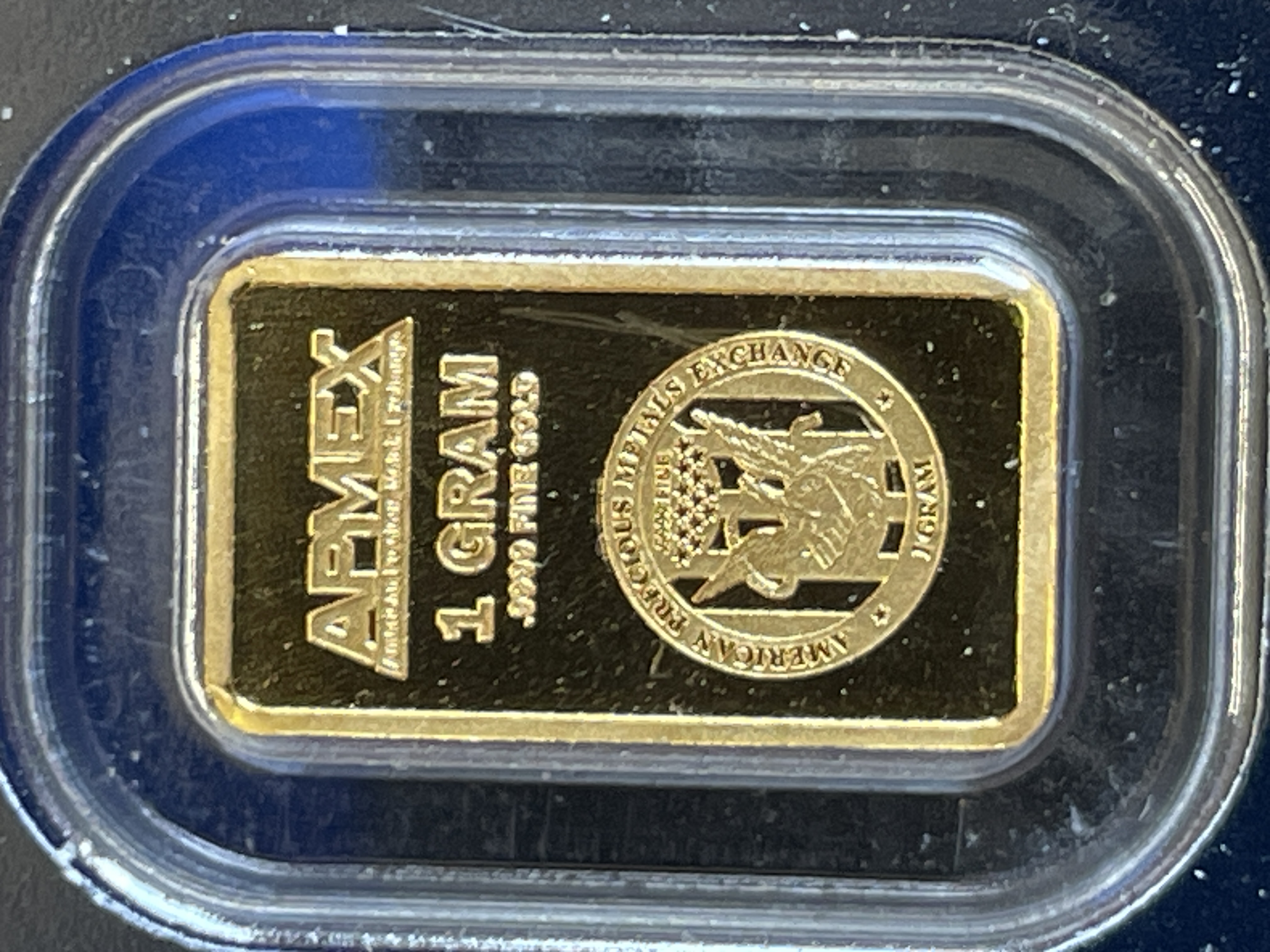 A single 1 gram APMEX gold bar of .9999 fine gold housed in a blue tamper-evident protective case.