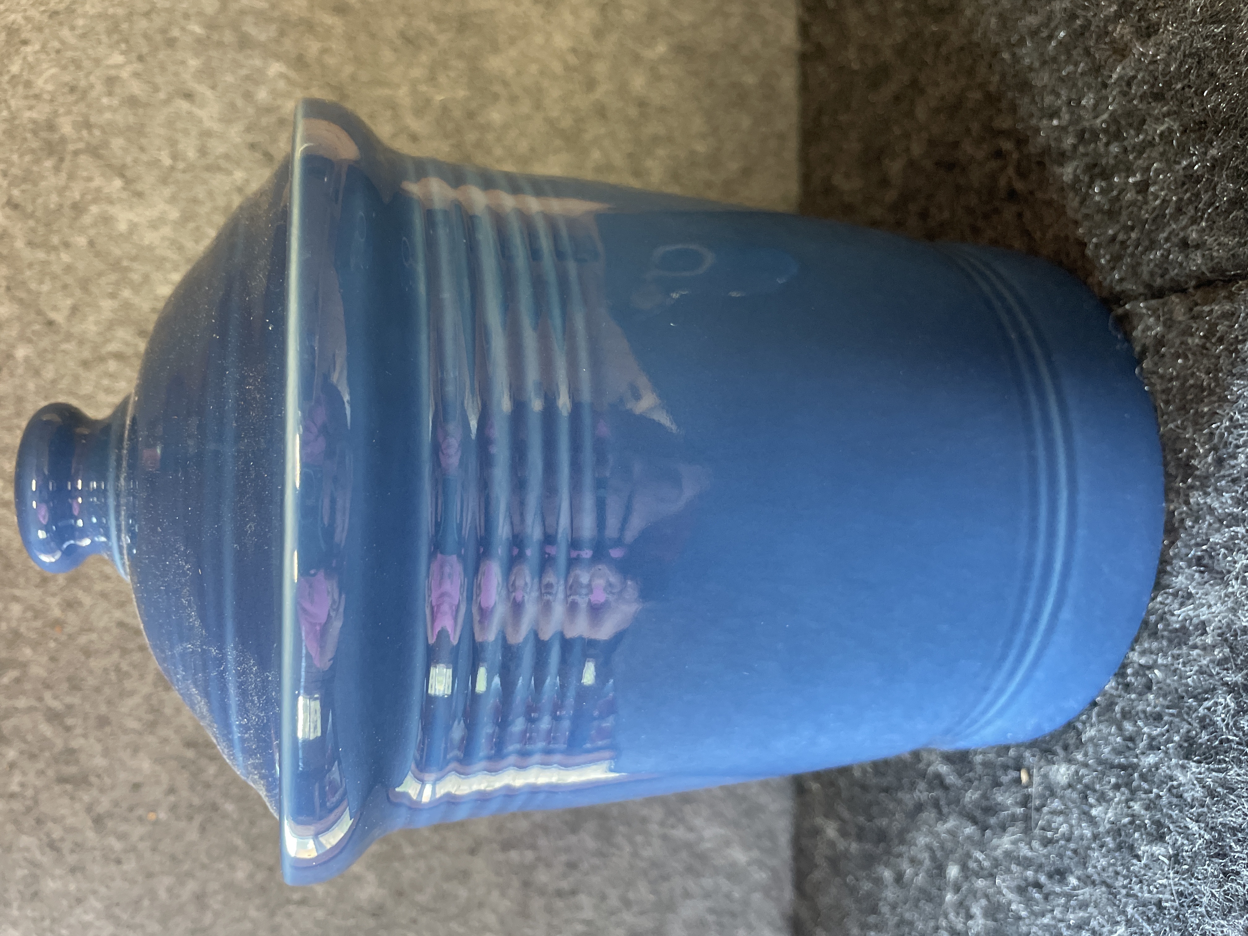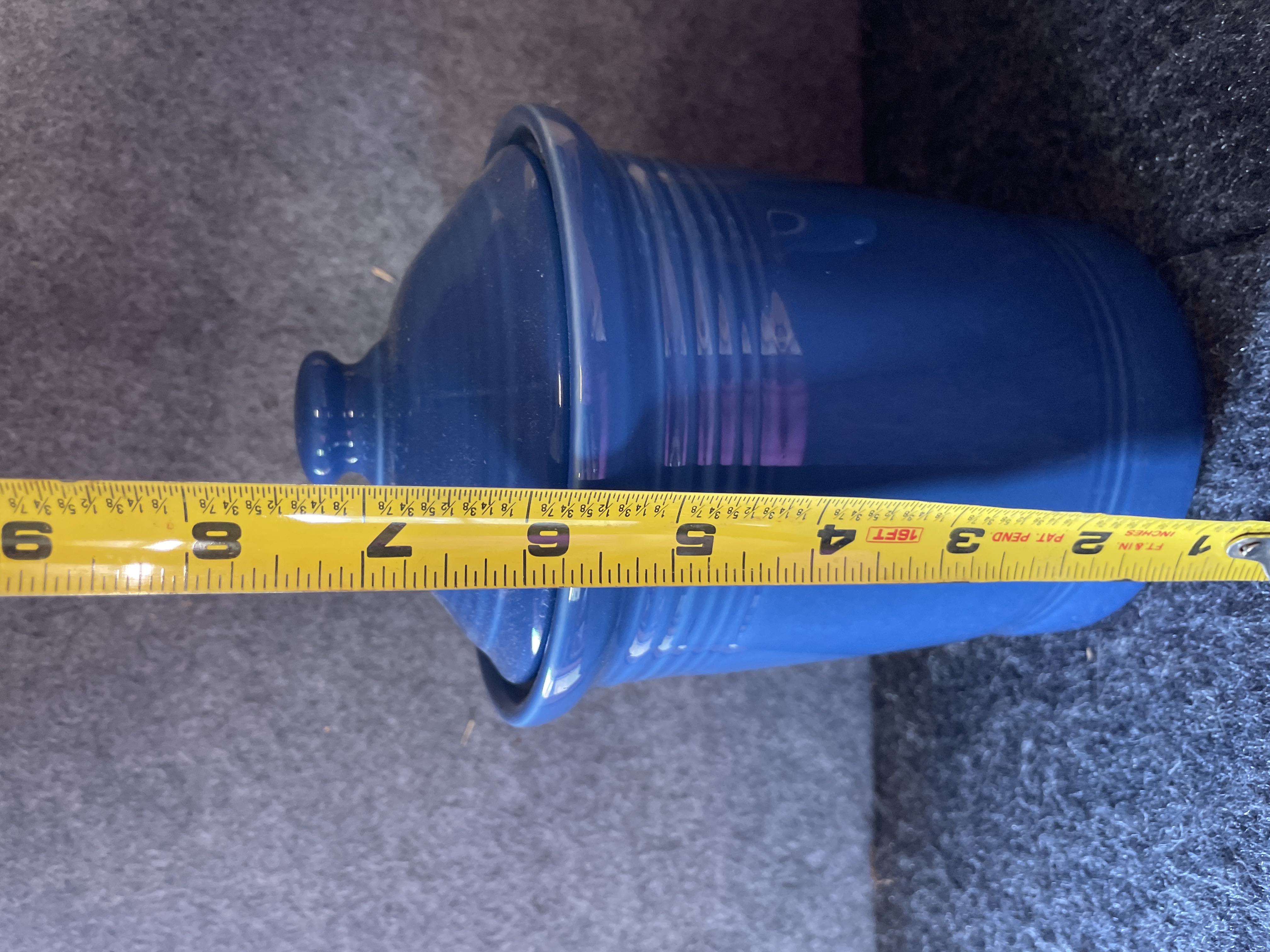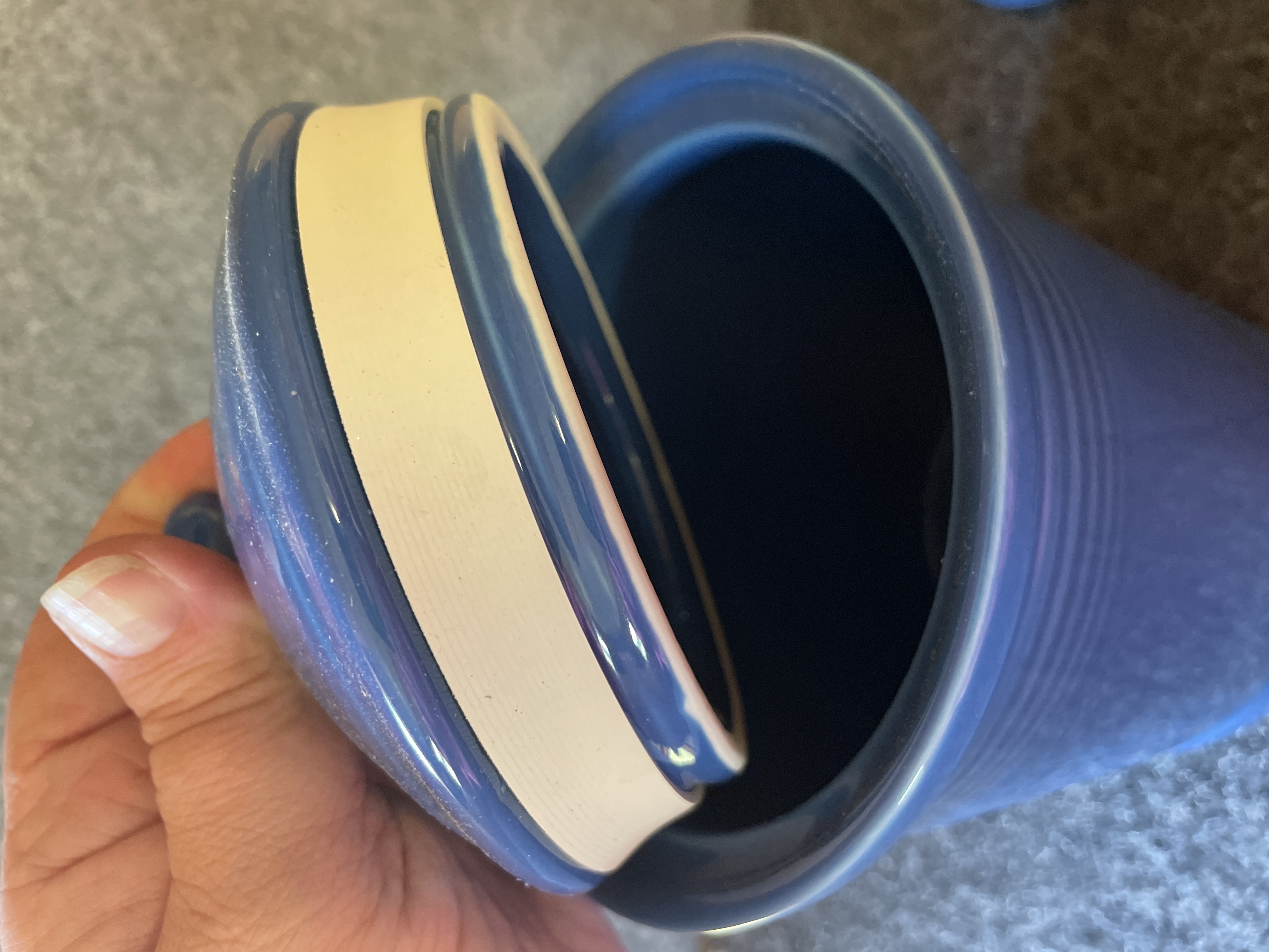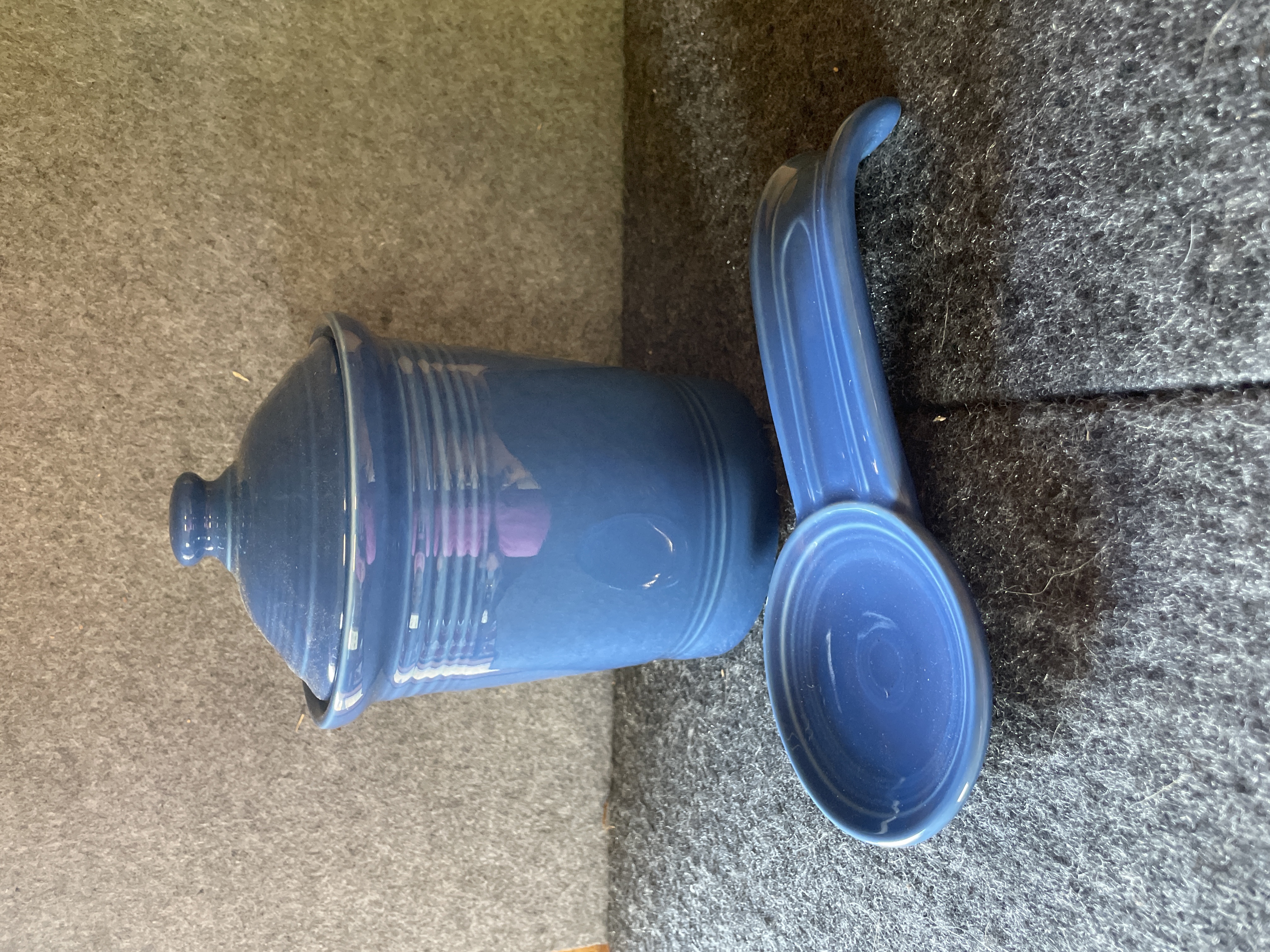 A pair of Fiesta Lapis blue ceramic kitchenware items including a large lidded canister measuring approximately 8 inches tall and a matching spoon rest.