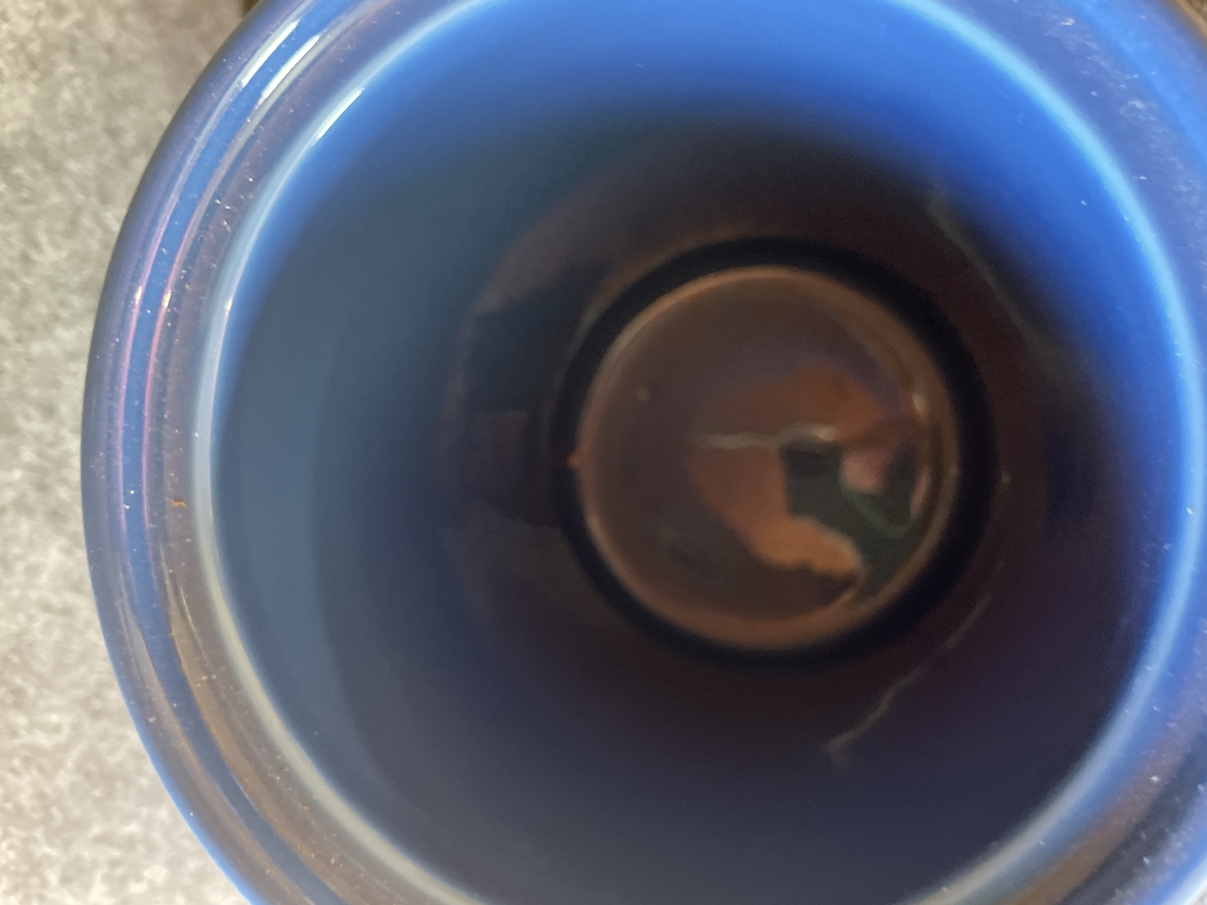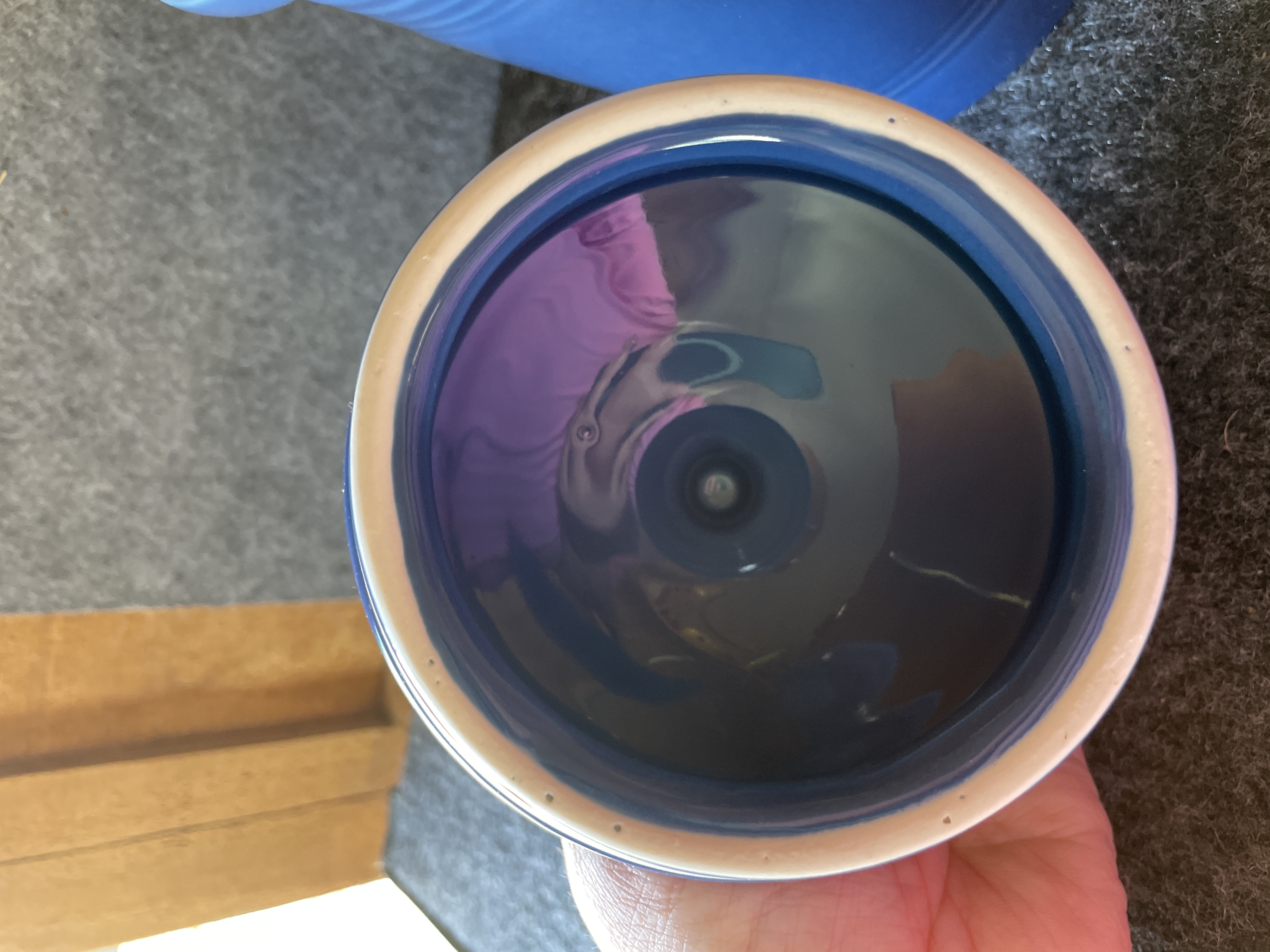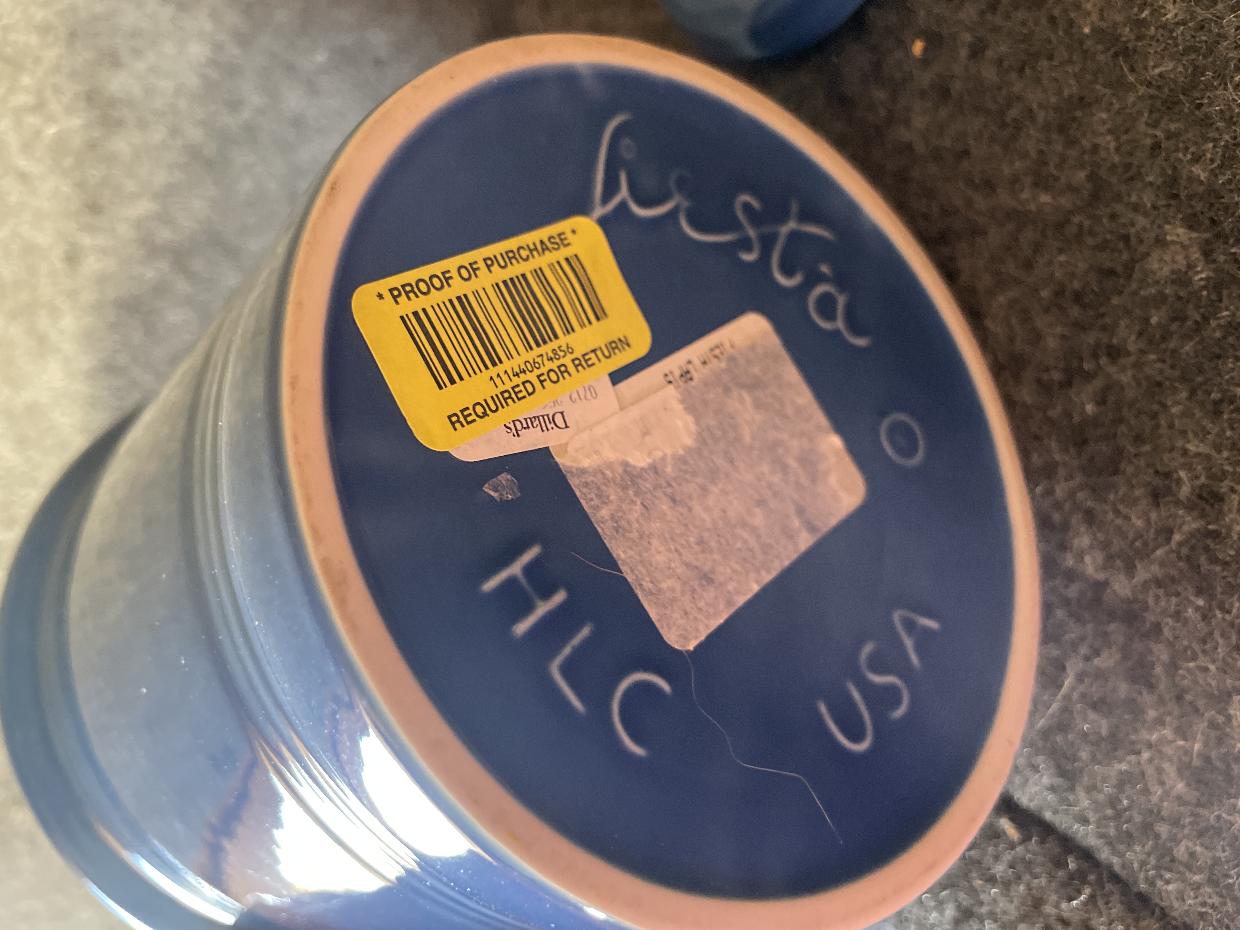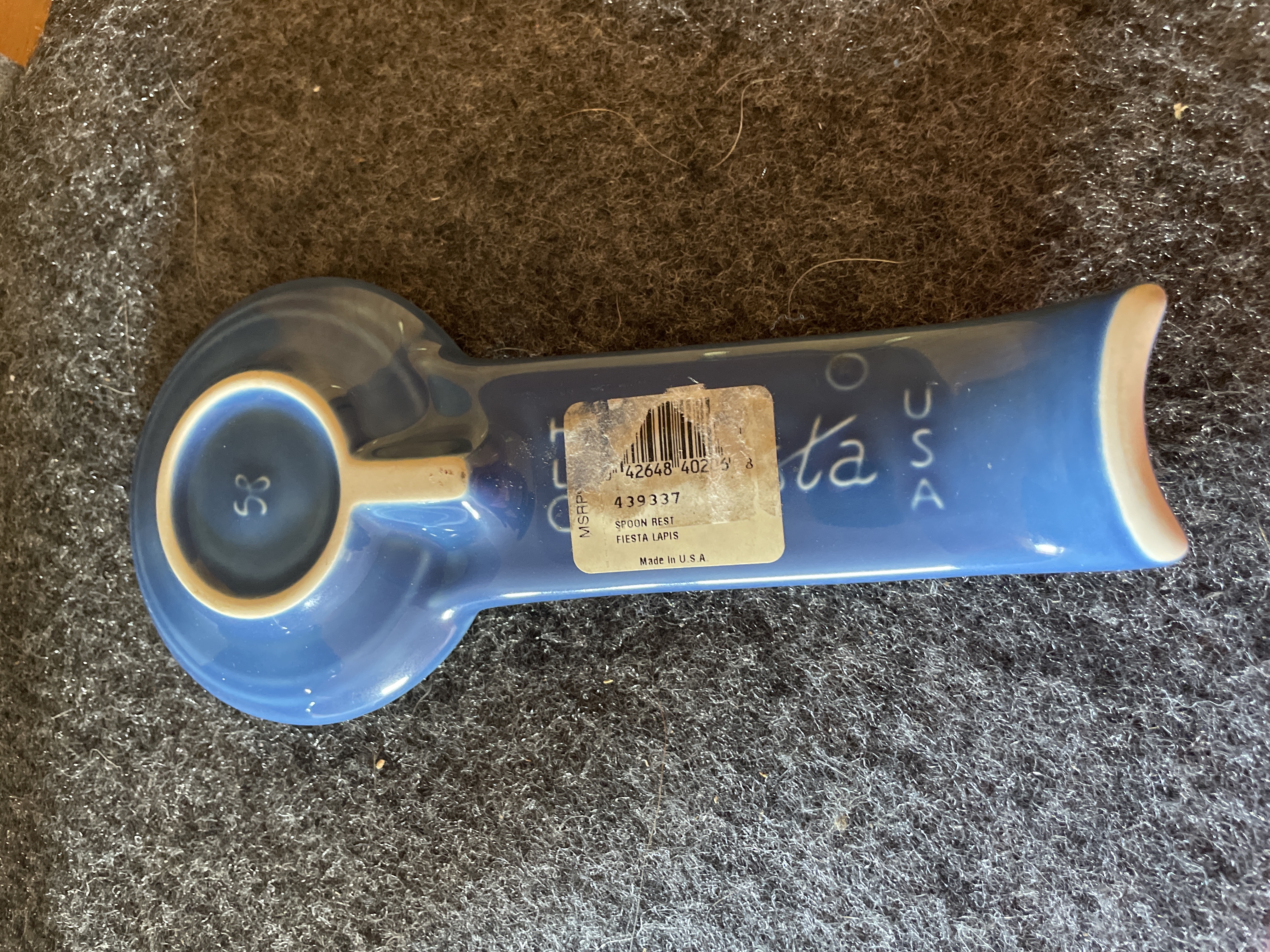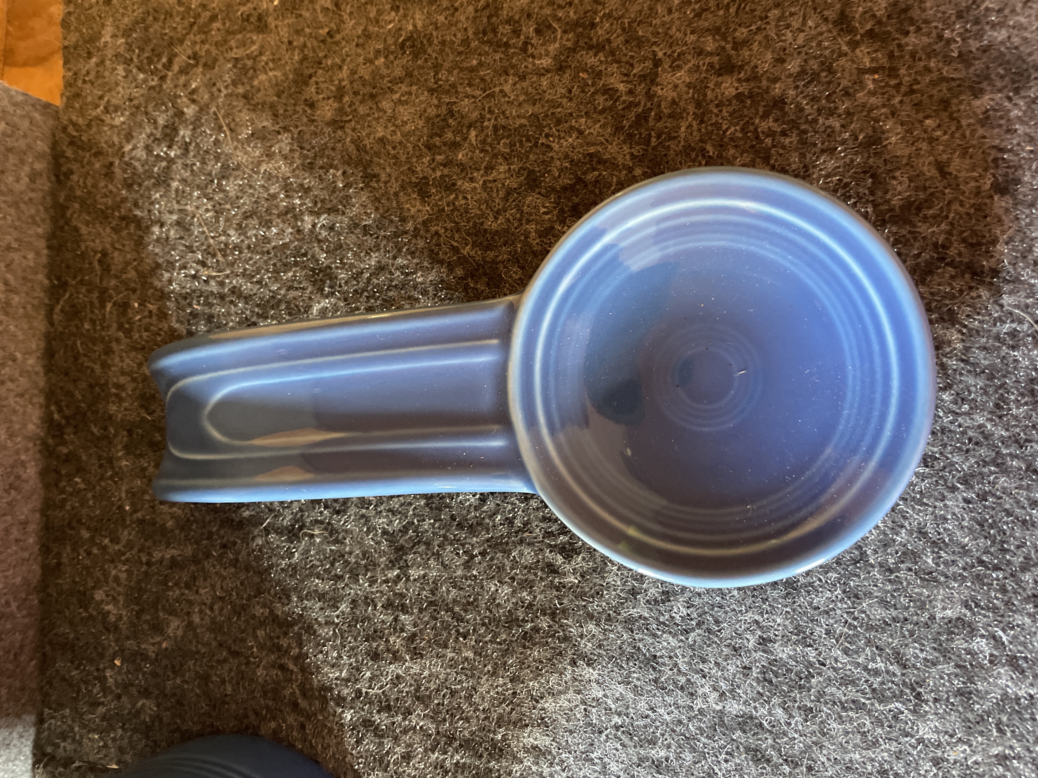 A pair of Fiesta Lapis blue ceramic kitchenware items including a large lidded canister measuring approximately 8 inches tall and a matching spoon rest.