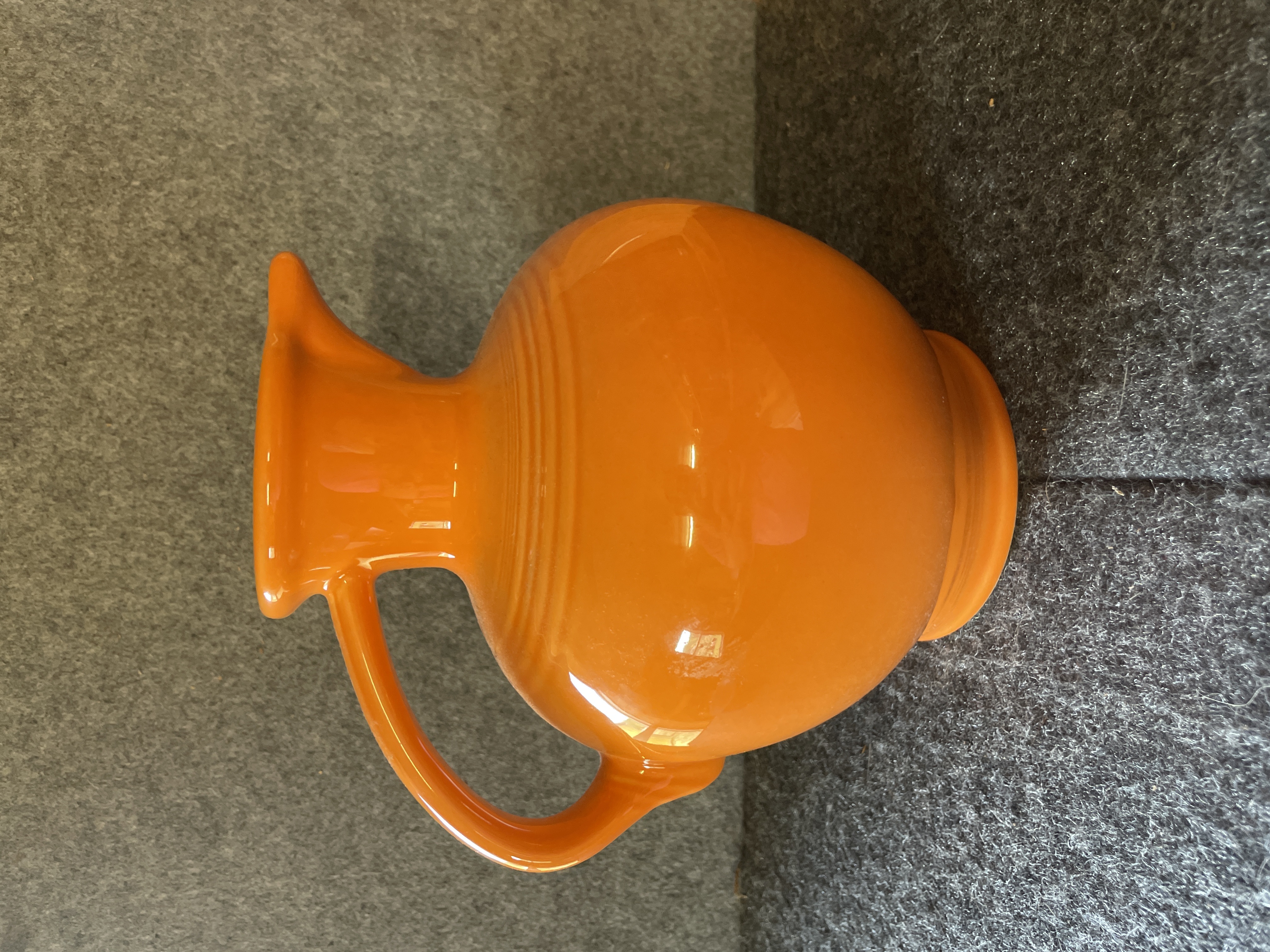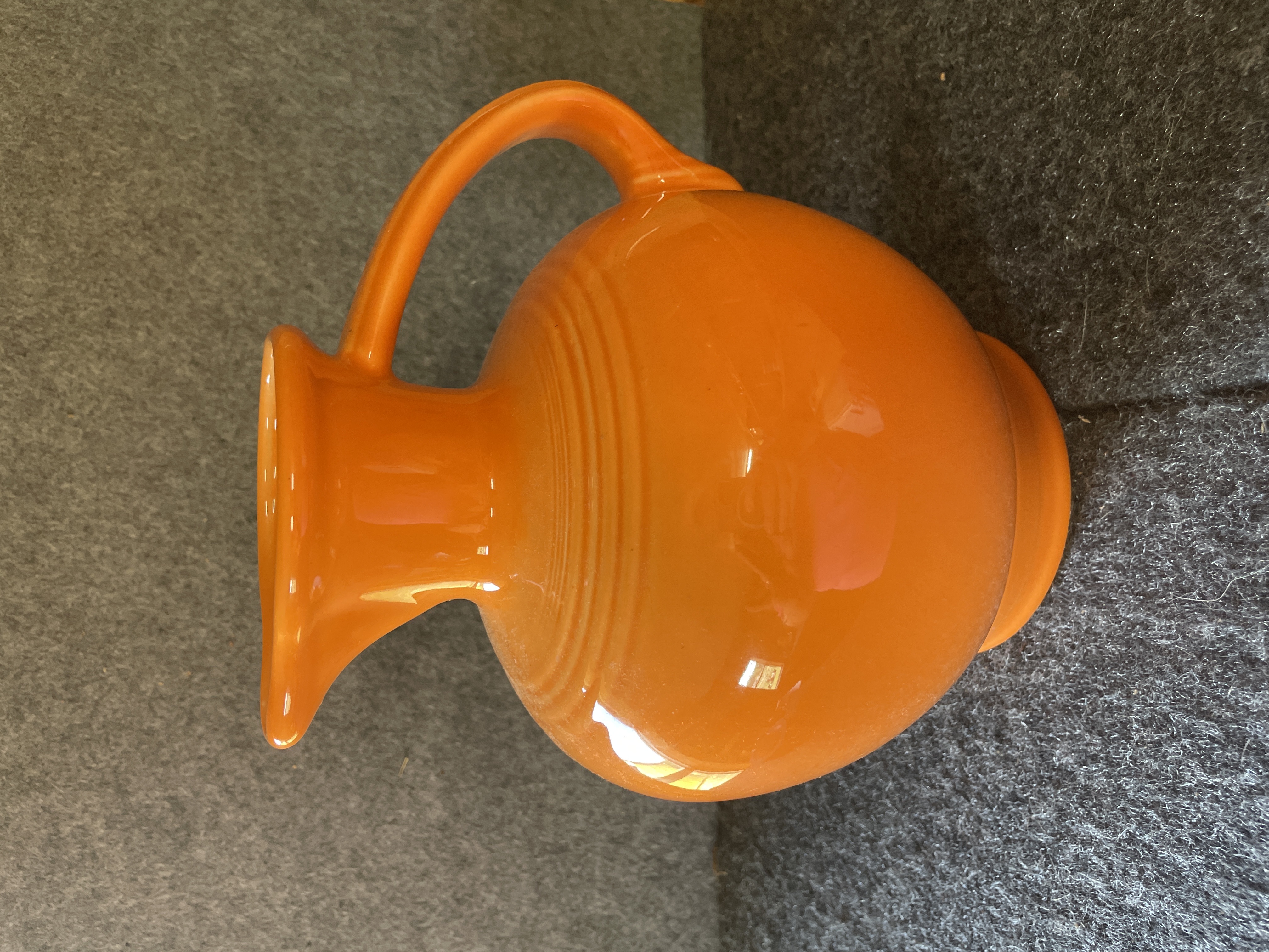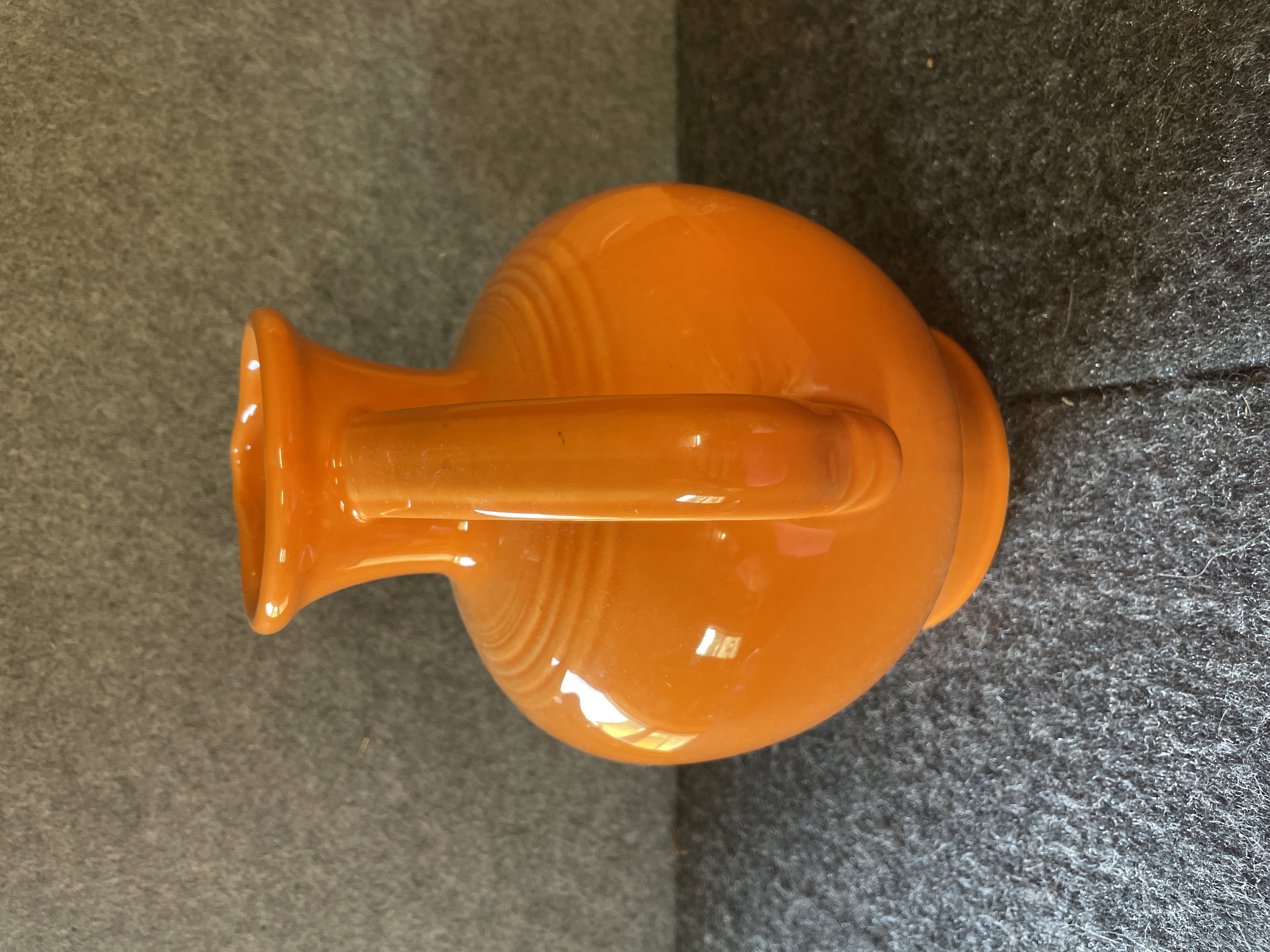 An orange ceramic carafe featuring a round body with concentric rings and a side handle, marked HLC Fiesta USA on the base.