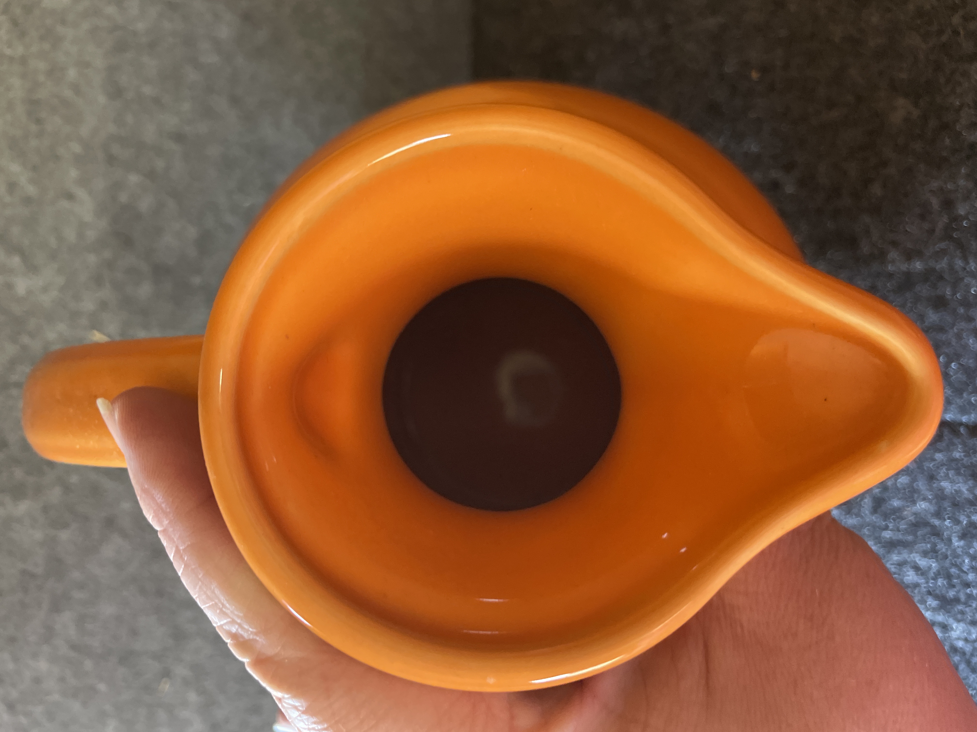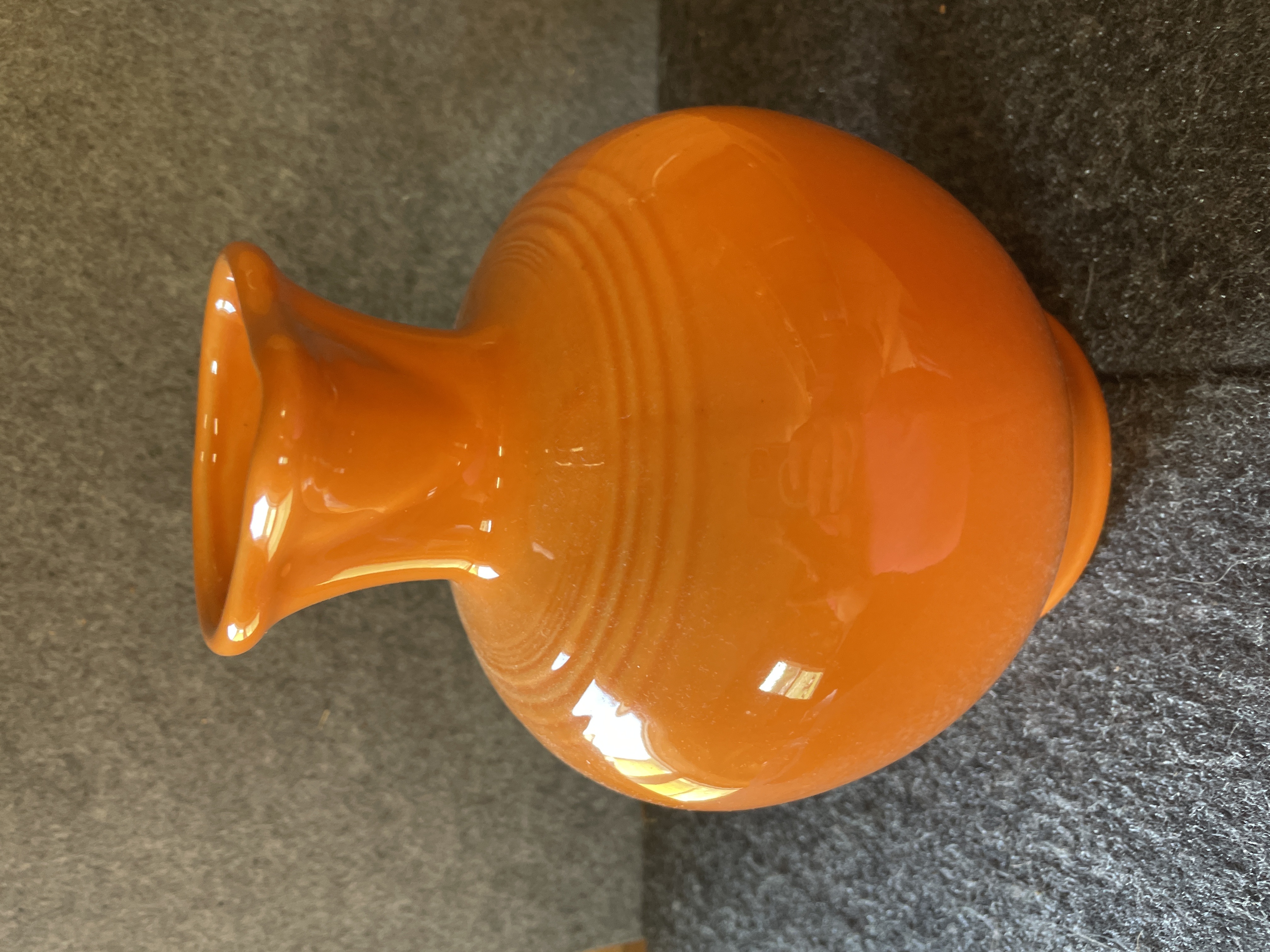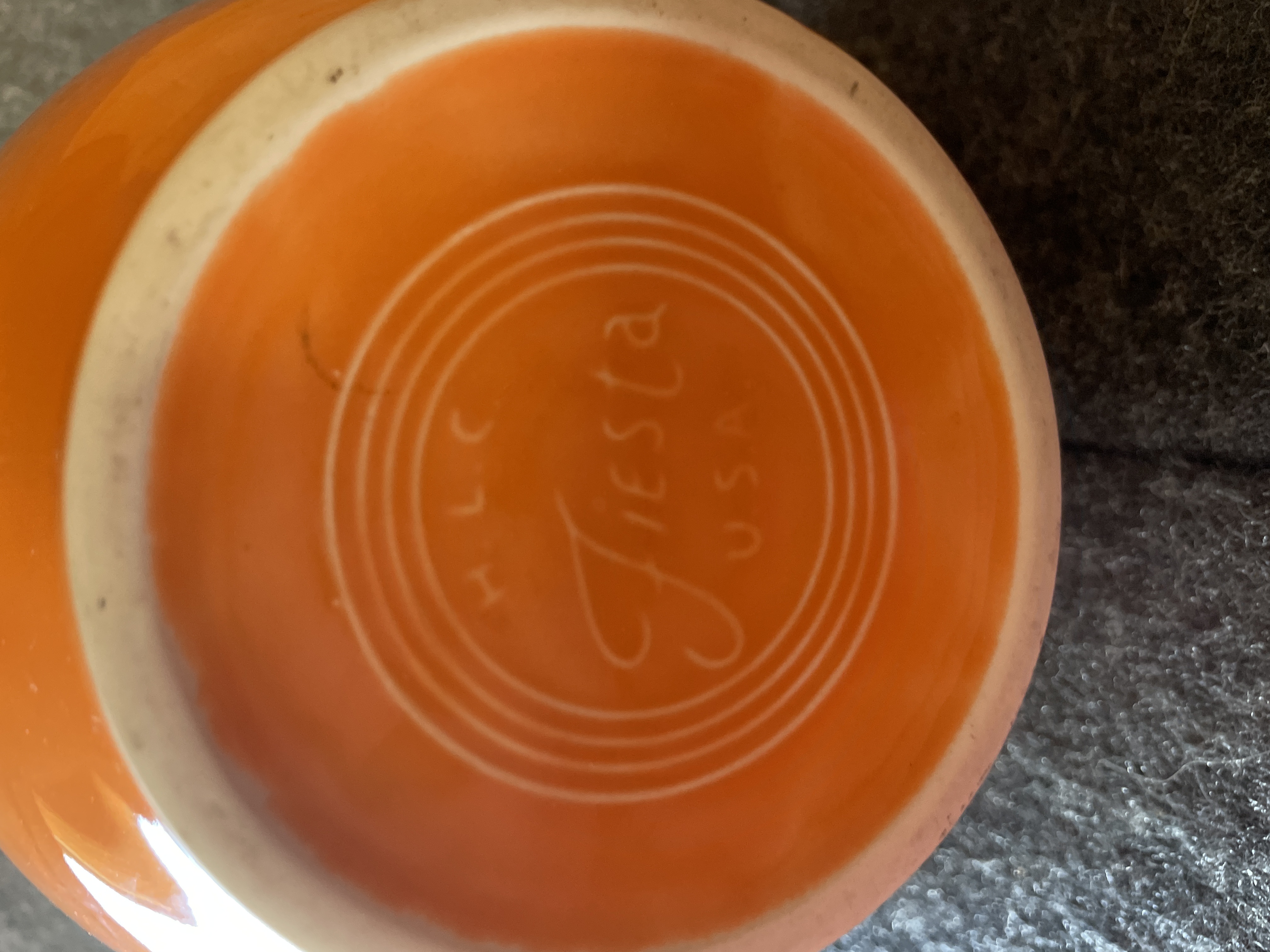 An orange ceramic carafe featuring a round body with concentric rings and a side handle, marked HLC Fiesta USA on the base.