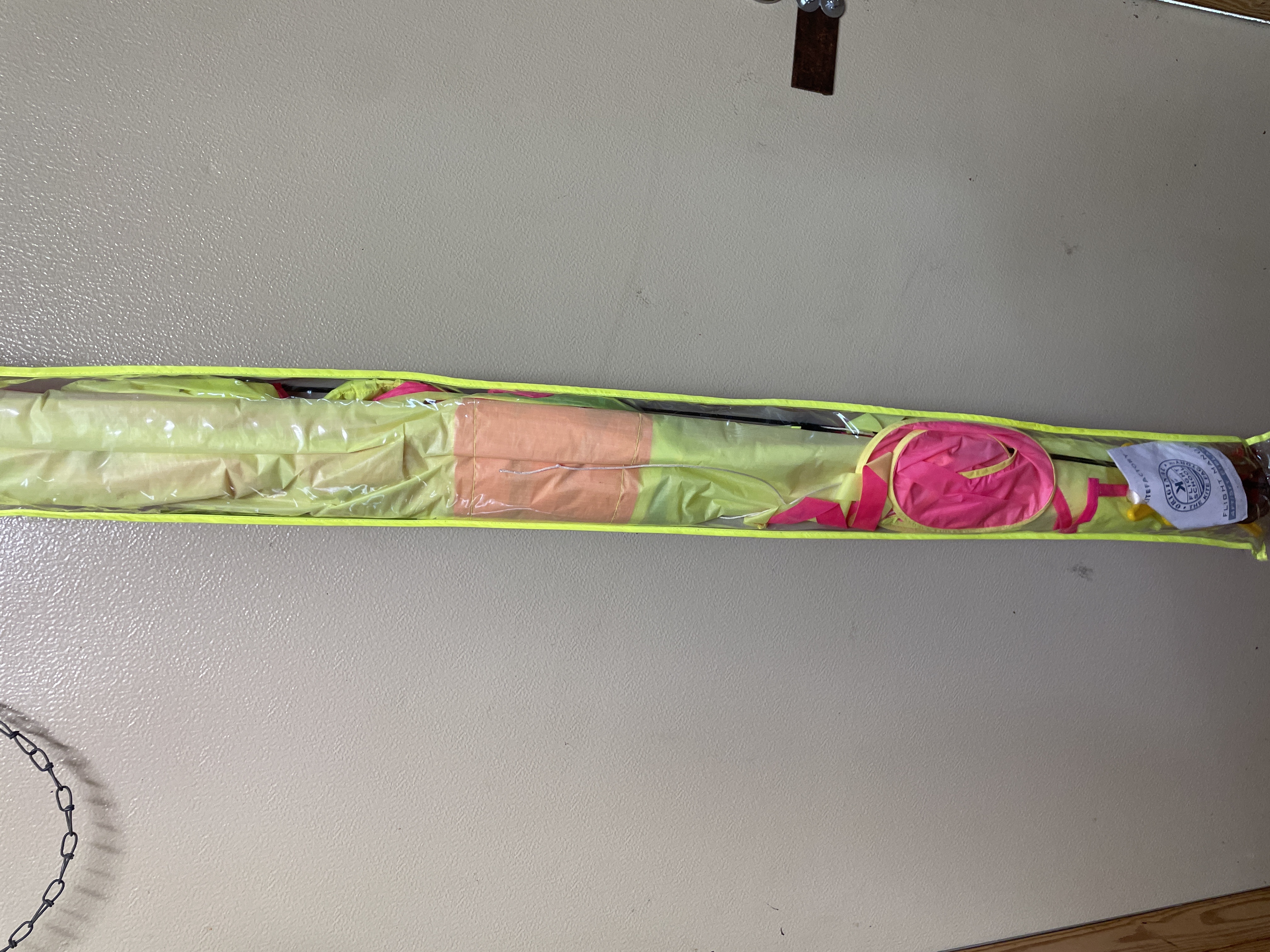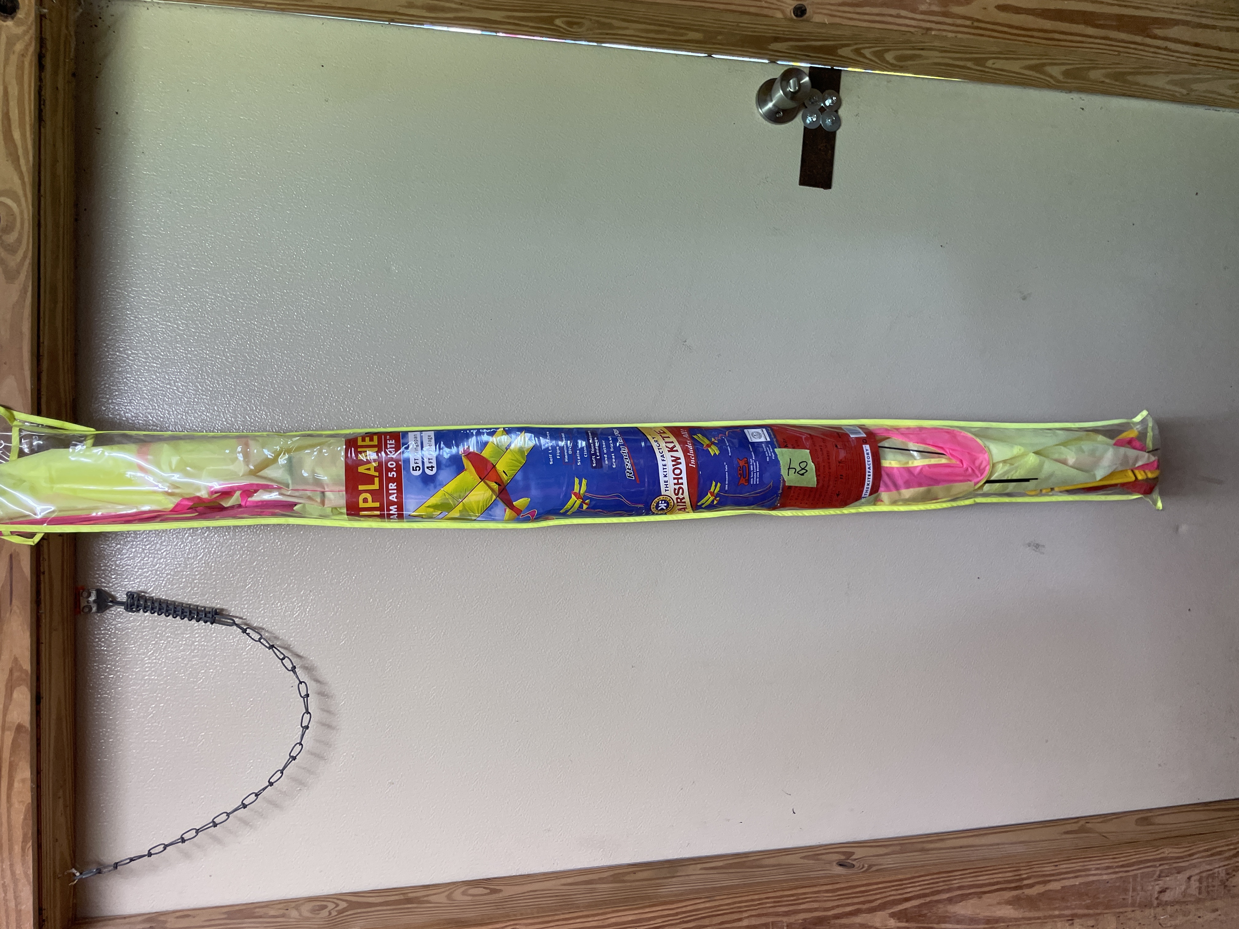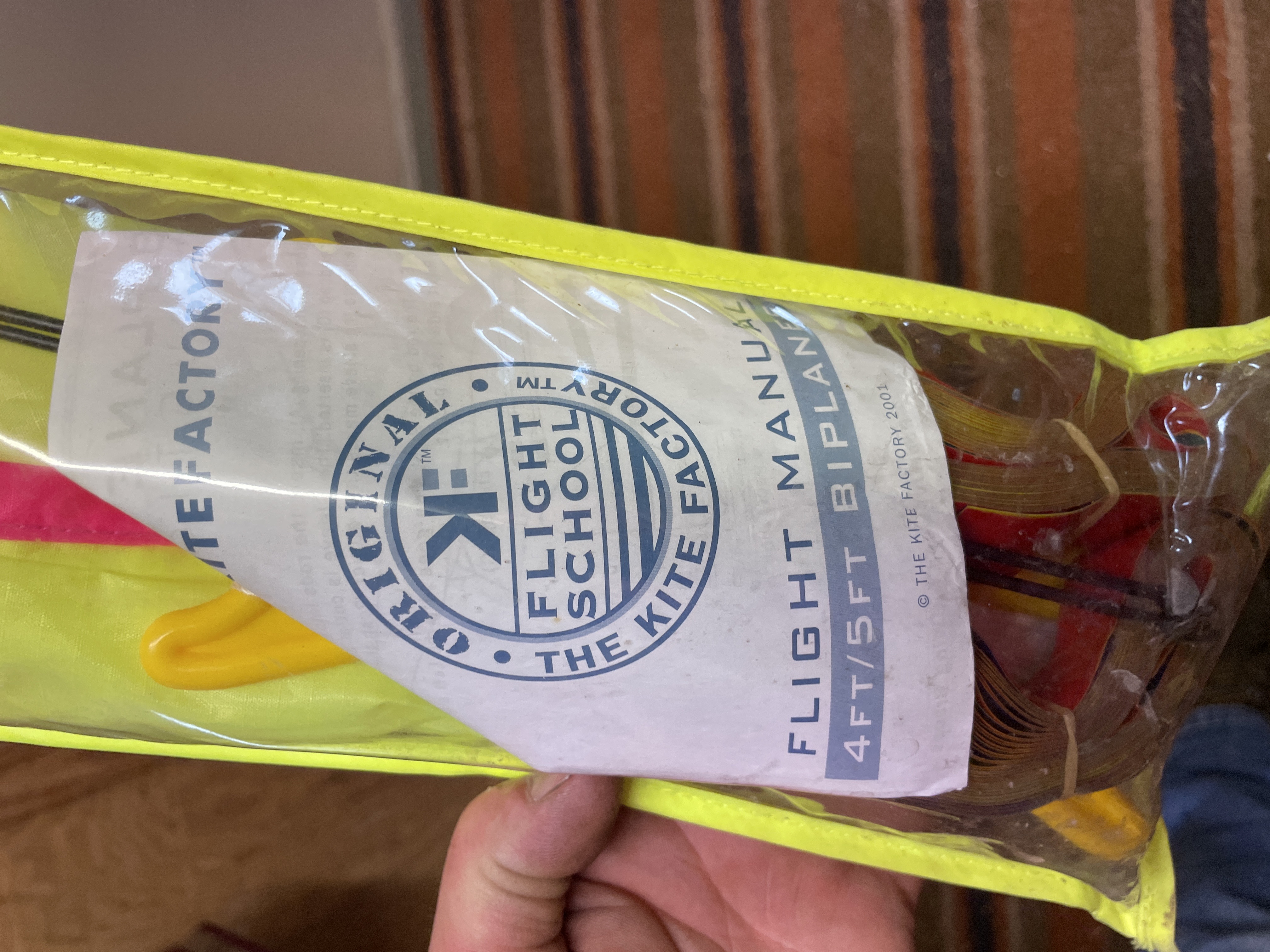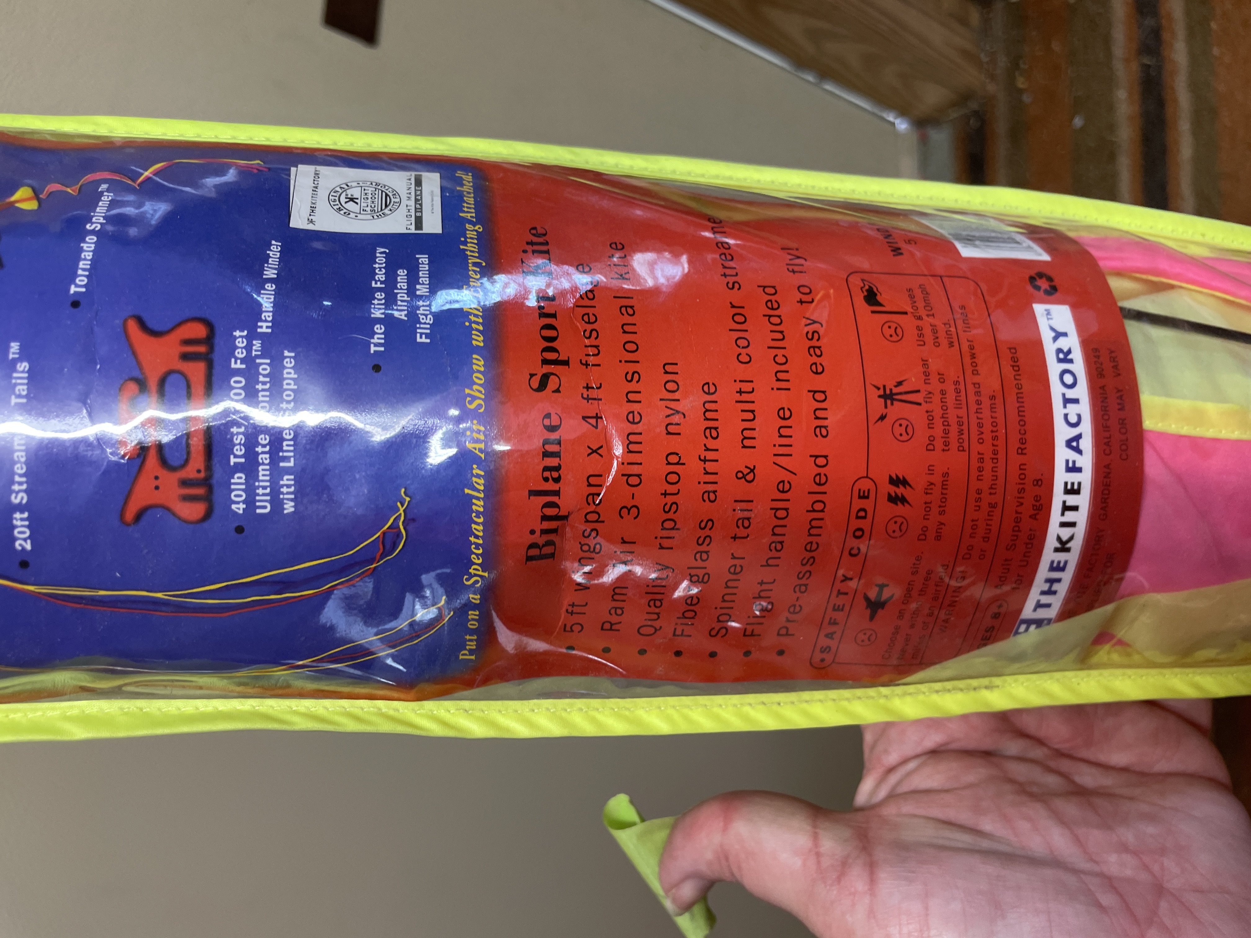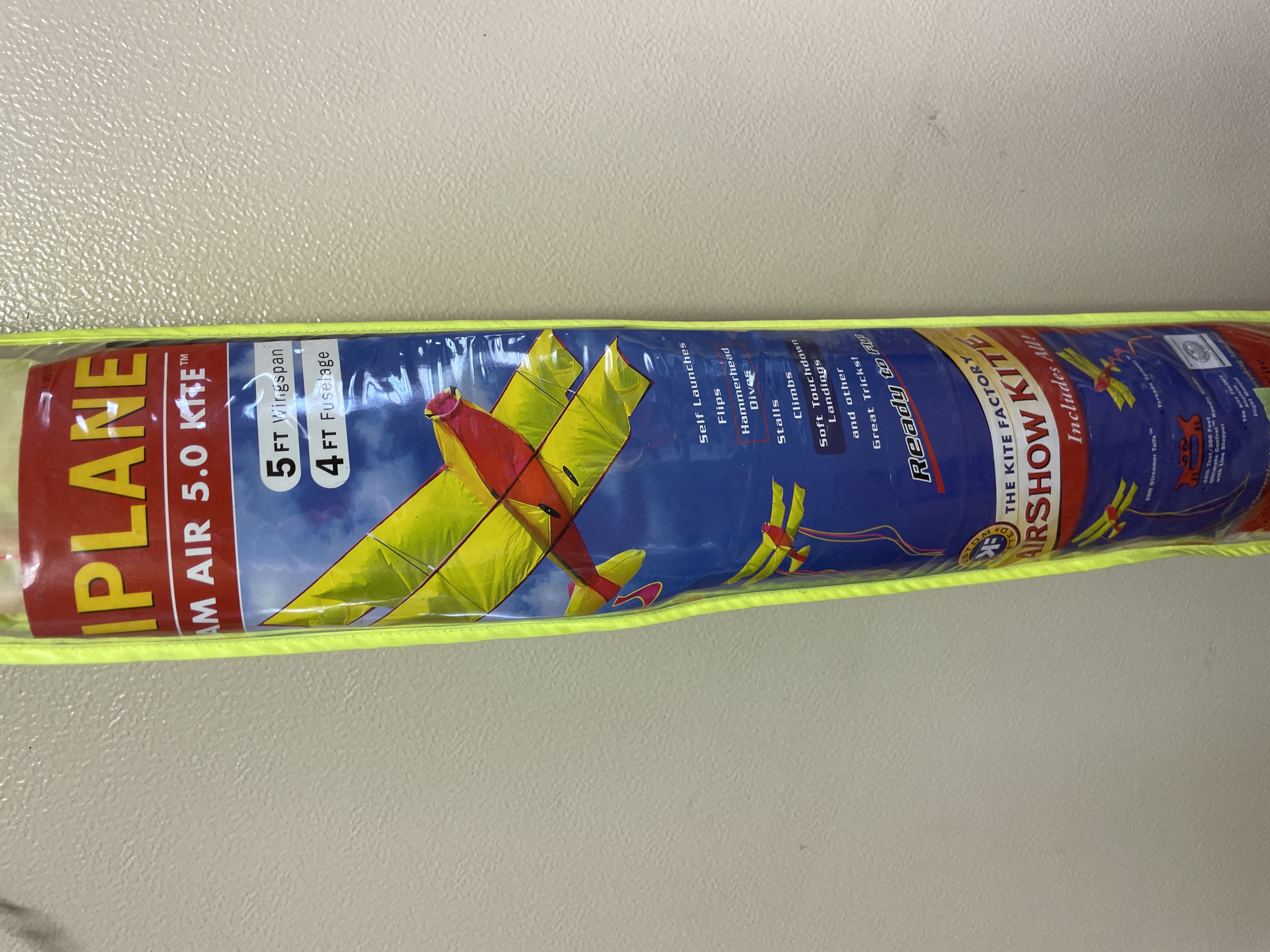 A yellow and pink biplane sport kite featuring a 5-foot wingspan and 4-foot fuselage, constructed with ripstop nylon and a fiberglass airframe, housed in a neon yellow carrying case with an included flight manual.
