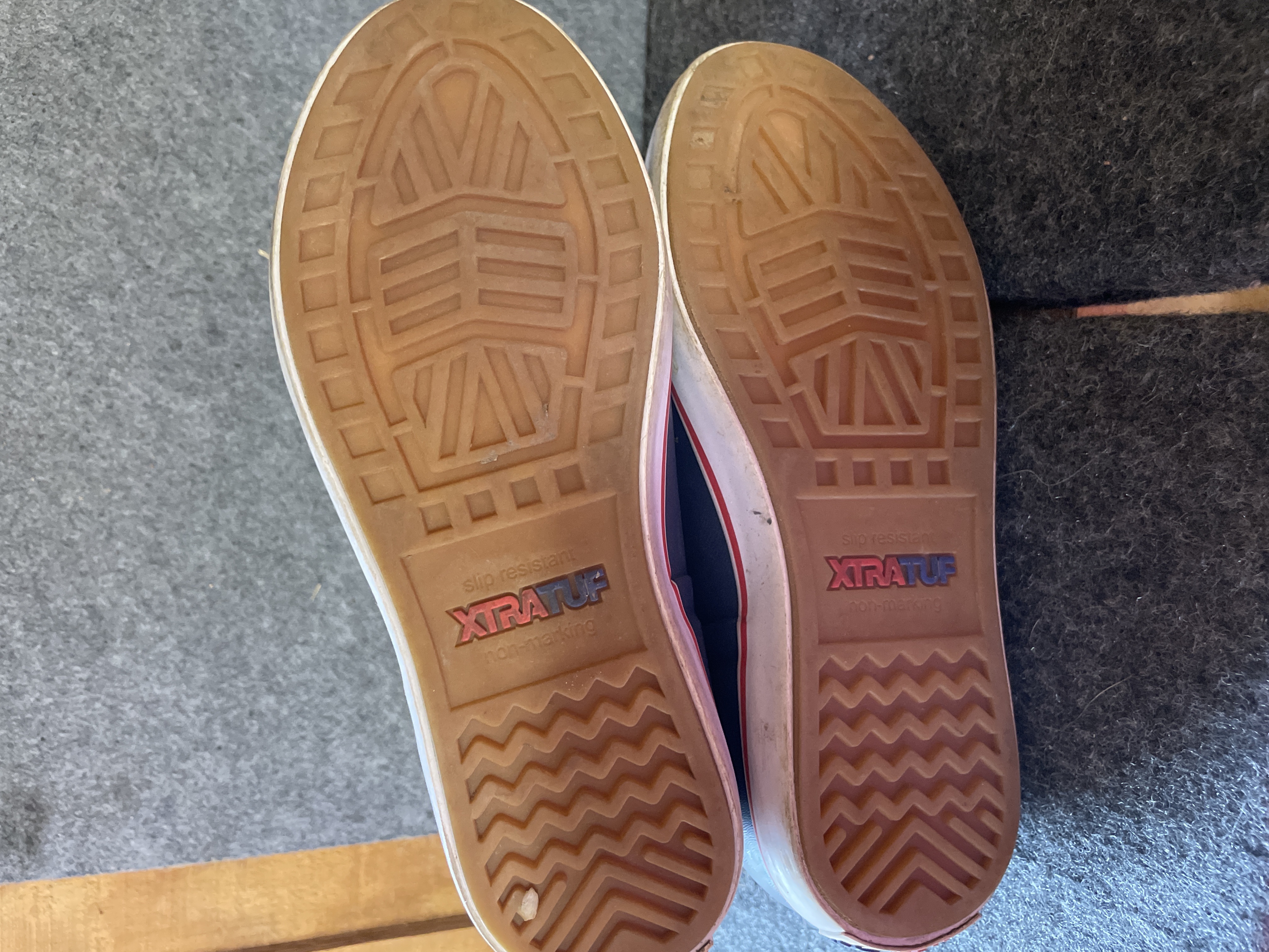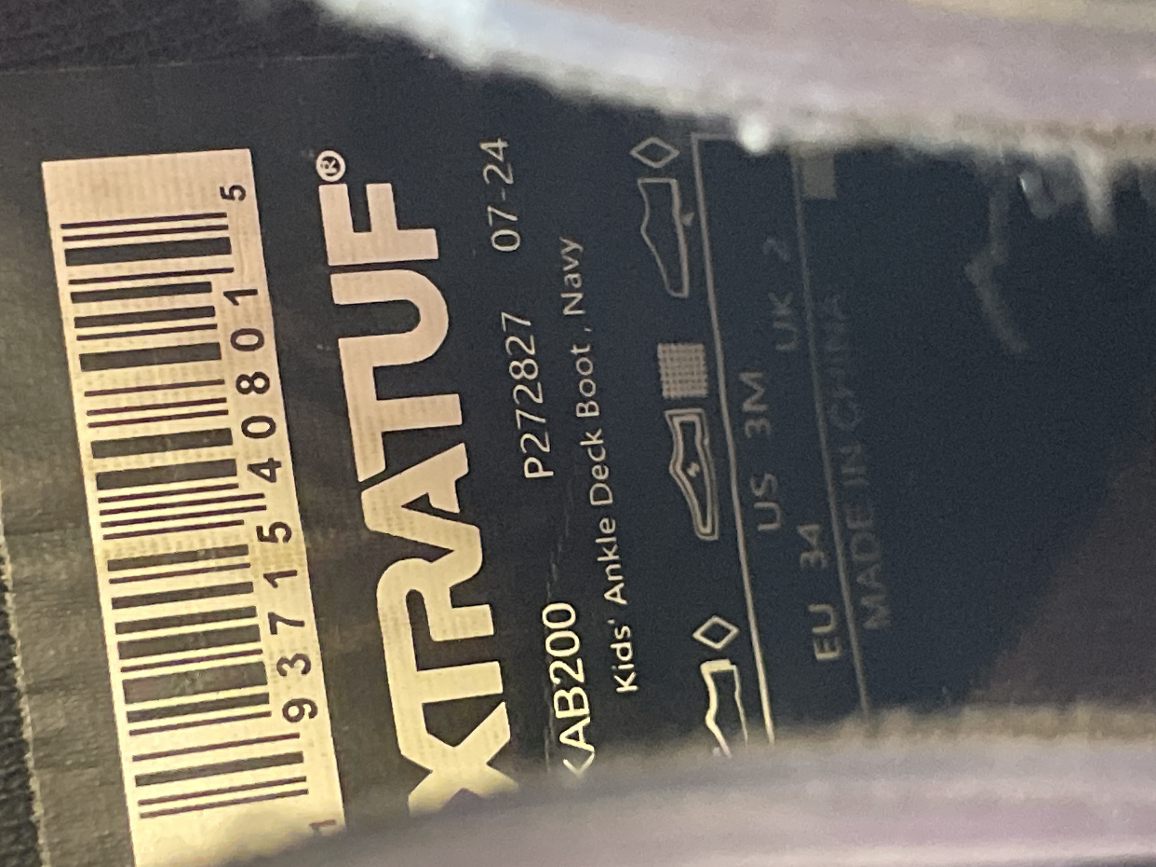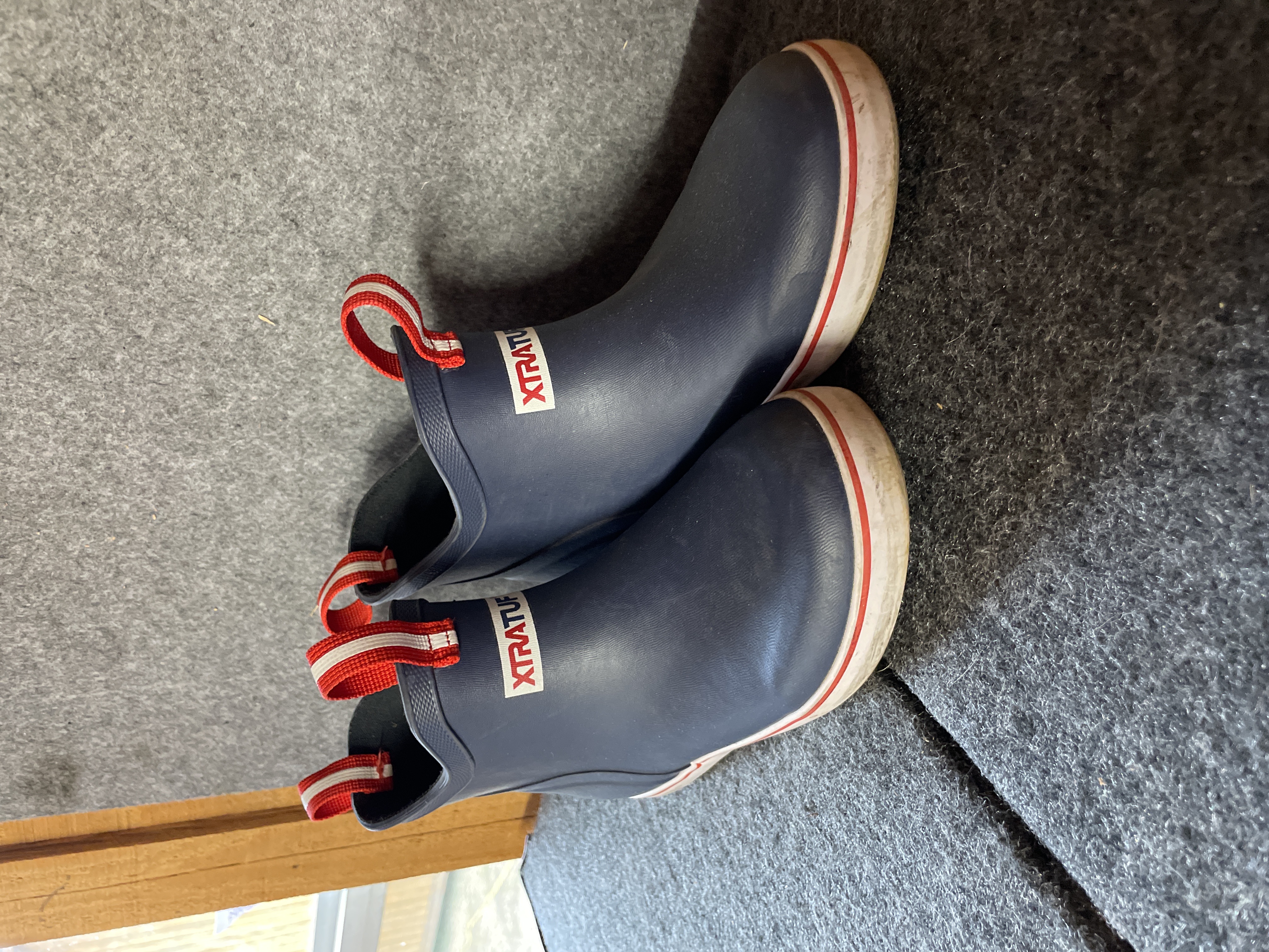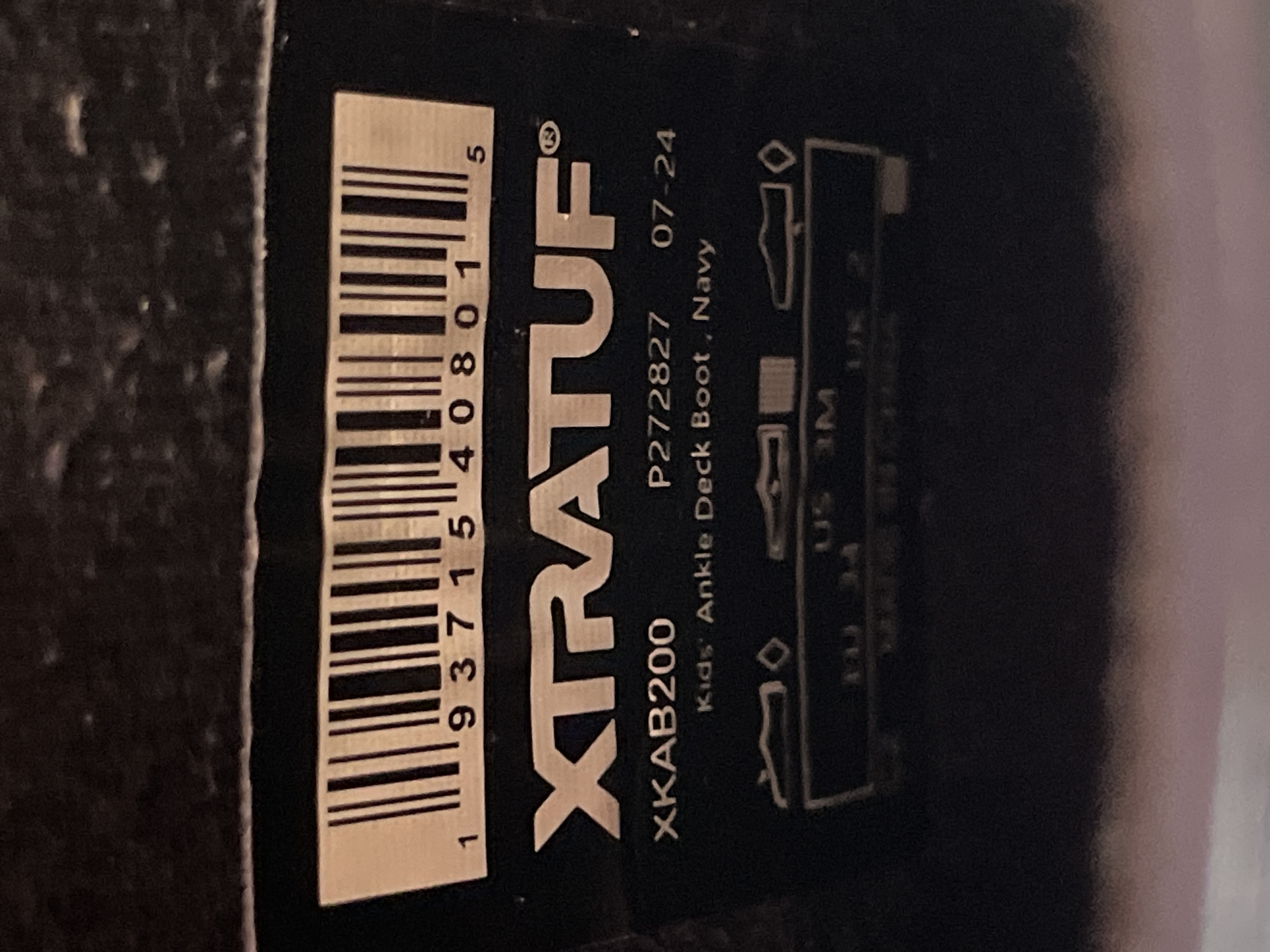 A pair of navy blue XTRATUF Kids Ankle Deck Boots, model XKAB200, featuring red and white striped pull tabs and slip-resistant soles in size US 3M.