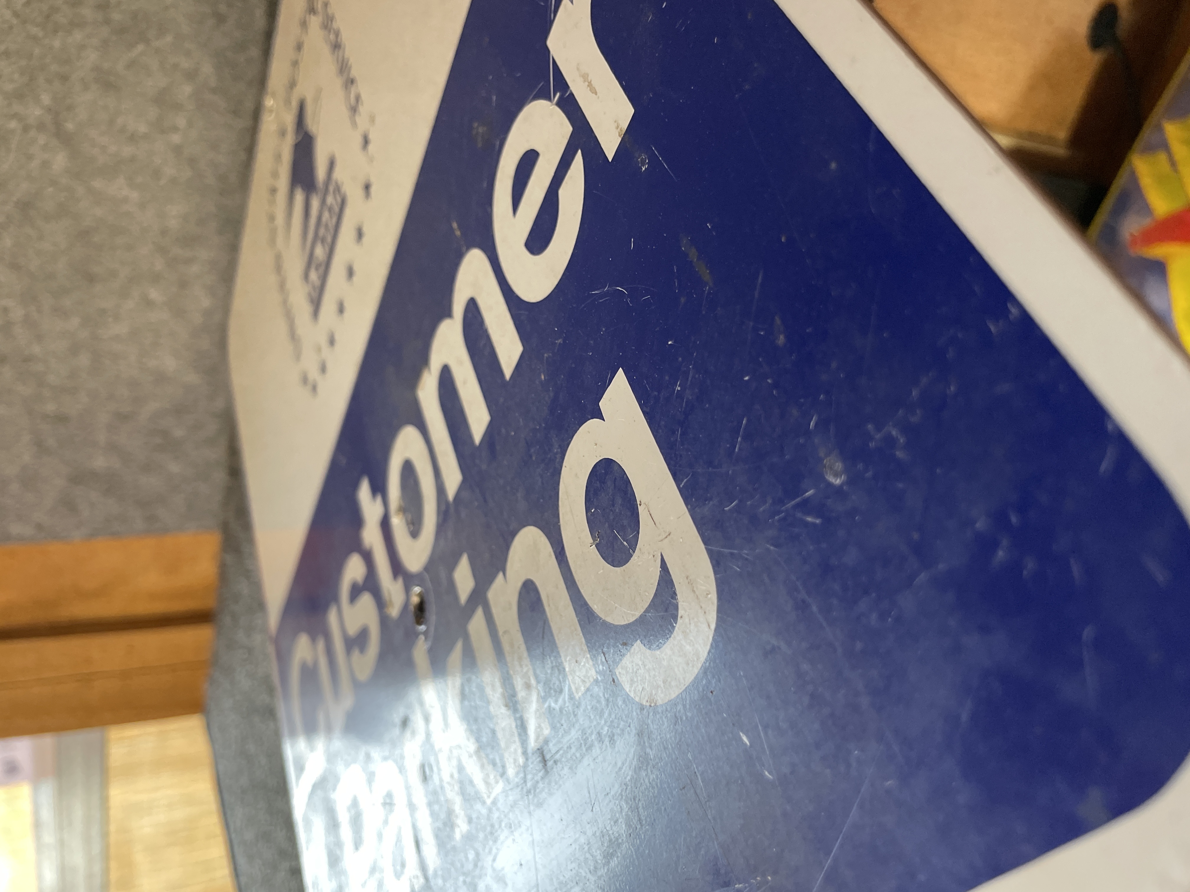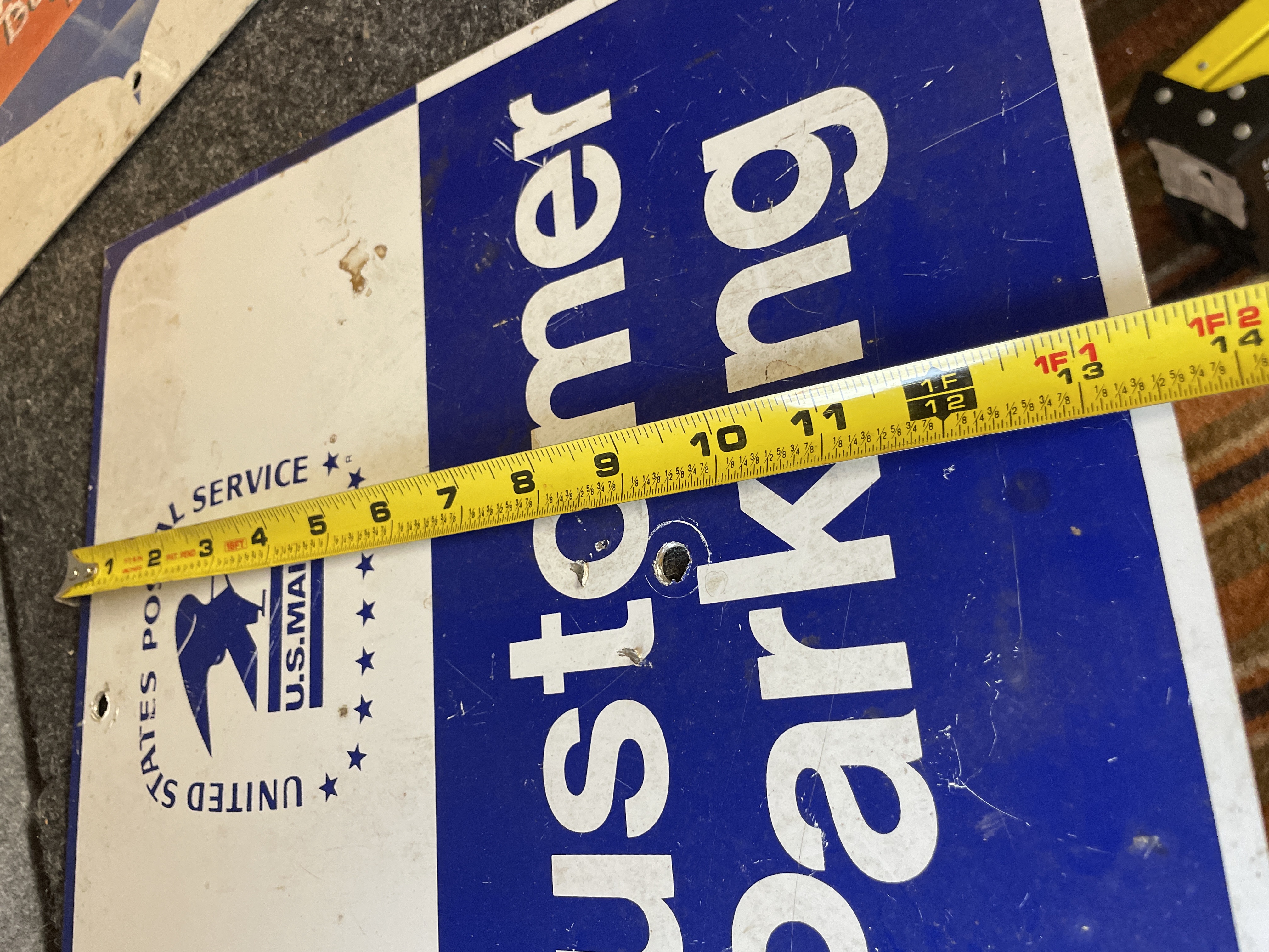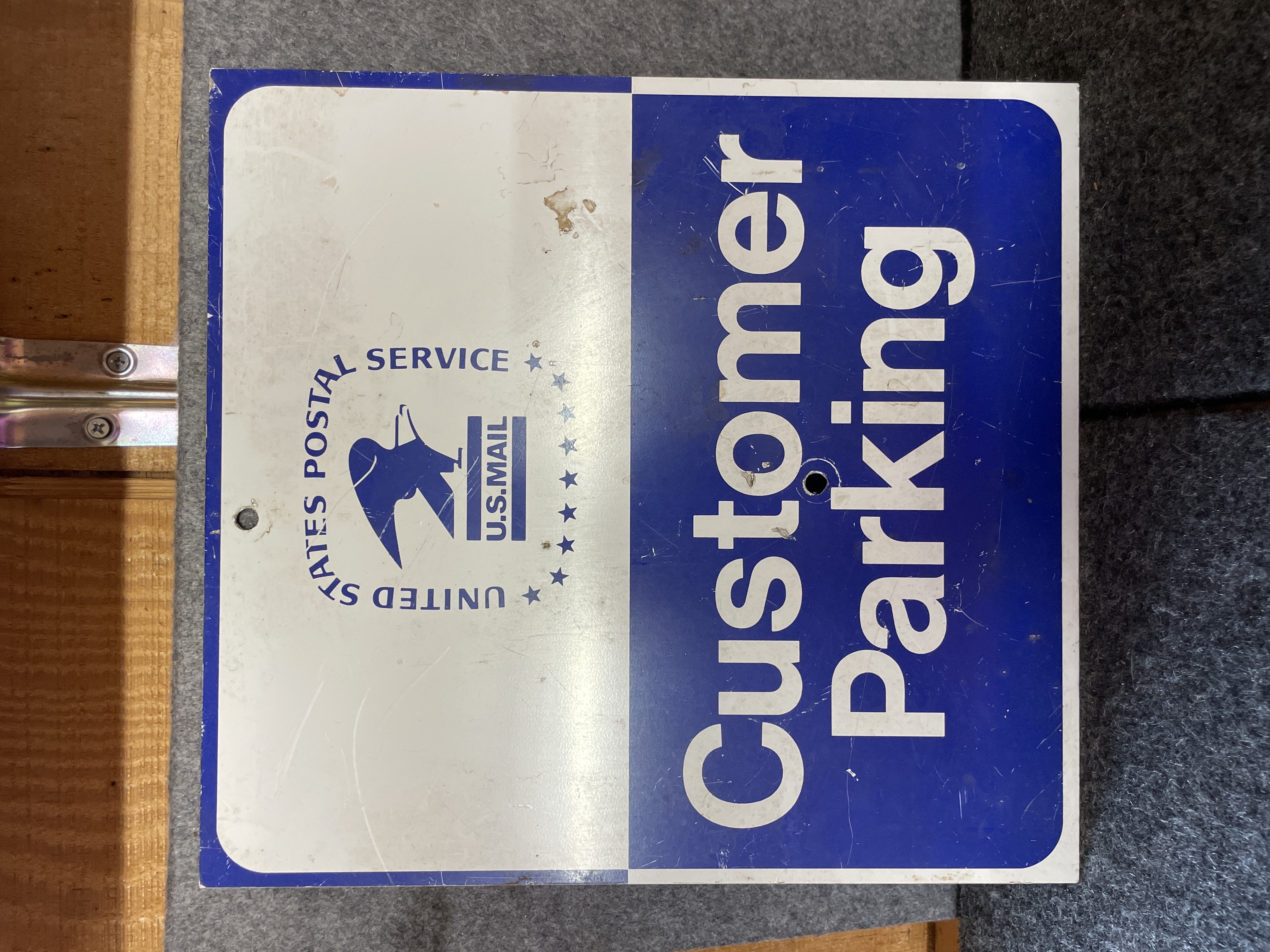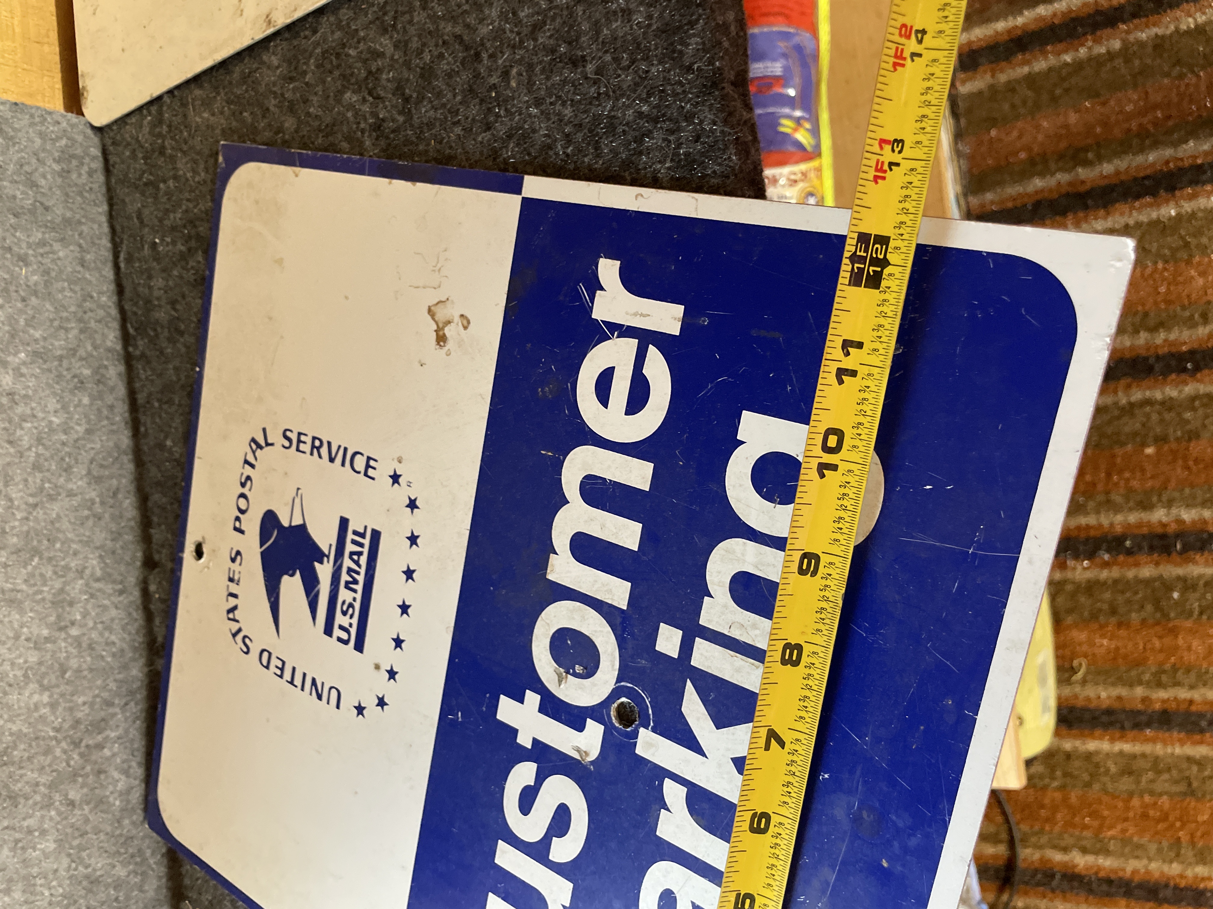 A blue and white square metal sign featuring the United States Postal Service logo and Customer Parking text, measuring approximately 12 by 12 inches.