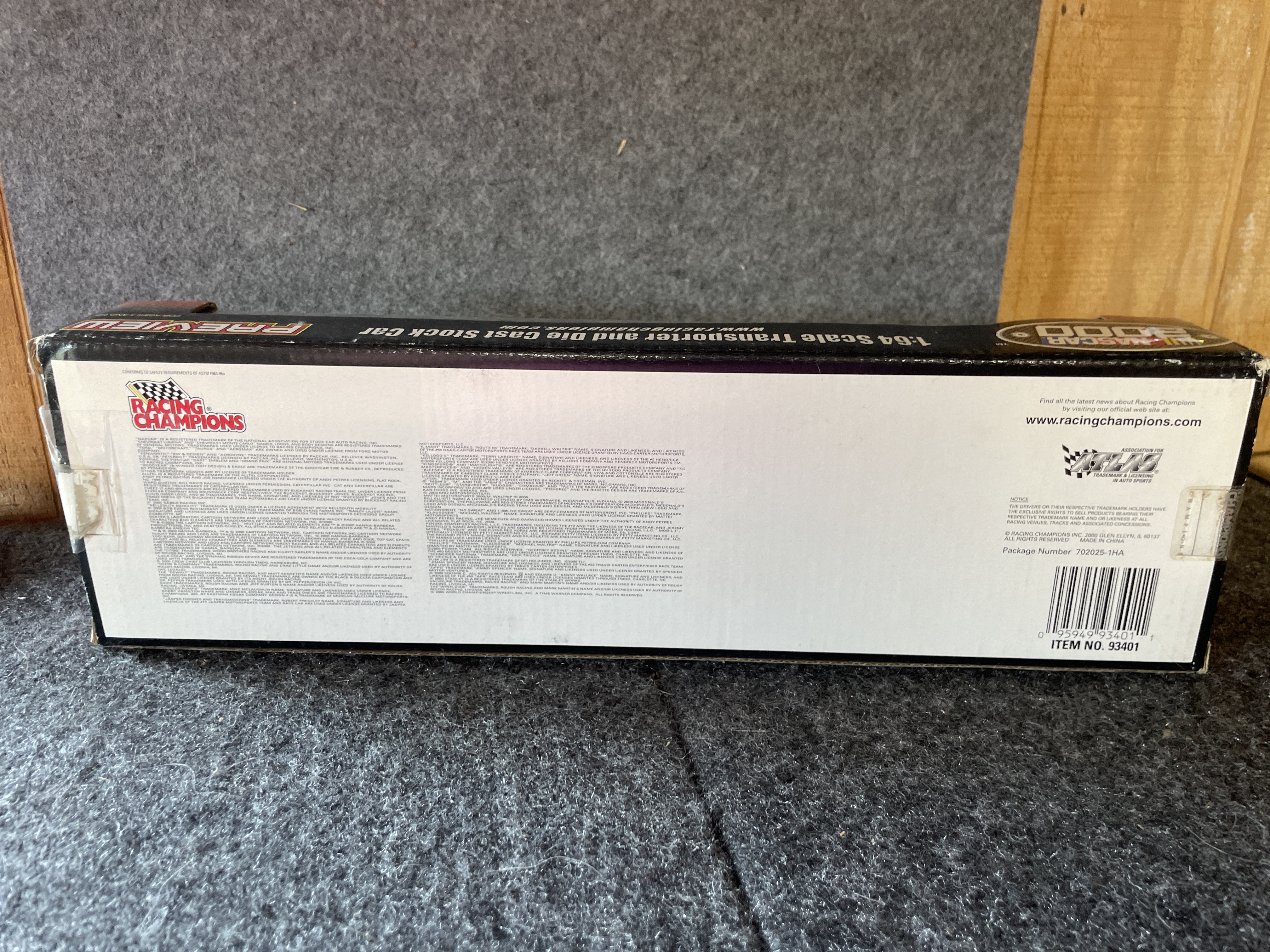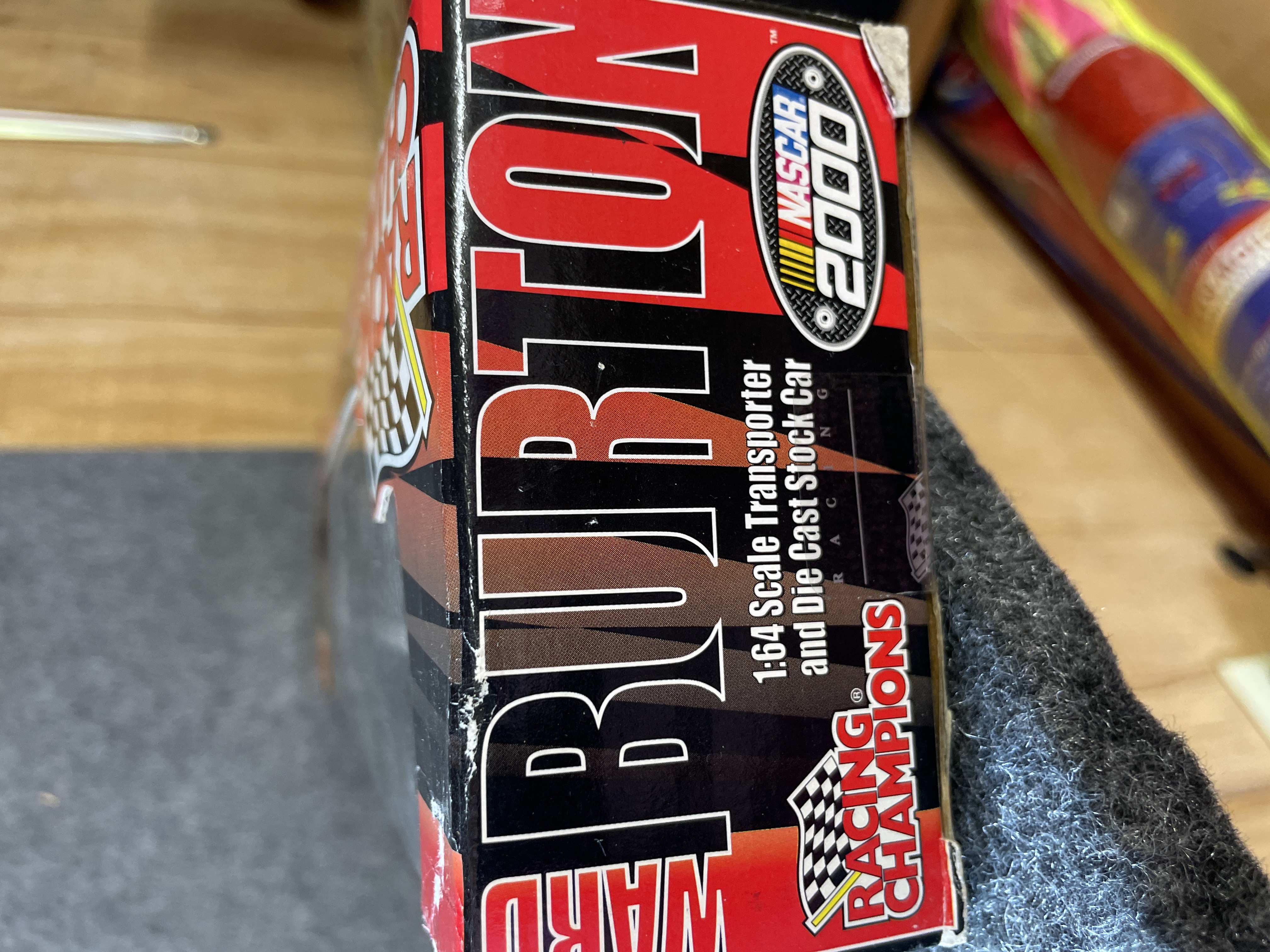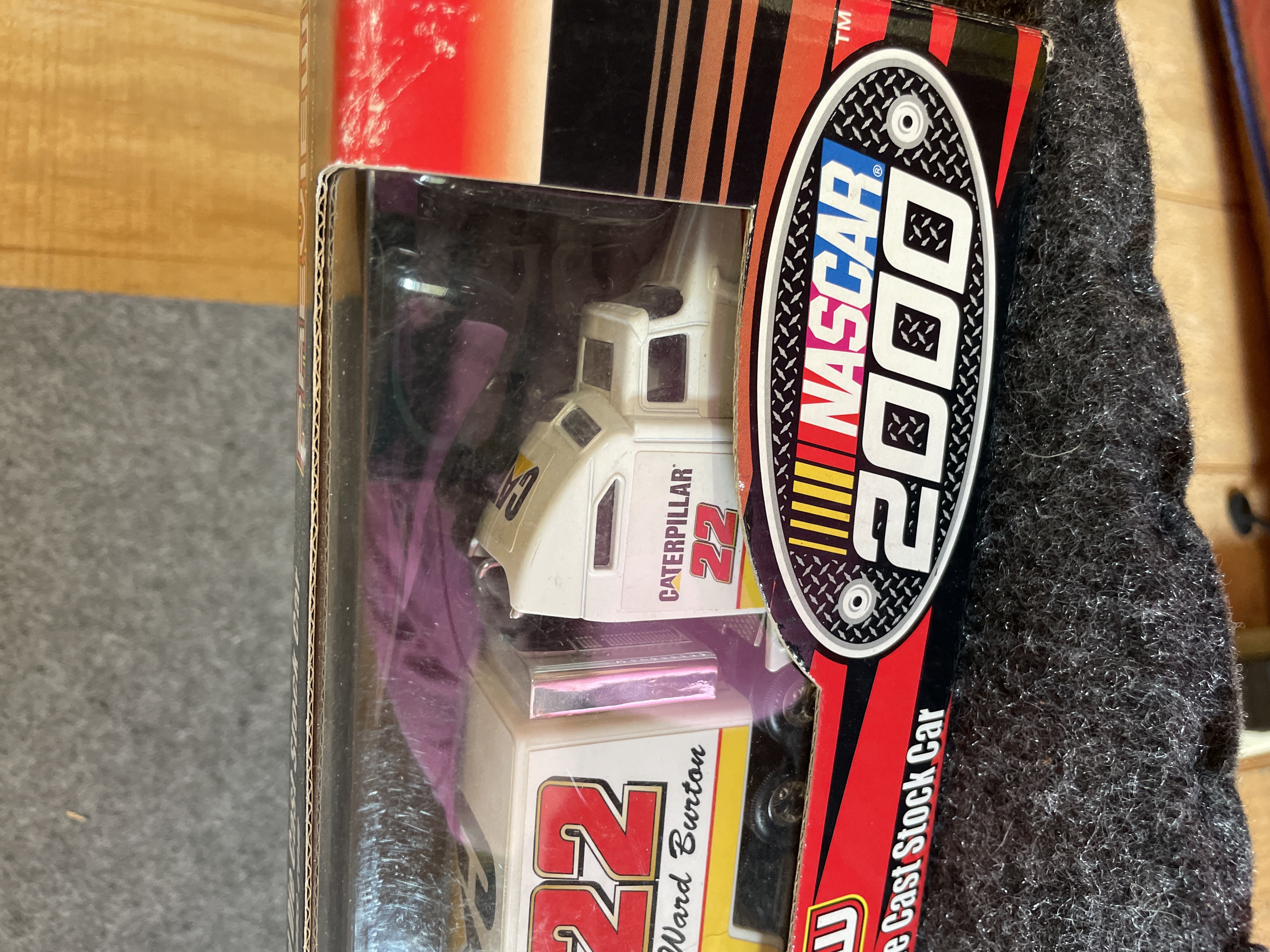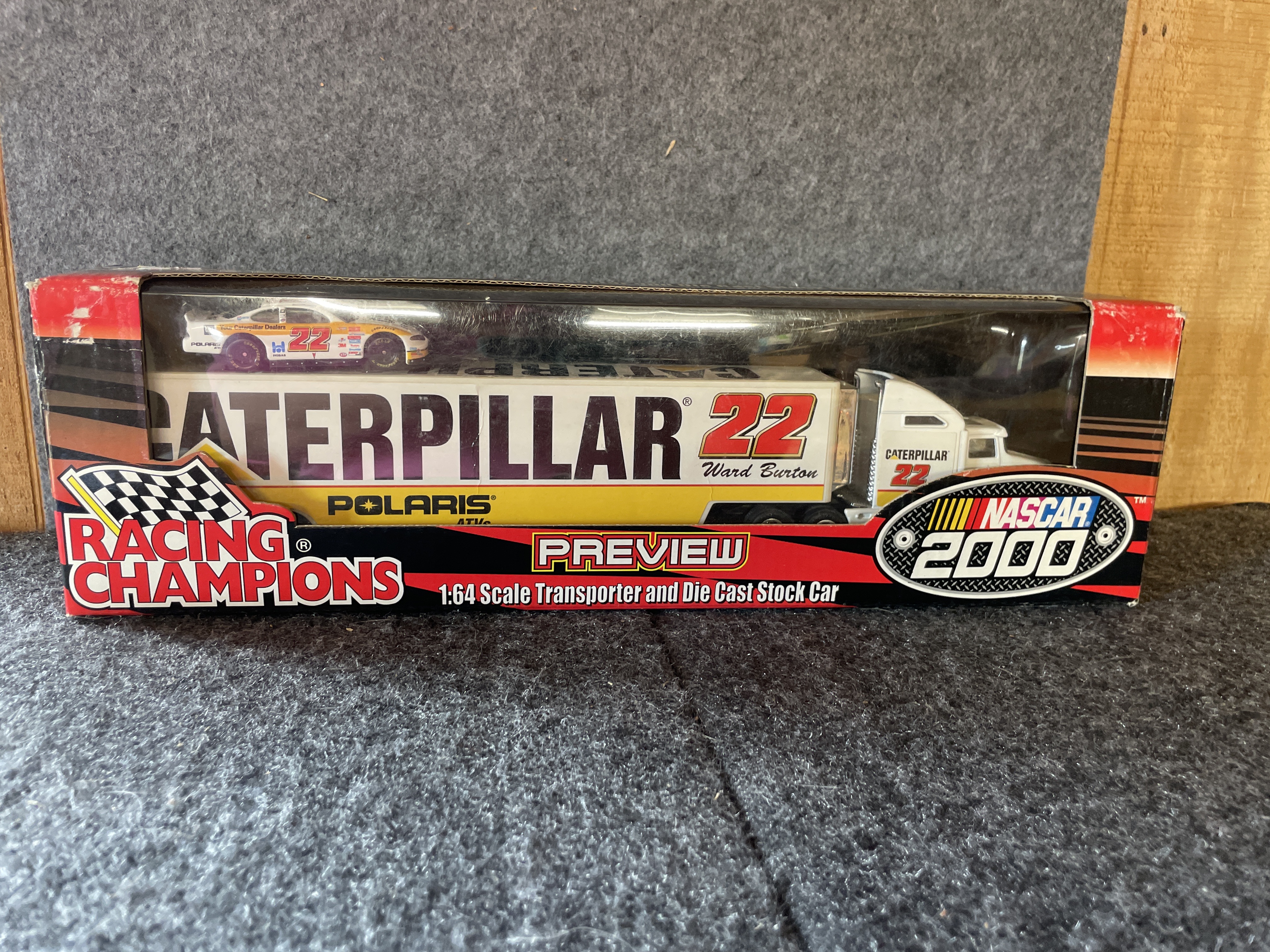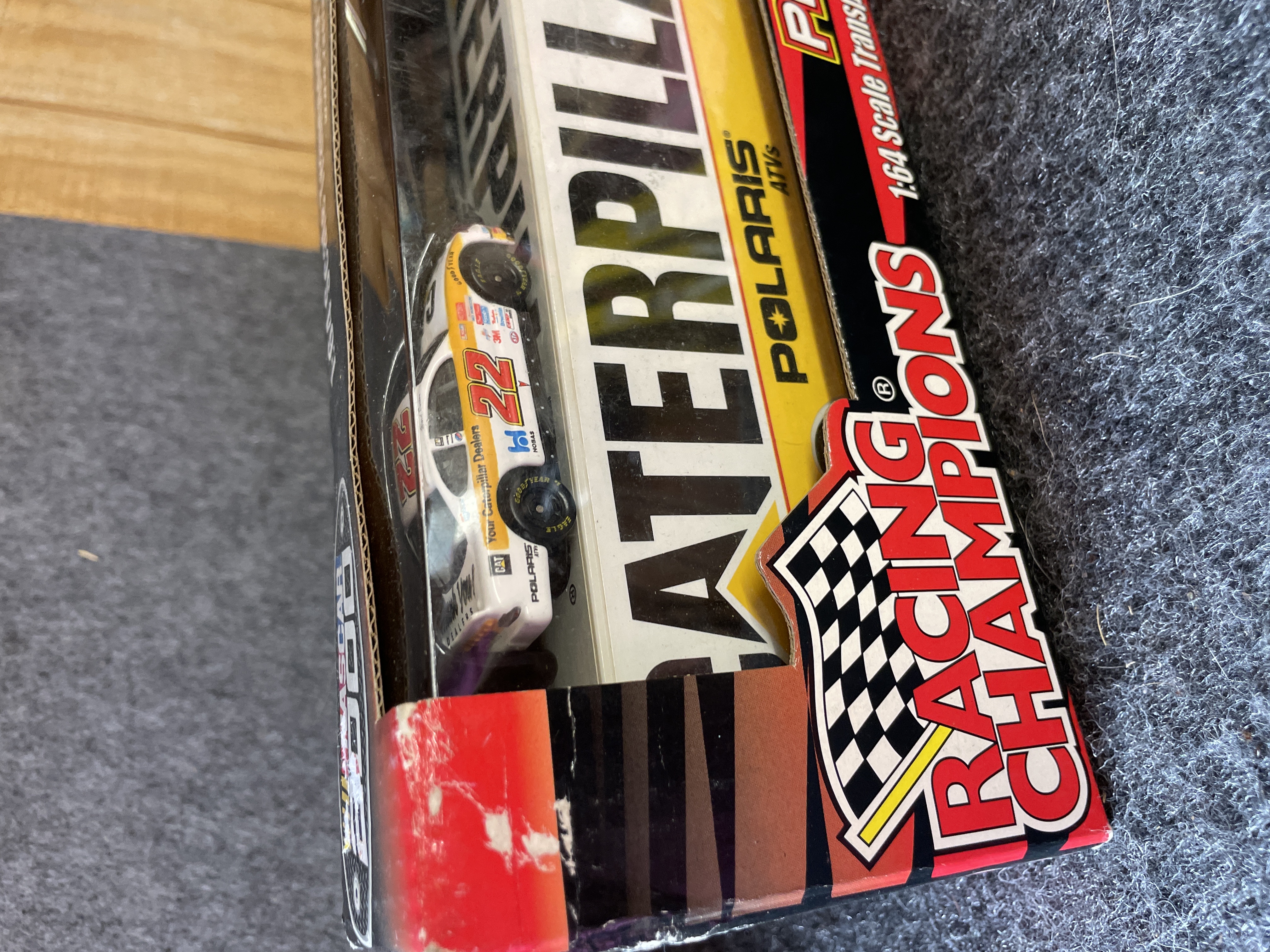 A 1:64 scale die-cast set featuring a white and yellow Ward Burton #22 Caterpillar transporter and matching stock car with Polaris ATV branding in original packaging.