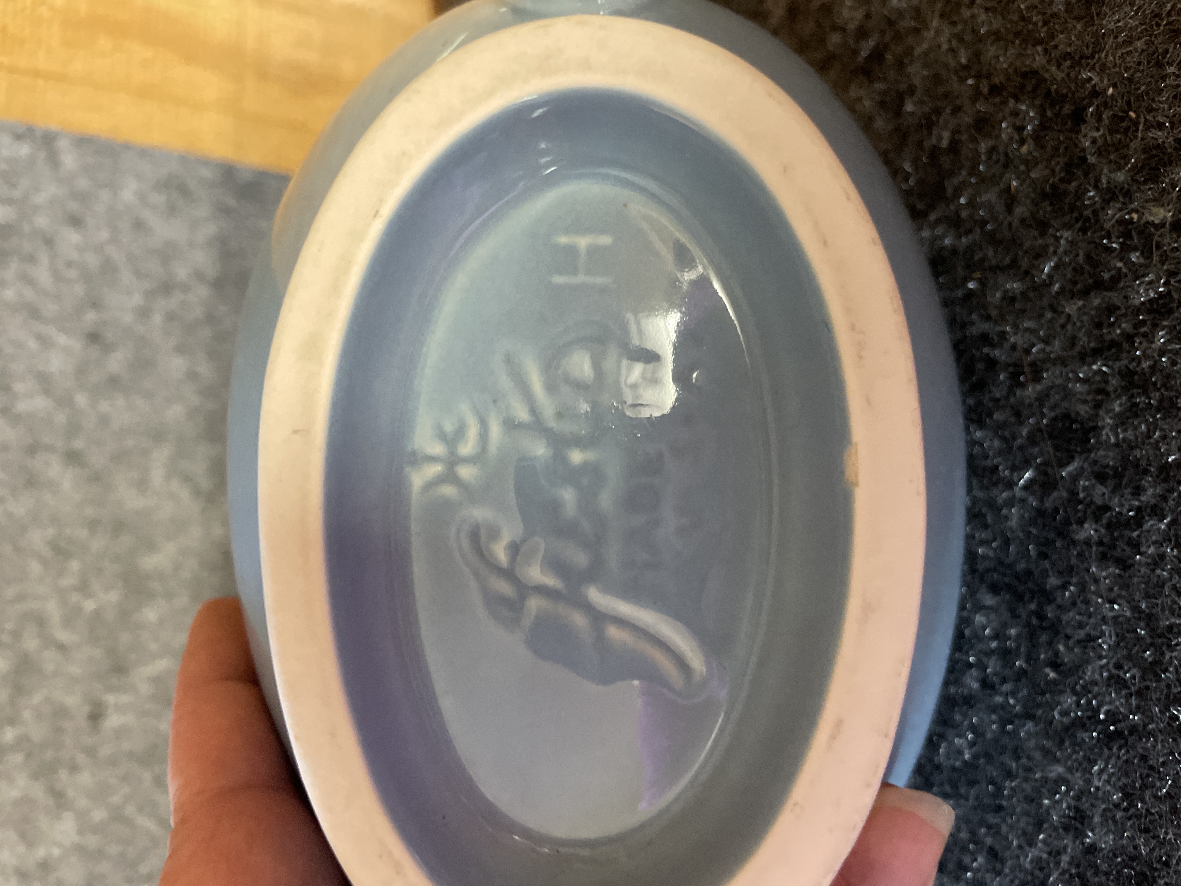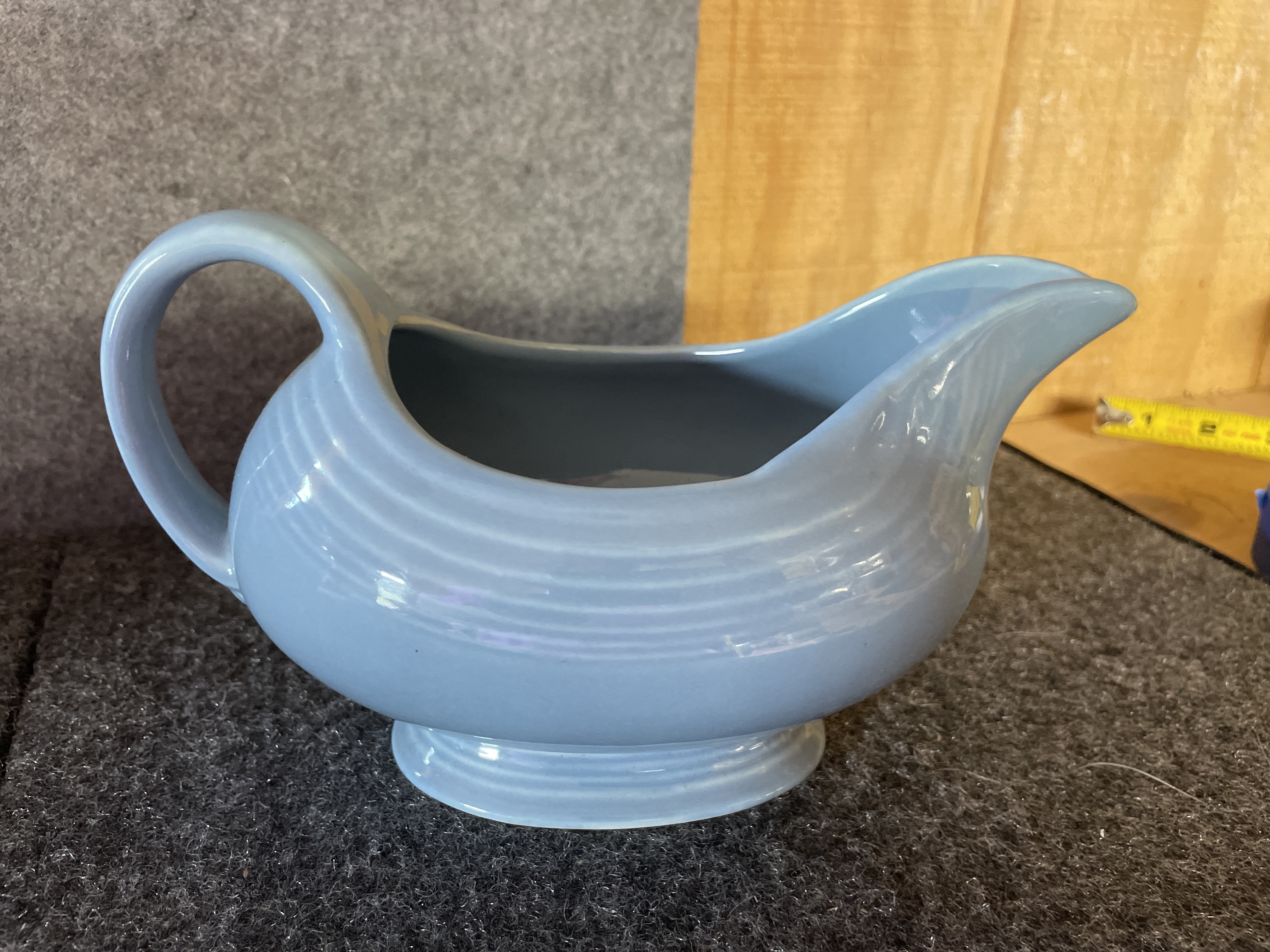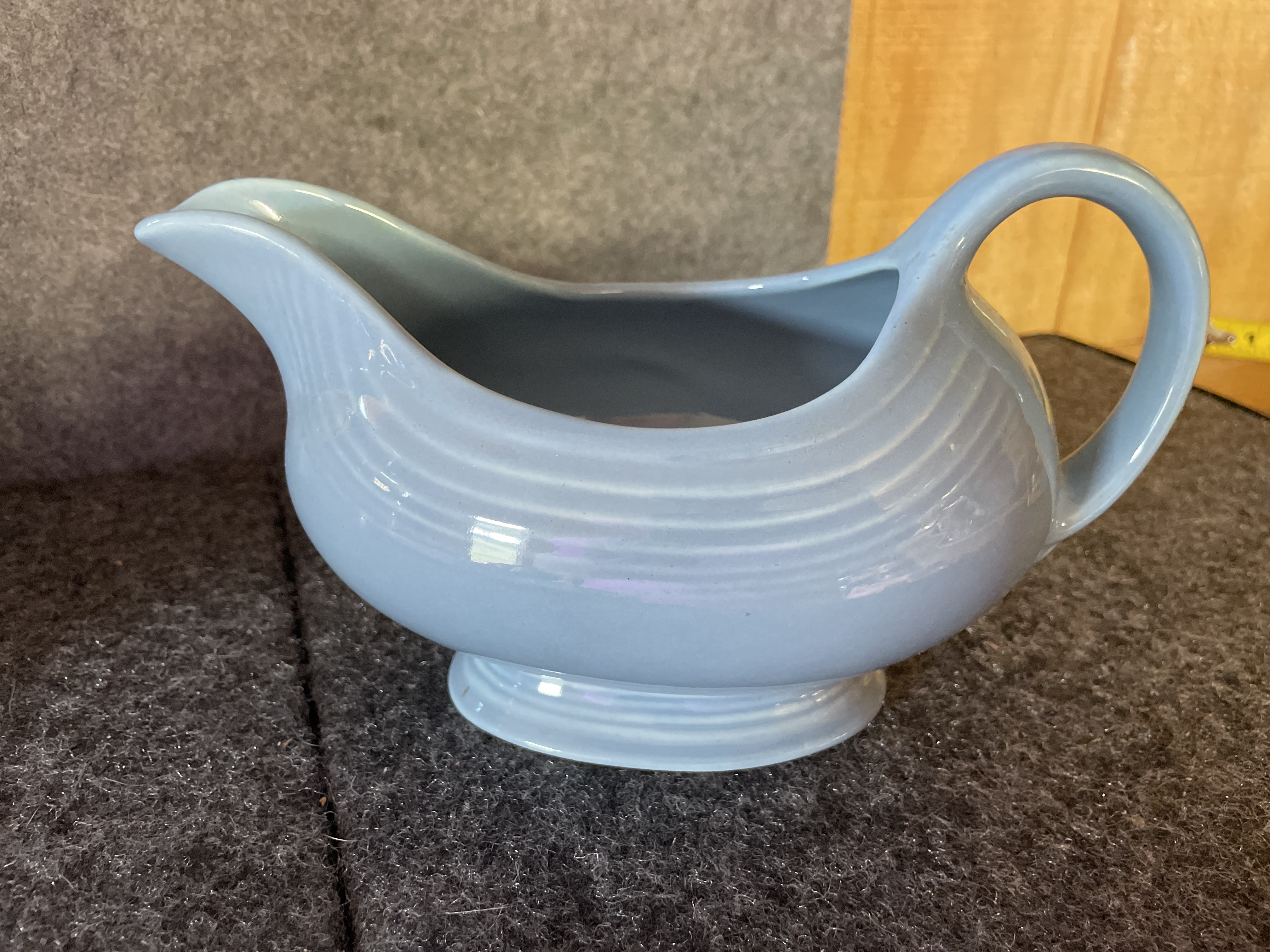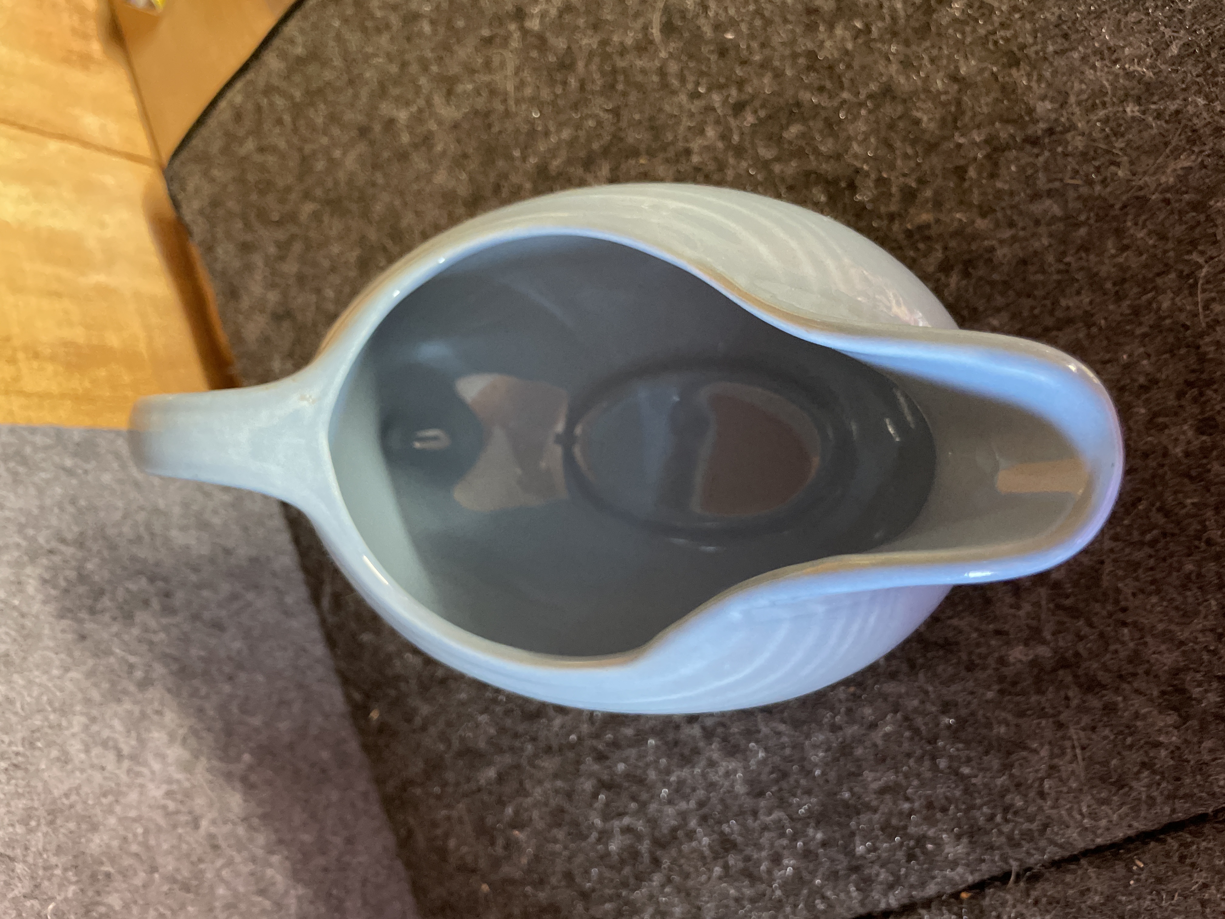 A pair of light blue ceramic items including a gravy boat and a disk pitcher, both bearing the maker’s mark on their undersides.