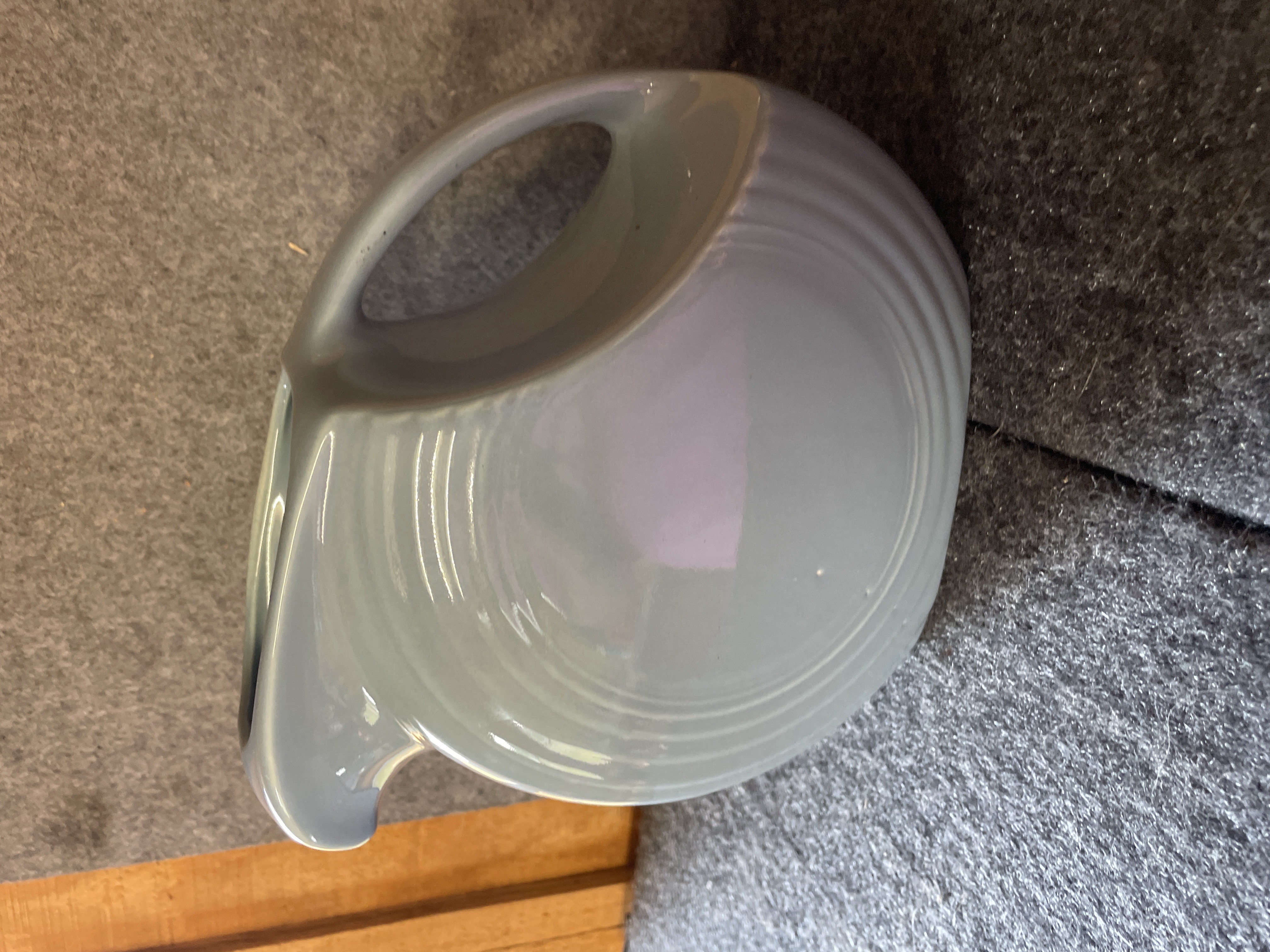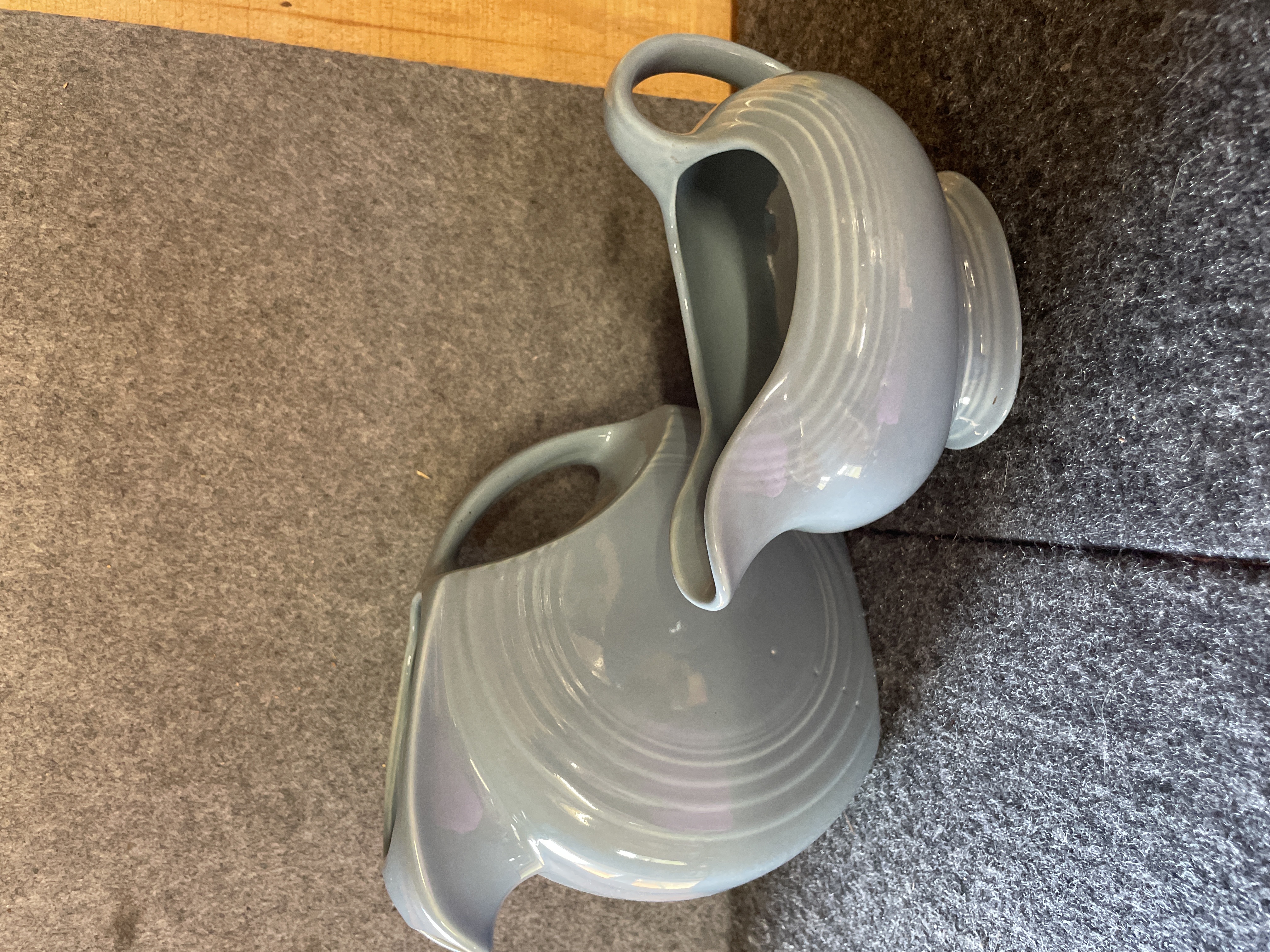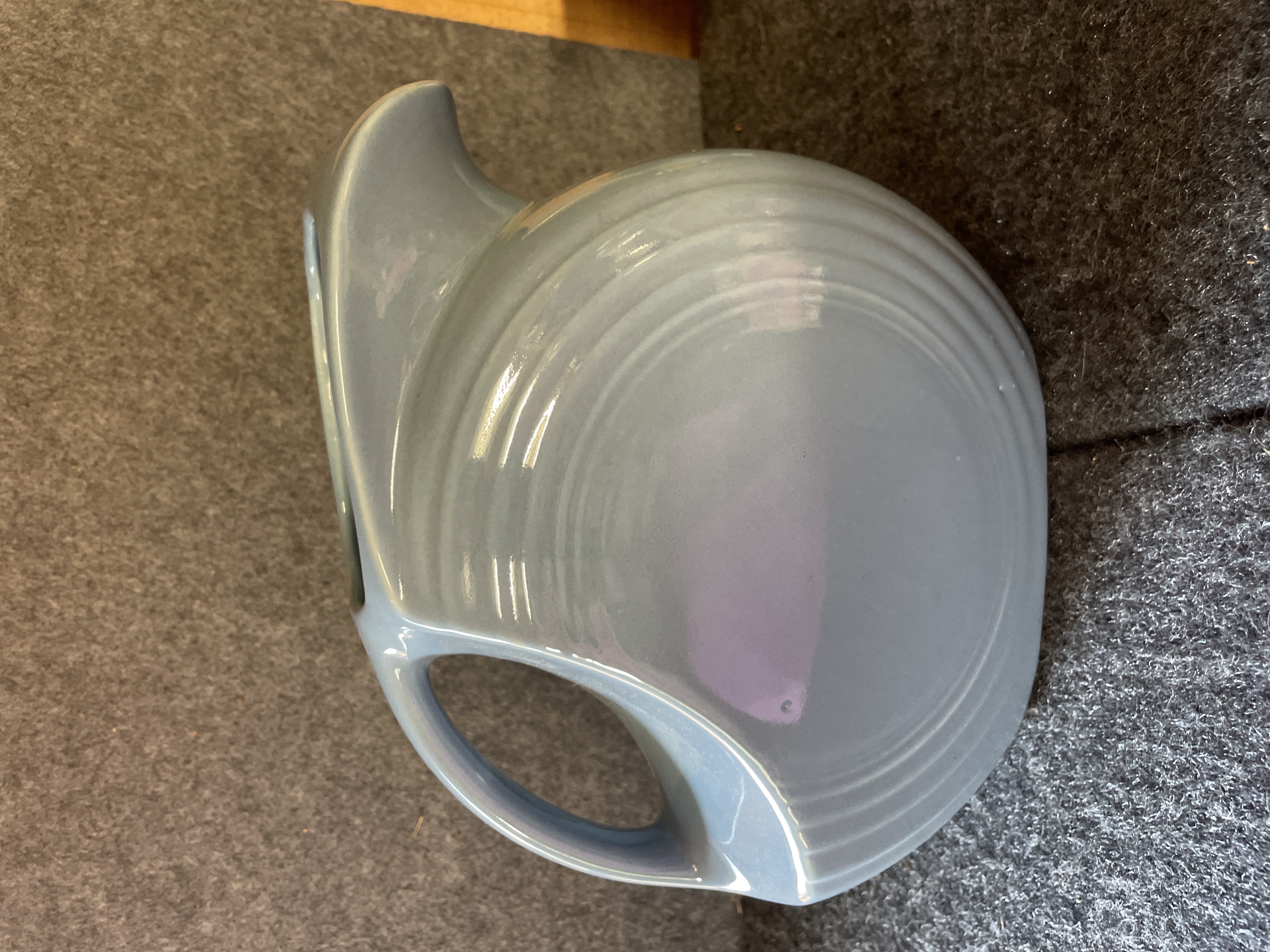 A pair of light blue ceramic items including a gravy boat and a disk pitcher, both bearing the maker’s mark on their undersides.