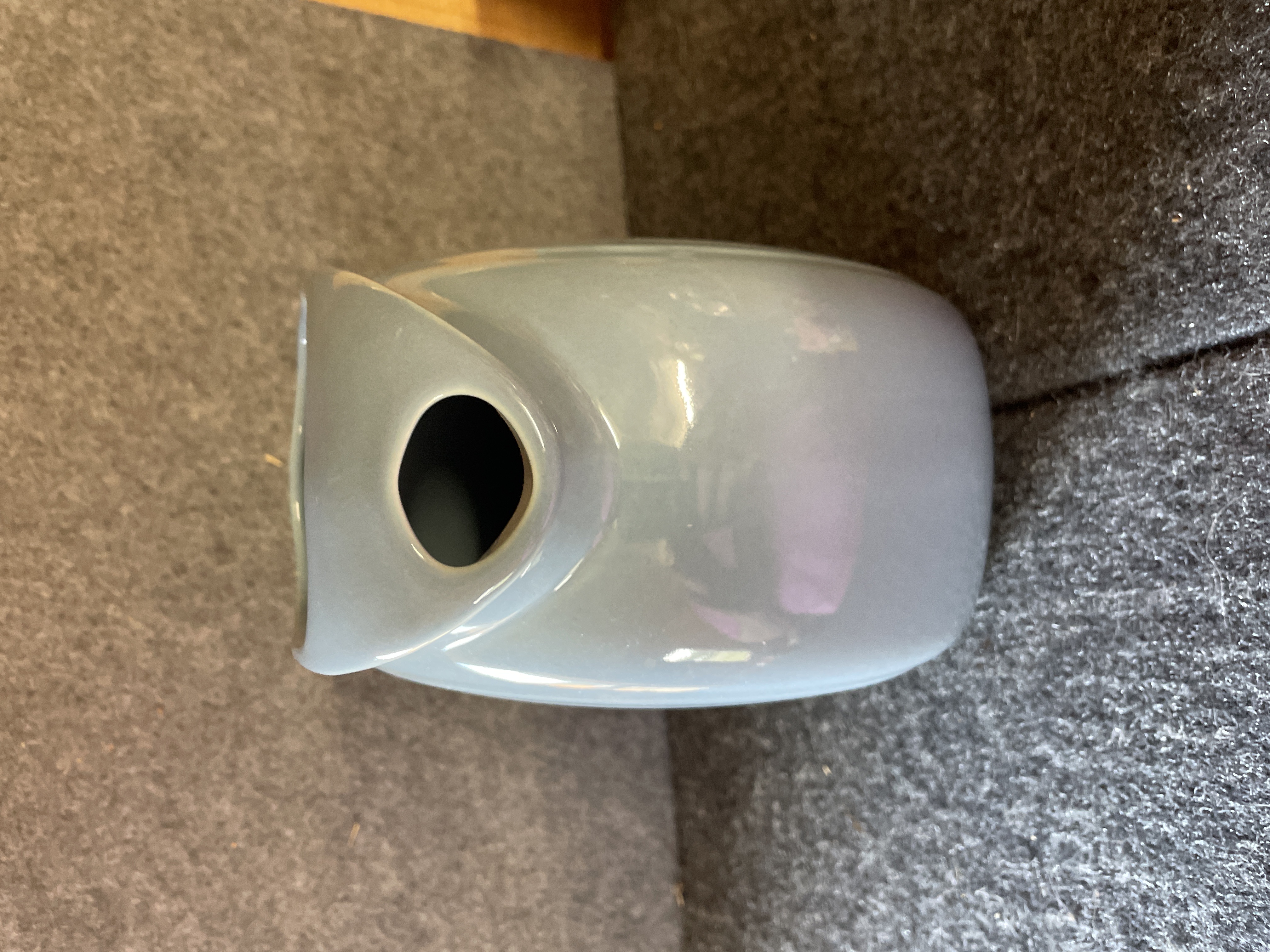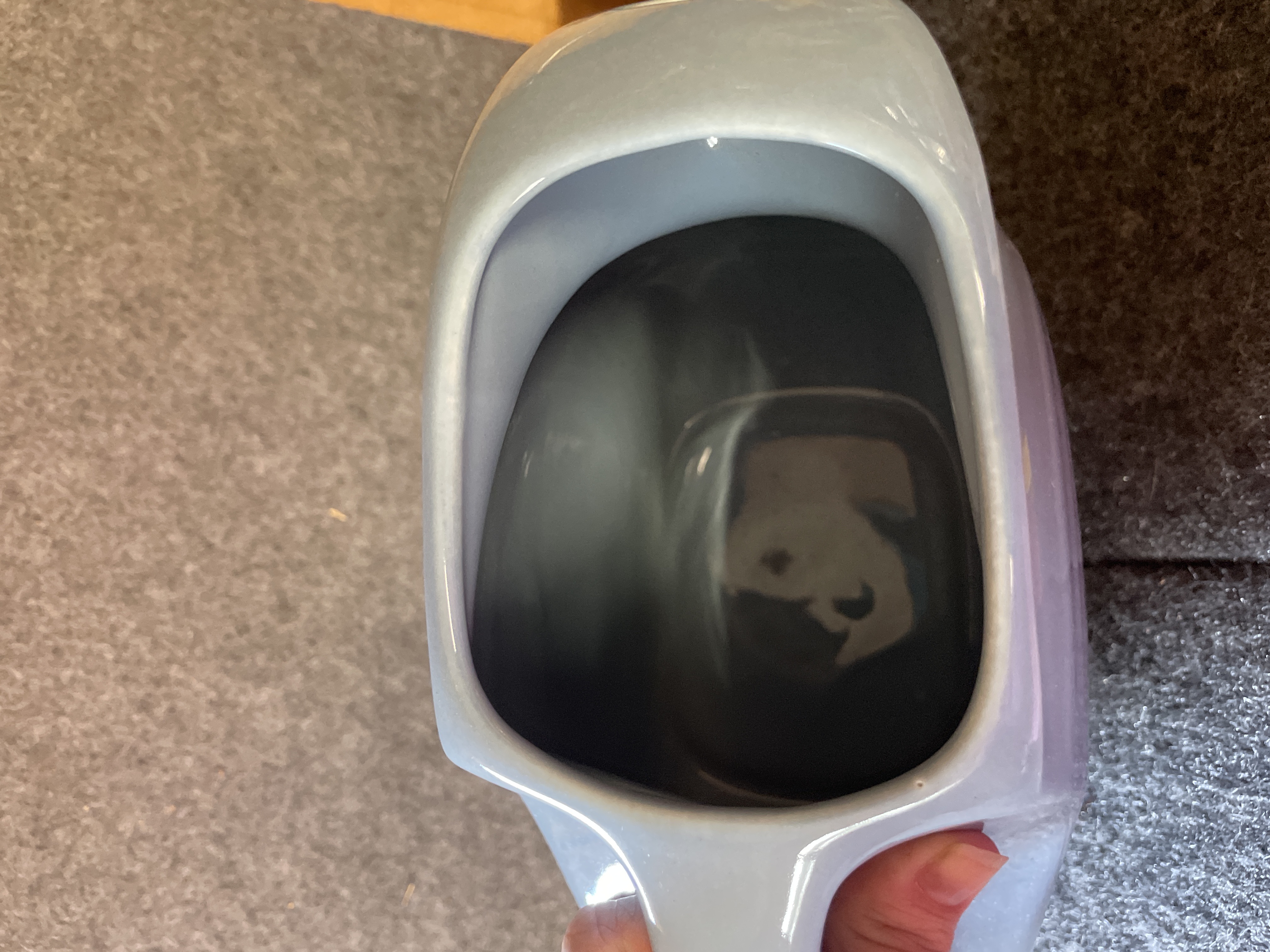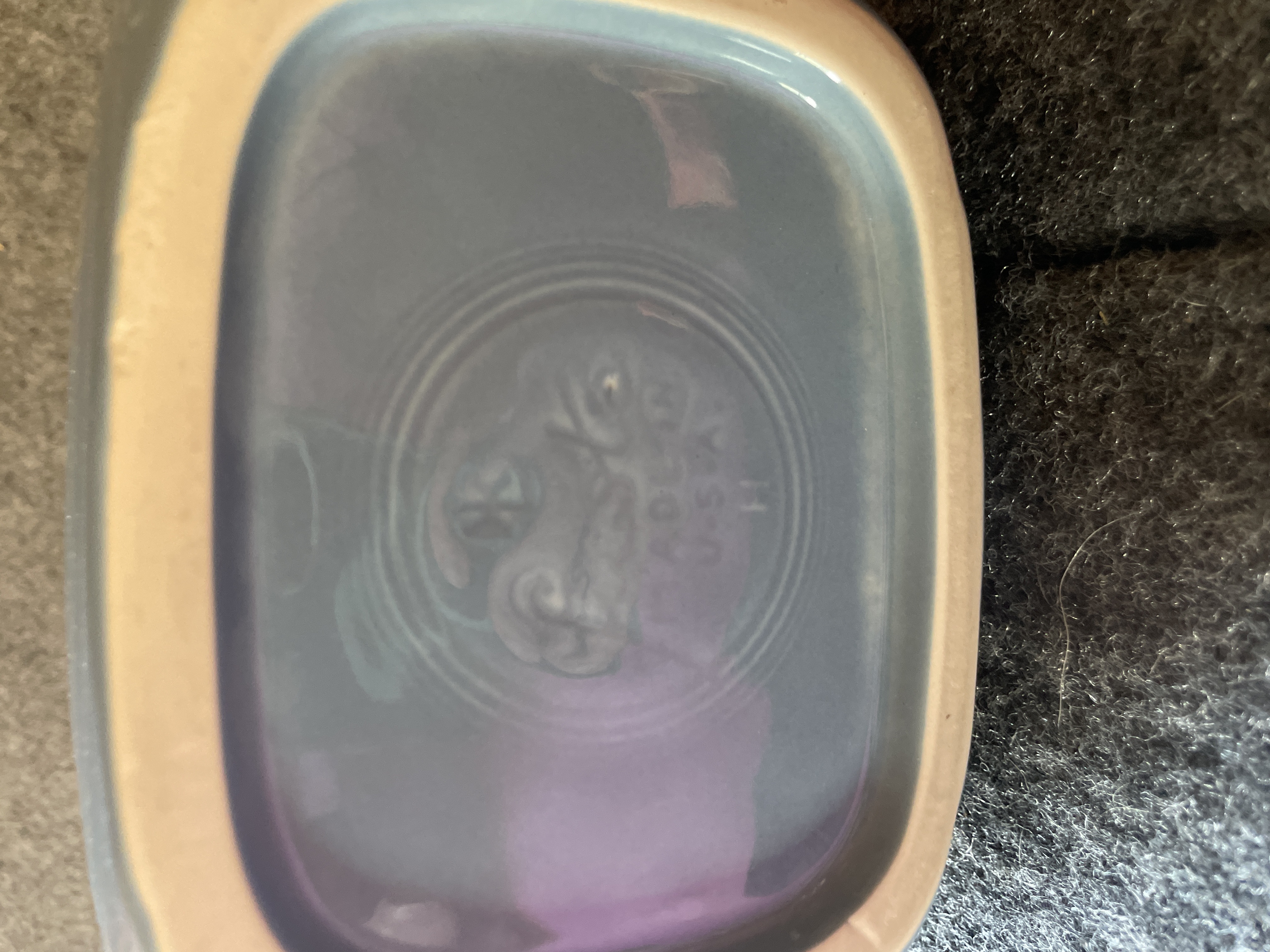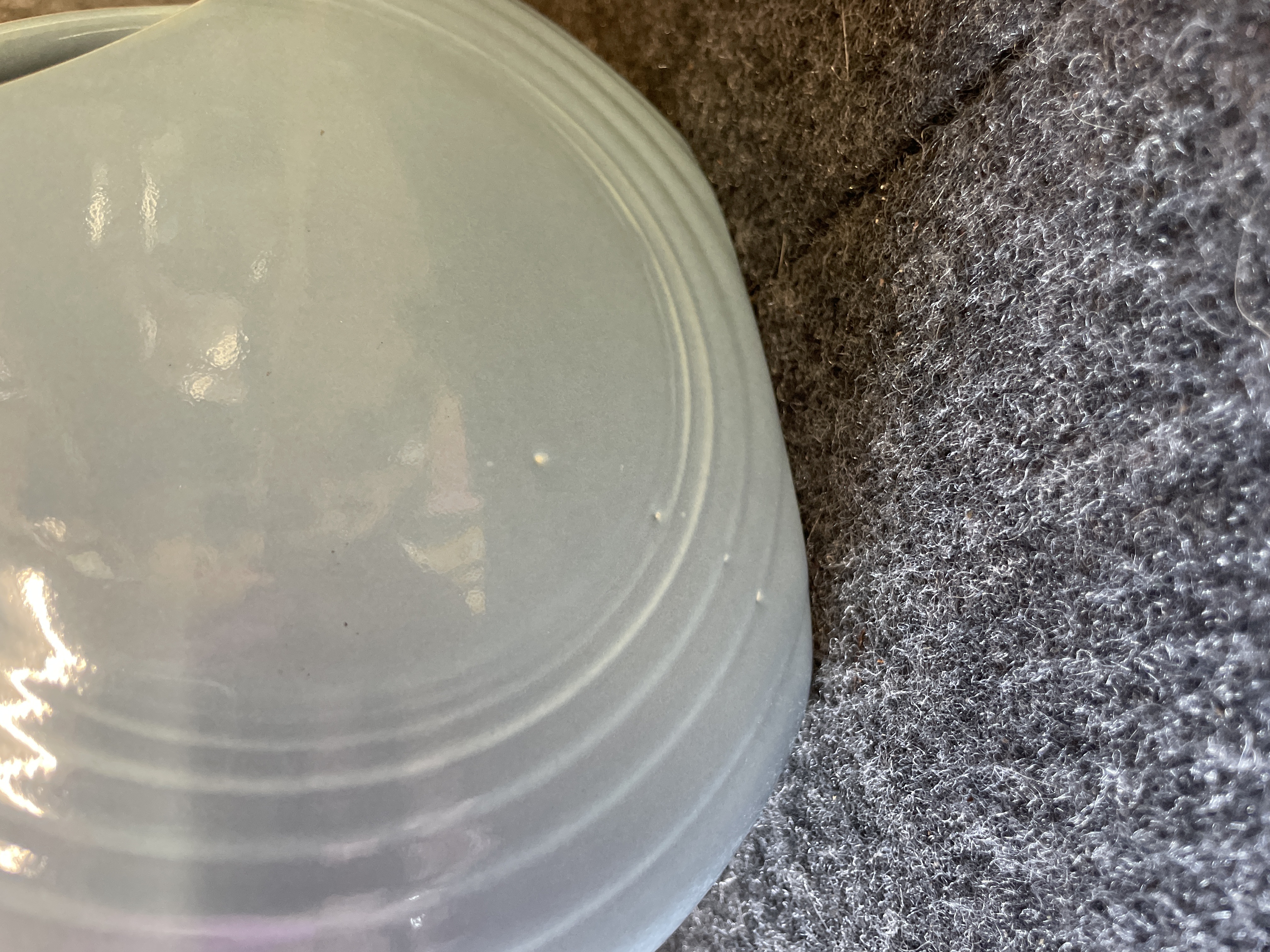 A pair of light blue ceramic items including a gravy boat and a disk pitcher, both bearing the maker’s mark on their undersides.