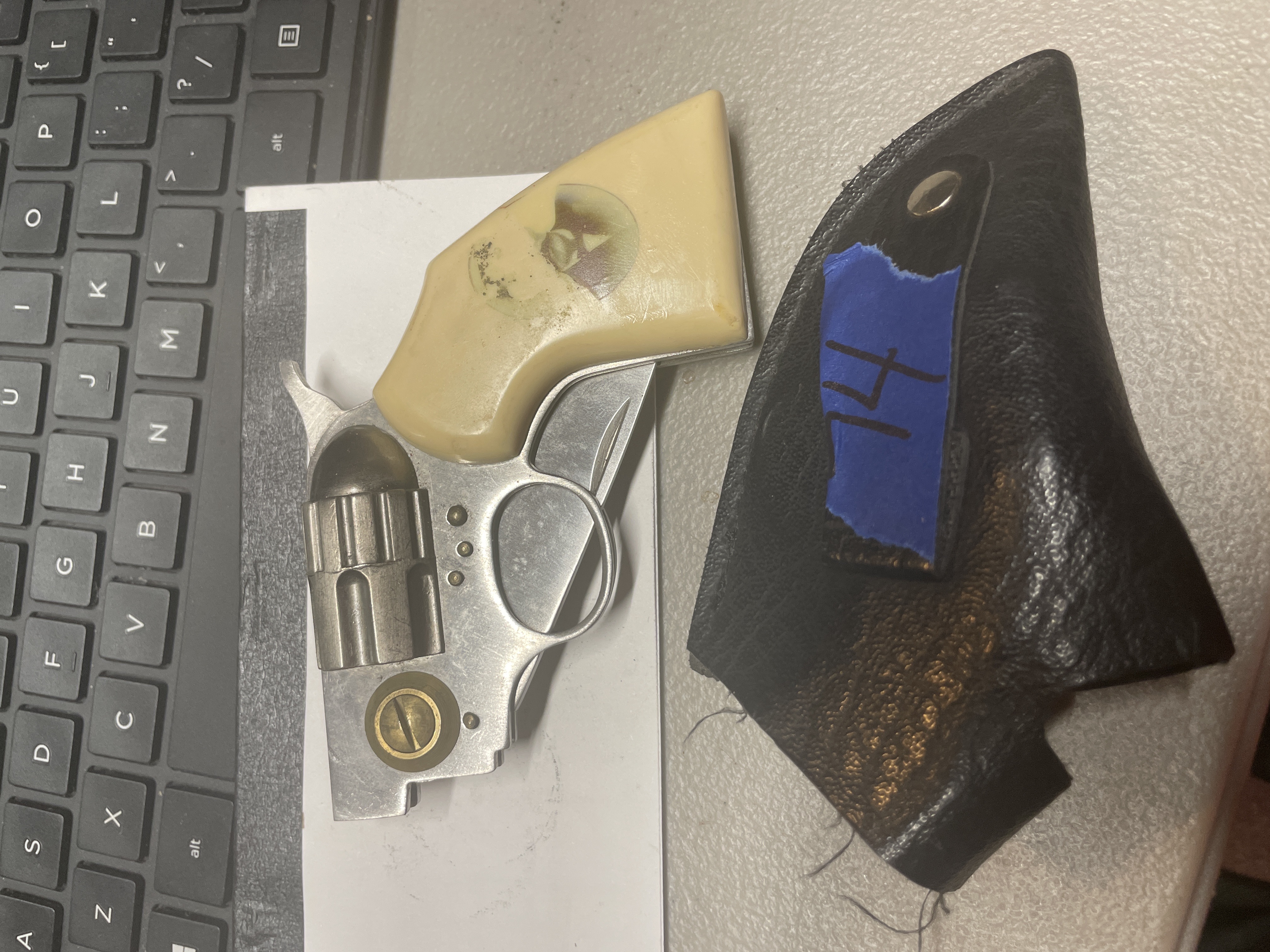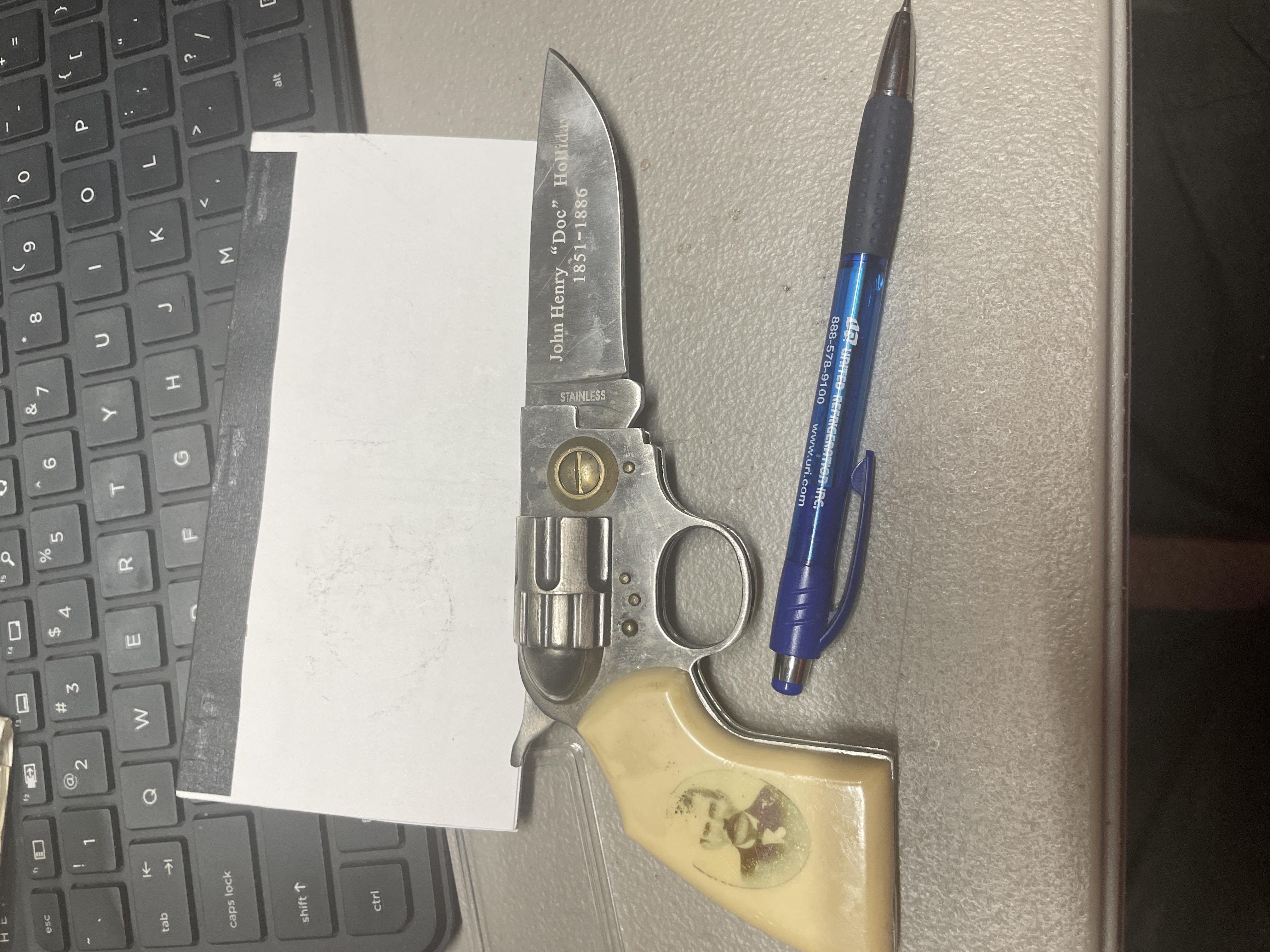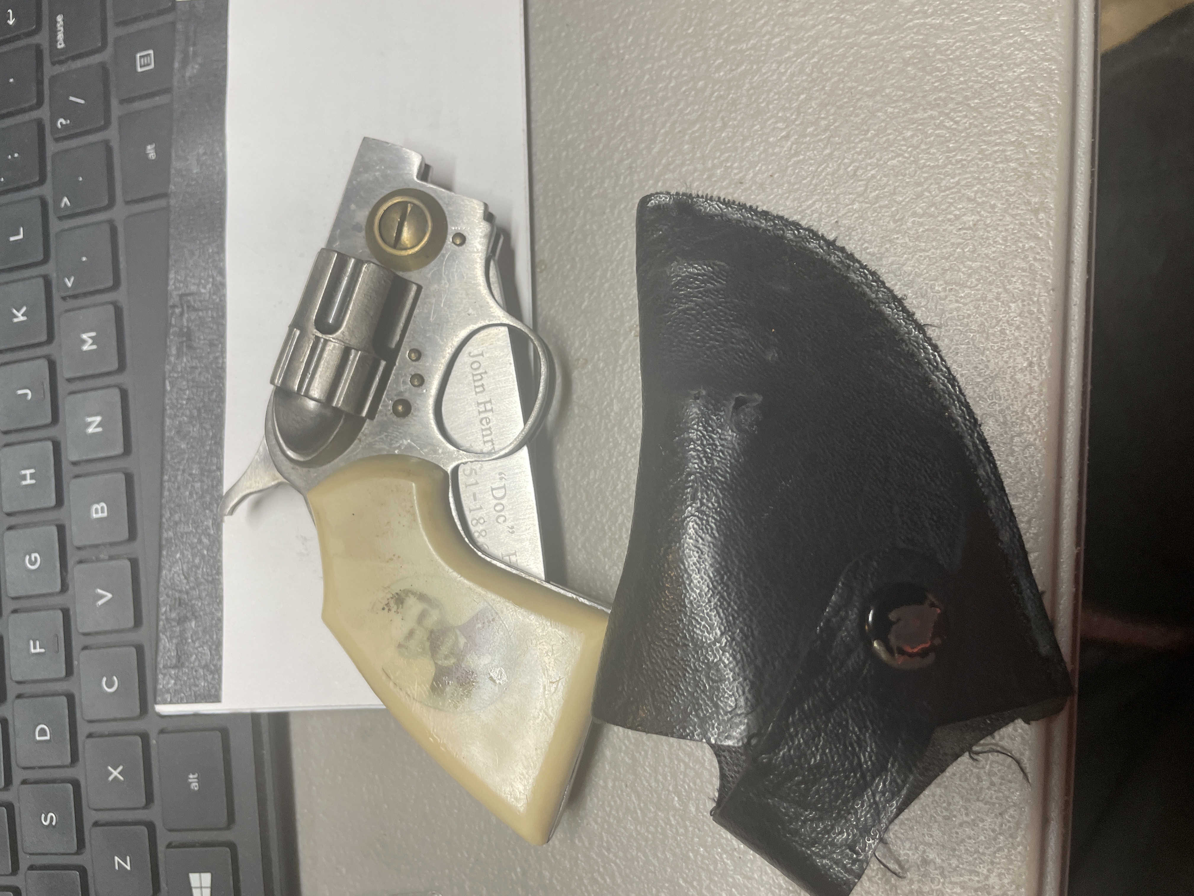 JOHN HENRY “DOC” HOLLIDAY folding pistol knife unsharpened decal on handles fading locking blade has loop on holster for belt carry