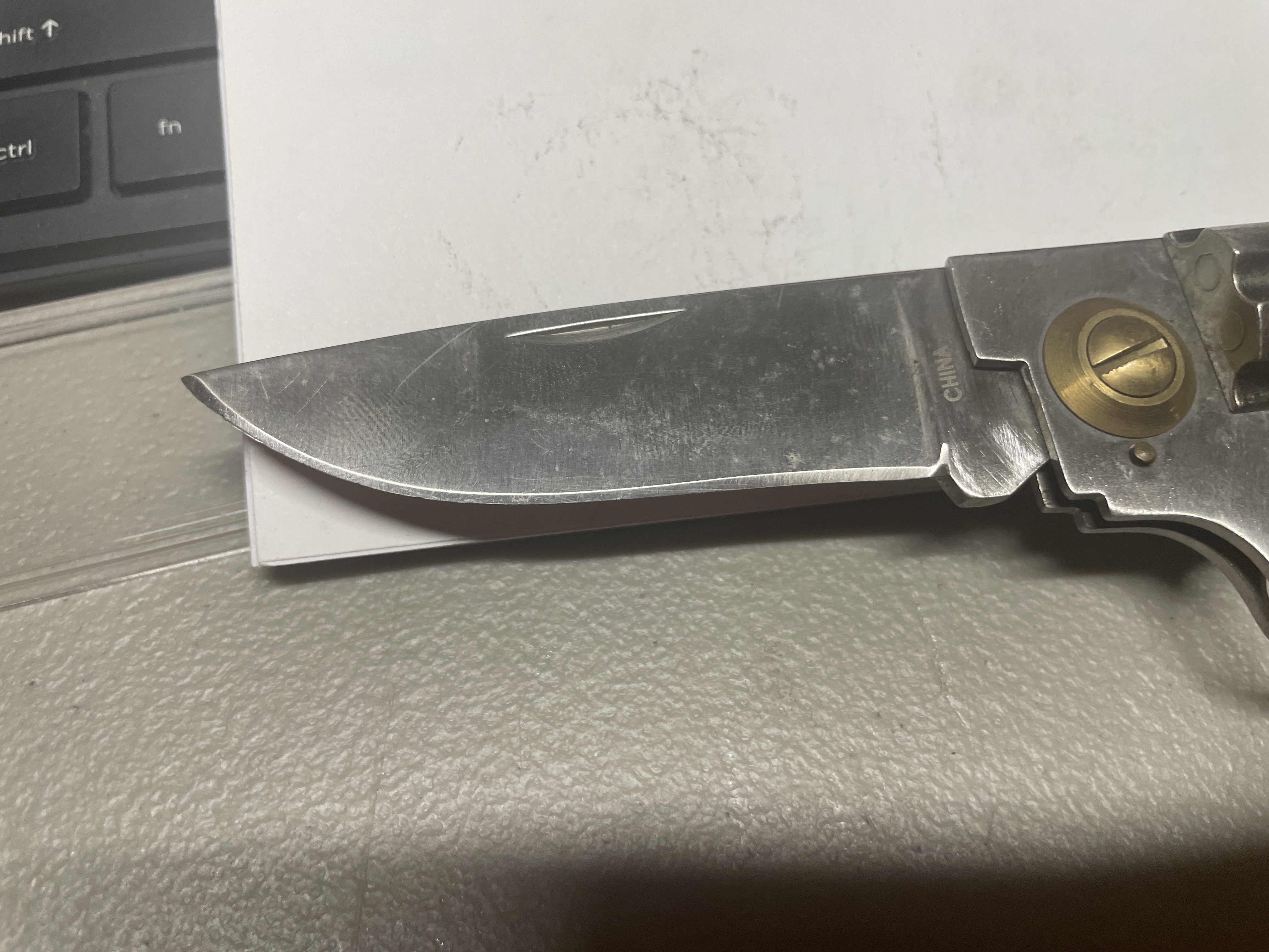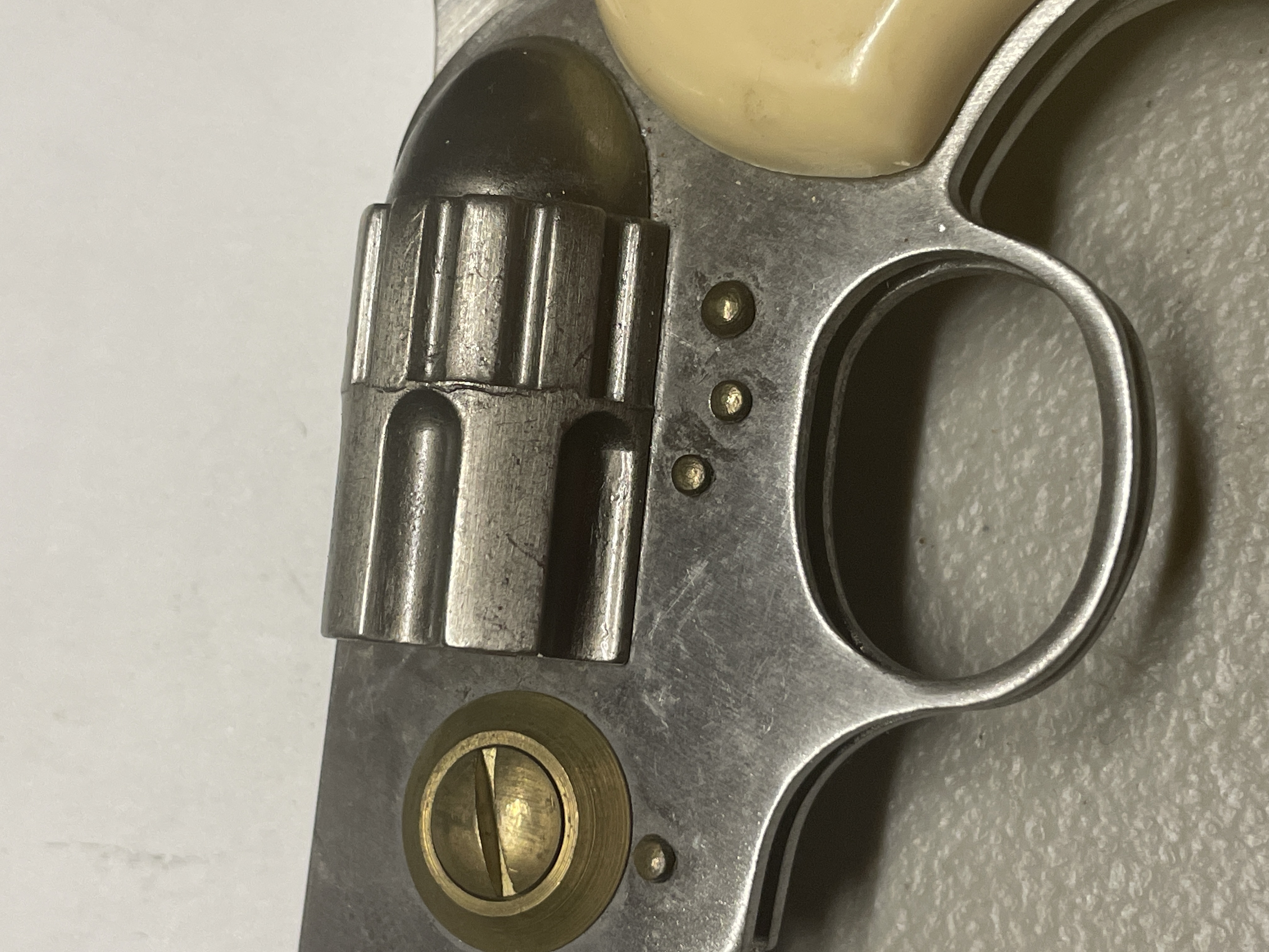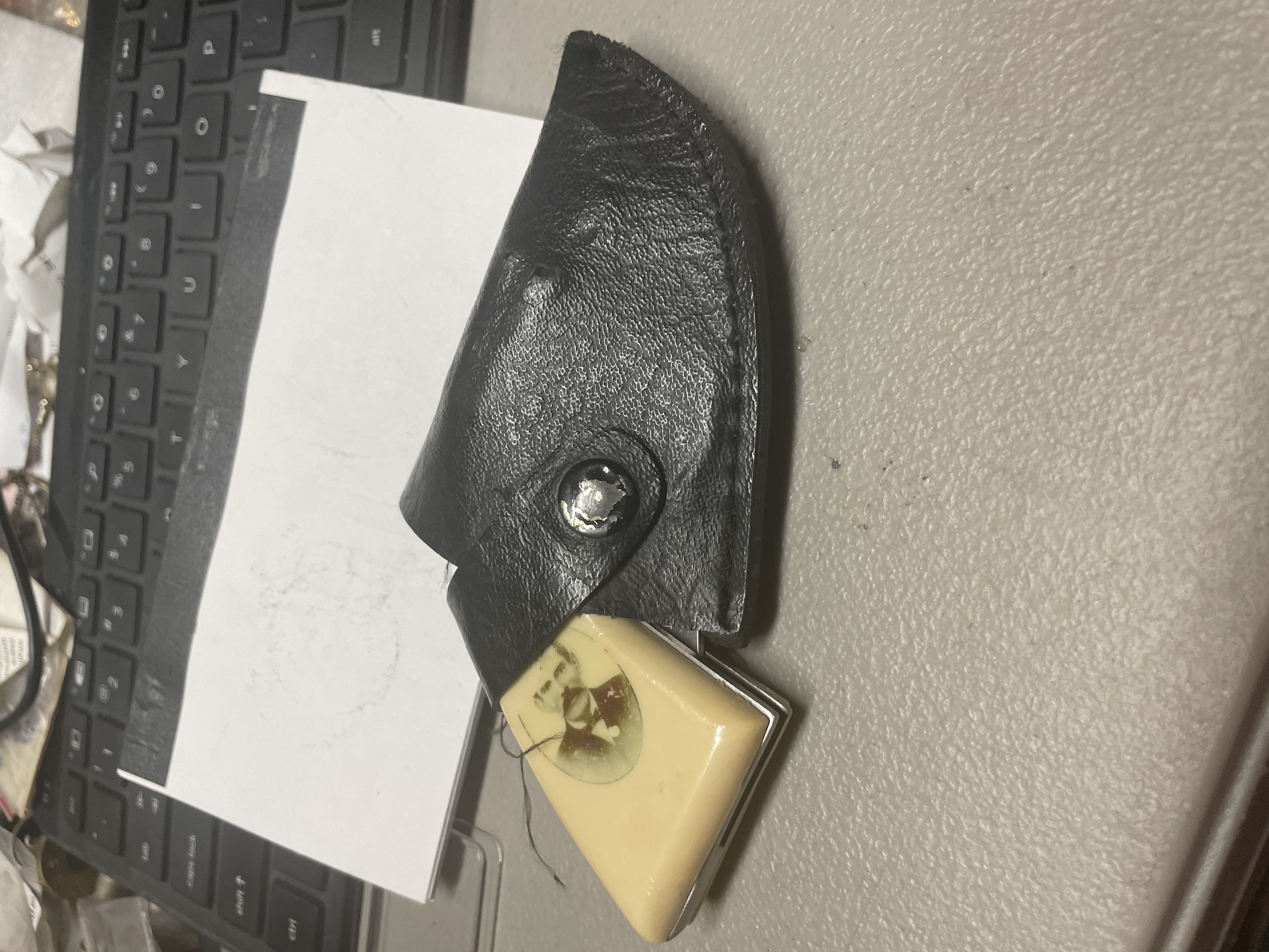 JOHN HENRY “DOC” HOLLIDAY folding pistol knife unsharpened decal on handles fading locking blade has loop on holster for belt carry