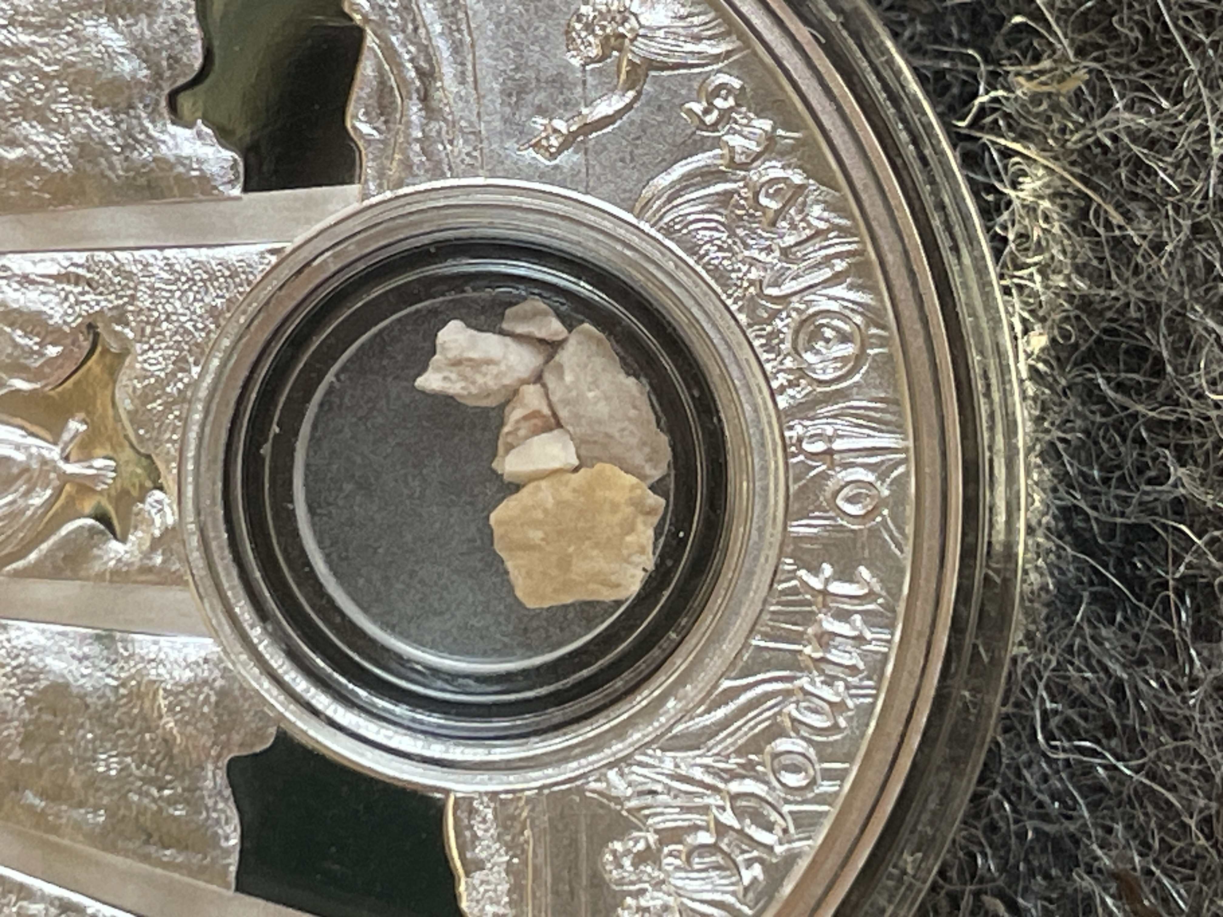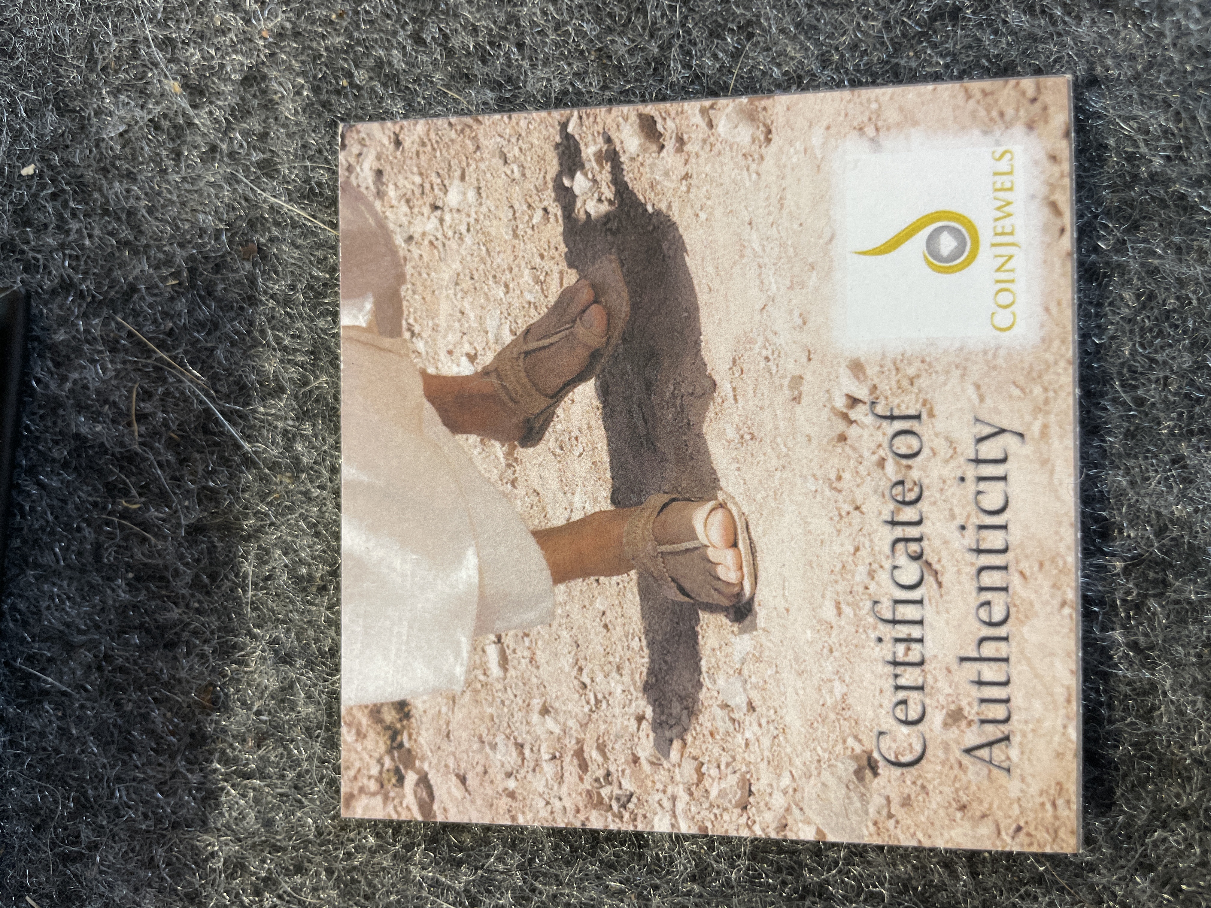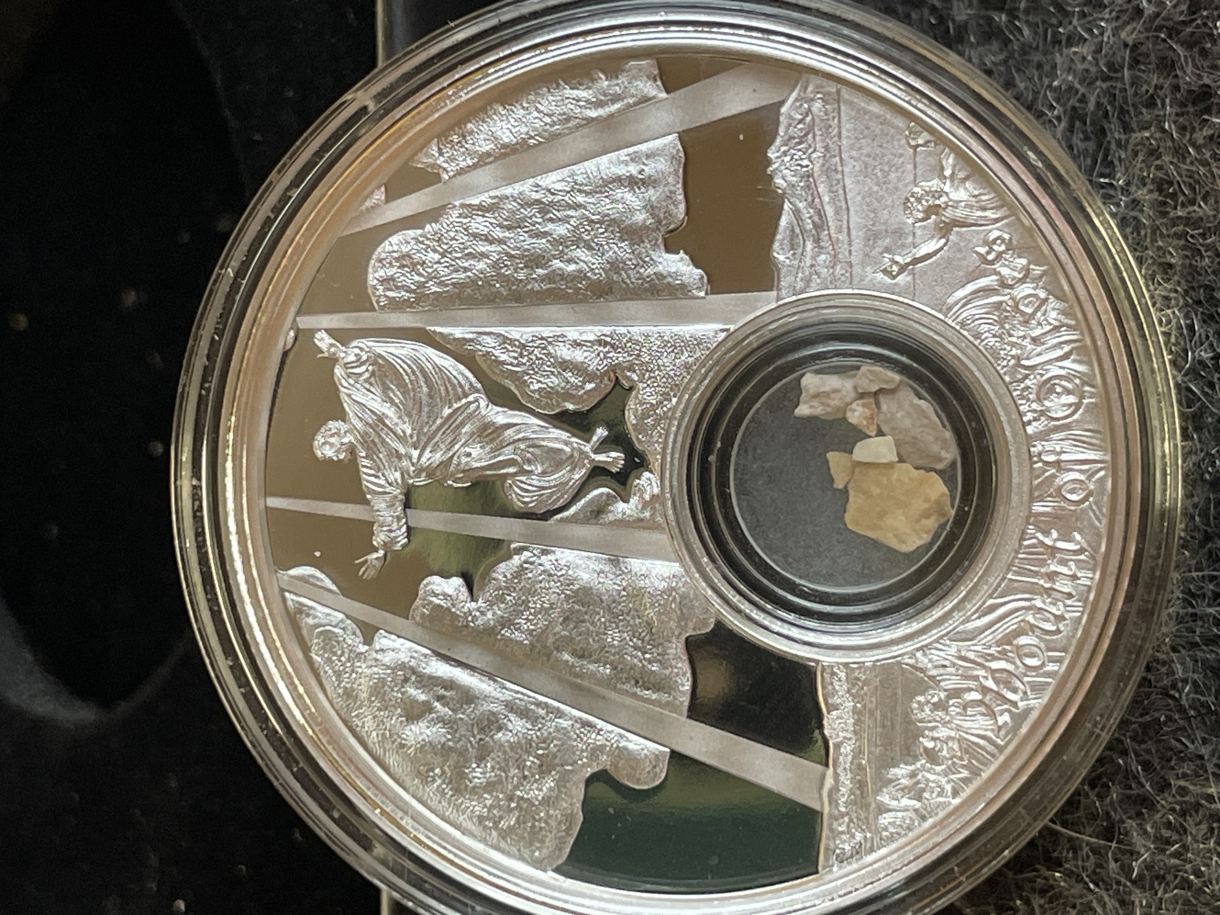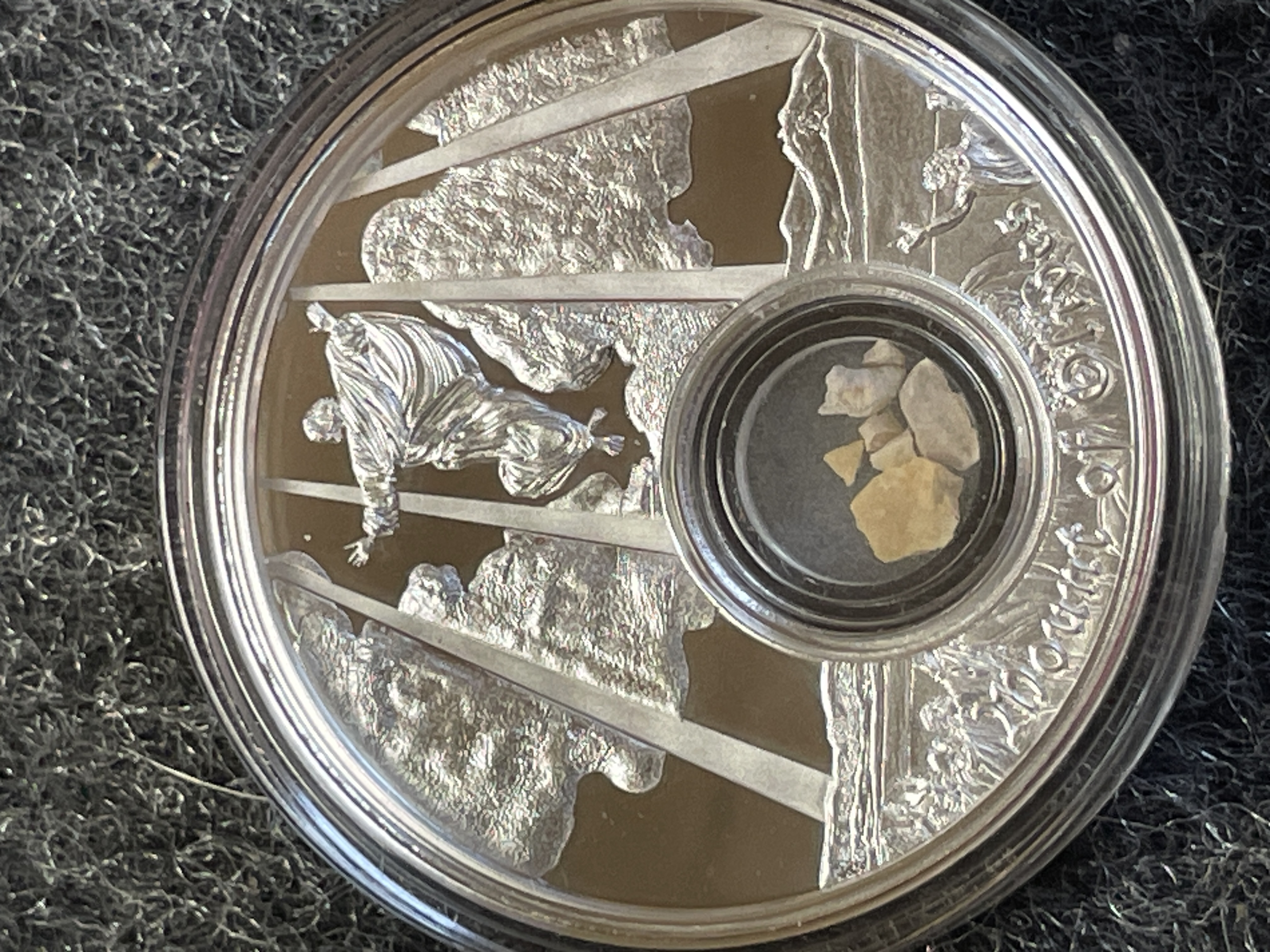 A 1oz .999 silver proof coin featuring a Jerusalem Stone inset, measuring 39.6mm in diameter, with original box and certificate.
