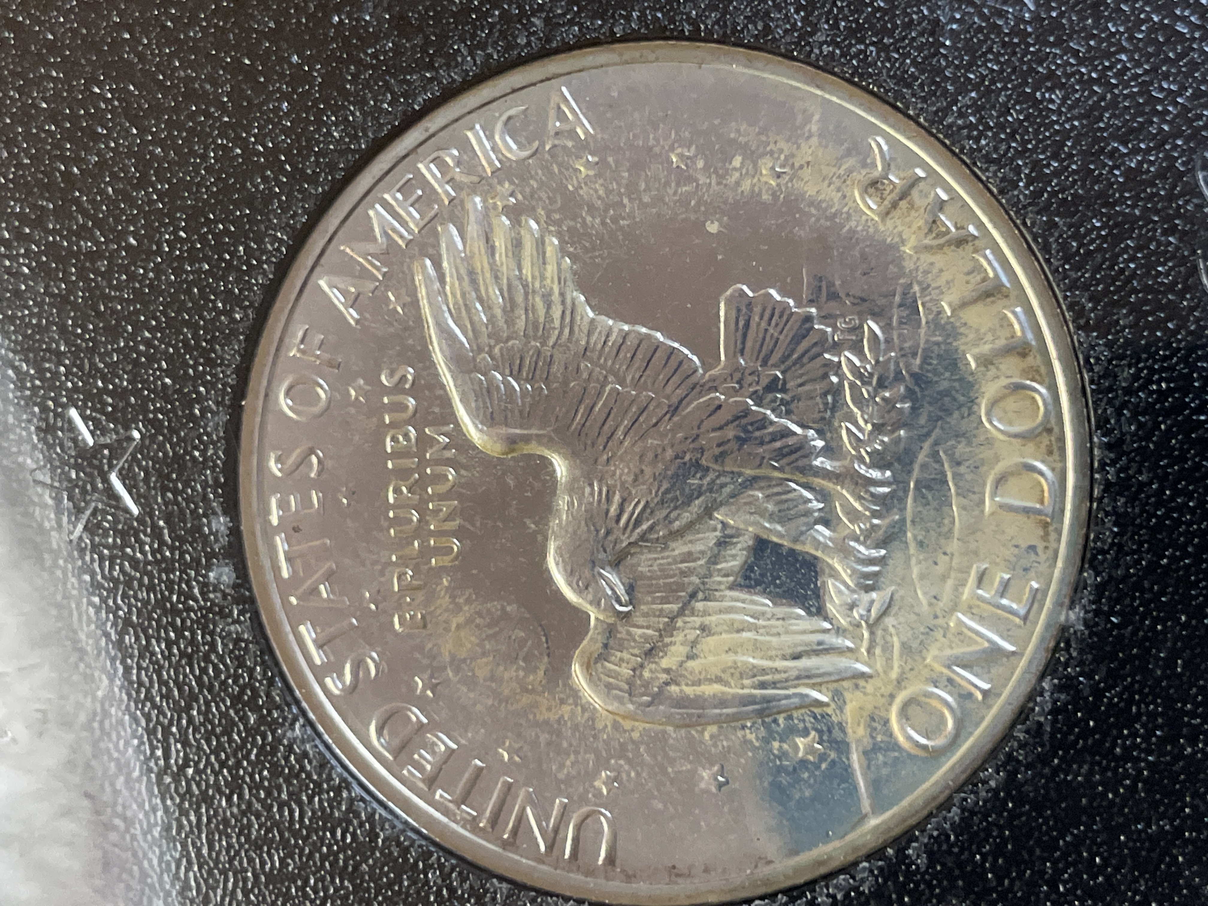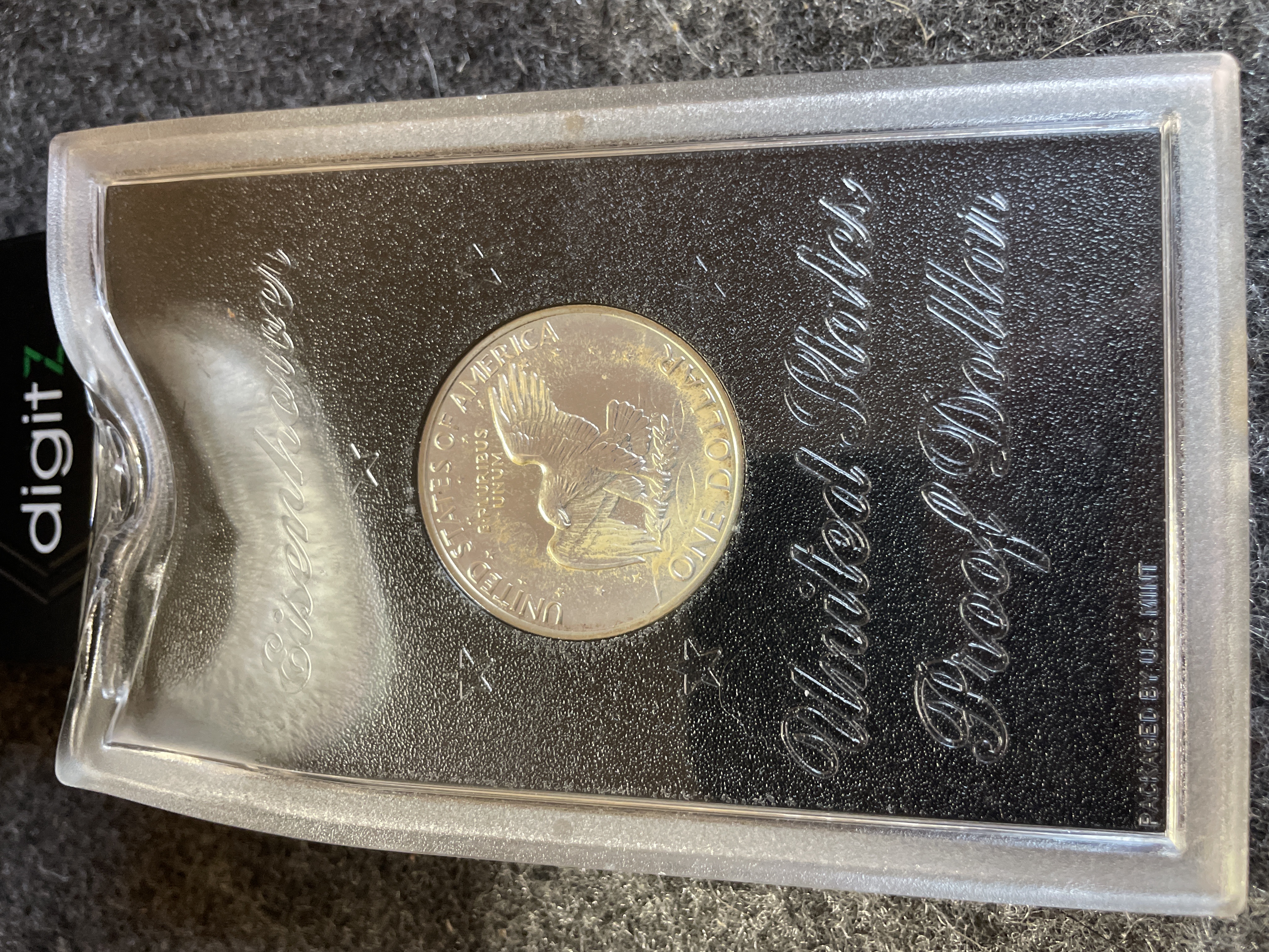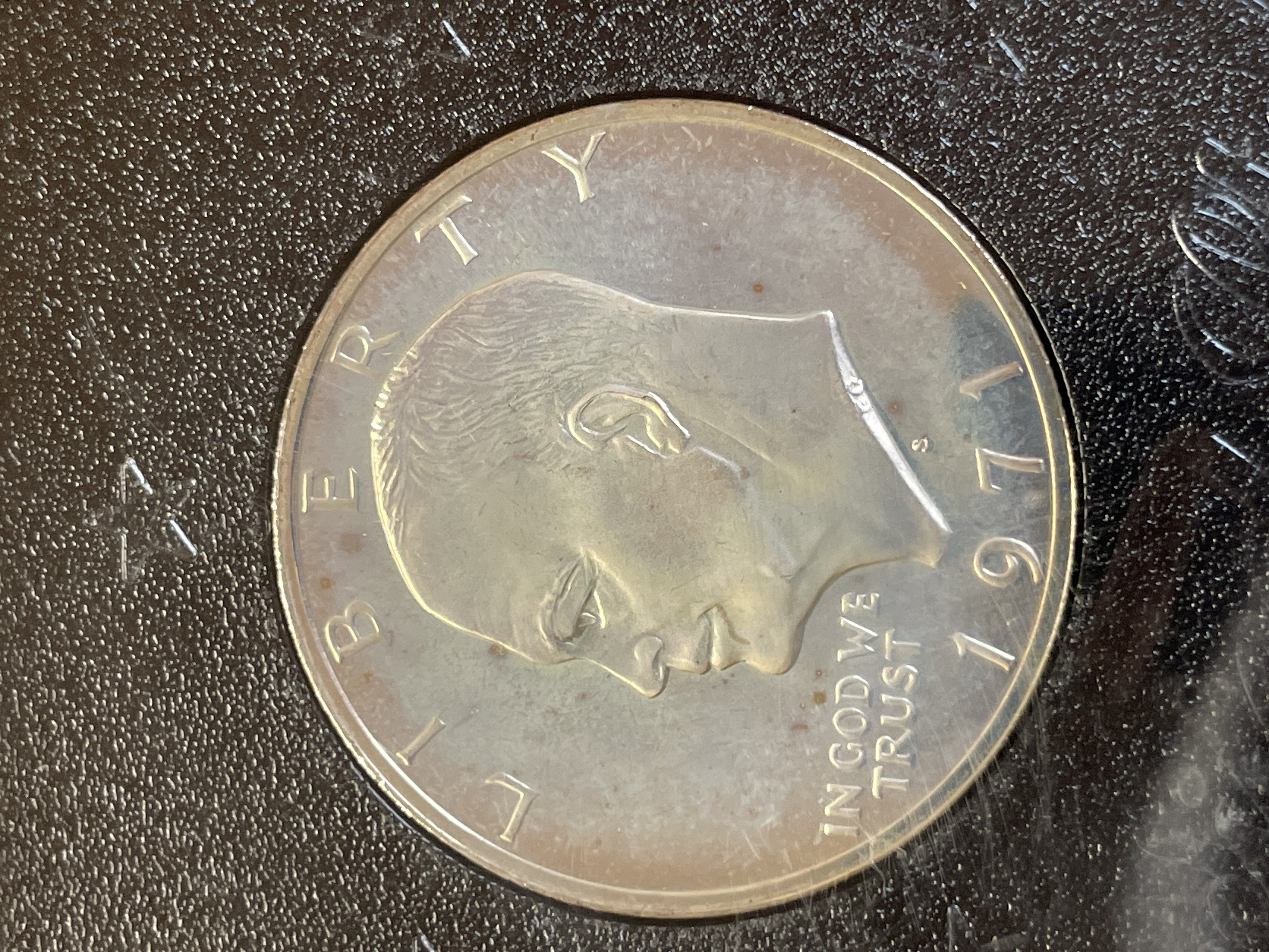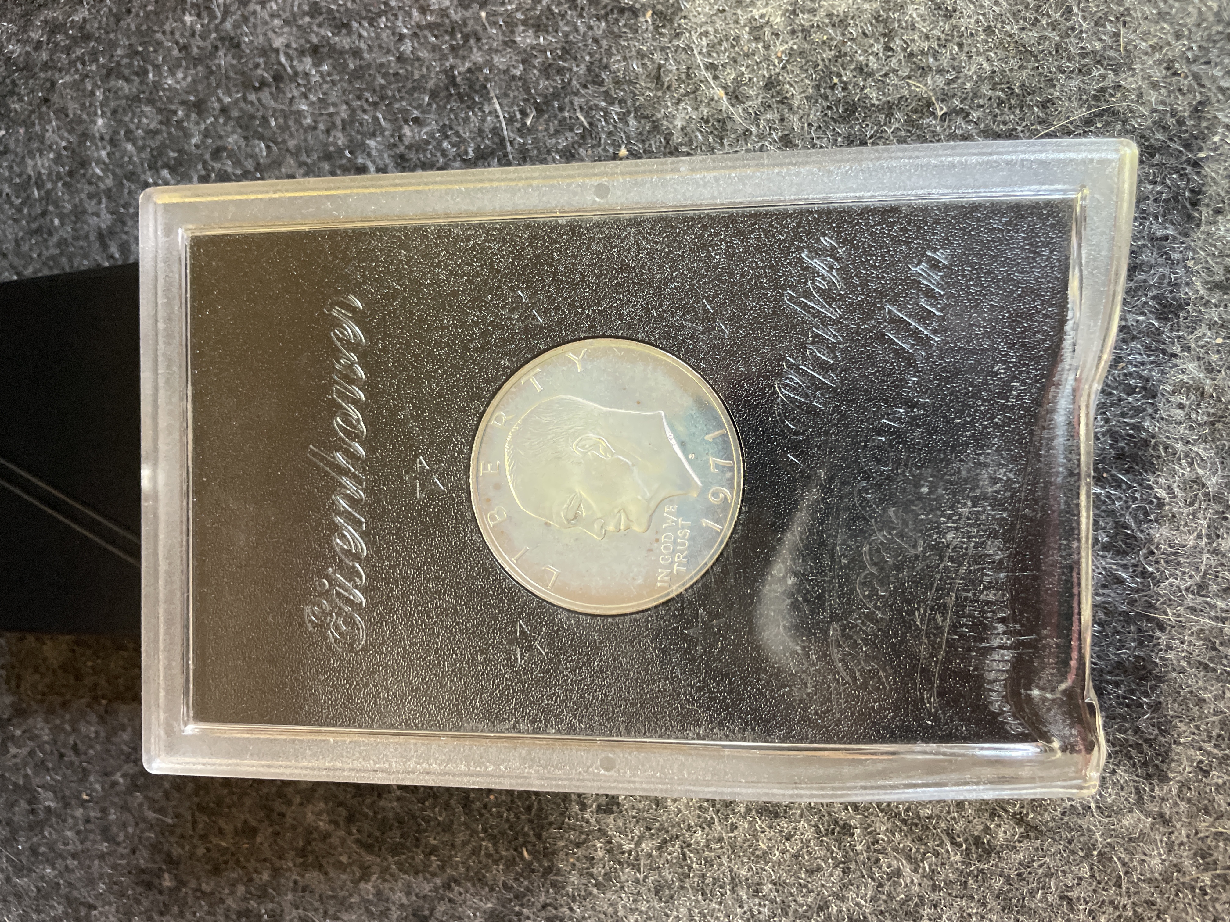 A 1971-S Eisenhower silver proof dollar coin featuring an S mint mark and housed in its original plastic United States Mint packaging.