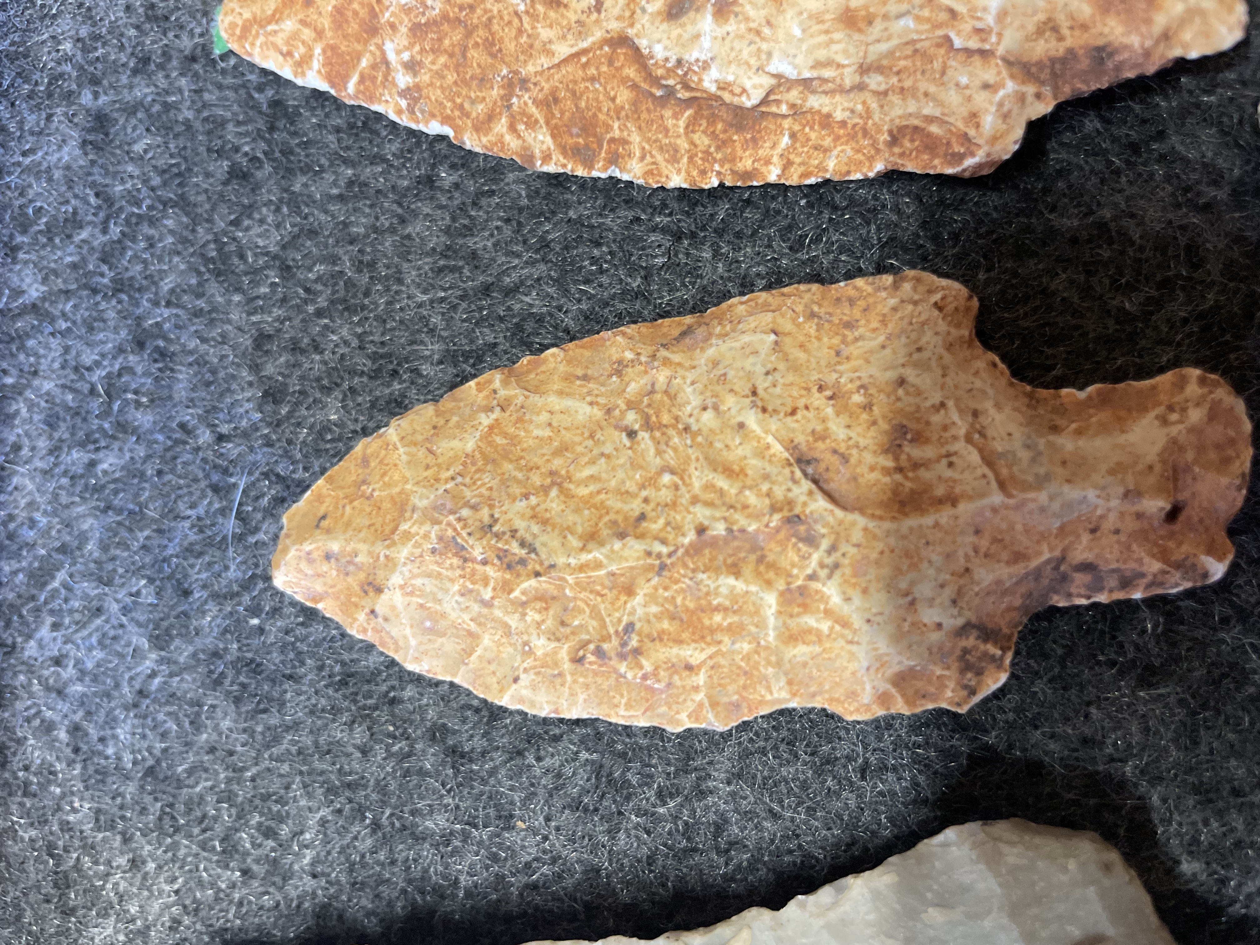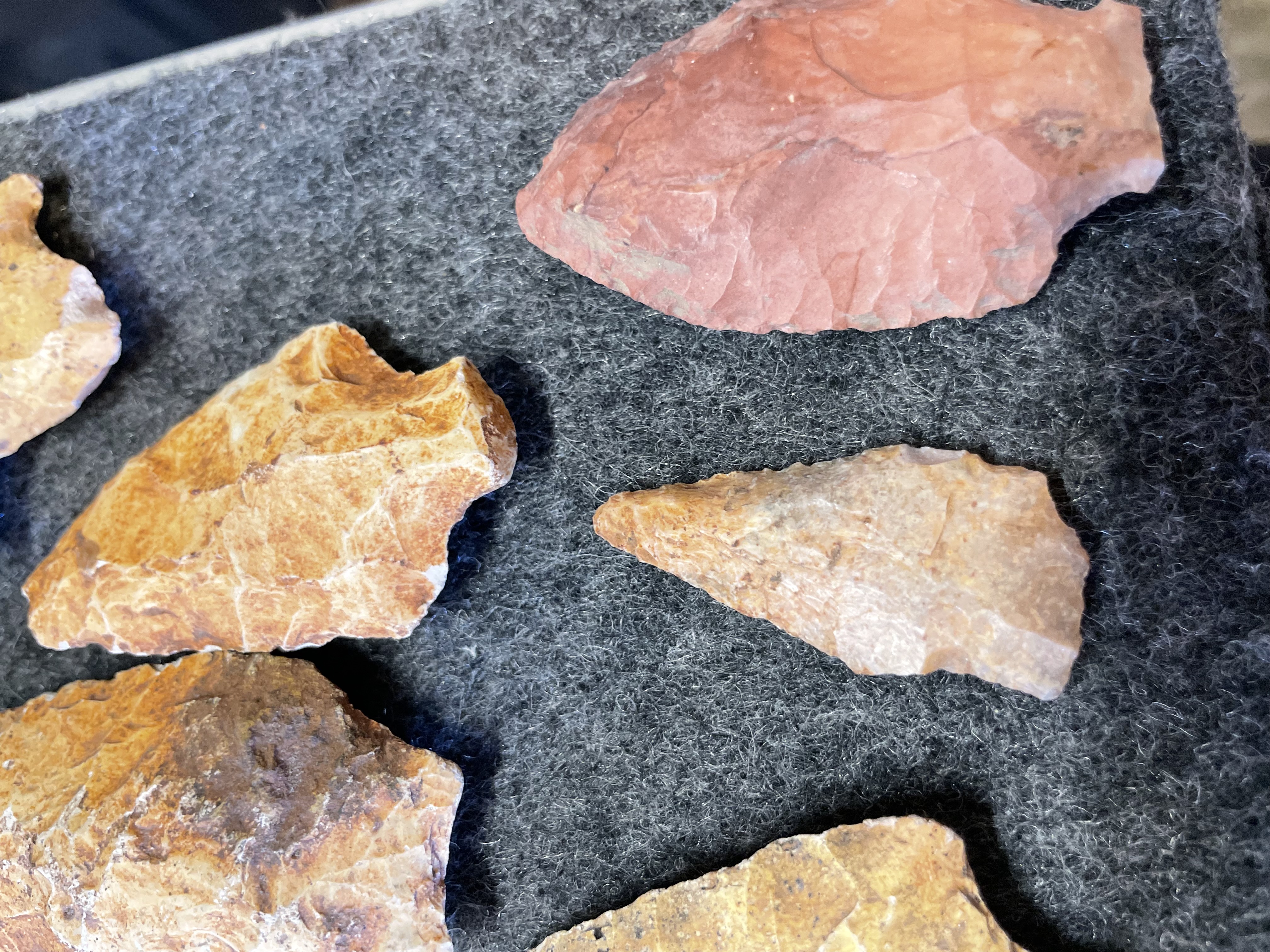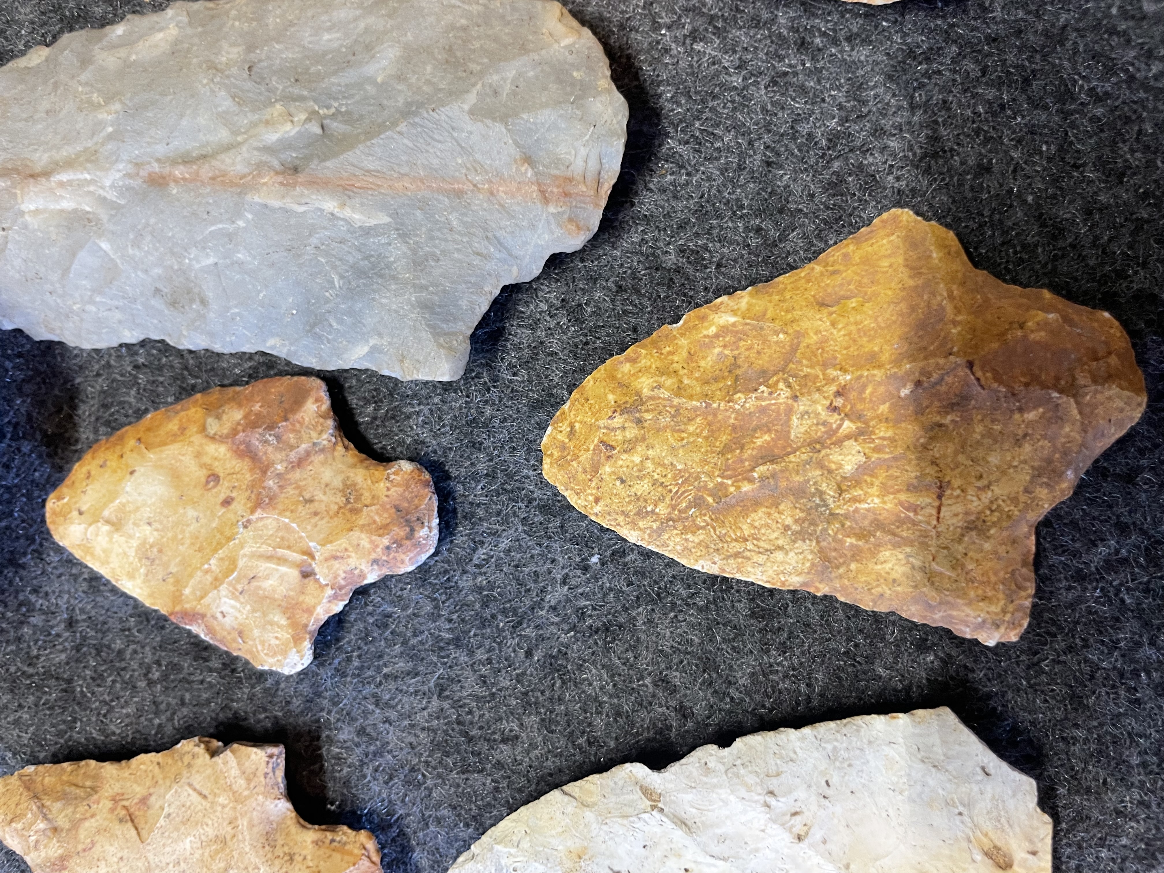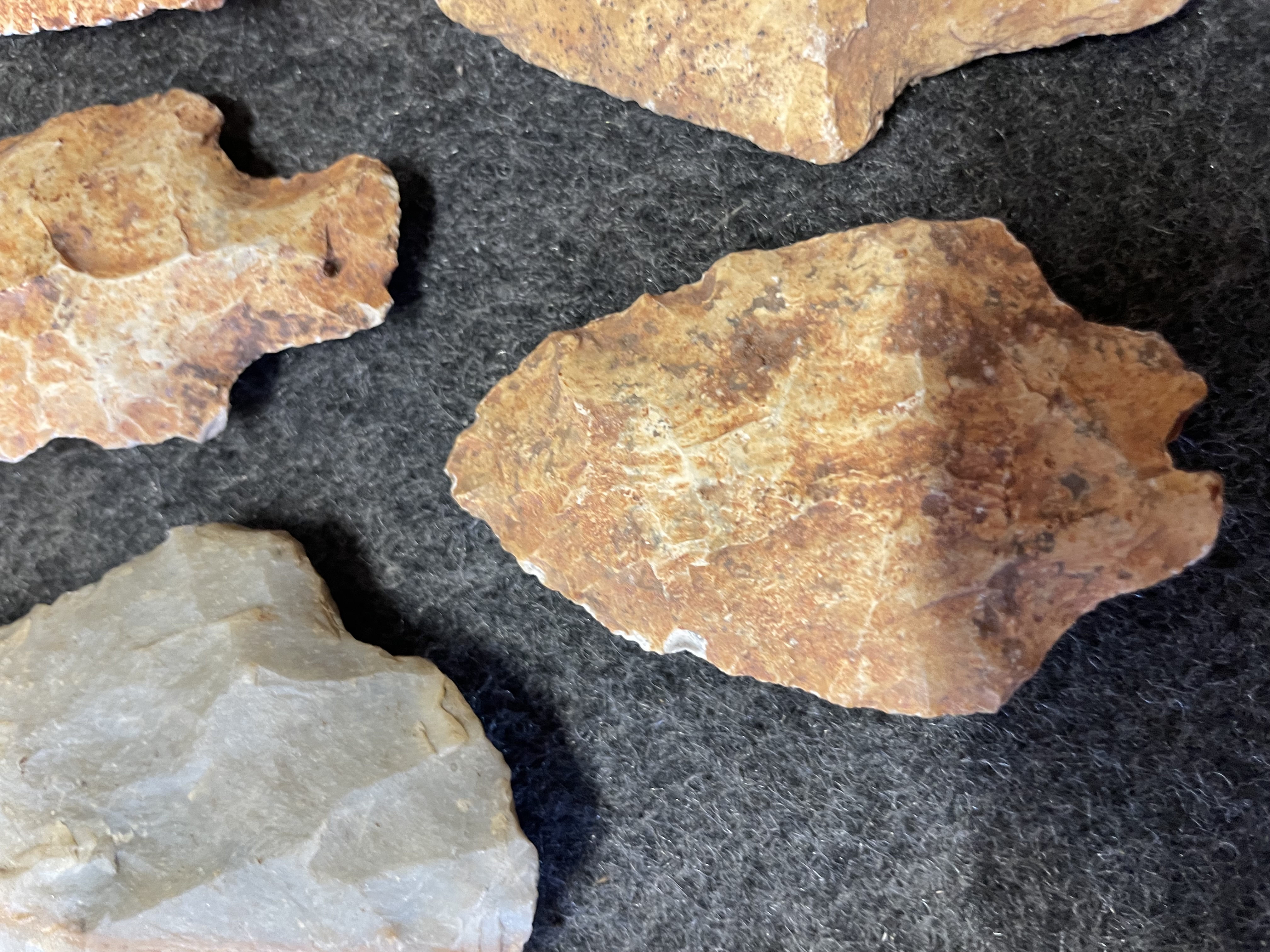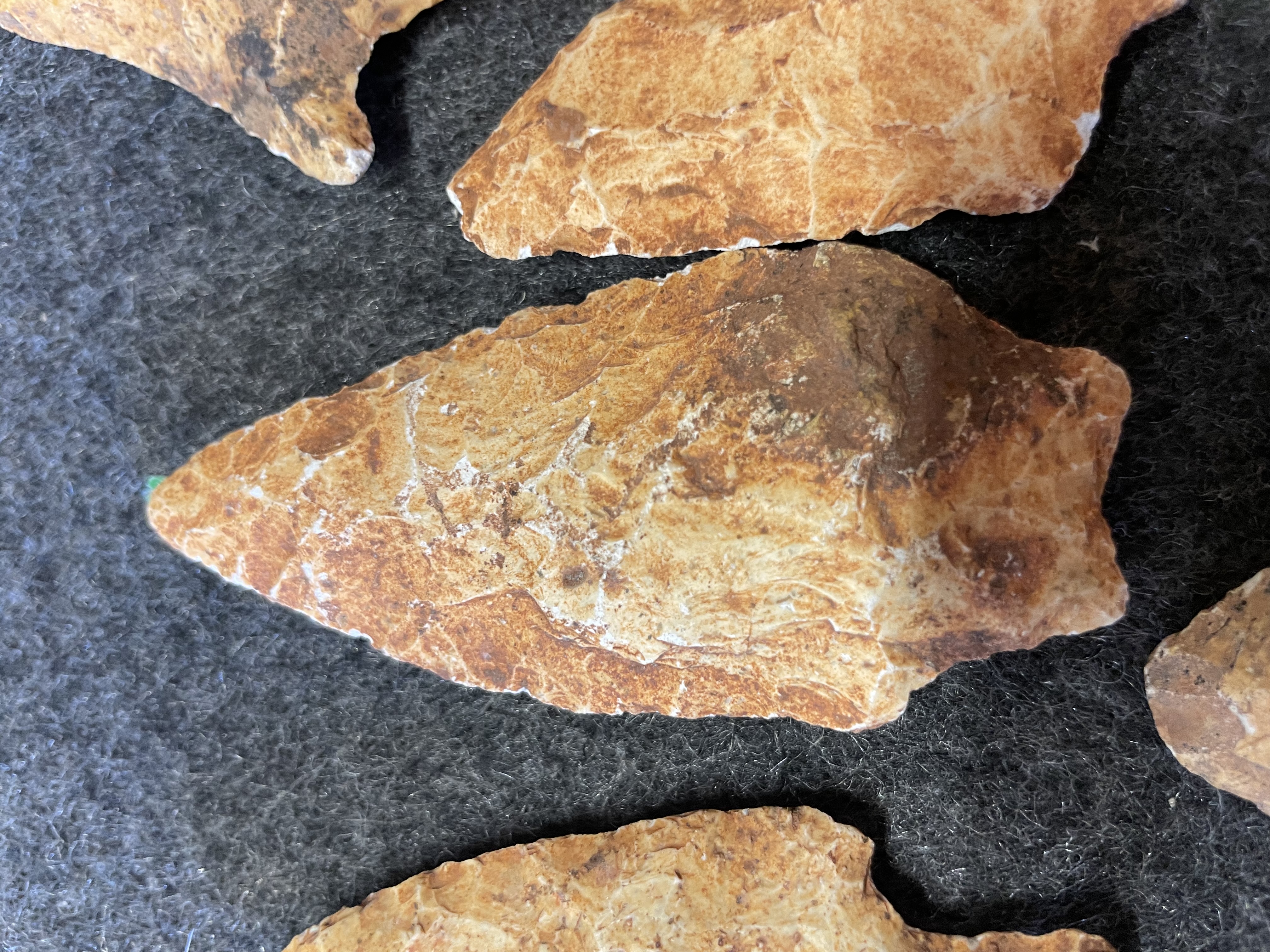 A collection of stone projectile points and a single rounded stone tool featuring a variety of colors including tan, orange, brown, grey, and off-white.