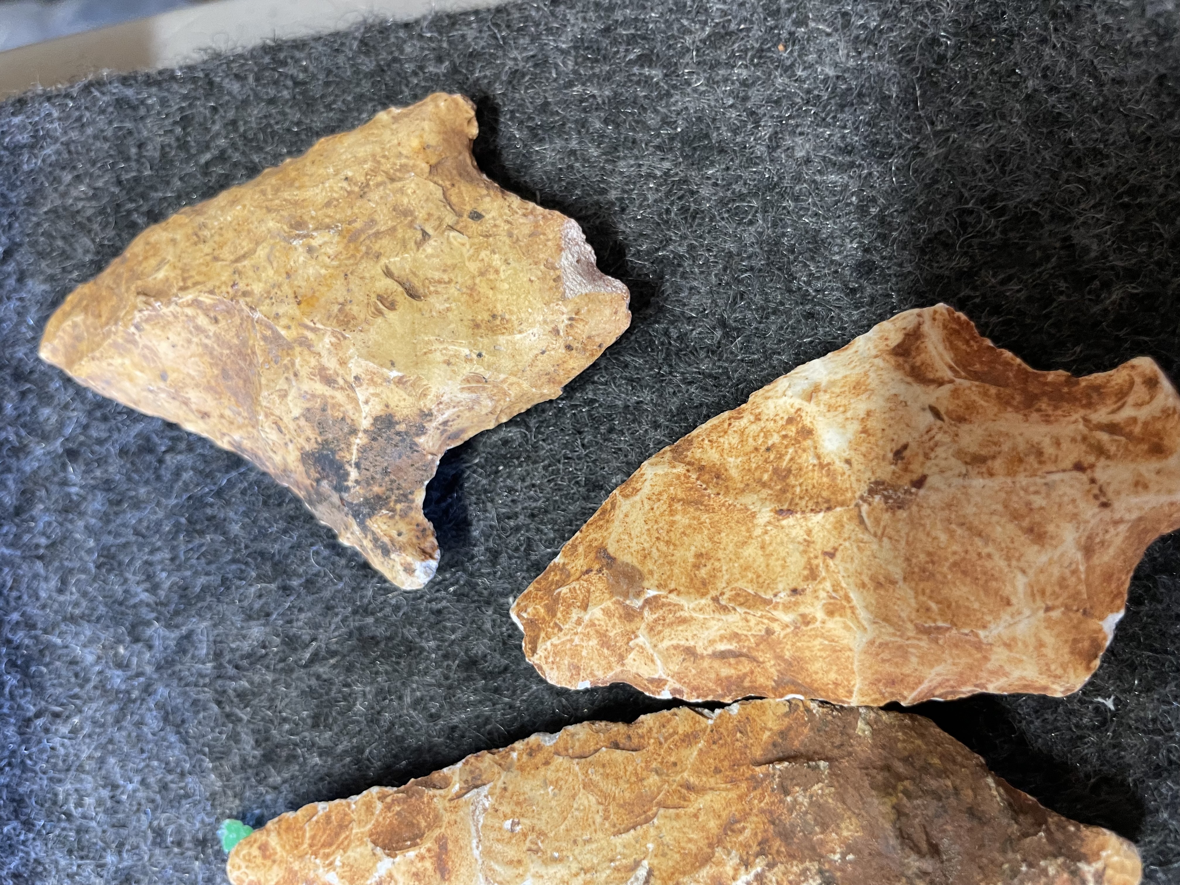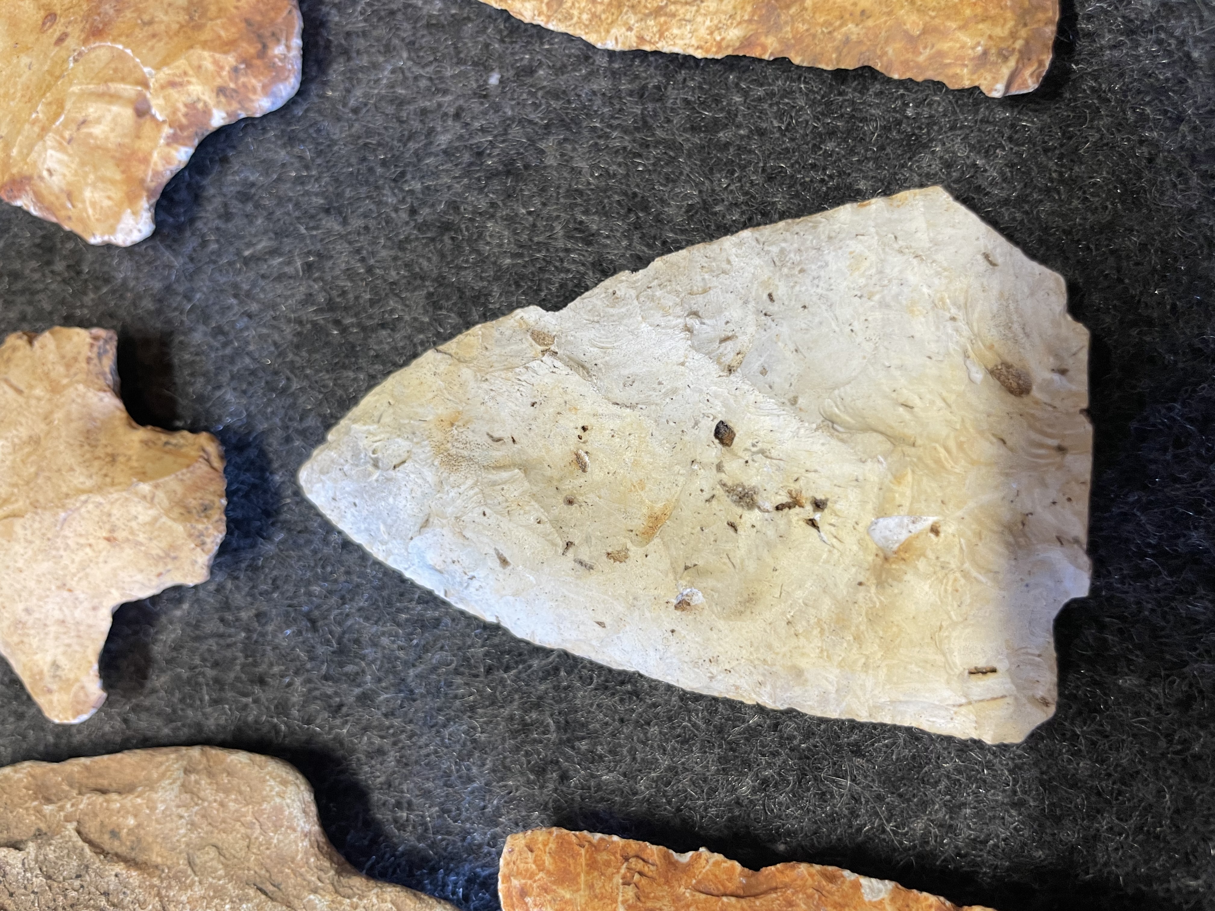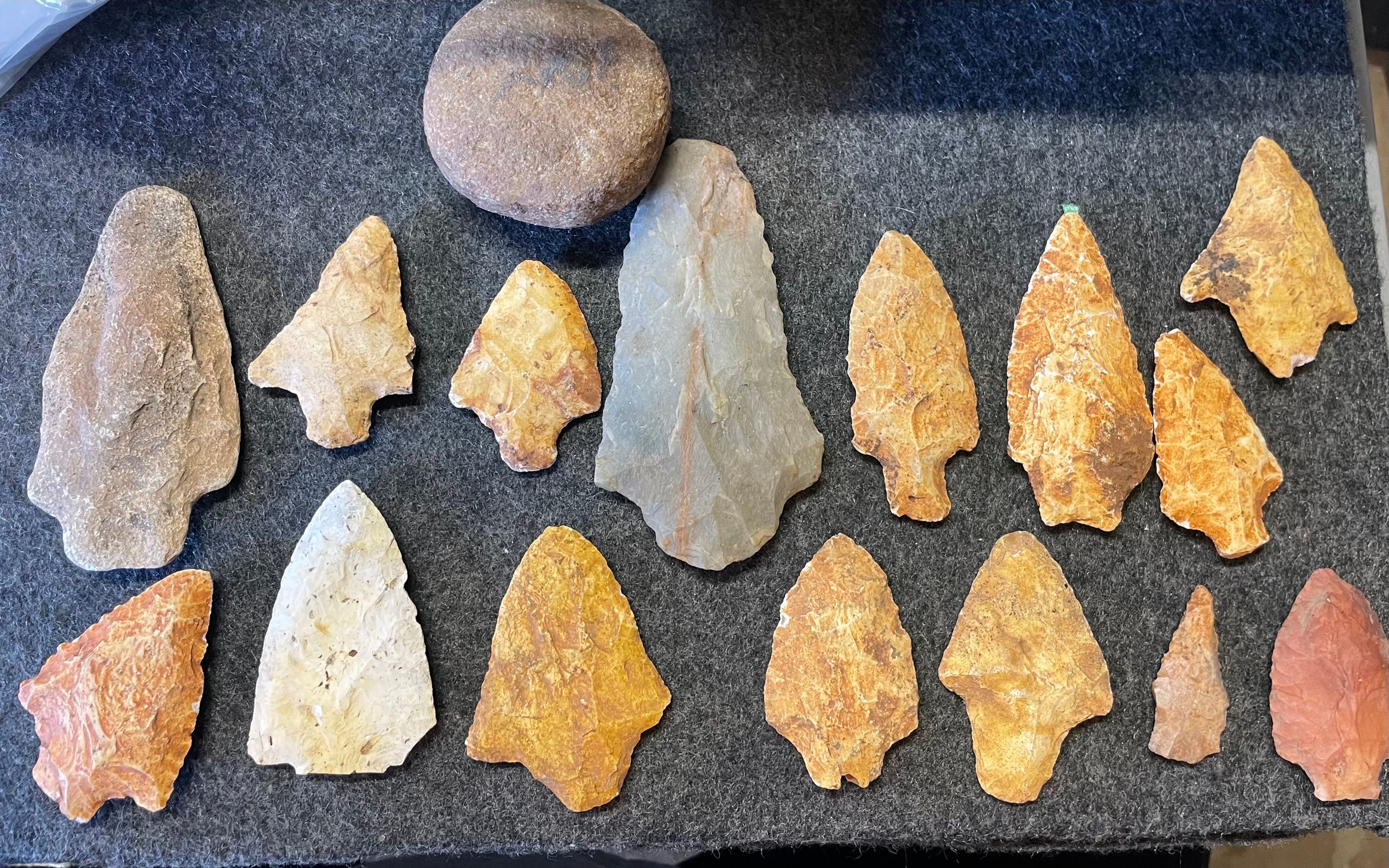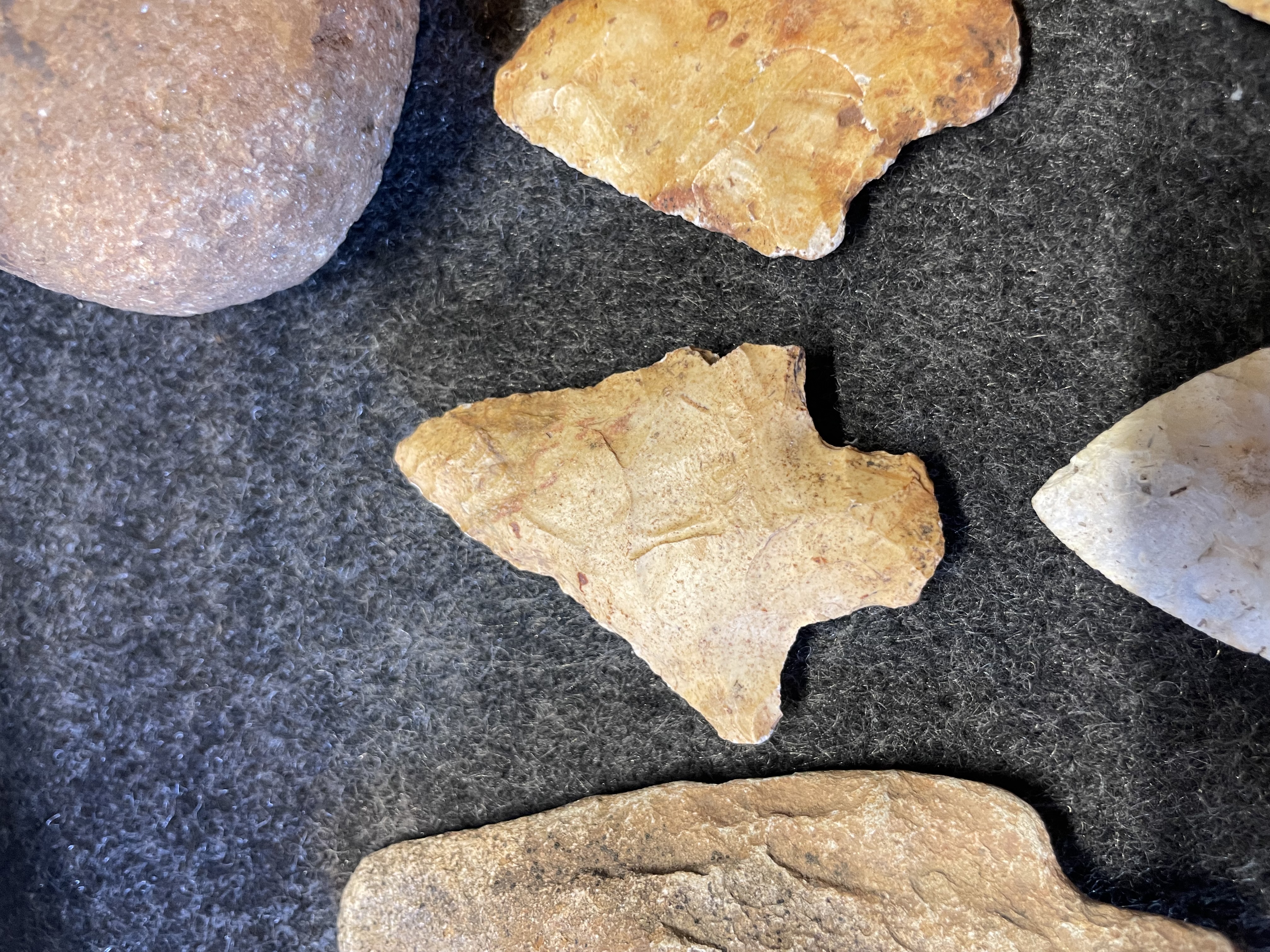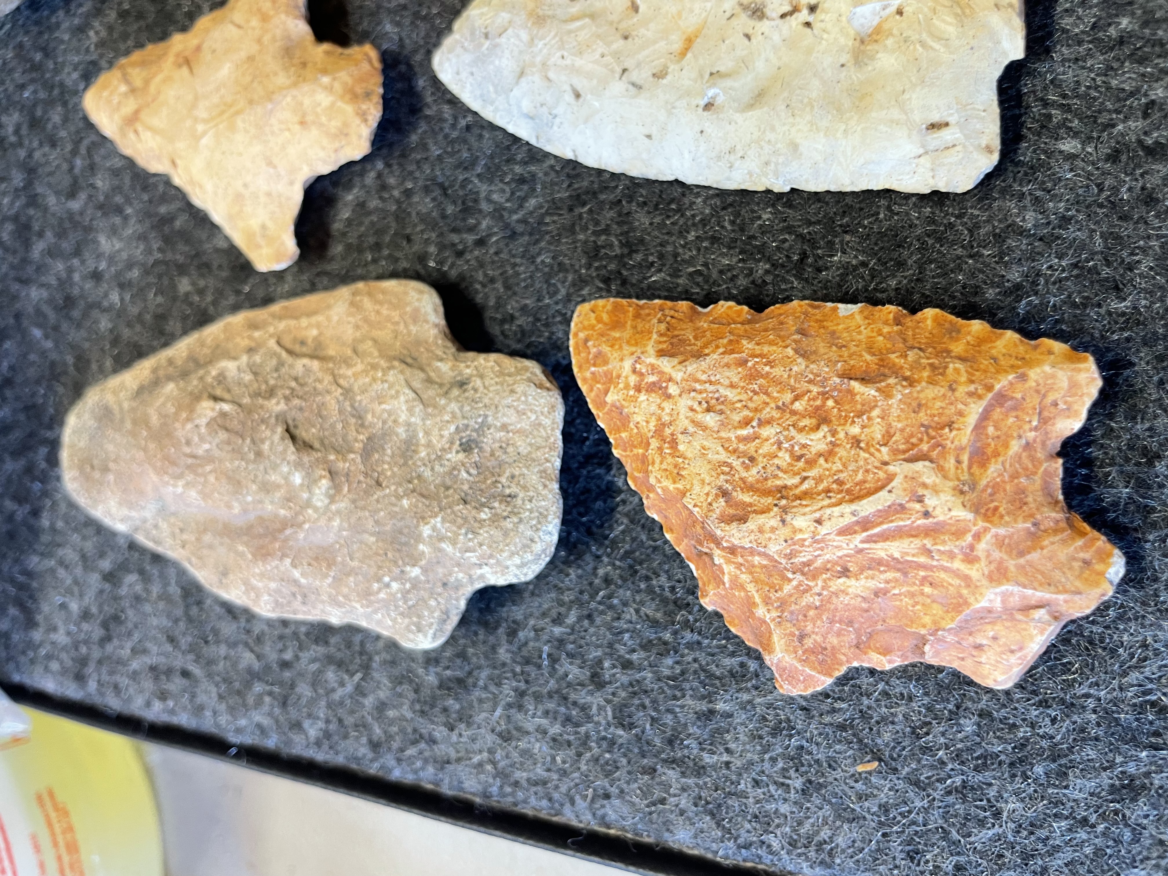 A collection of stone projectile points and a single rounded stone tool featuring a variety of colors including tan, orange, brown, grey, and off-white.