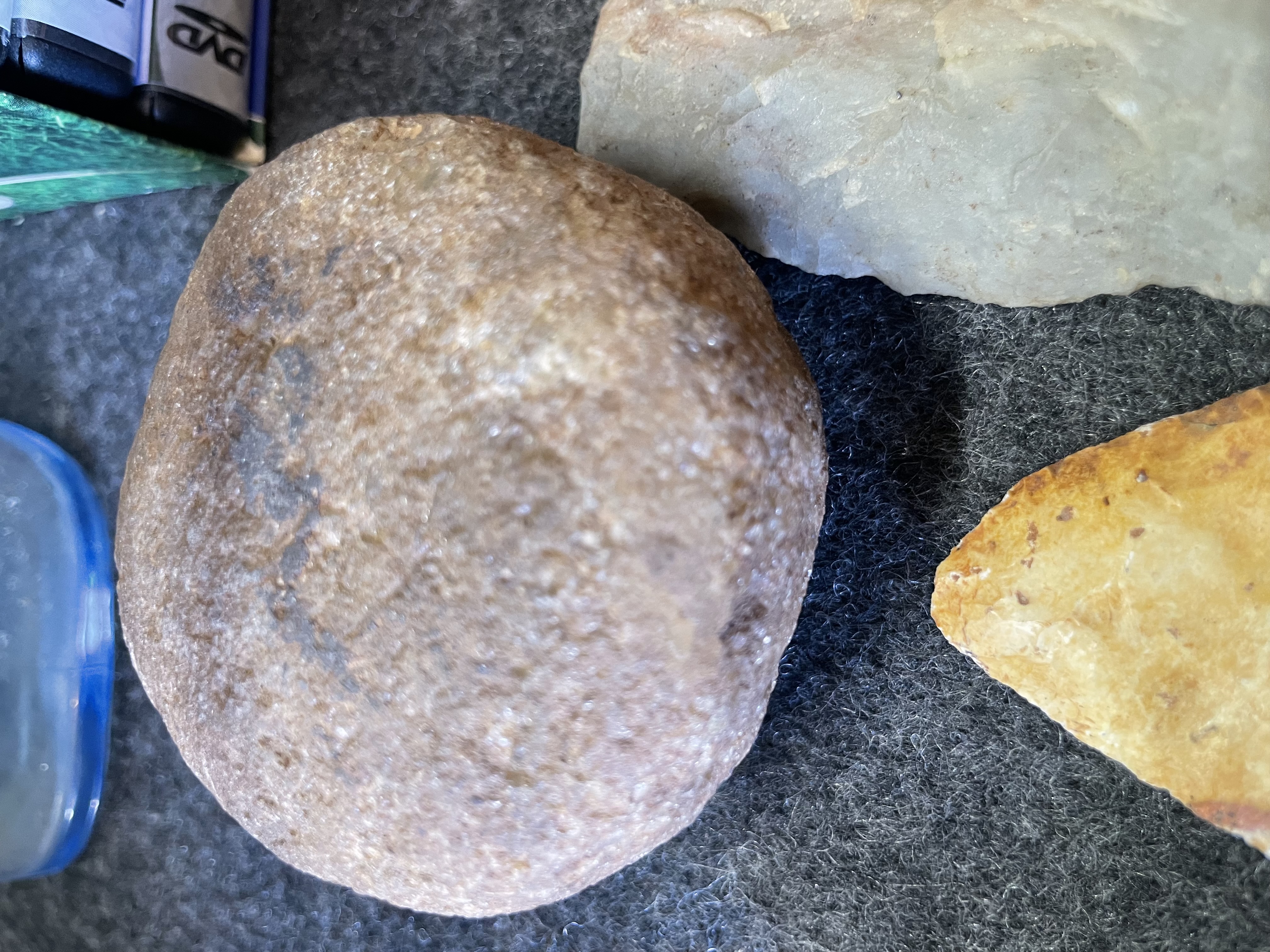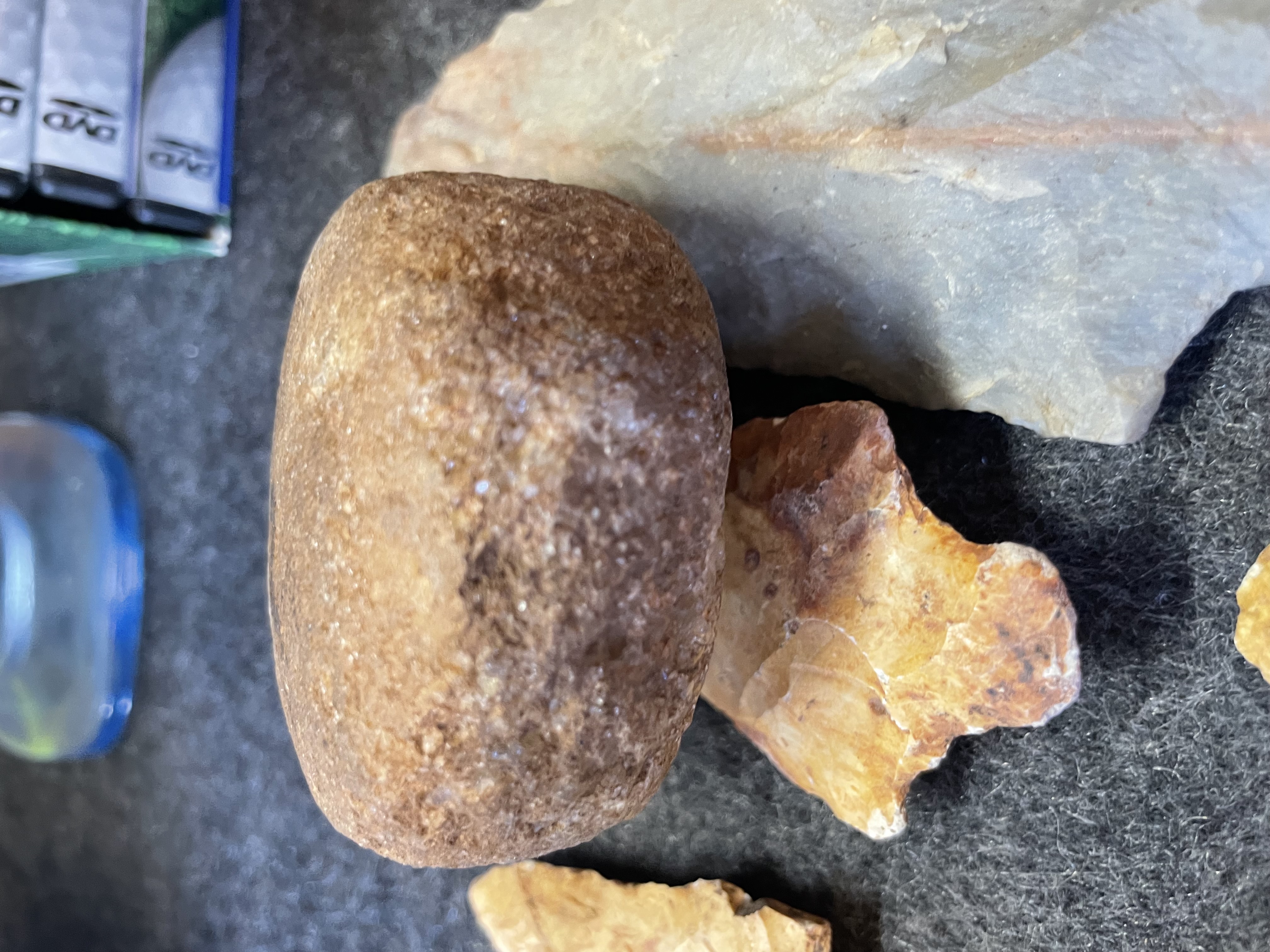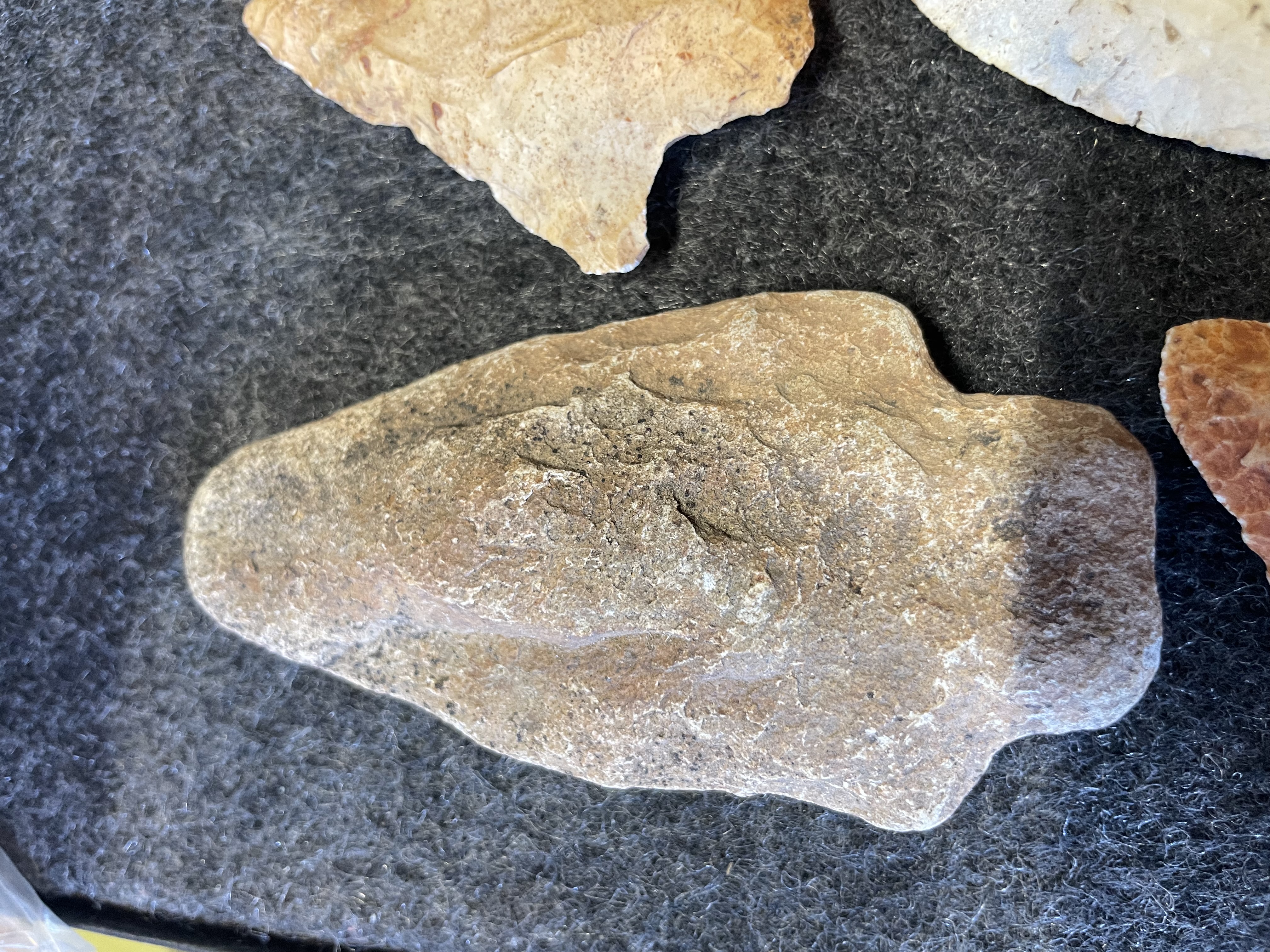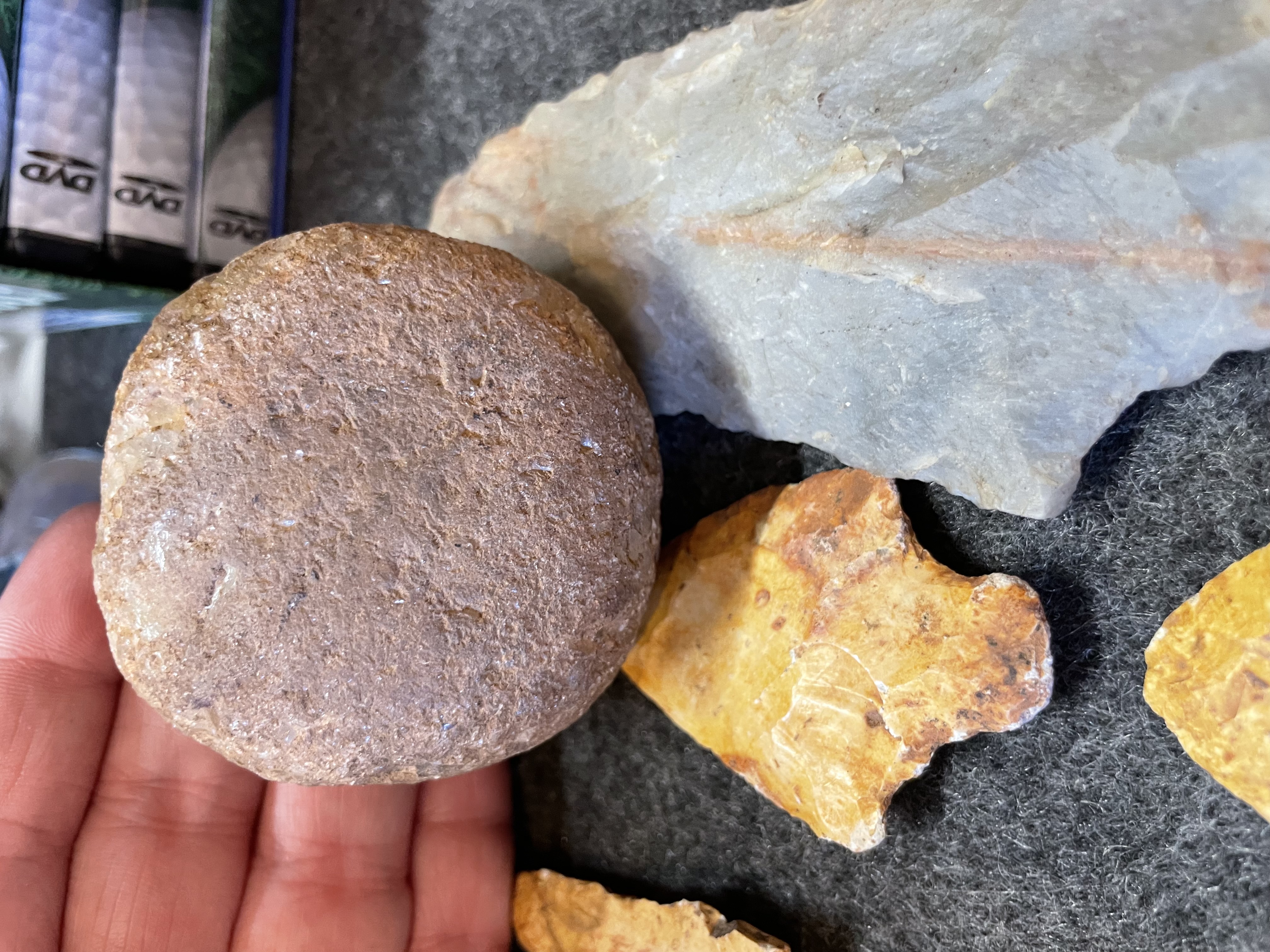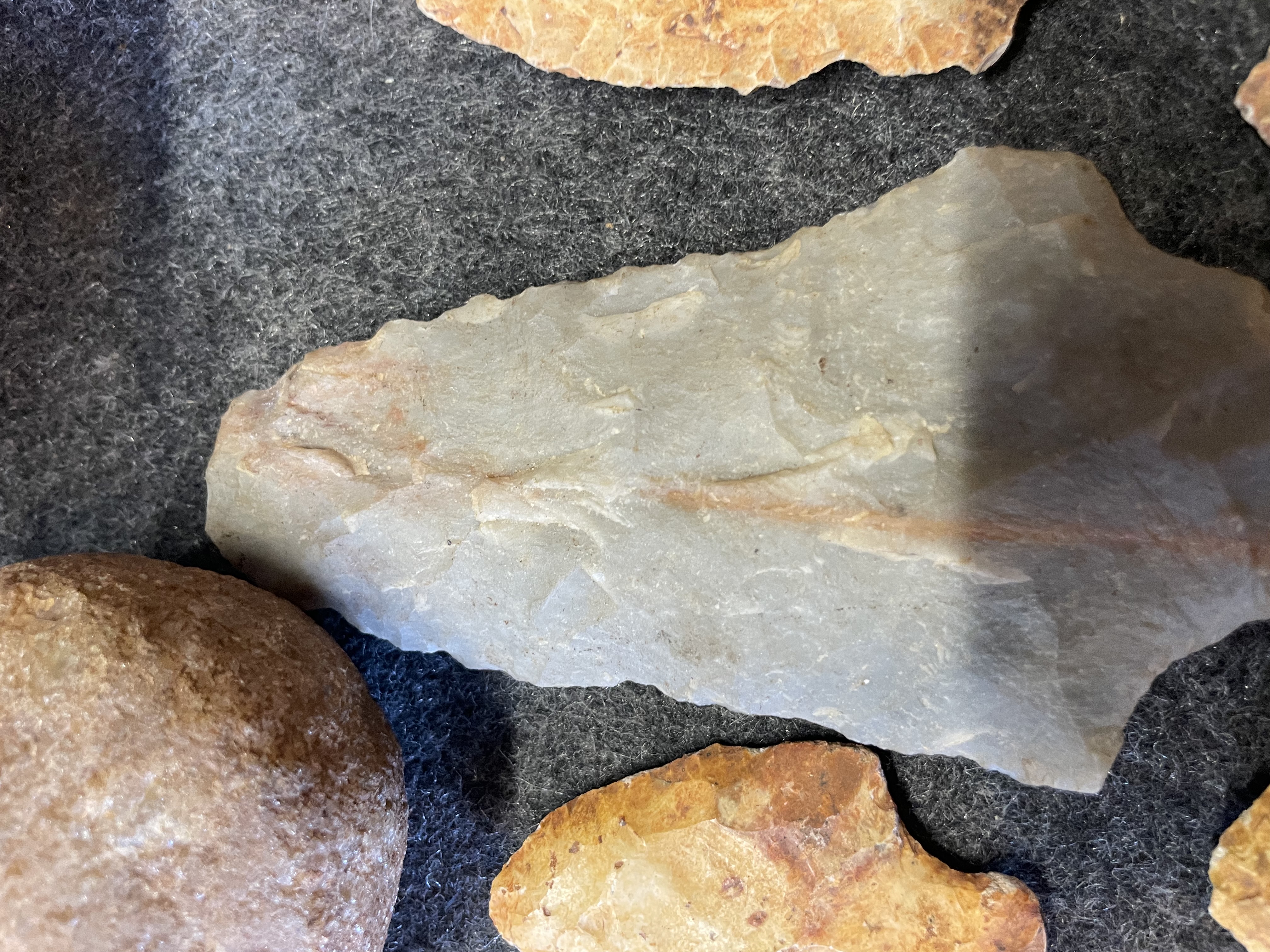 A collection of stone projectile points and a single rounded stone tool featuring a variety of colors including tan, orange, brown, grey, and off-white.