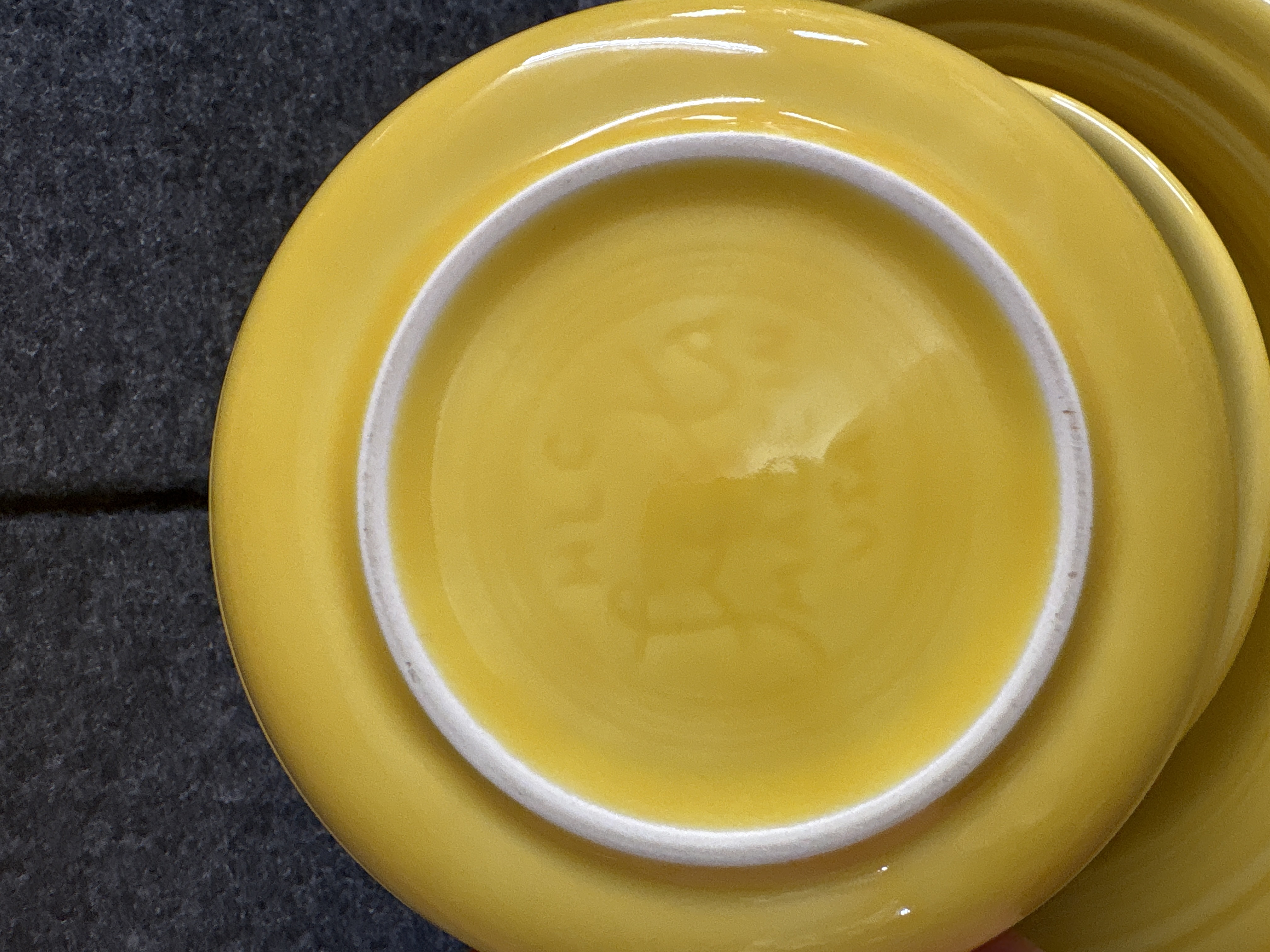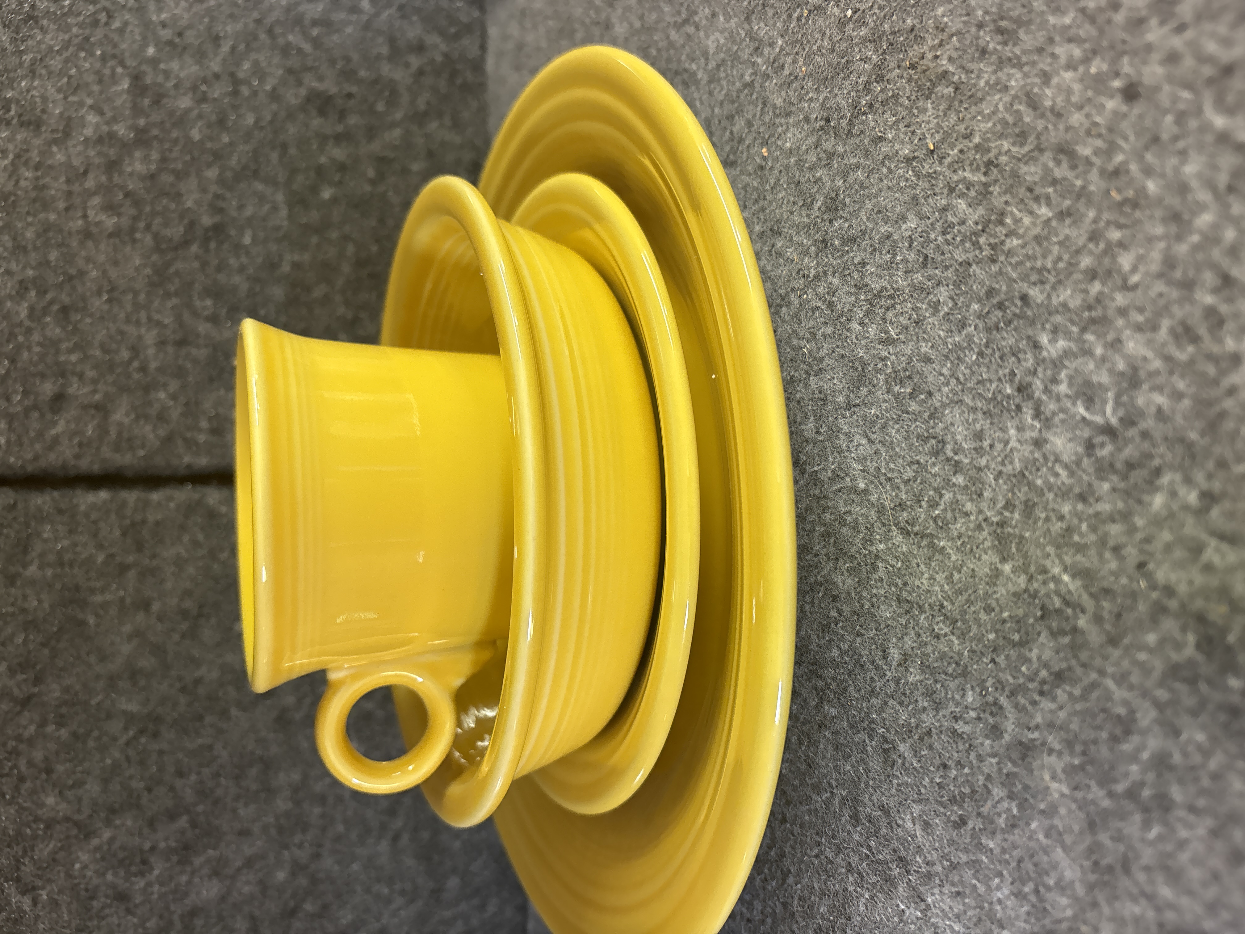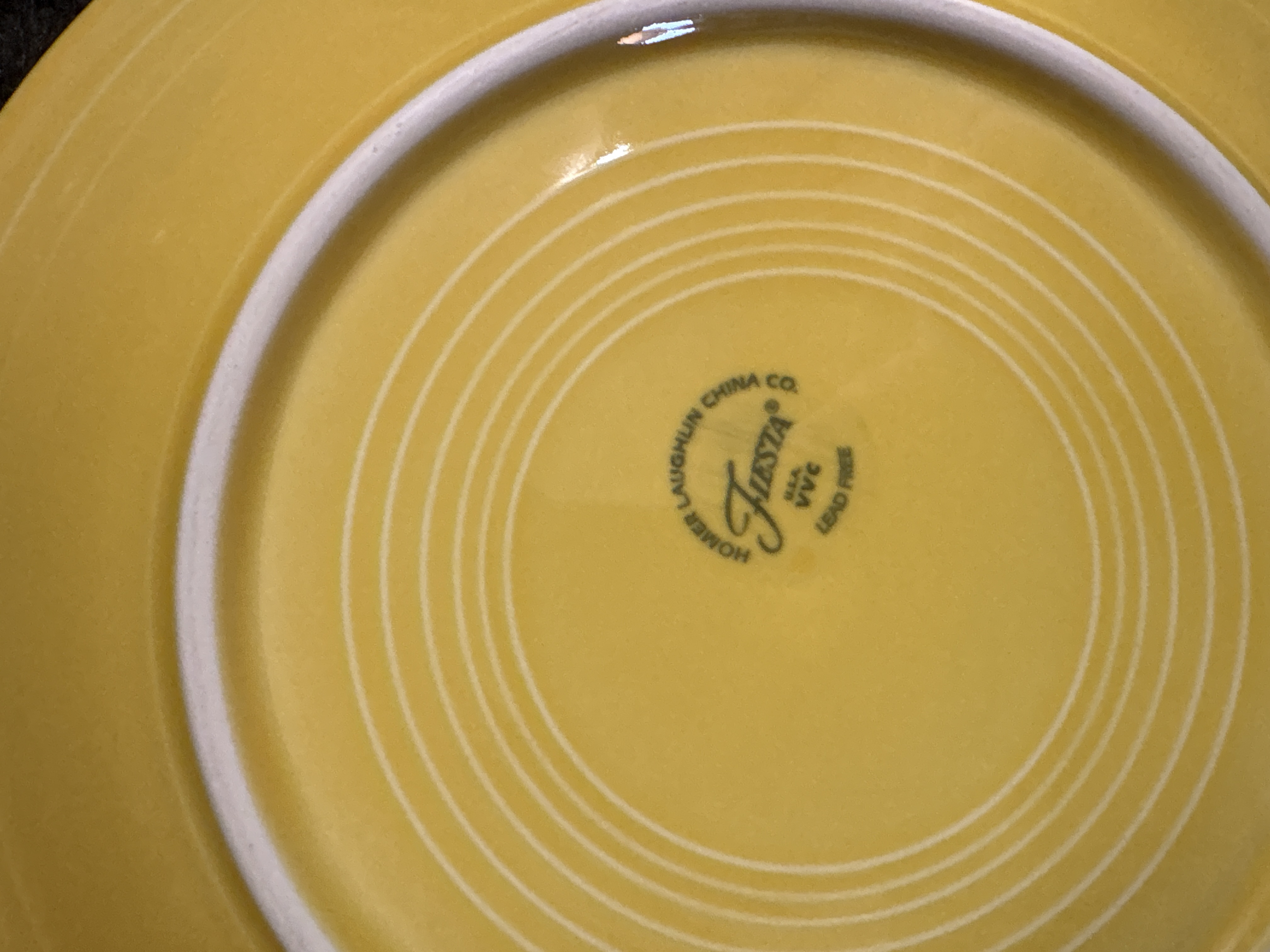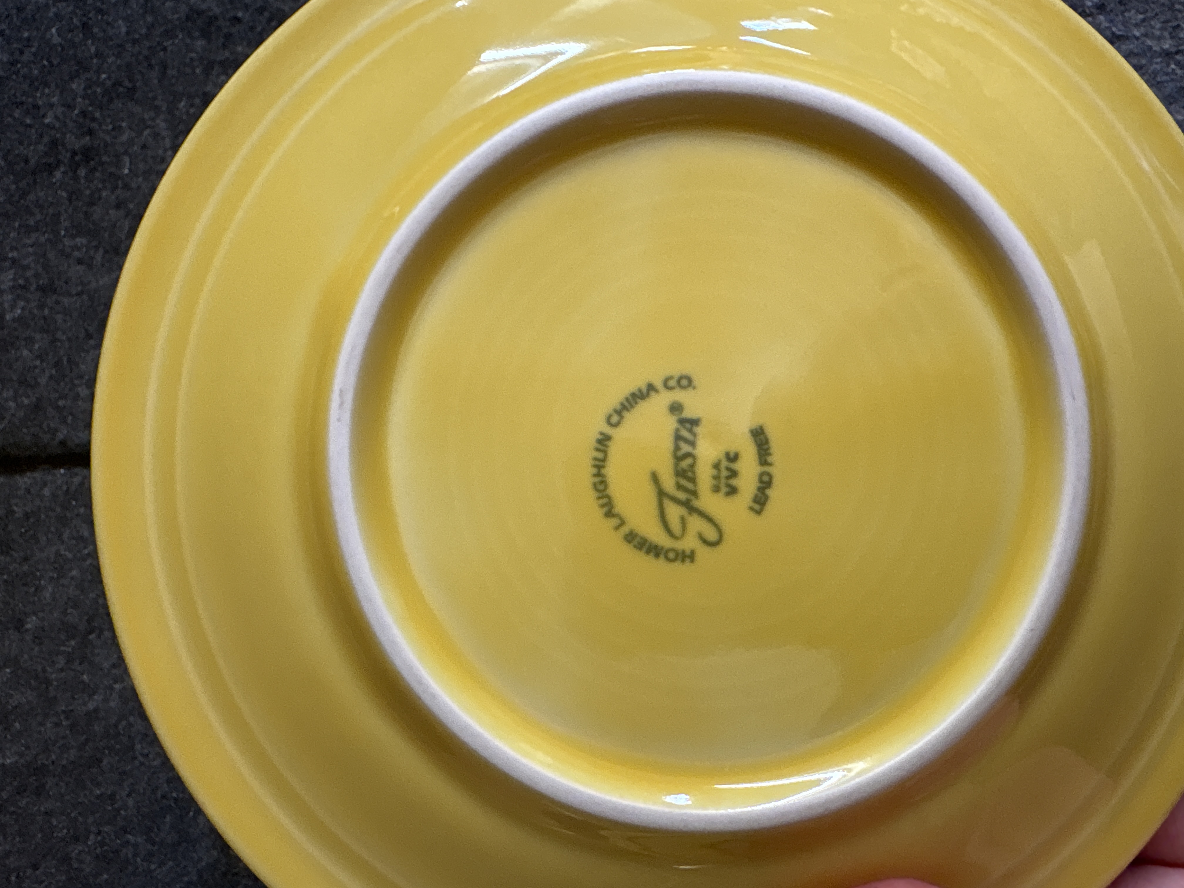 A collection of Homer Laughlin China Company tableware in the Fiesta pattern, featuring a bright yellow glossy glaze. The group consists of a mug with a circular handle, a bowl, and plates of varying sizes, all decorated with signature concentric rings. The undersides of the pieces are marked with impressed HLC Fiesta USA stamps and green transfer-printed logos reading HOMER LAUGHLIN CHINA CO. Fiesta U.S.A. VVC LEAD FREE.