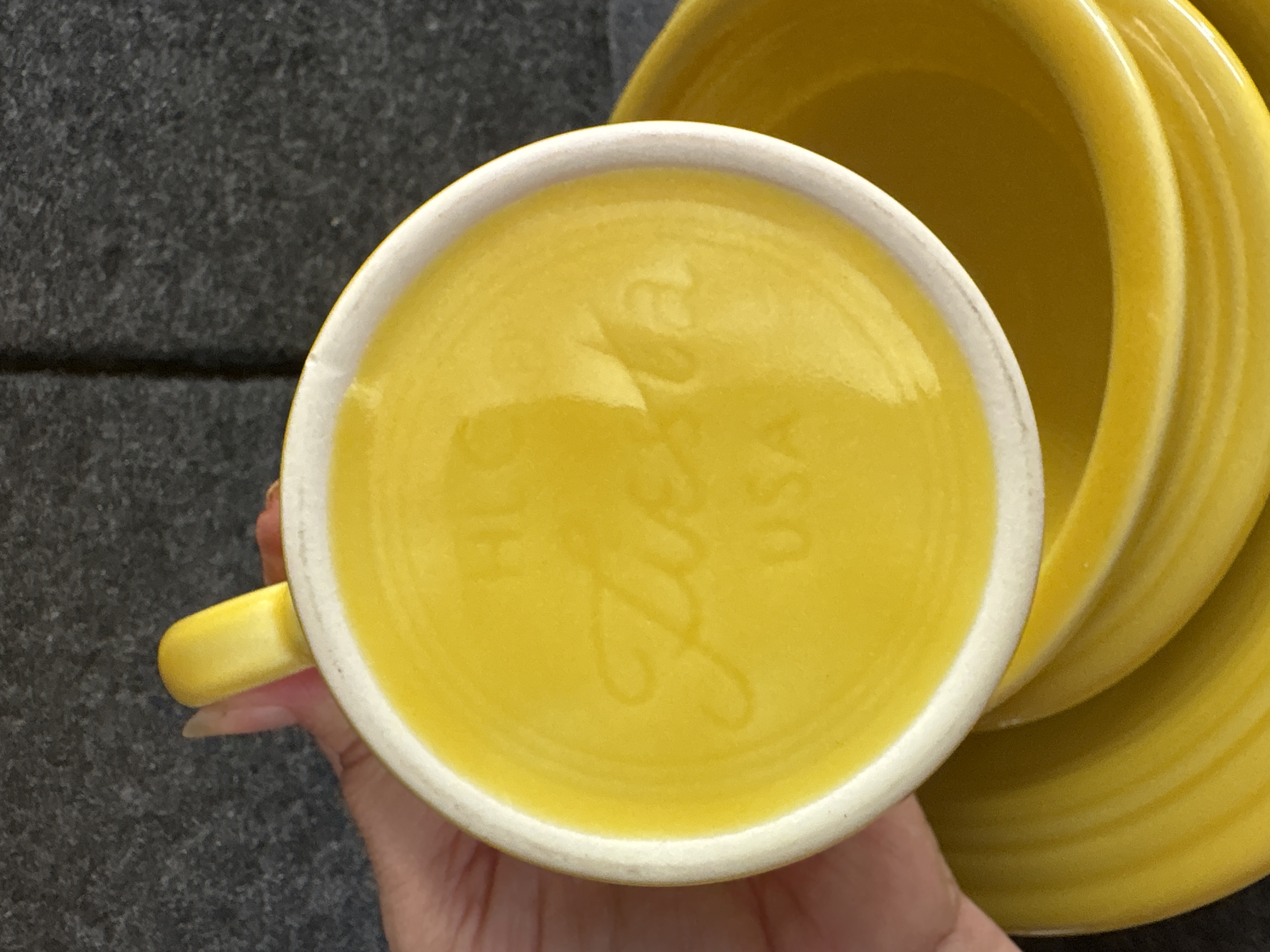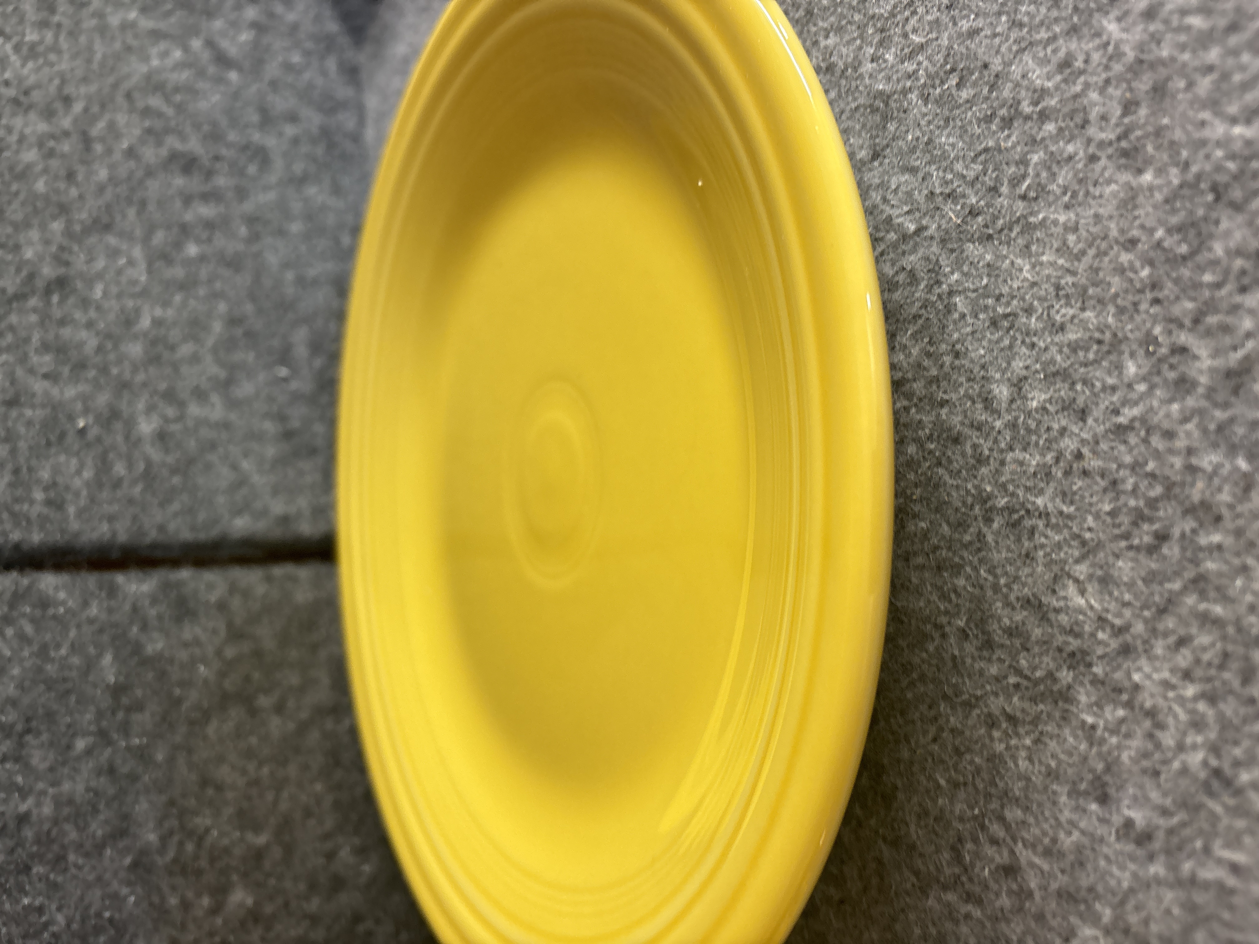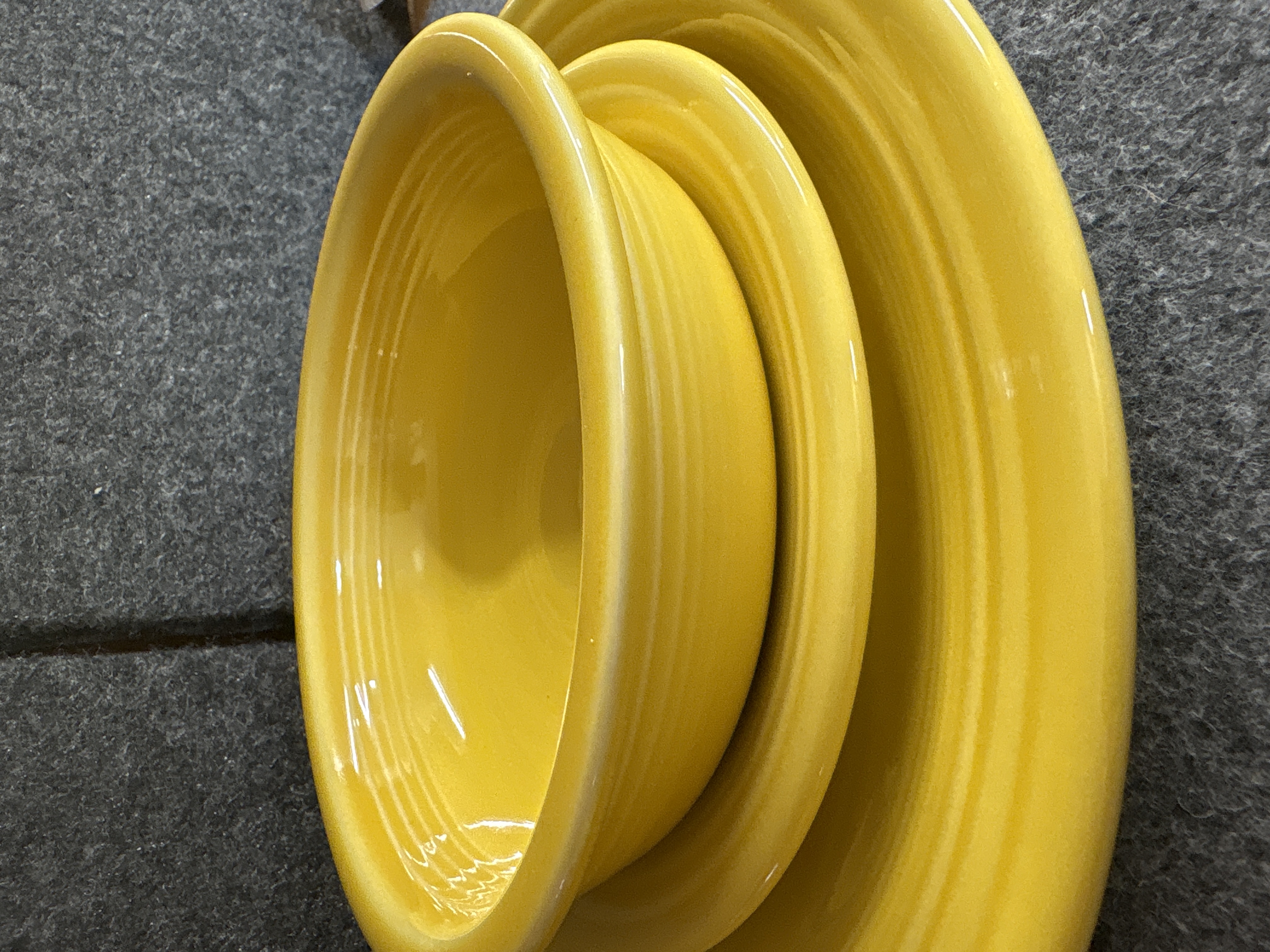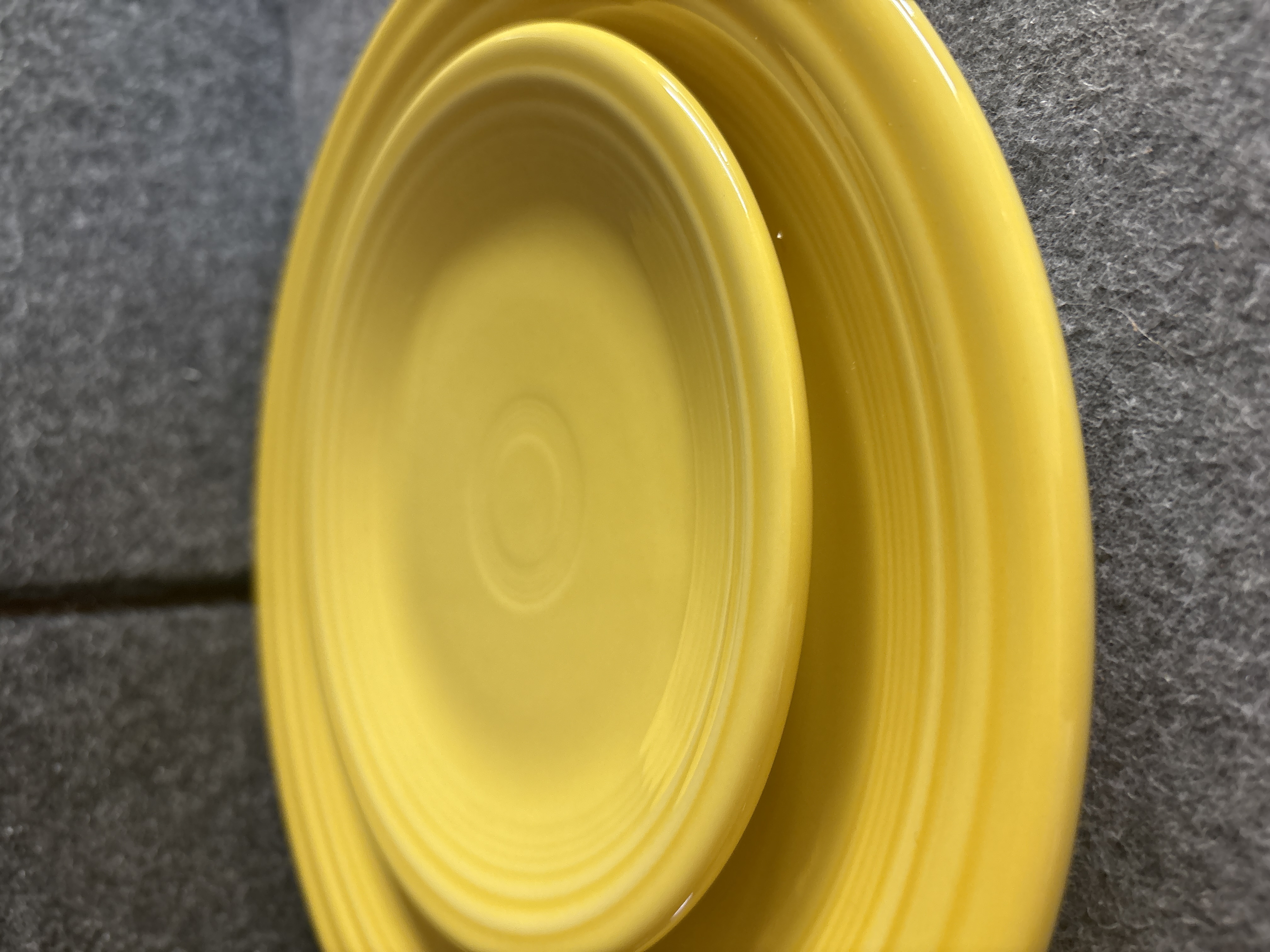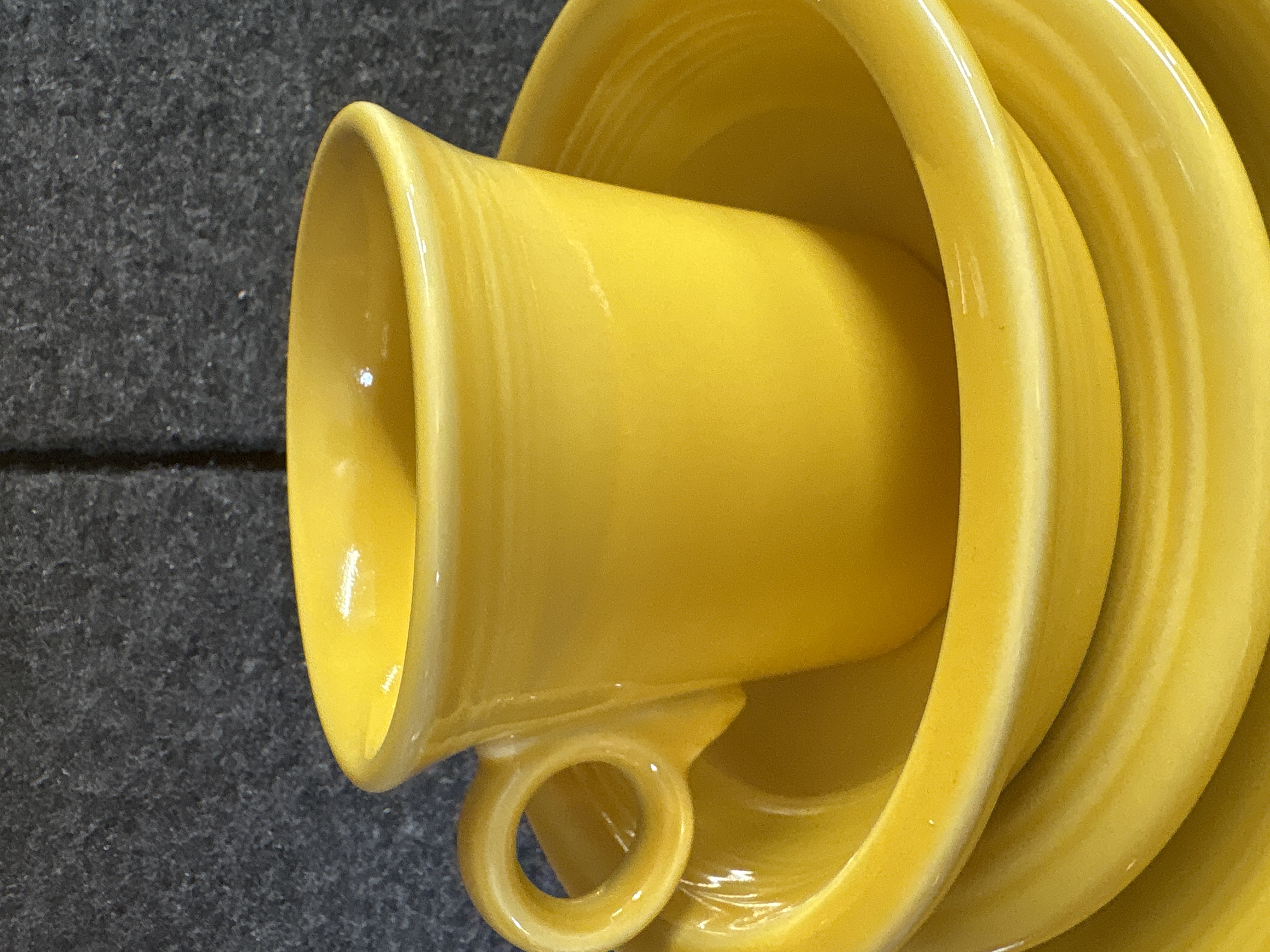 A collection of Homer Laughlin China Company tableware in the Fiesta pattern, featuring a bright yellow glossy glaze. The group consists of a mug with a circular handle, a bowl, and plates of varying sizes, all decorated with signature concentric rings. The undersides of the pieces are marked with impressed HLC Fiesta USA stamps and green transfer-printed logos reading HOMER LAUGHLIN CHINA CO. Fiesta U.S.A. VVC LEAD FREE.