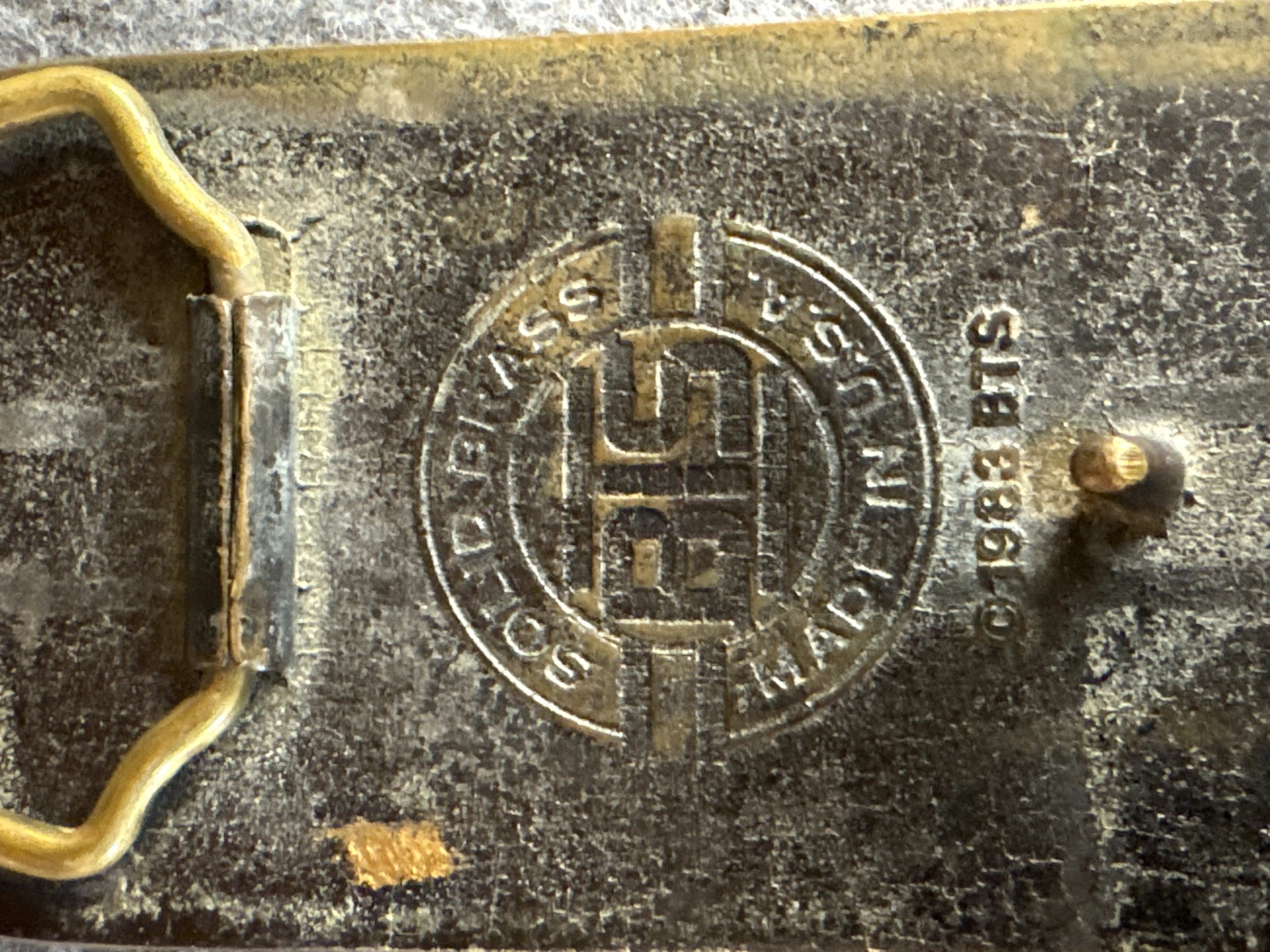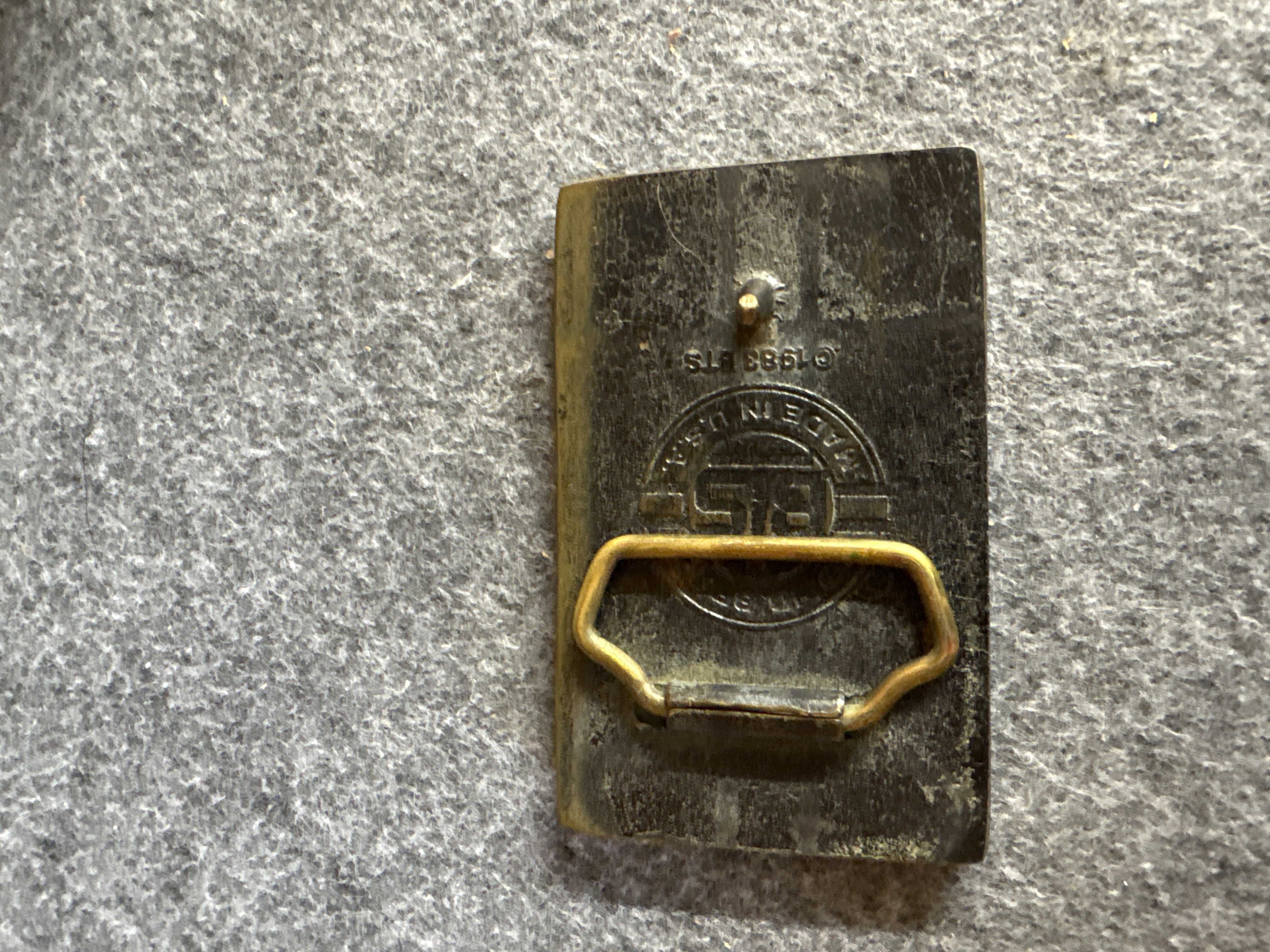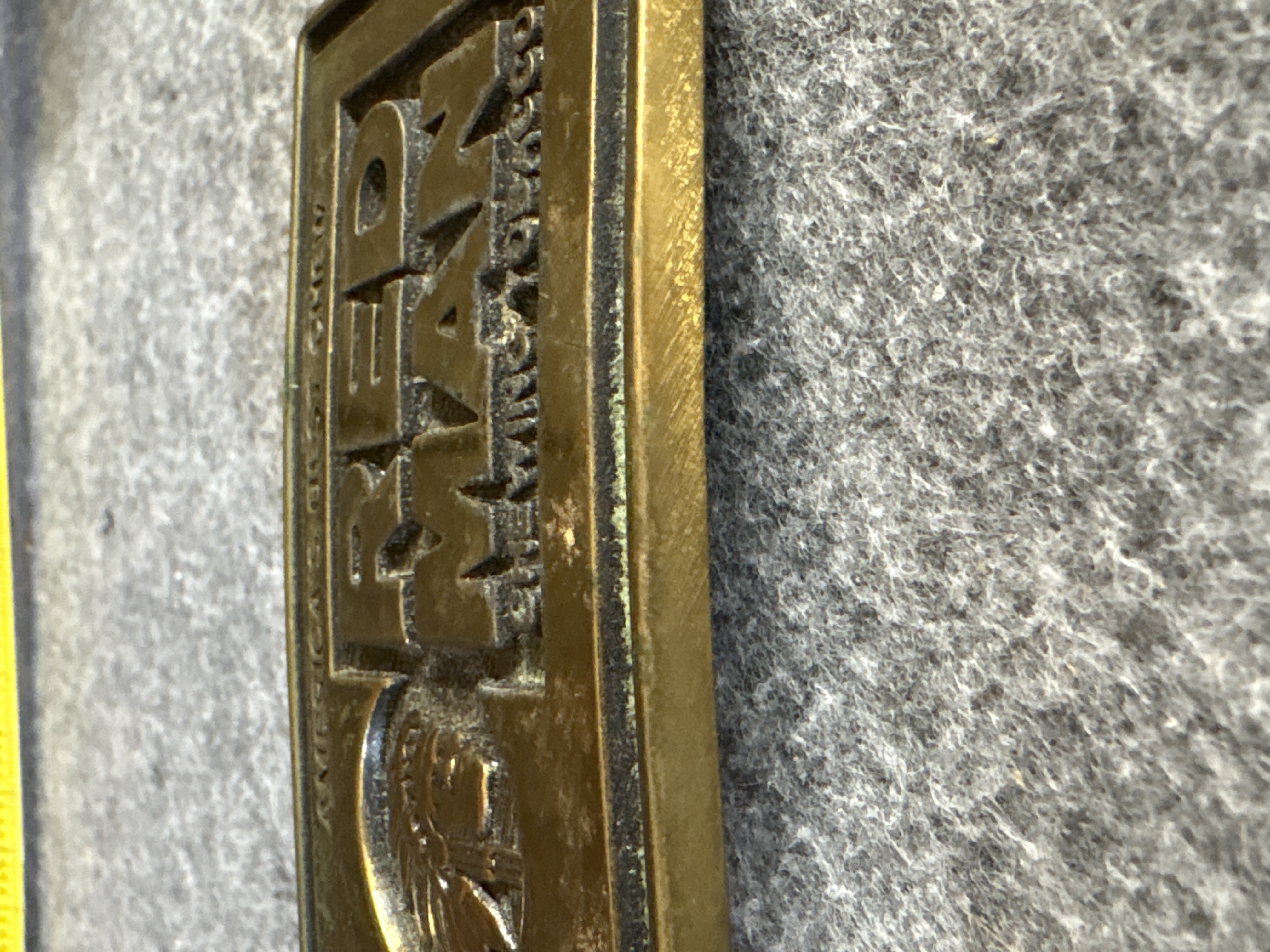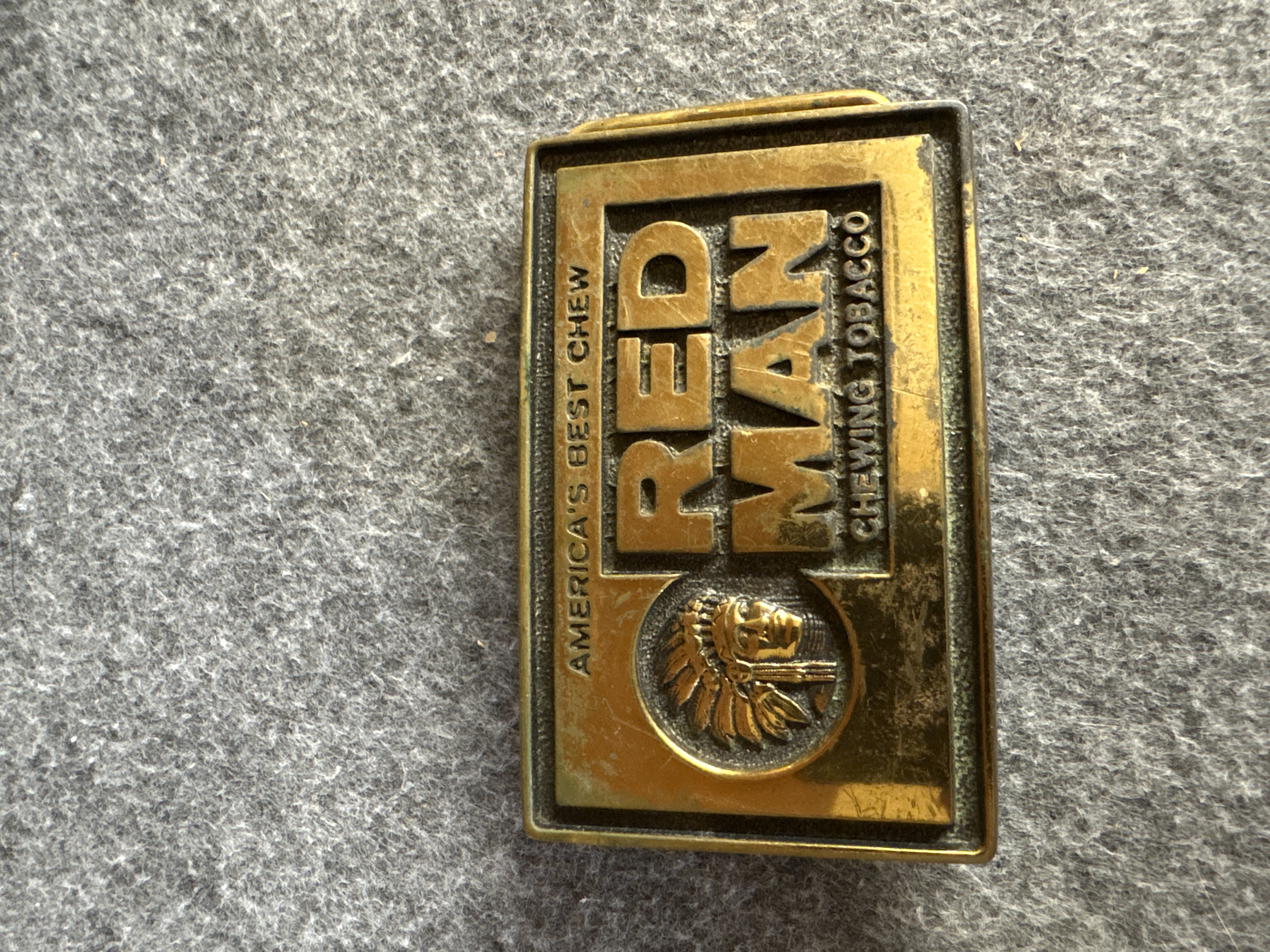 A Vintage Red Man Chewing Tobacco Solid Brass Belt Buckle by Basic Tool and Supply