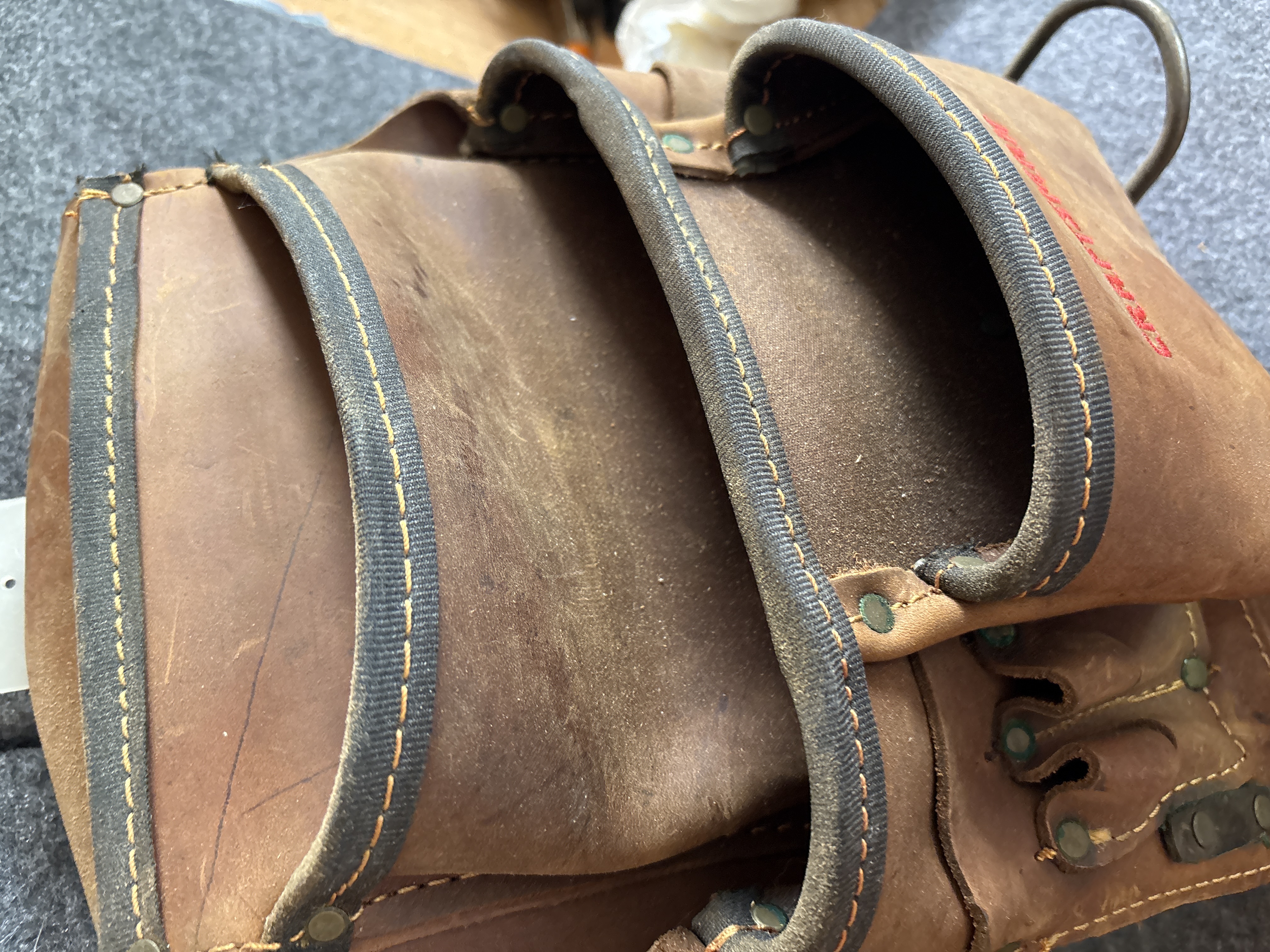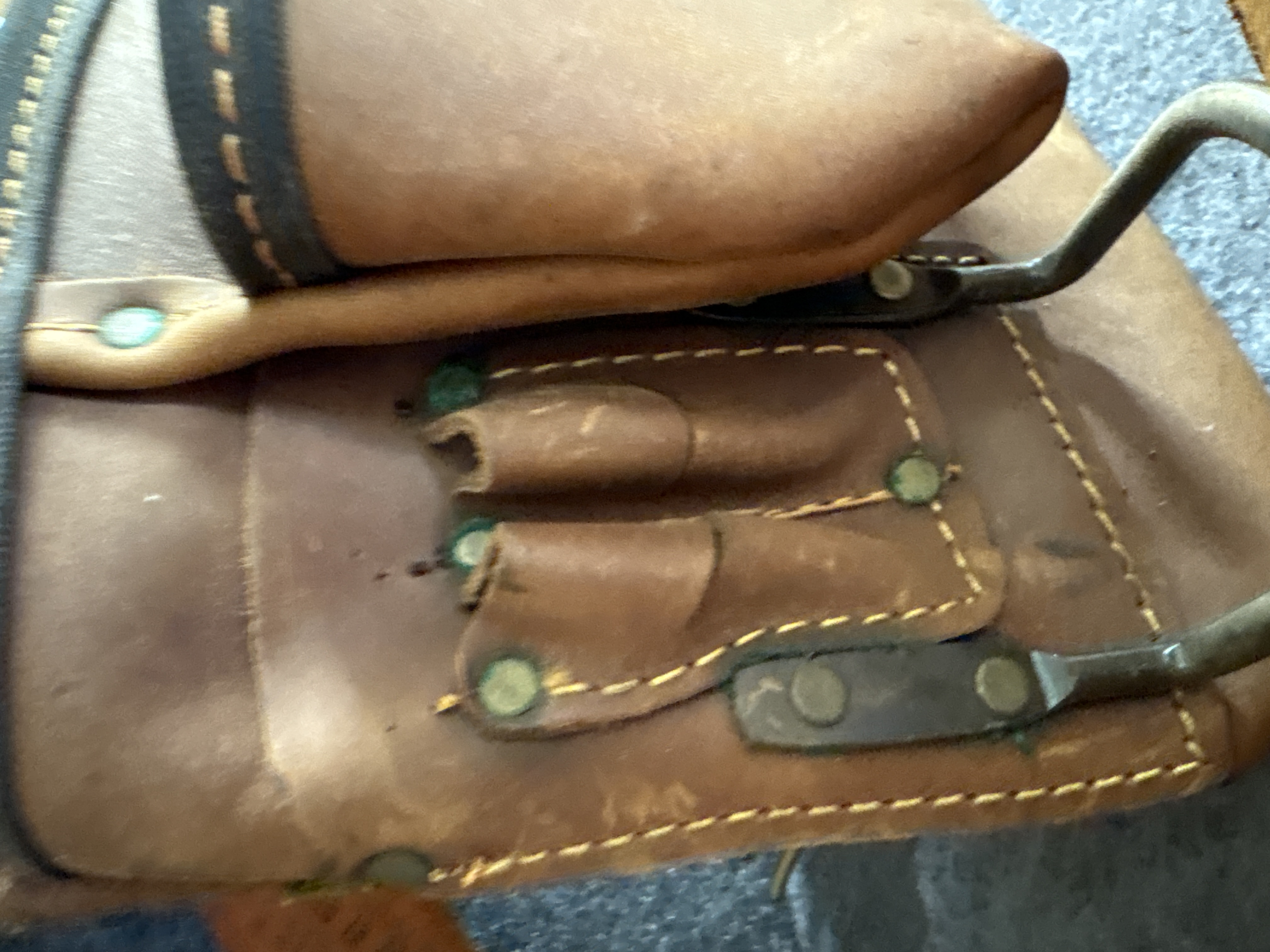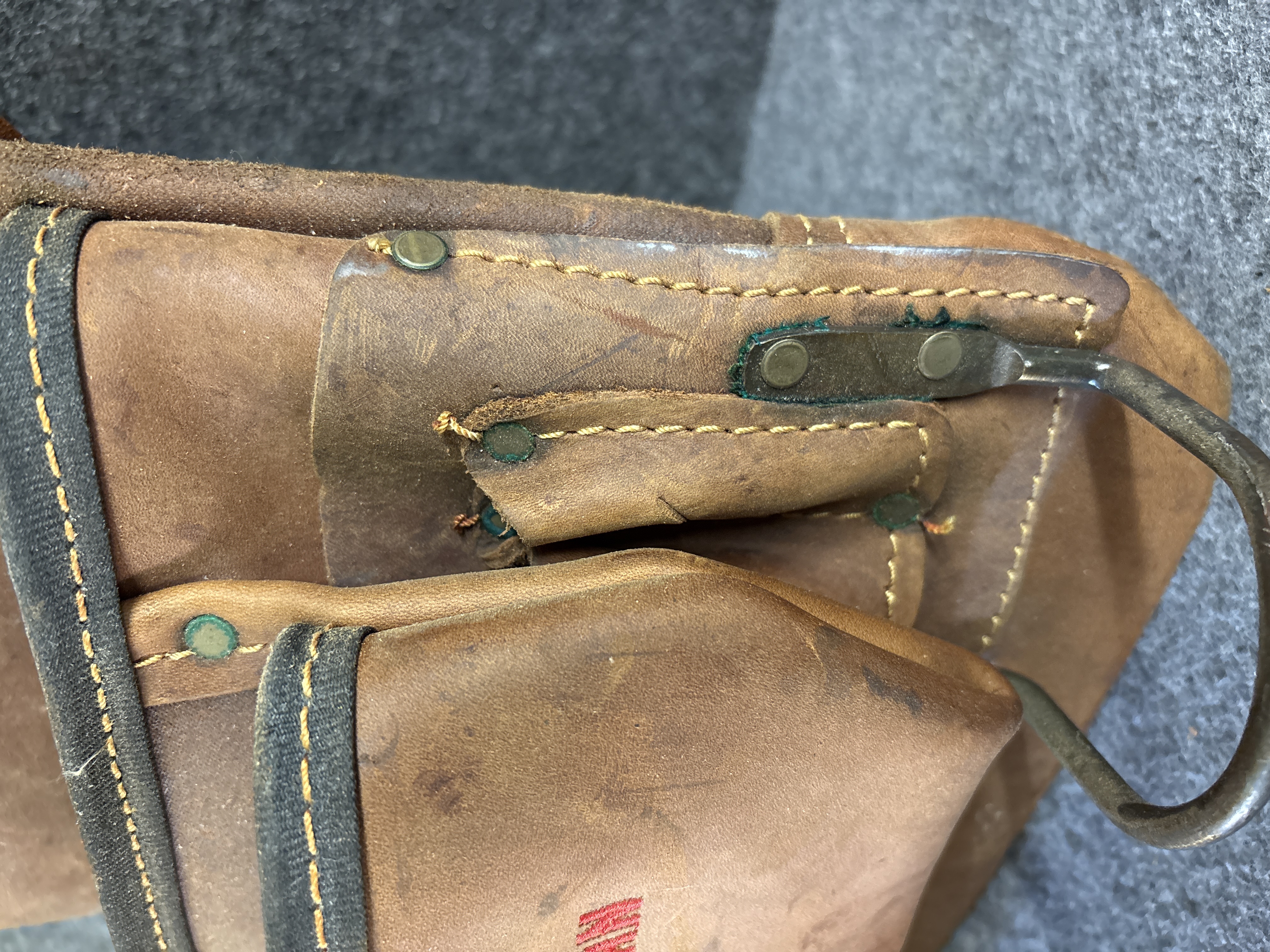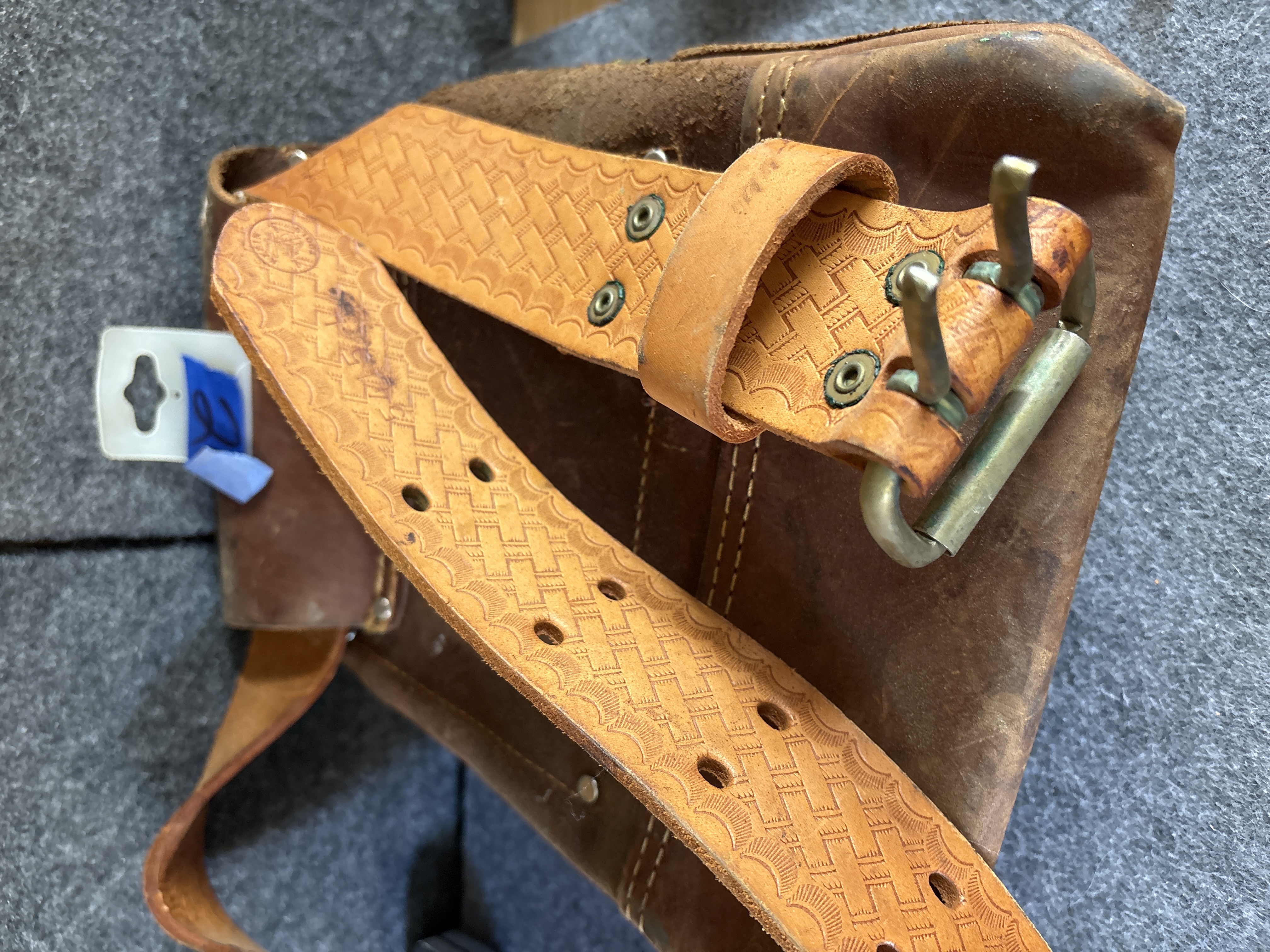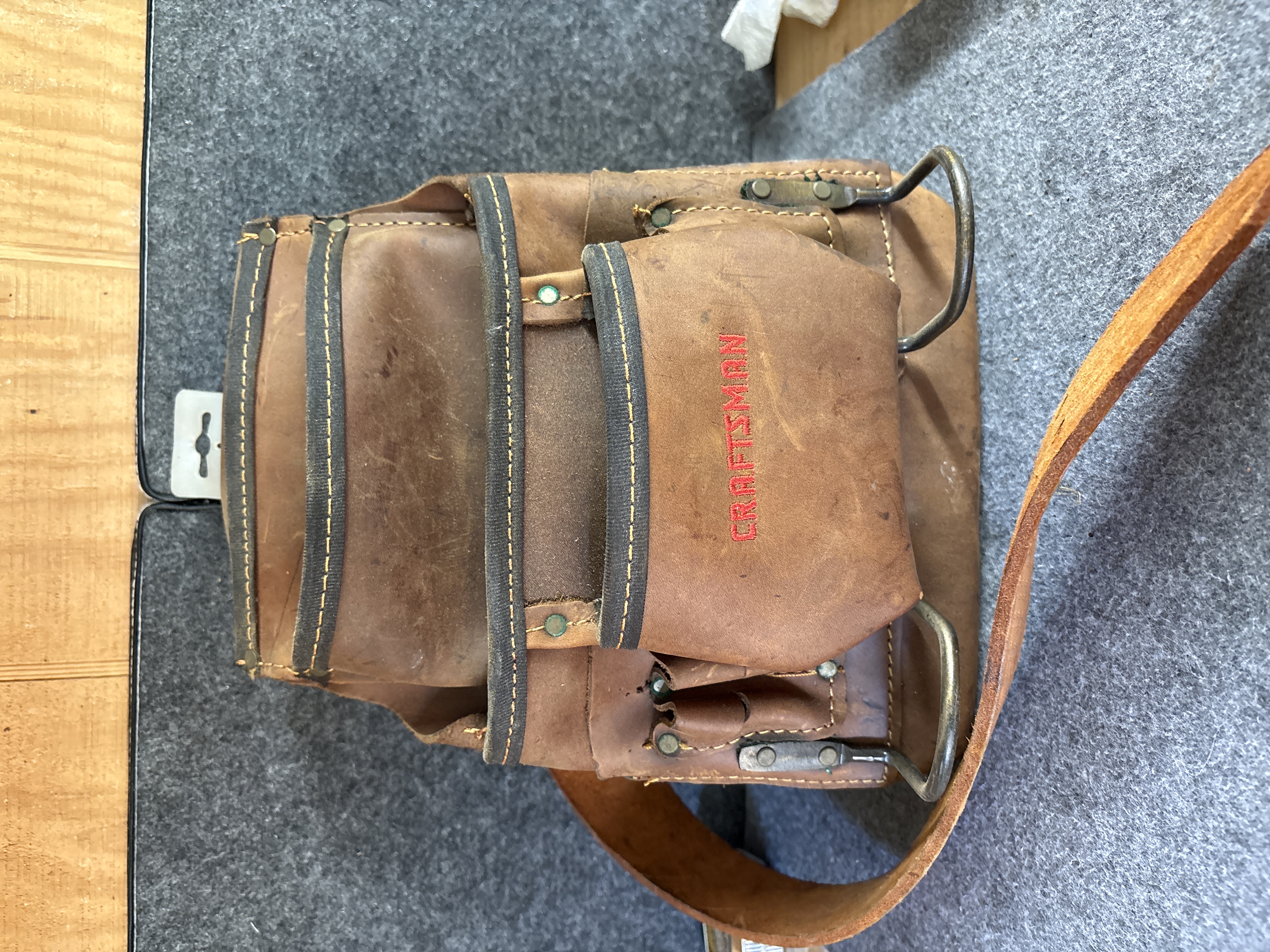A Craftsman leather tool pouch and coordinating belt constructed from heavy-duty brown leather. The pouch features a multi-pocket tiered design with reinforced stitching and metal rivet construction. Two metal hammer loops are integrated into the sides. The primary pocket is embroidered with the Craftsman brand name in red thread. An identification number, 940521, is stamped into the leather. The accompanying leather belt features a stamped basketweave decorative pattern and is fitted with a double-tongue metal buckle.