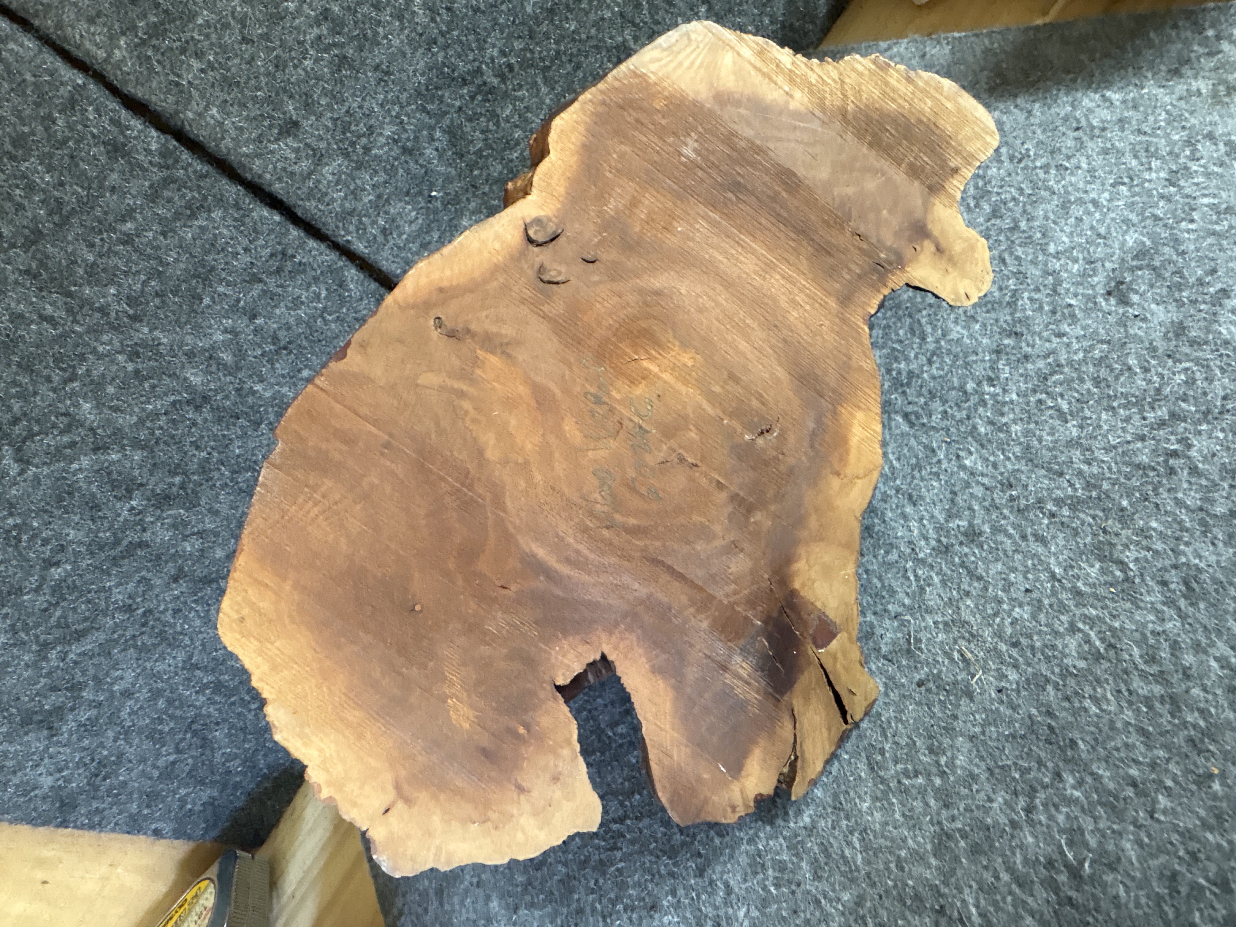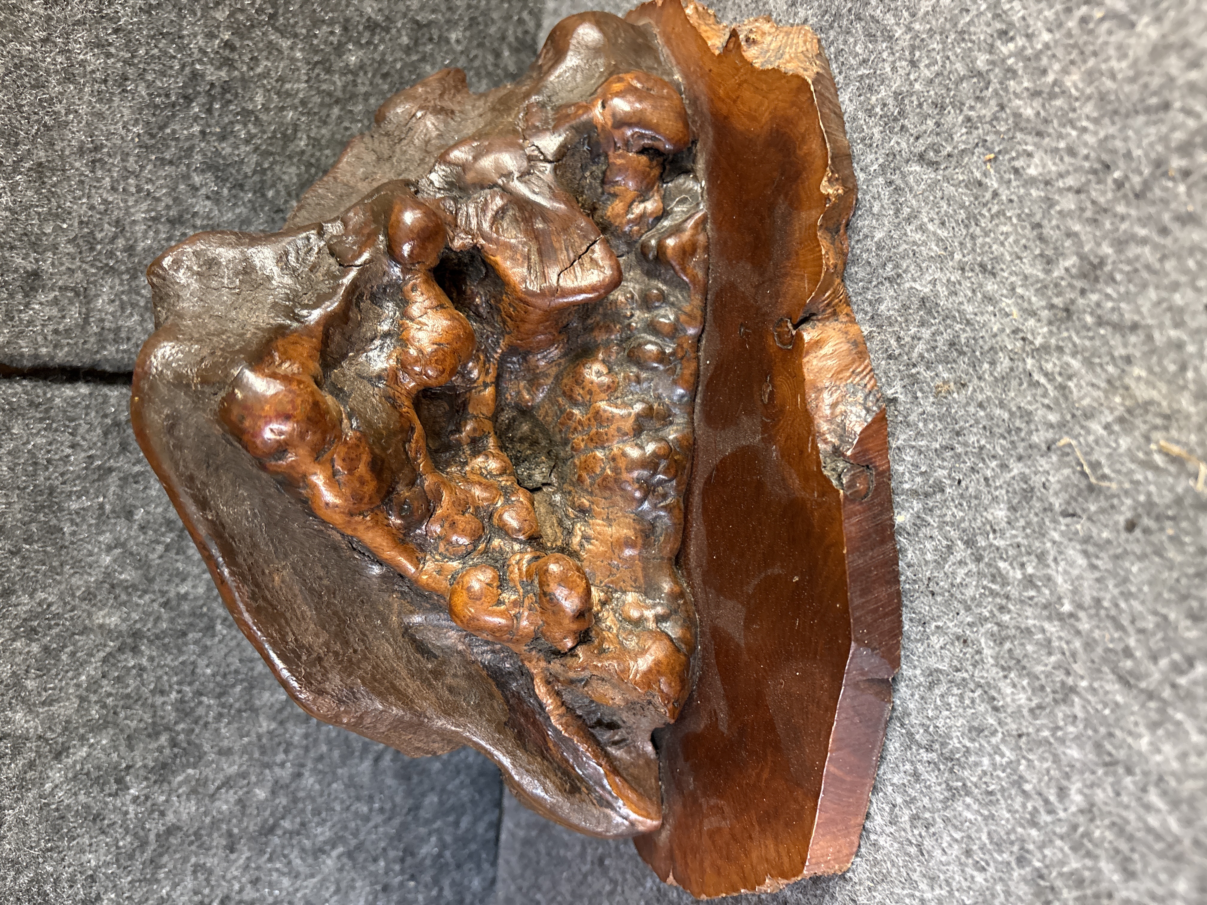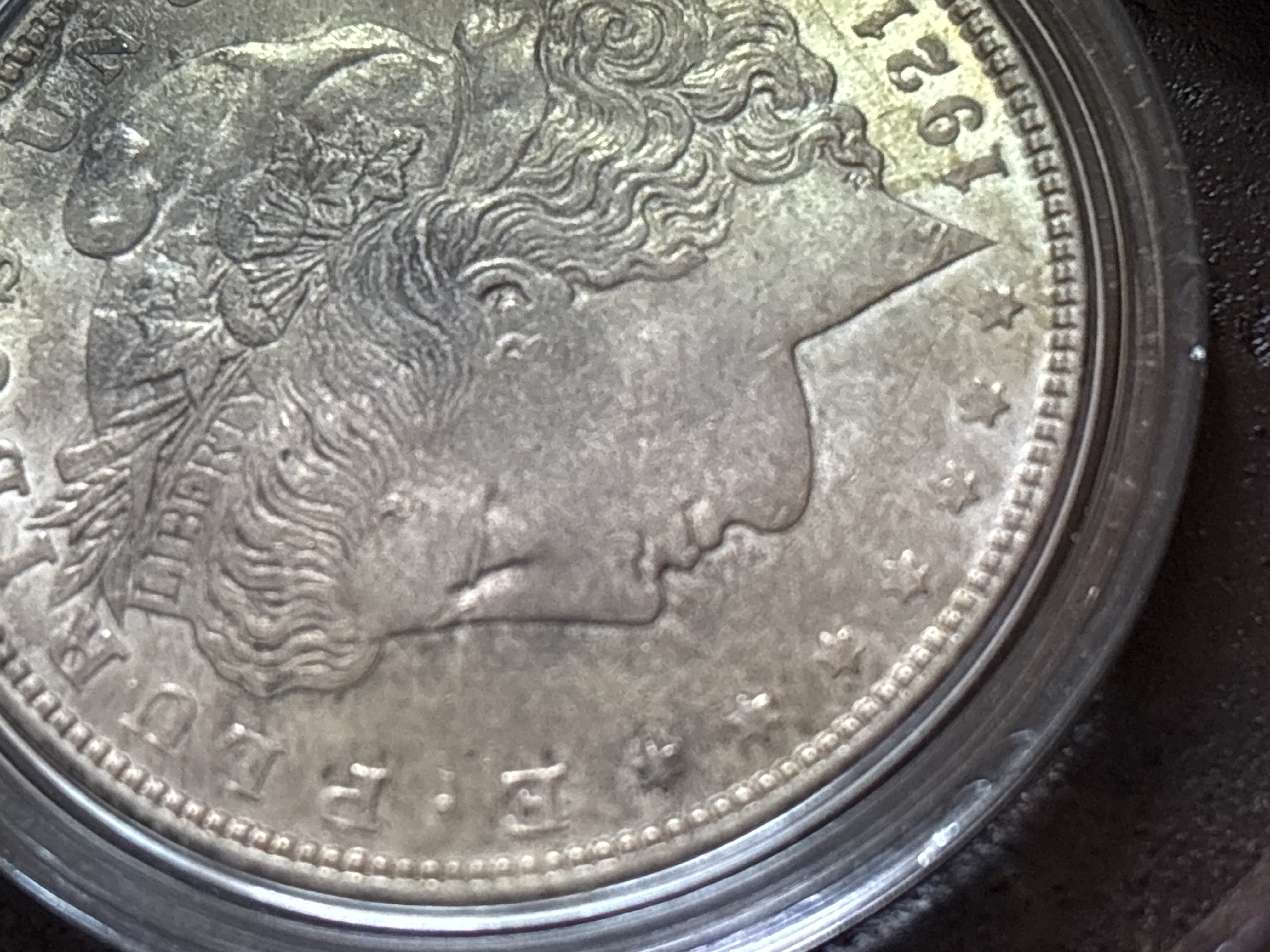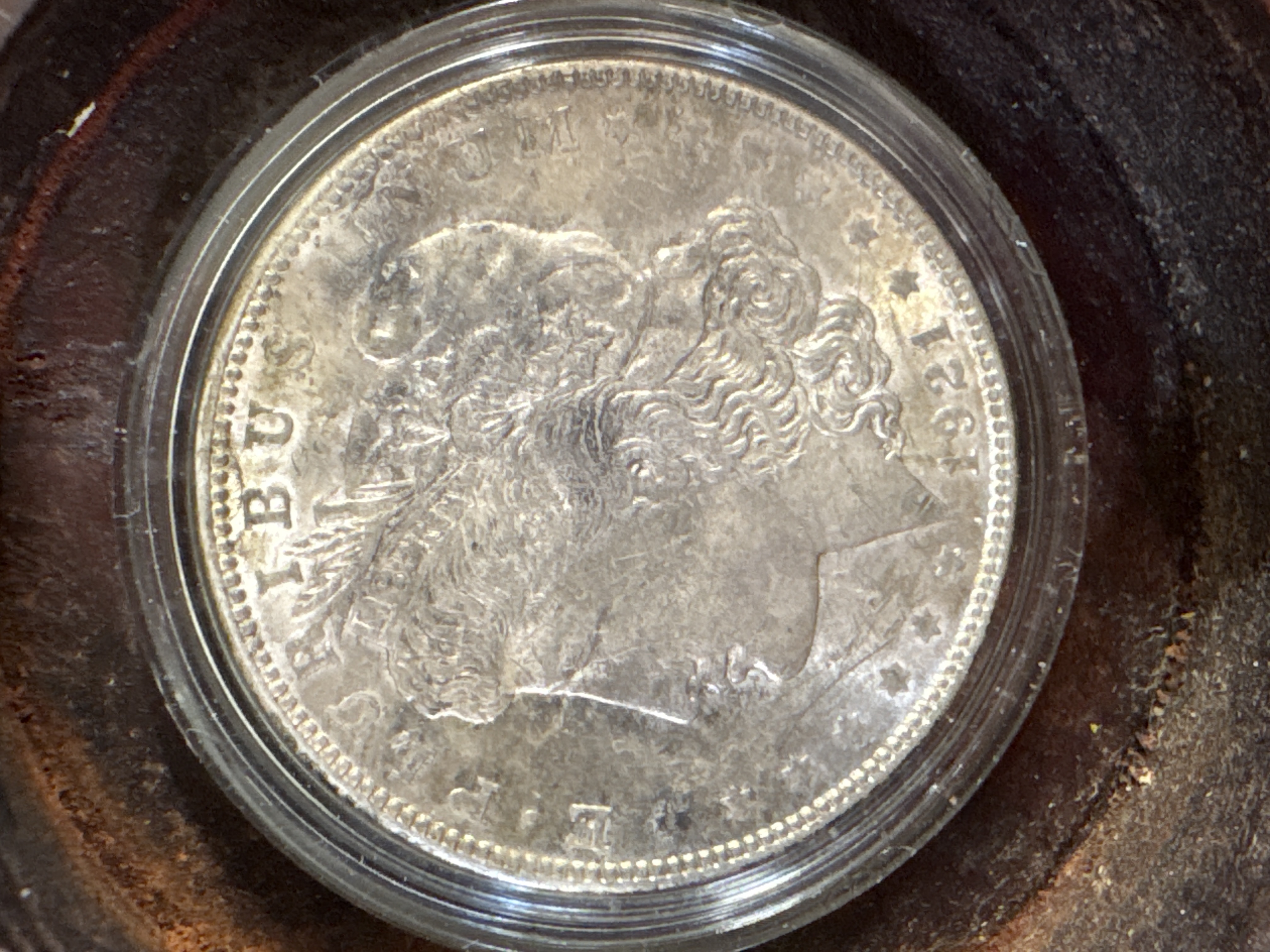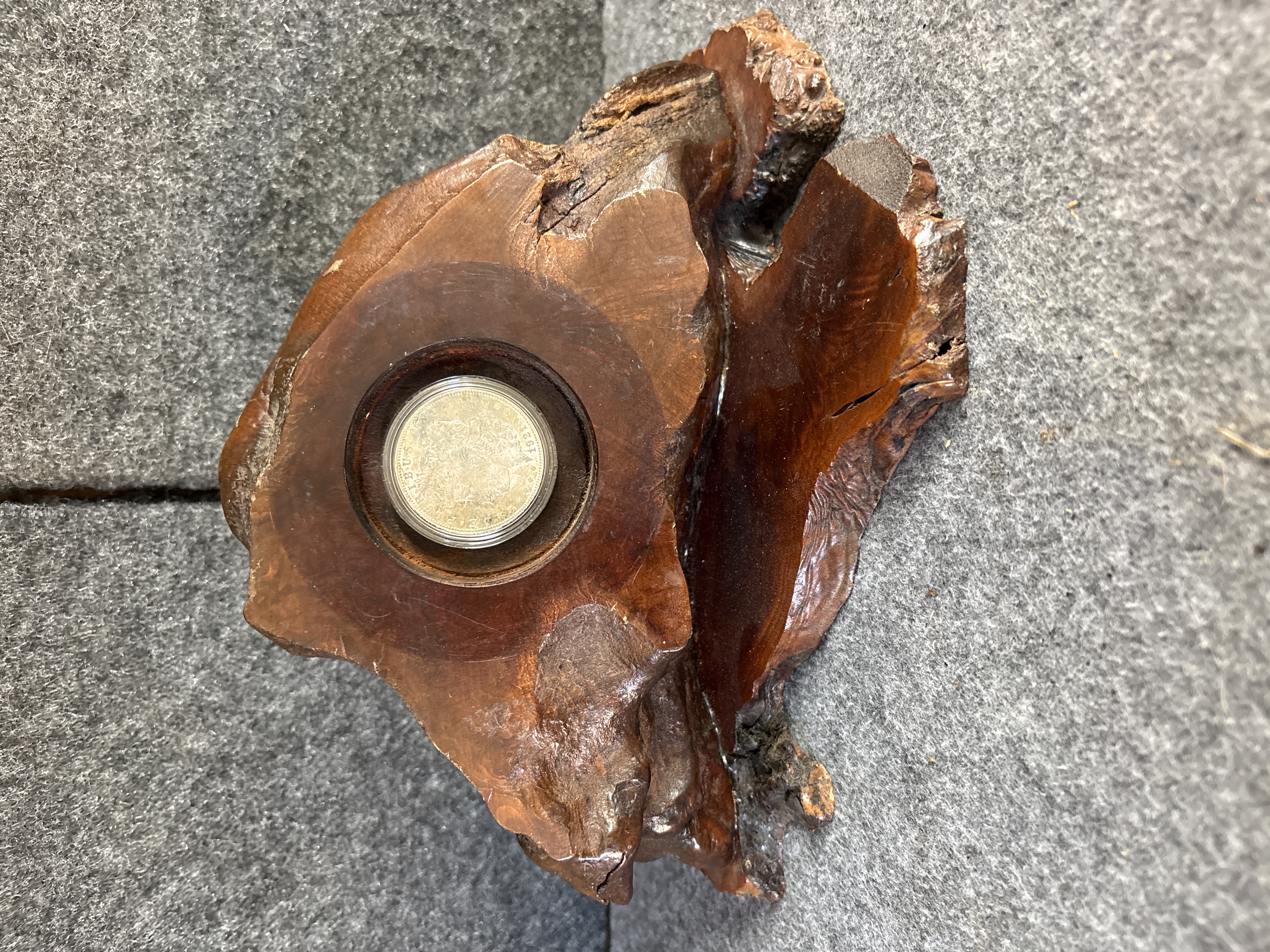 This decorative display piece consists of a natural-edged burl wood base, likely redwood, supporting a United States 1921 Morgan silver dollar. The wood base is finished with a high-gloss polish on the upper surface, which contains a circular recess for the coin. The coin is positioned obverse-up, displaying the profile of Liberty, the motto E PLURIBUS UNUM, and the date 1921. The wood exhibits a deep reddish-brown color with natural bark texture along the irregular perimeter. The underside of the base is flat and unfinished, showing faint handwritten markings.