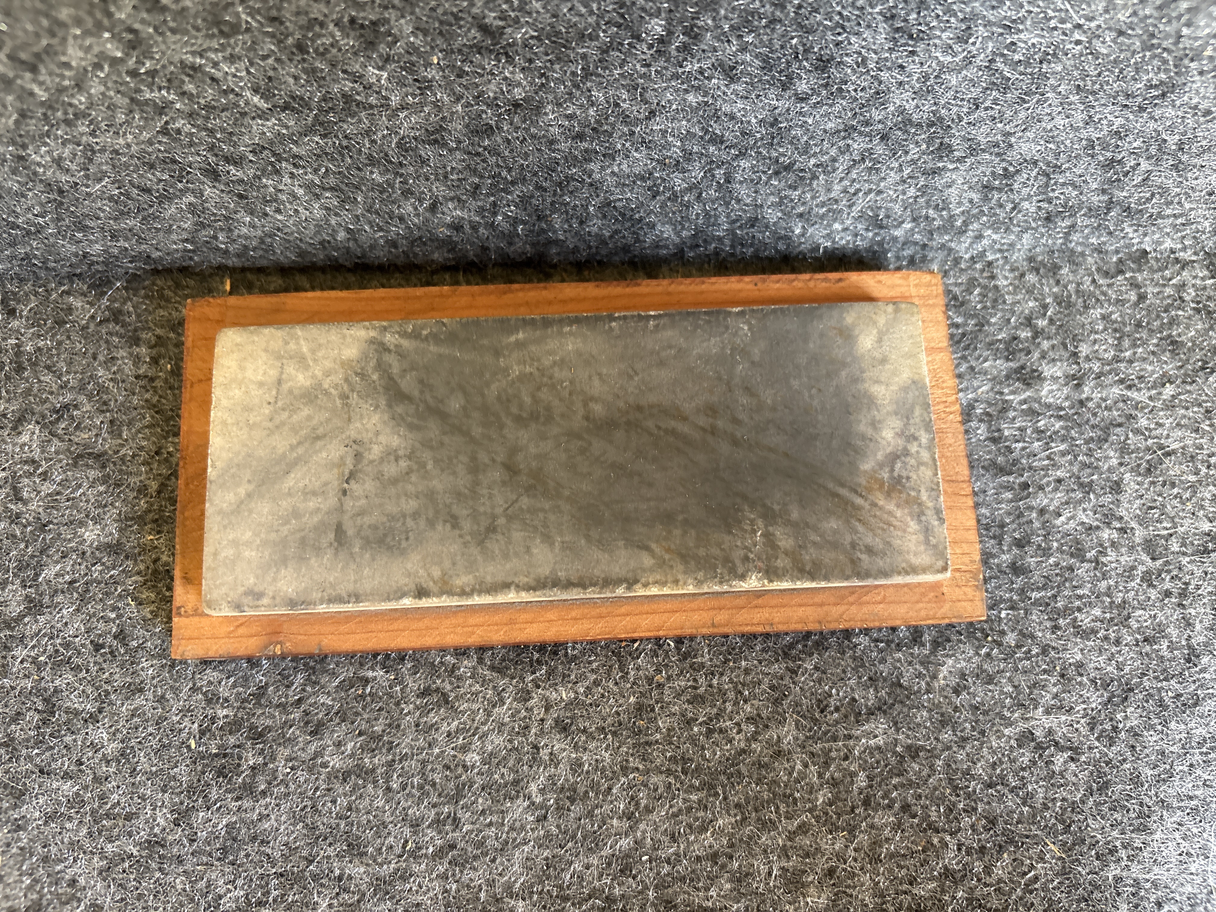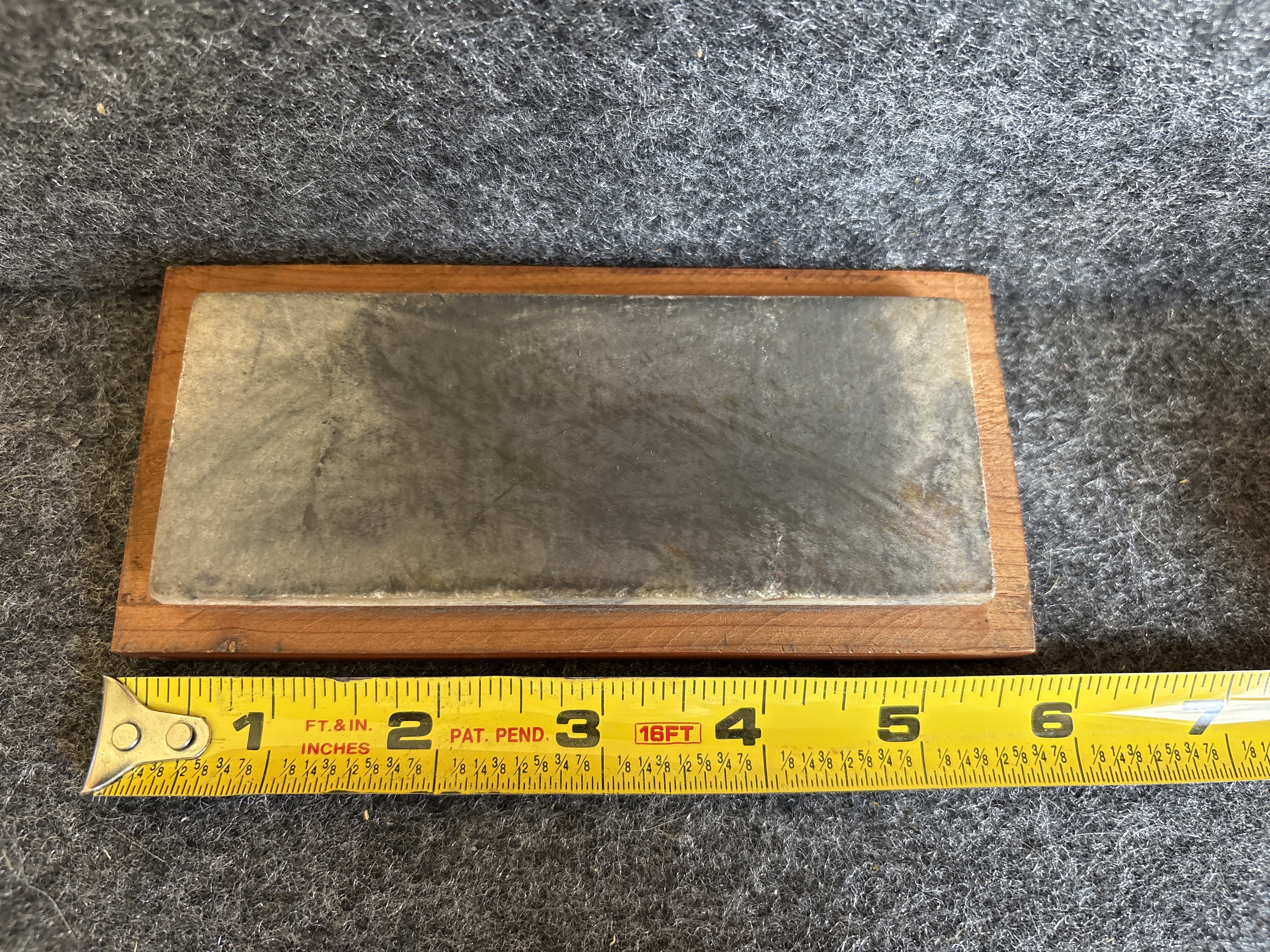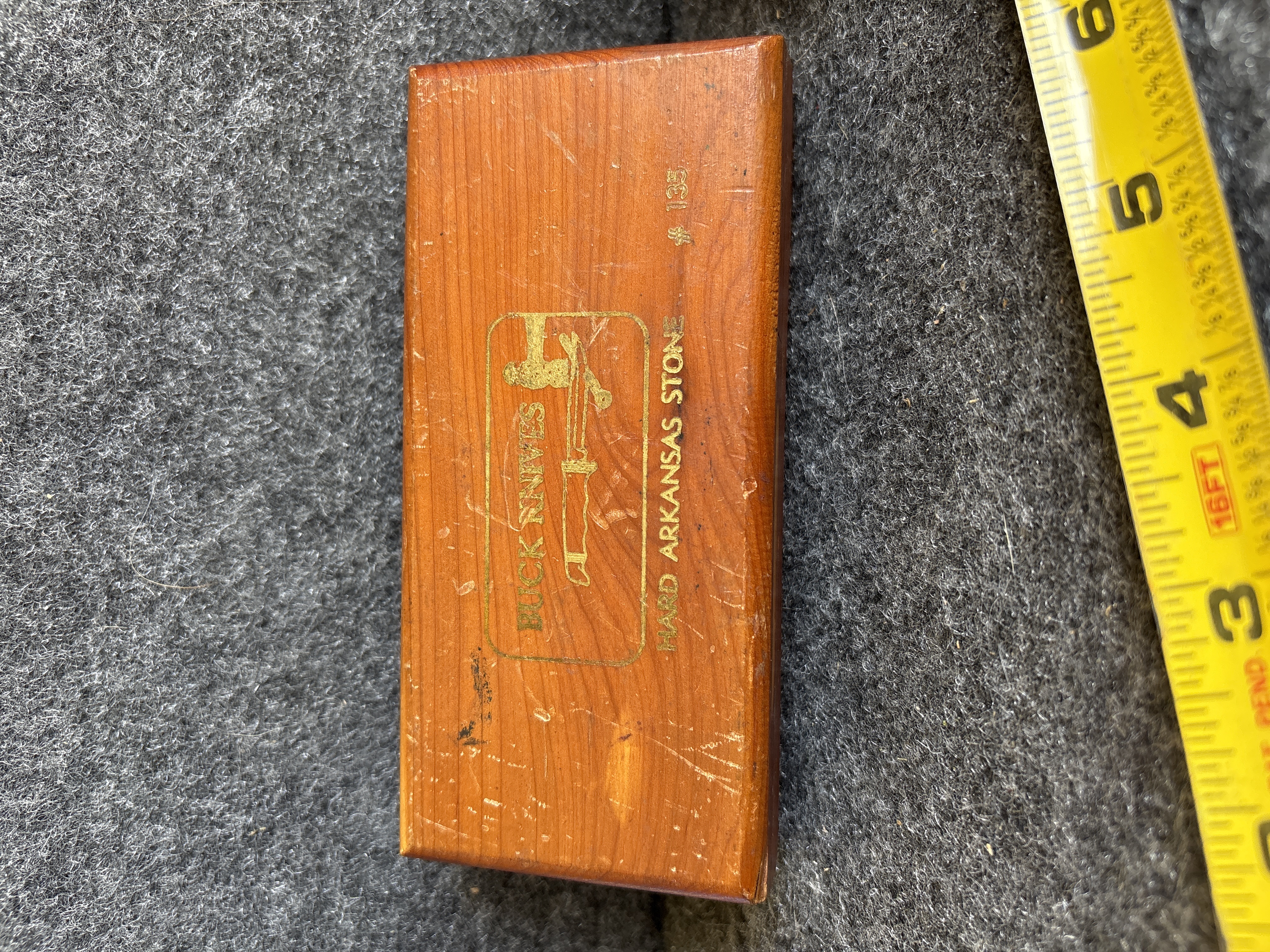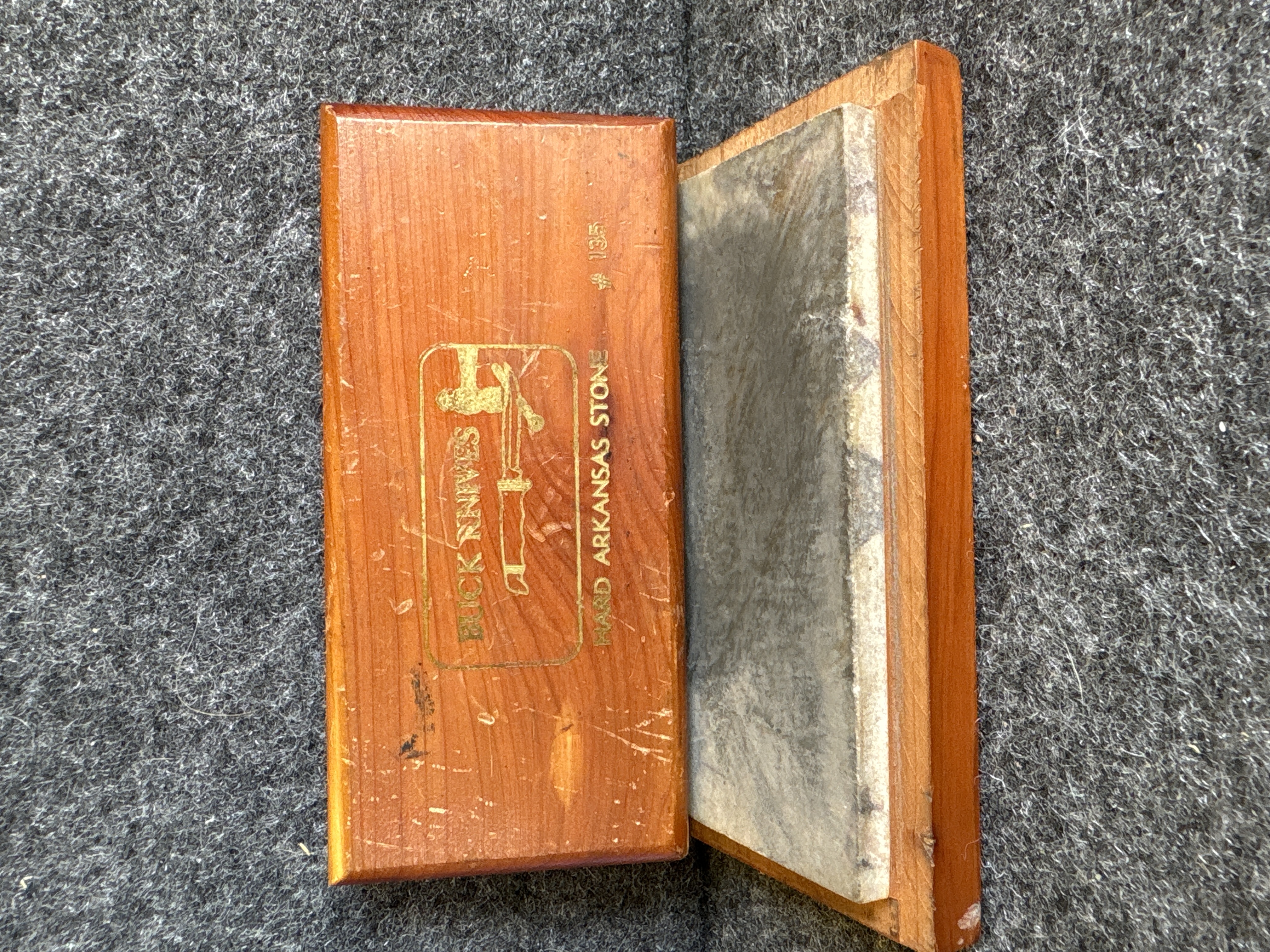 A Buck Knives Hard Arkansas Stone model number 135 featuring a grey sharpening stone housed in a gold-stamped brown wooden box measuring approximately 6 inches in length.