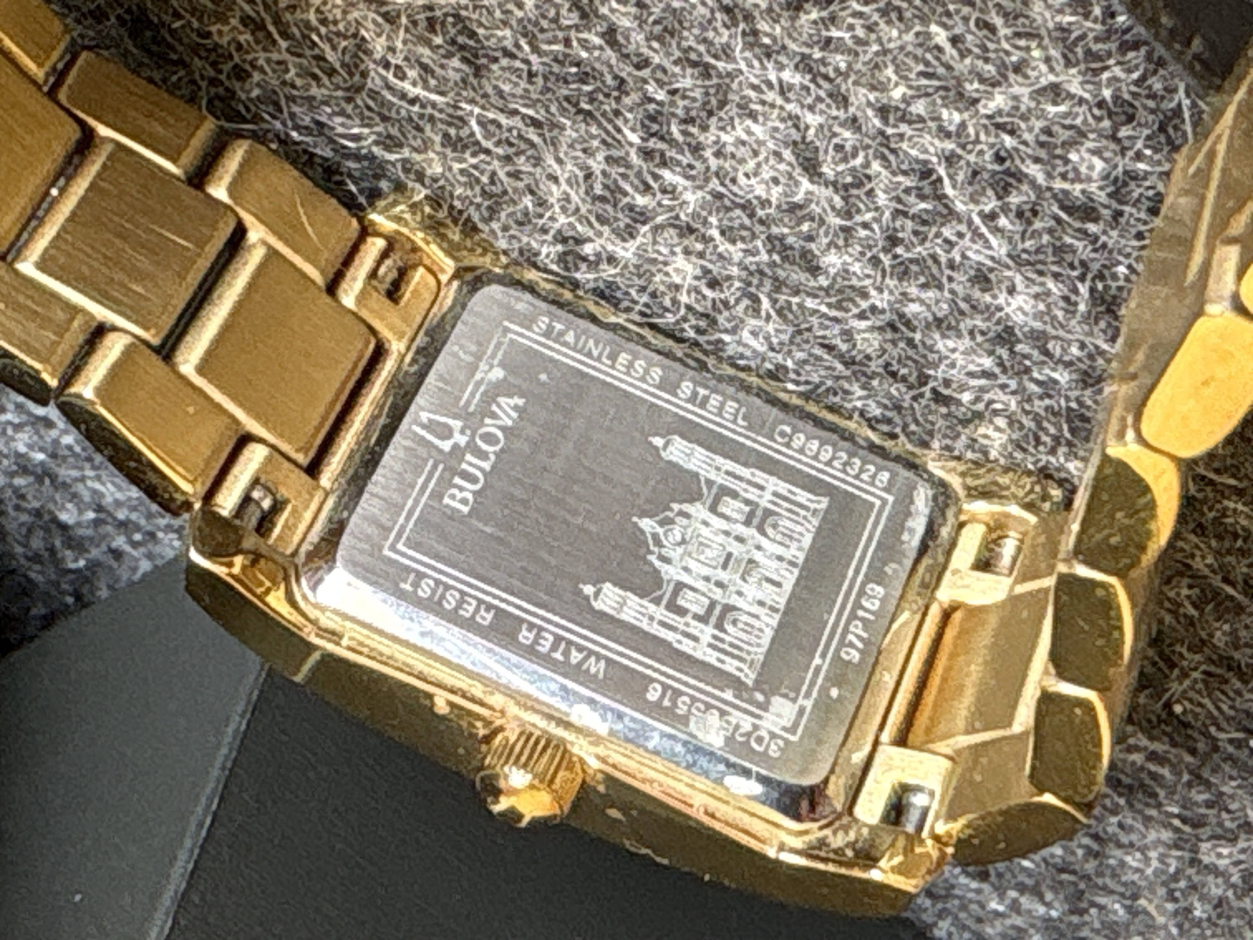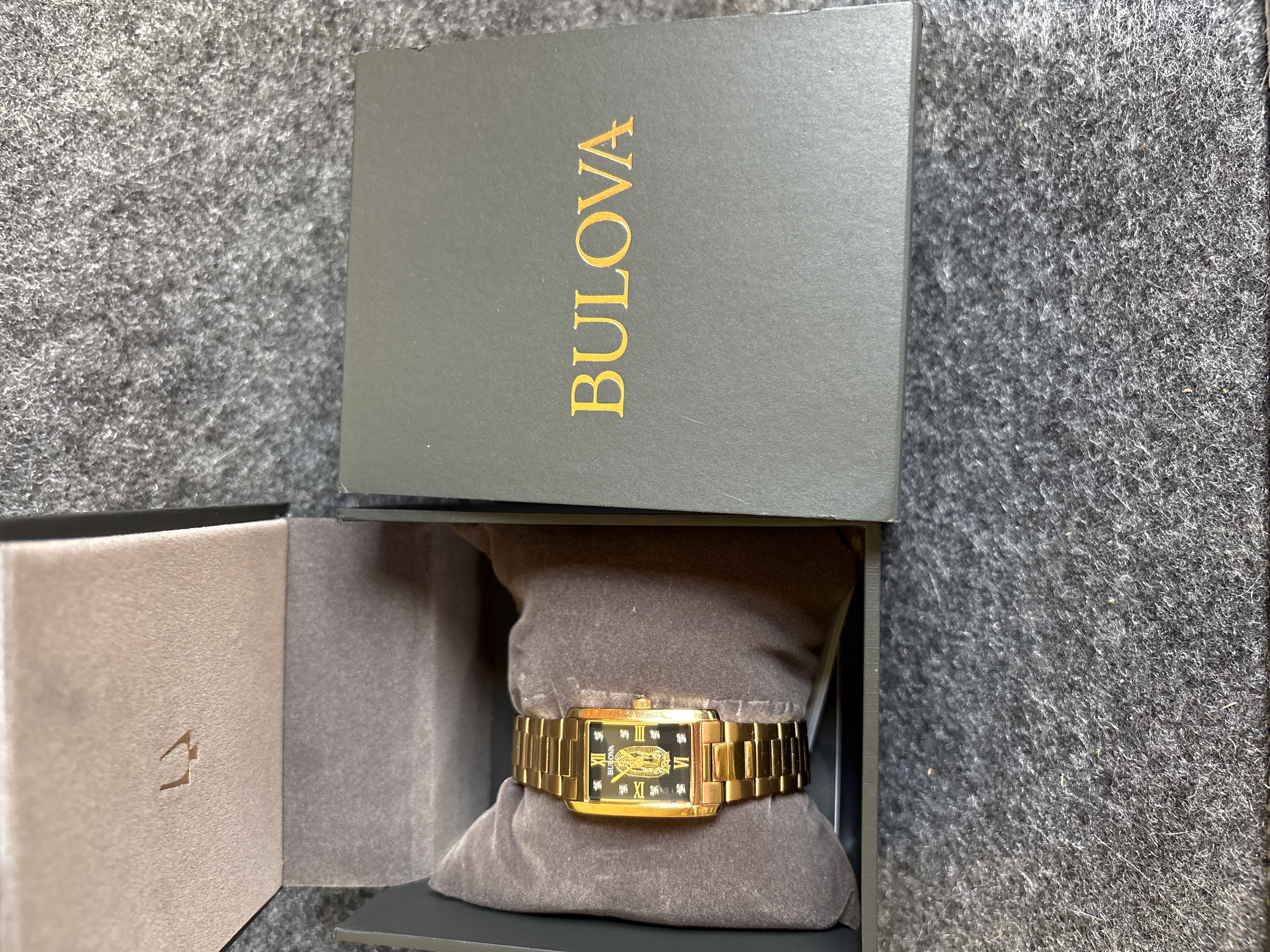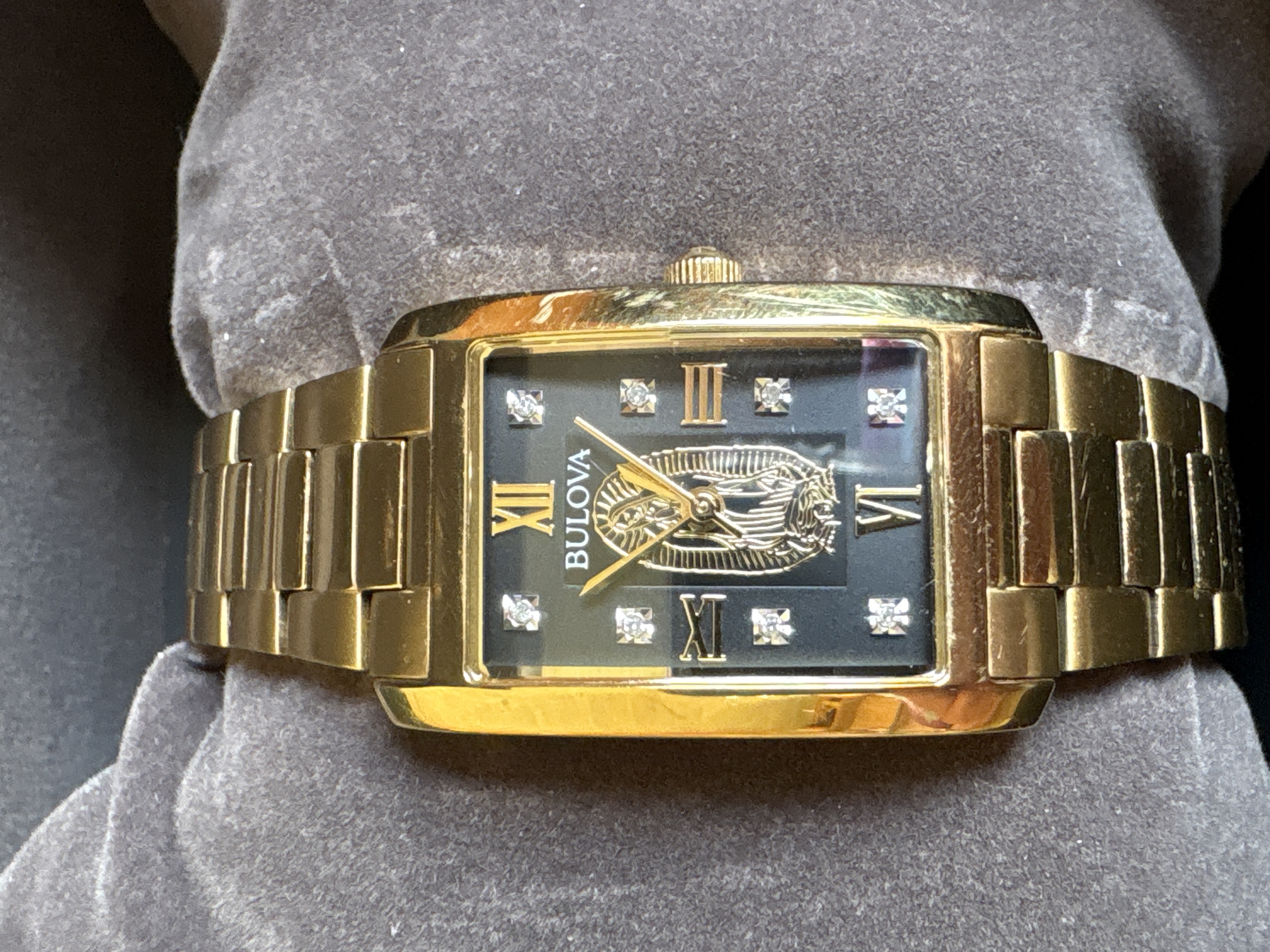A gold-toned Bulova wristwatch featuring a black dial with crystal markers and an image of Our Lady of Guadalupe, including the original box and manual.