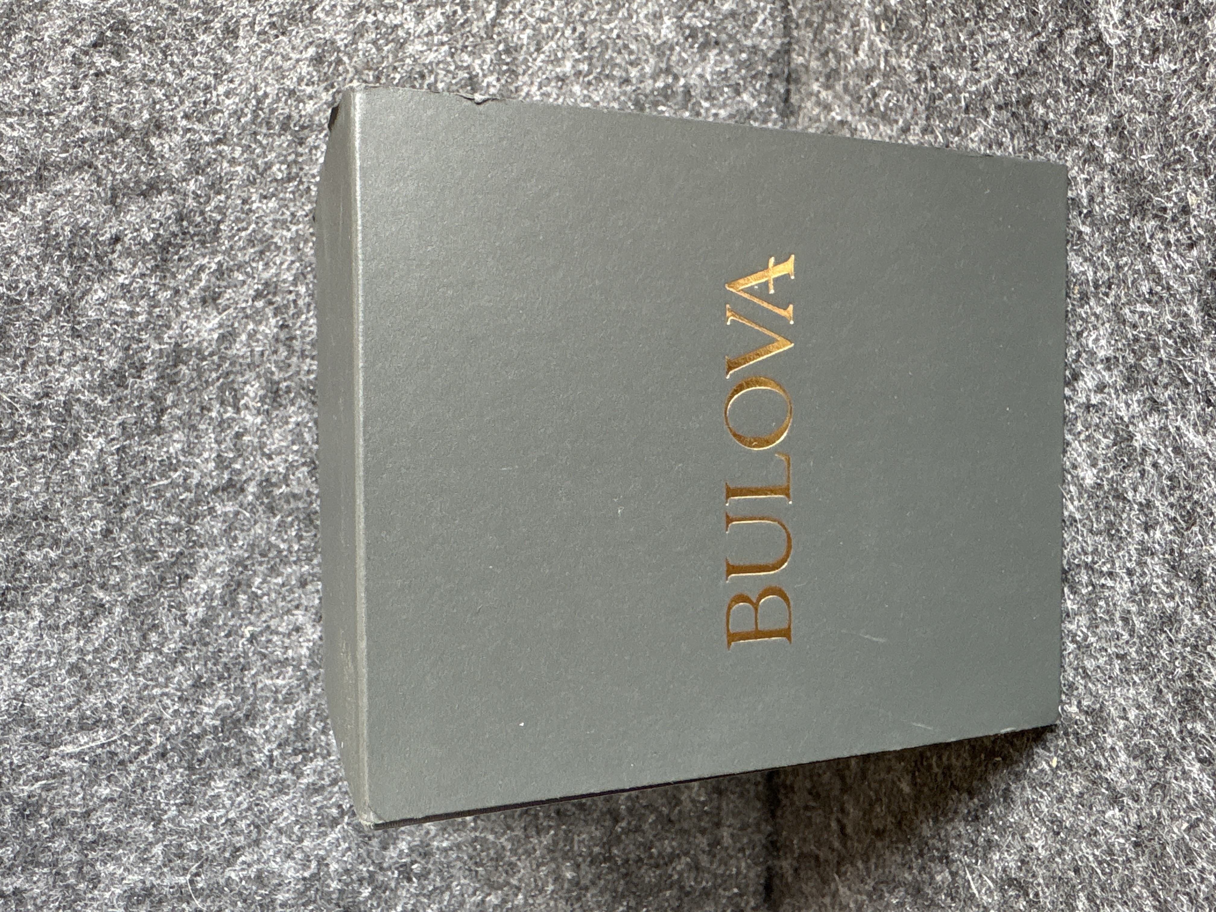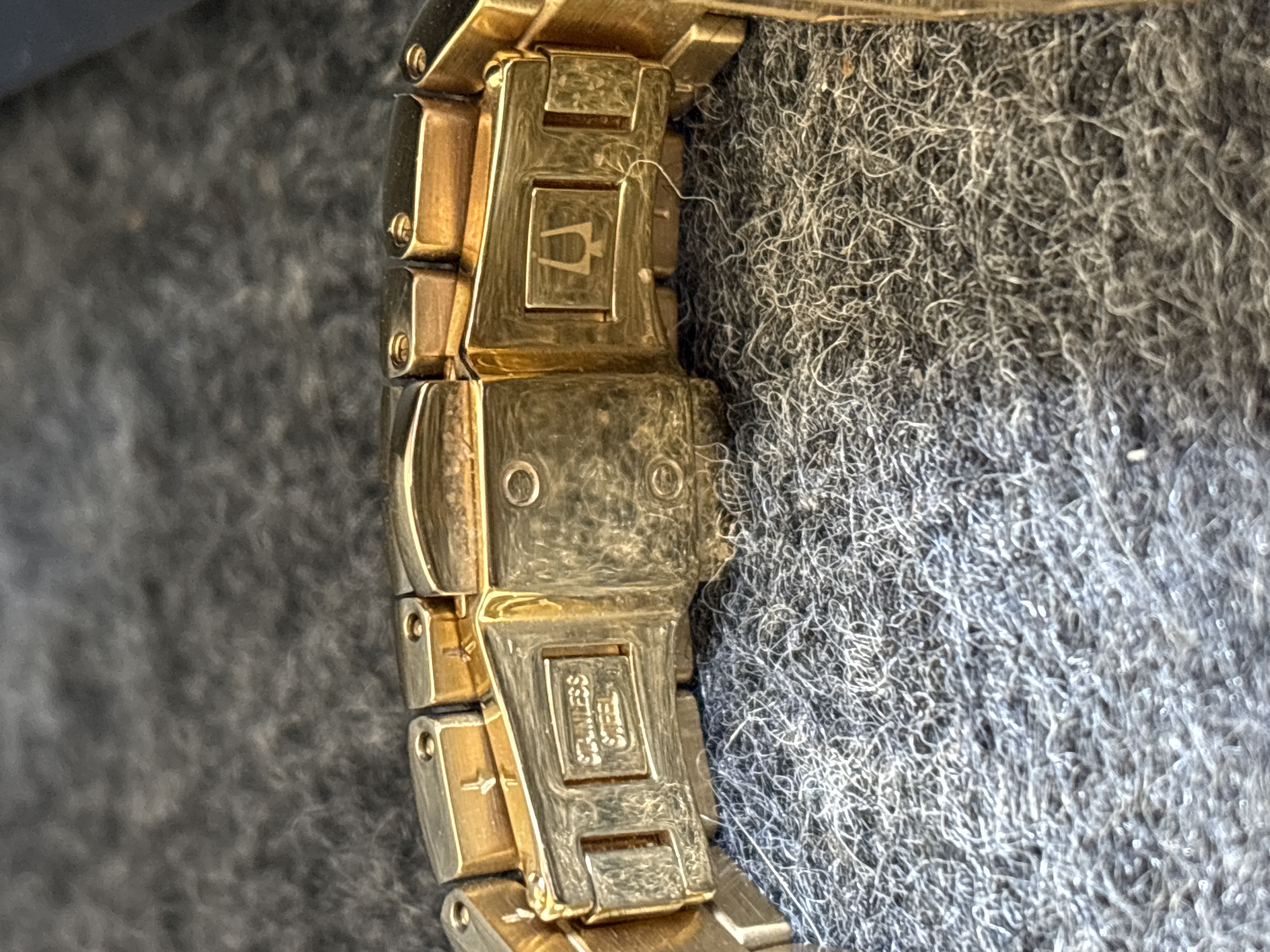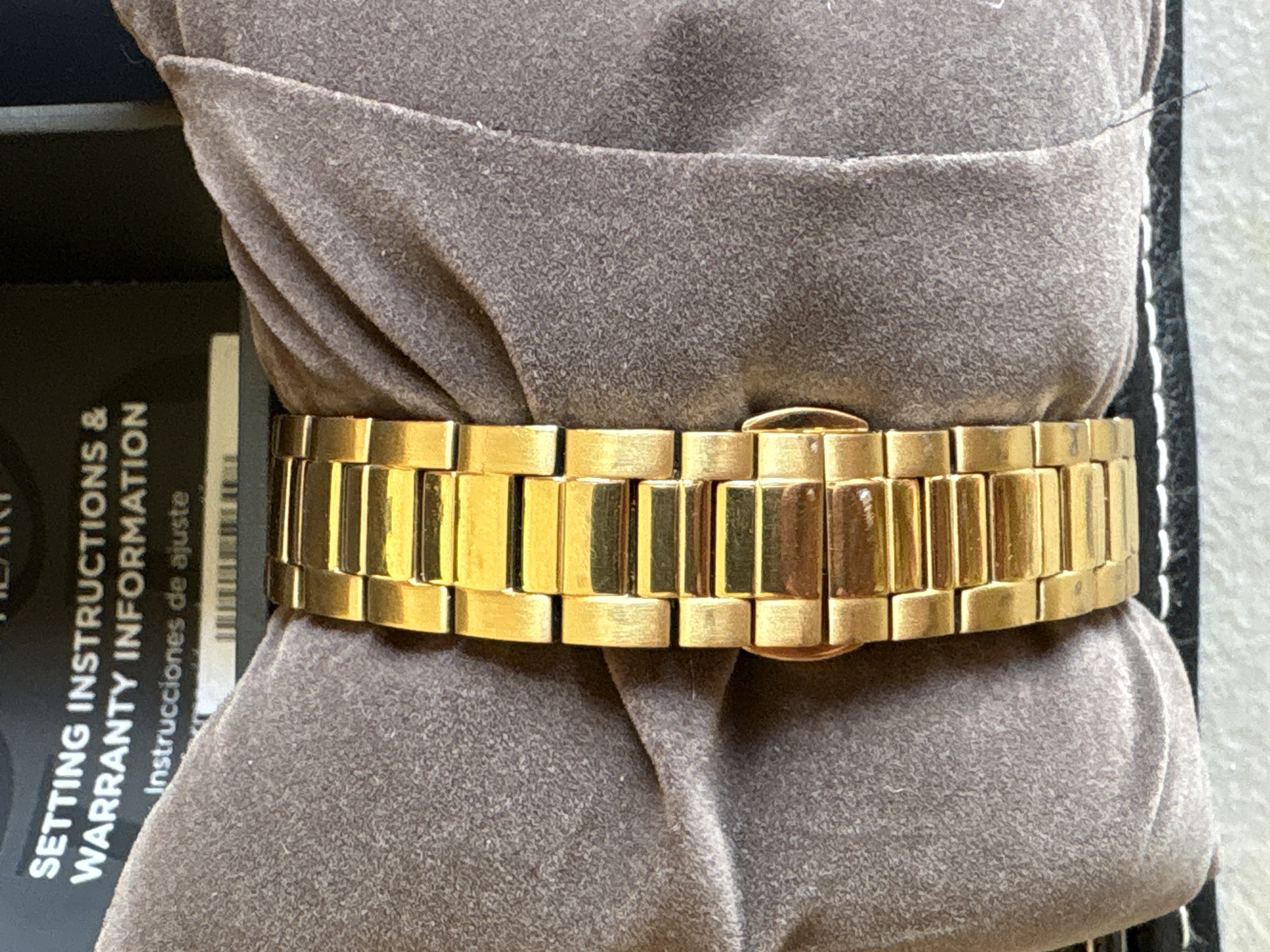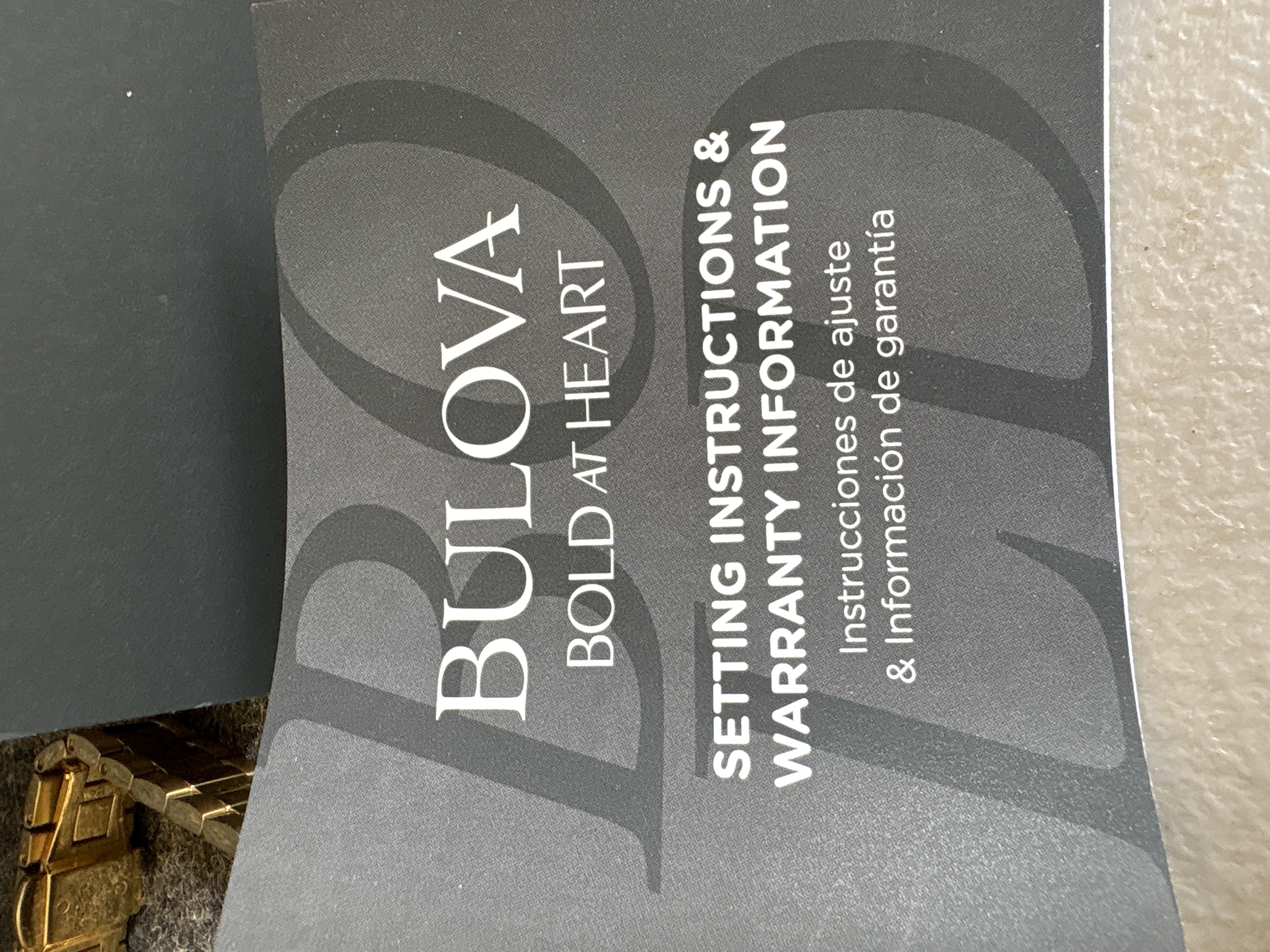 A gold-toned Bulova wristwatch featuring a black dial with crystal markers and an image of Our Lady of Guadalupe, including the original box and manual.