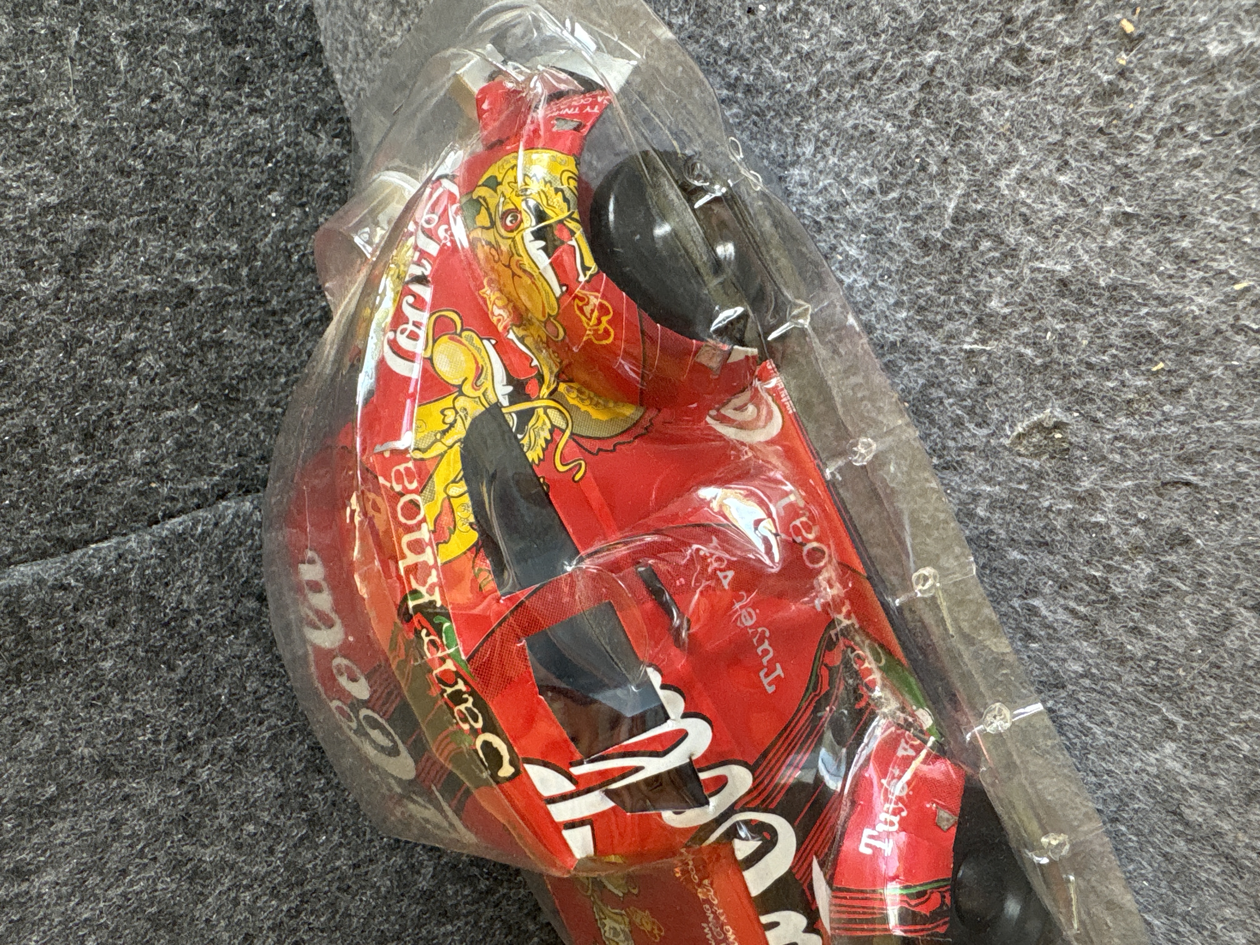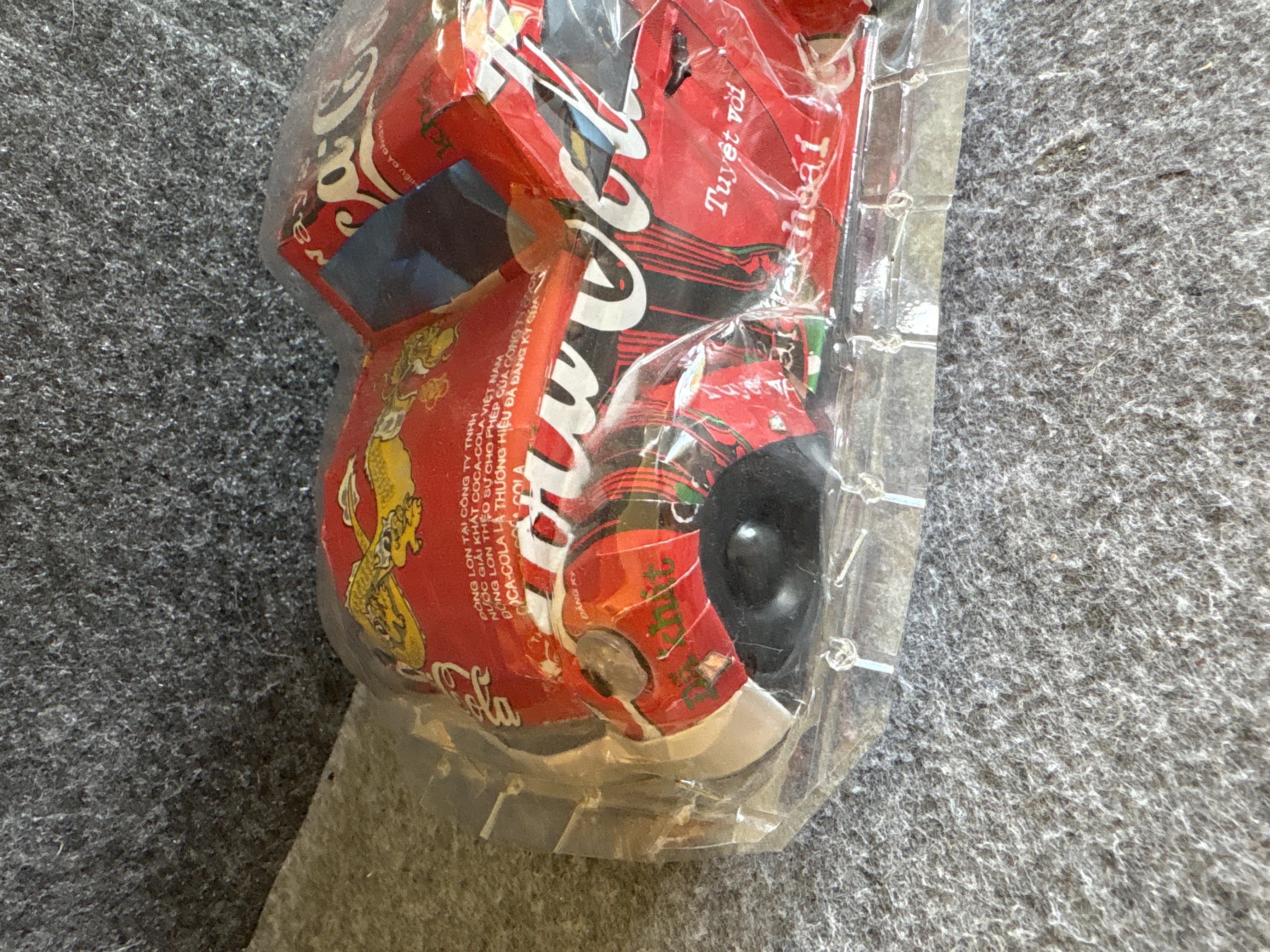 This contemporary folk art model of a Volkswagen Beetle is hand-crafted from upcycled Vietnamese Coca-Cola aluminum cans. The exterior of the vehicle features the recognizable red and white Coca-Cola branding integrated with a decorative yellow and gold dragon motif and Vietnamese text, including the words Tuyet voi (Wonderful) and Khoai (Pleasure). The model is constructed with four black wheels on metal wire axles and is protected by a clear, molded plastic shell. The construction utilizes hand-cut and folded aluminum sections, with the underside revealing the interior of the recycled cans and the wire axle assembly.