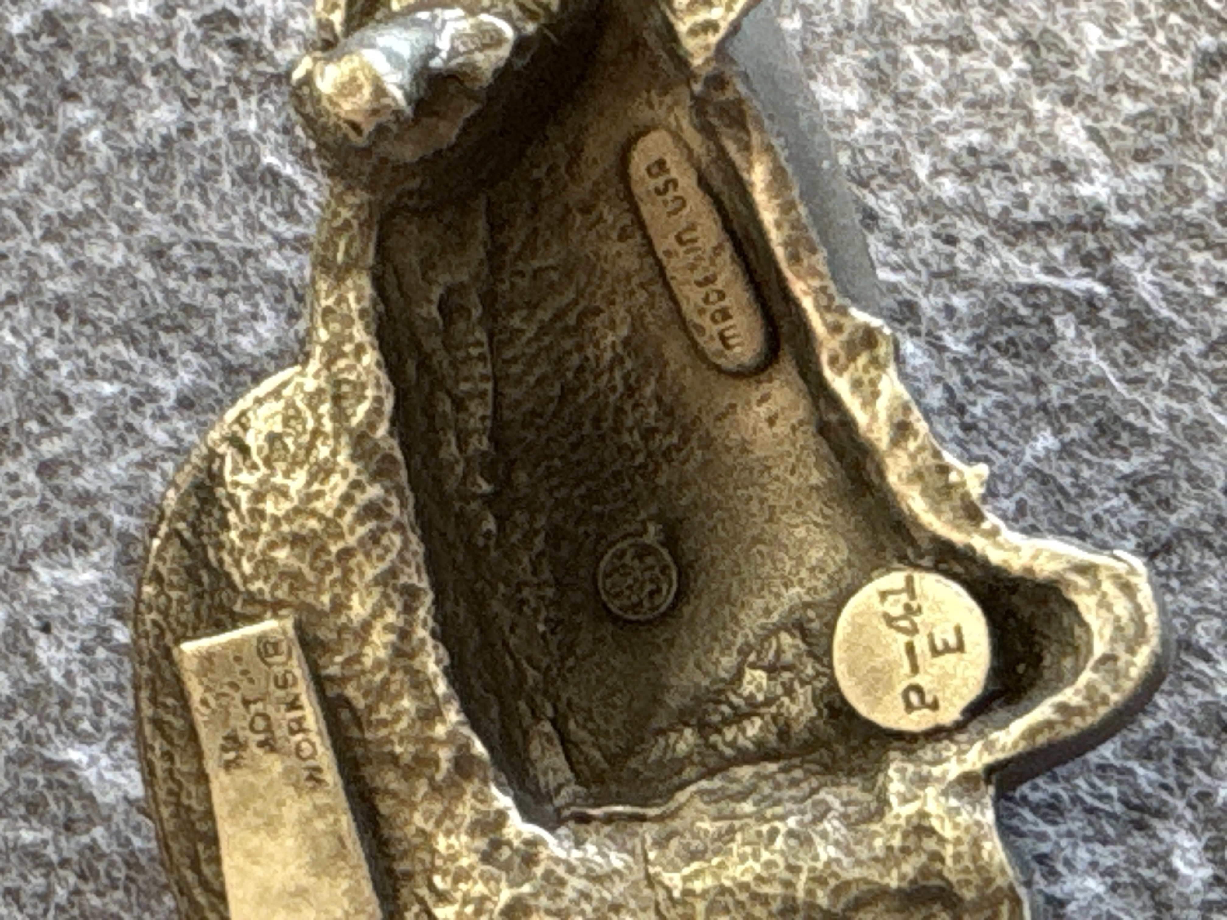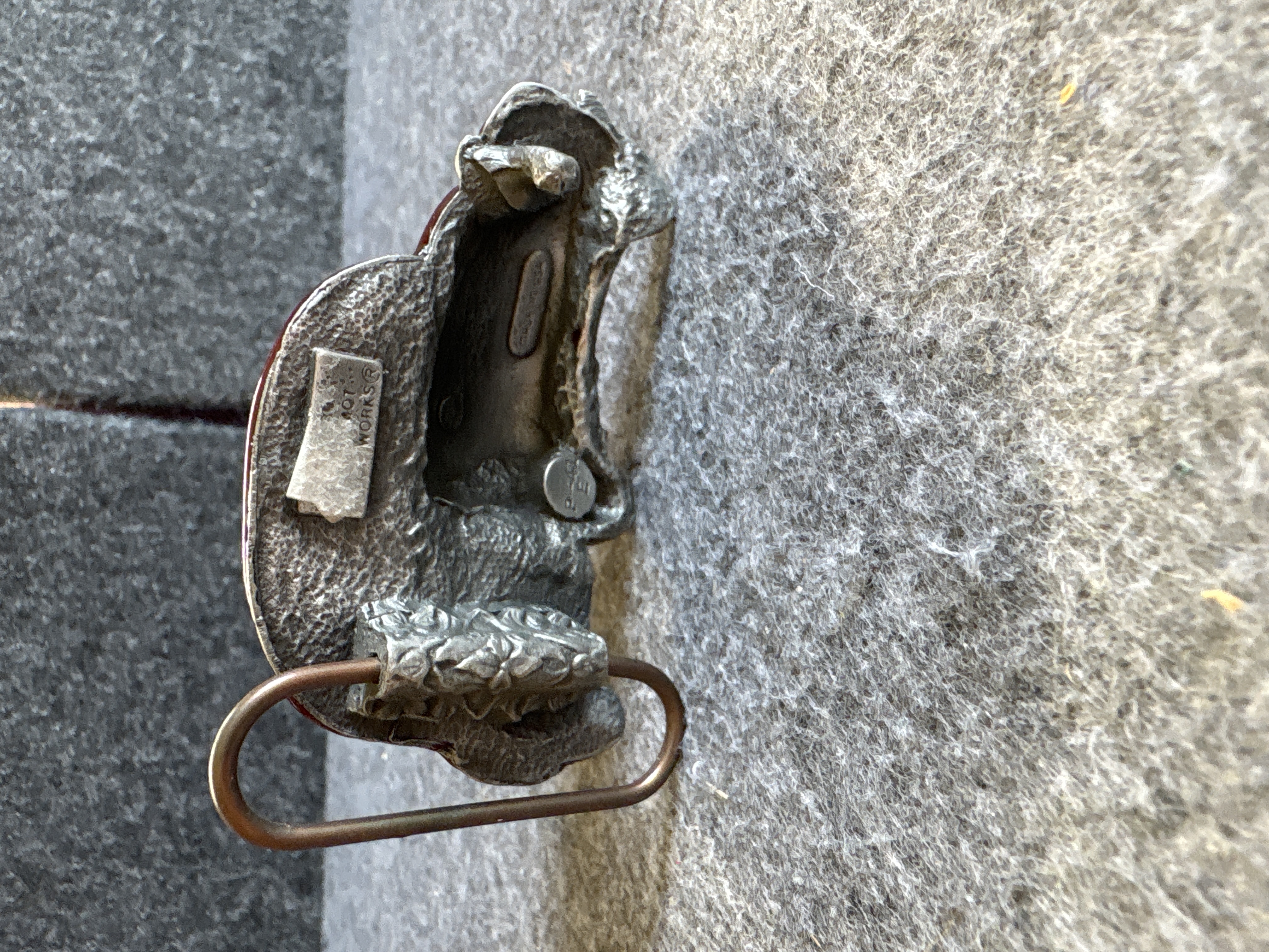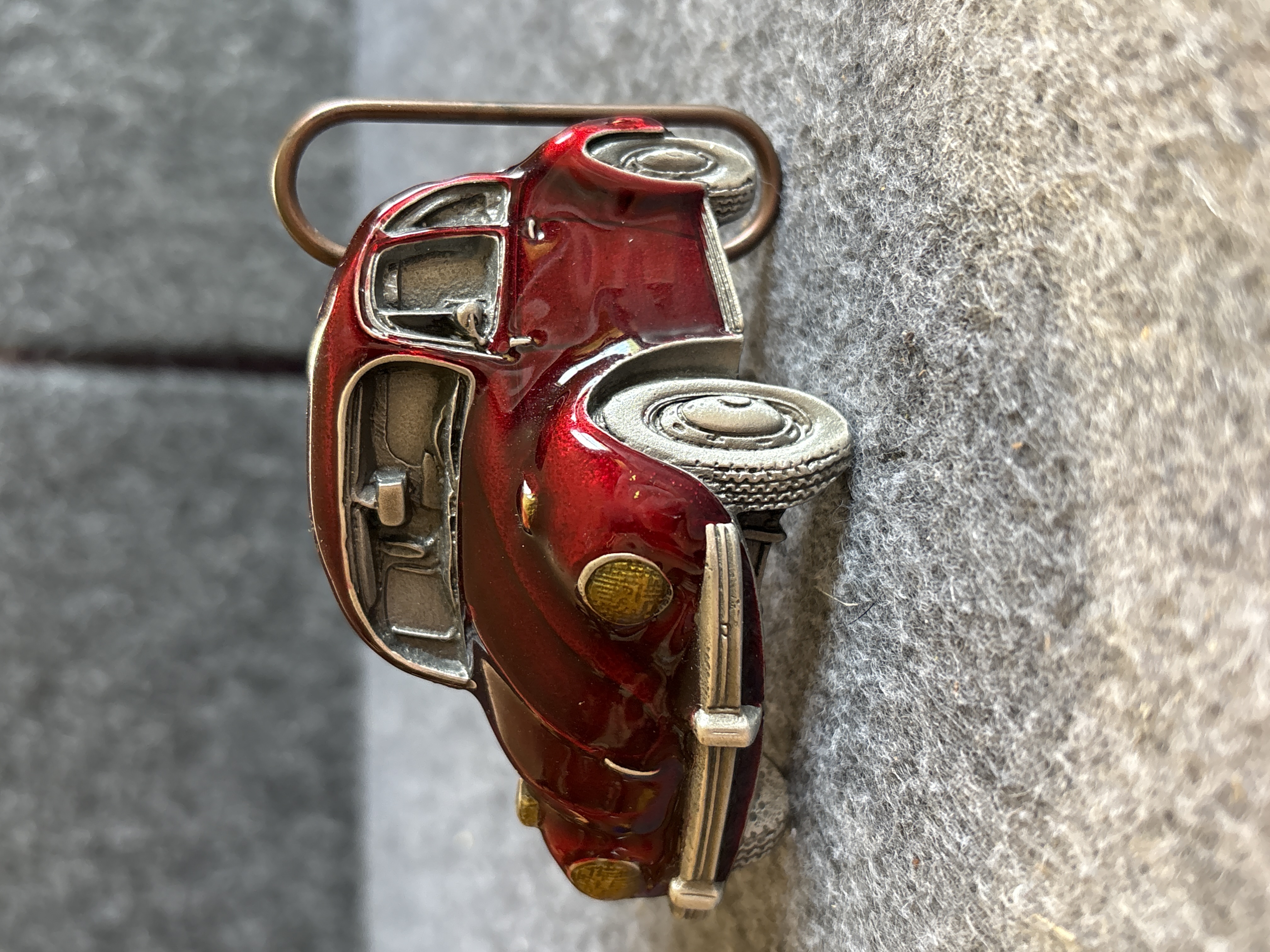 This cast metal belt buckle is modeled in the shape of a Volkswagen Beetle. The exterior is finished in a deep red enamel with yellow highlights on the headlights and silver-tone metallic detailing on the bumpers, windows, and wheels. The reverse features a textured surface and includes the embossed marks MADE IN USA and ART WORKS. A small circular stamp is also present containing the characters P-41 E. The buckle is equipped with a standard wire loop and a peg hook for attachment to a belt.