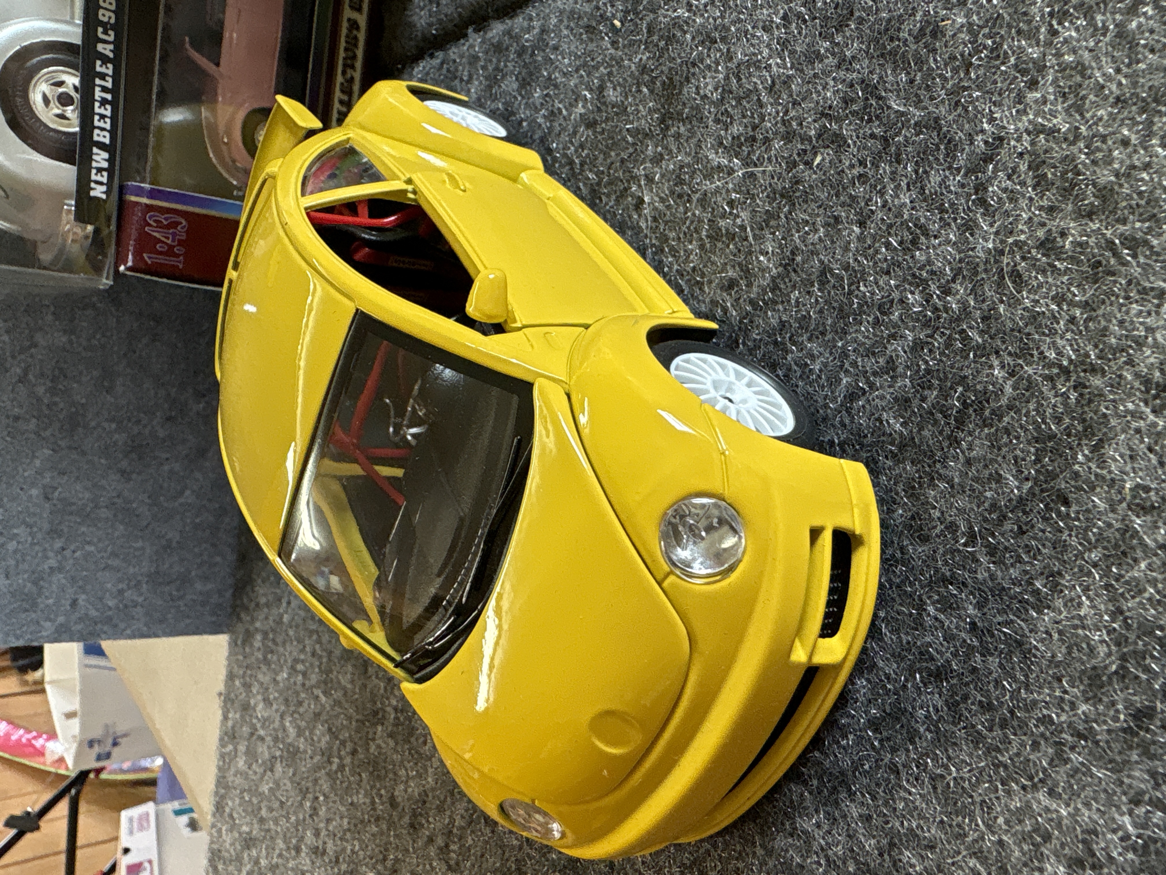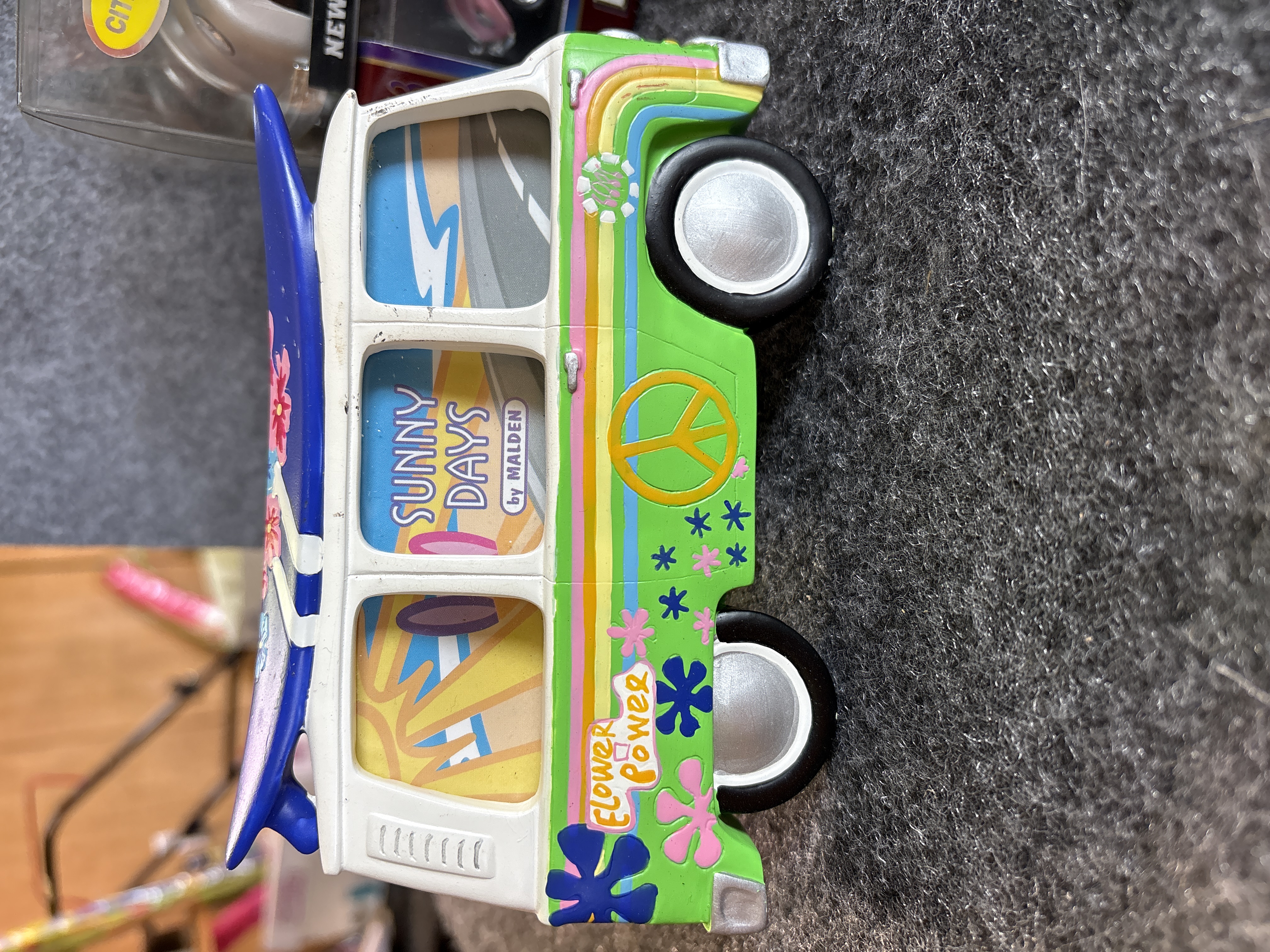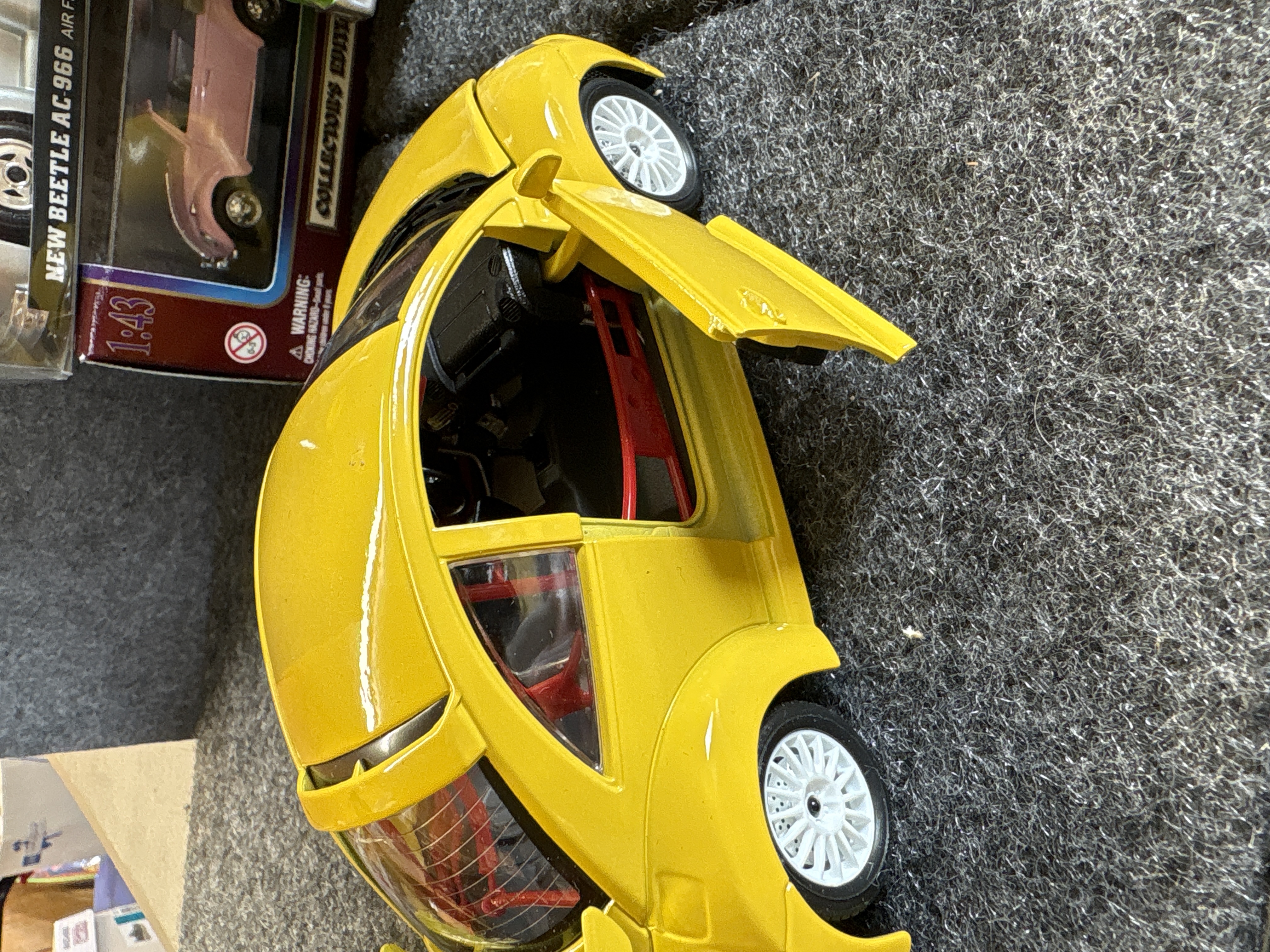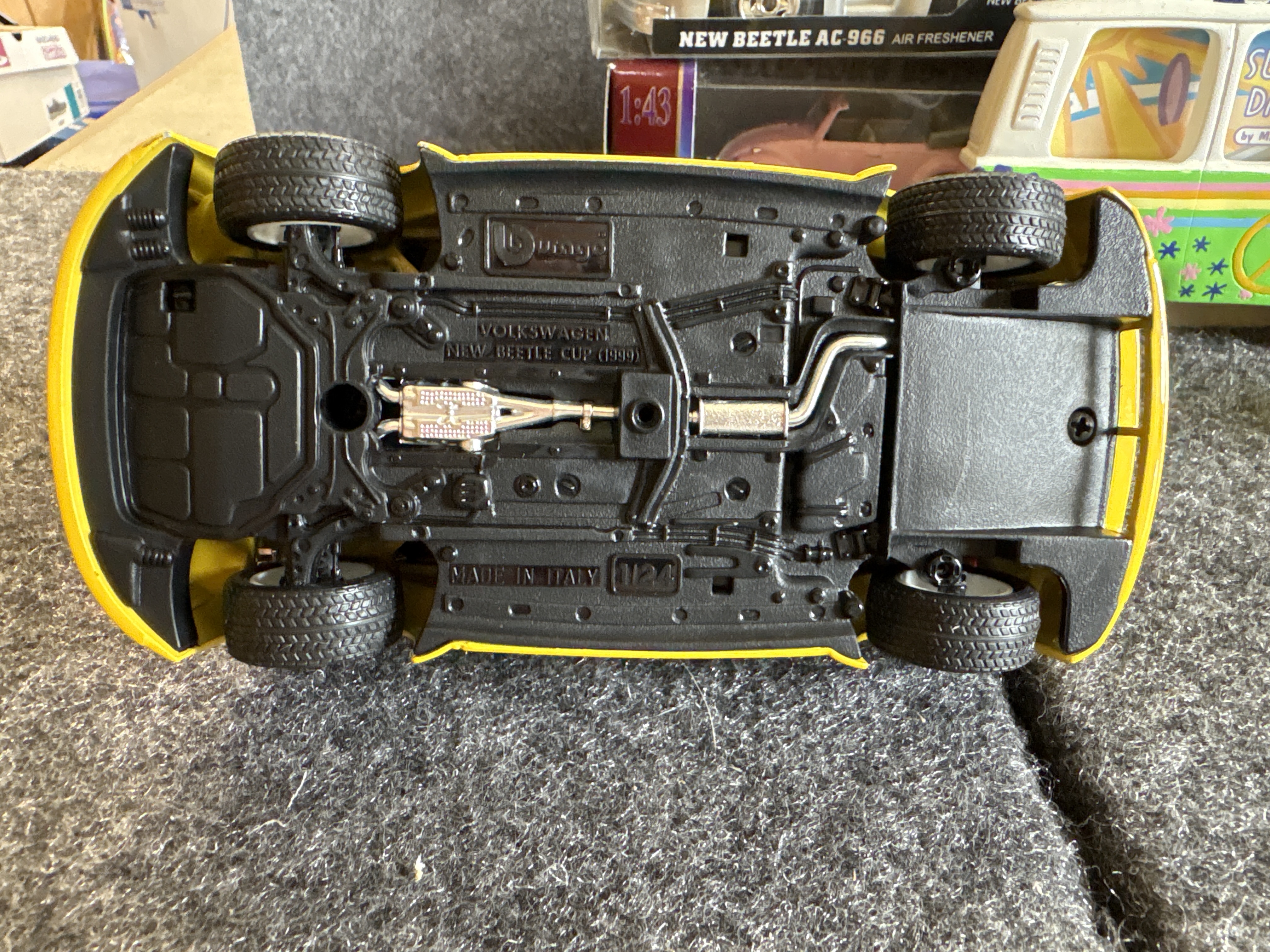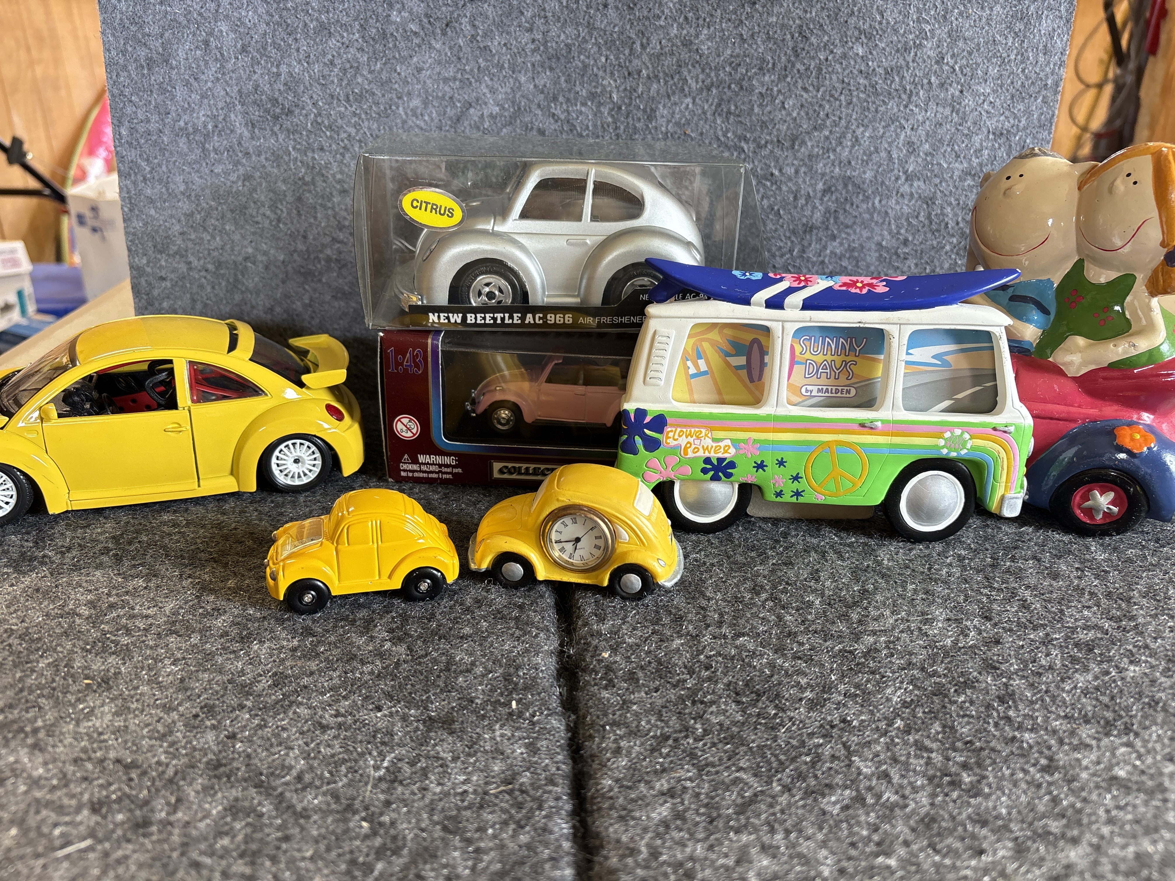 A collection of various Volkswagen themed models and decorative objects. The group includes a Bburago 1/24 scale die-cast model of a yellow 1999 New Beetle Cup racer featuring opening doors and a red roll cage, marked Made in Italy. Also included is a Road Legends by Yat Ming 1/43 scale die-cast model of a pink 1967 Volkswagen Beetle convertible in its original window box. Decorative items comprise a Westland Giftware painted resin desk clock shaped like a yellow Beetle, marked item number 5156 and dated 2000; a Malden Sunny Days painted resin surf van with hippie-themed floral and peace sign graphics; and a painted resin coin bank depicting two figures in a red convertible with floral accents. The set is completed by a silver-tone New Beetle AC-966 citrus air freshener in original packaging and a small yellow Beetle figurine. Materials include die-cast metal, plastic, resin, and ceramic.