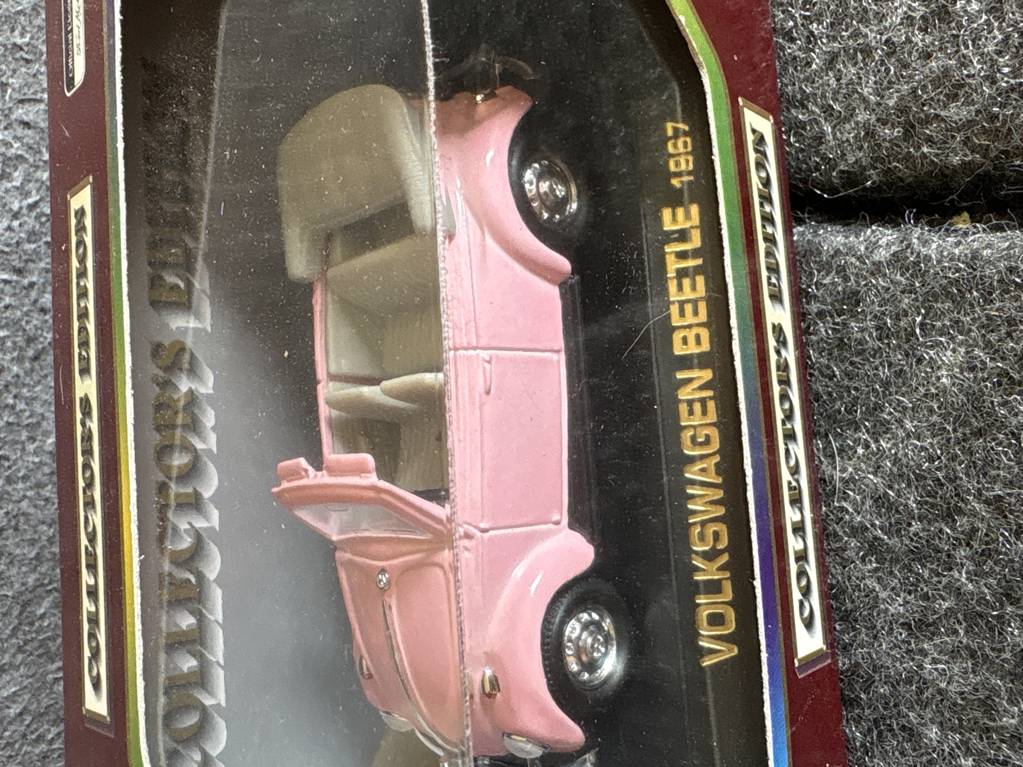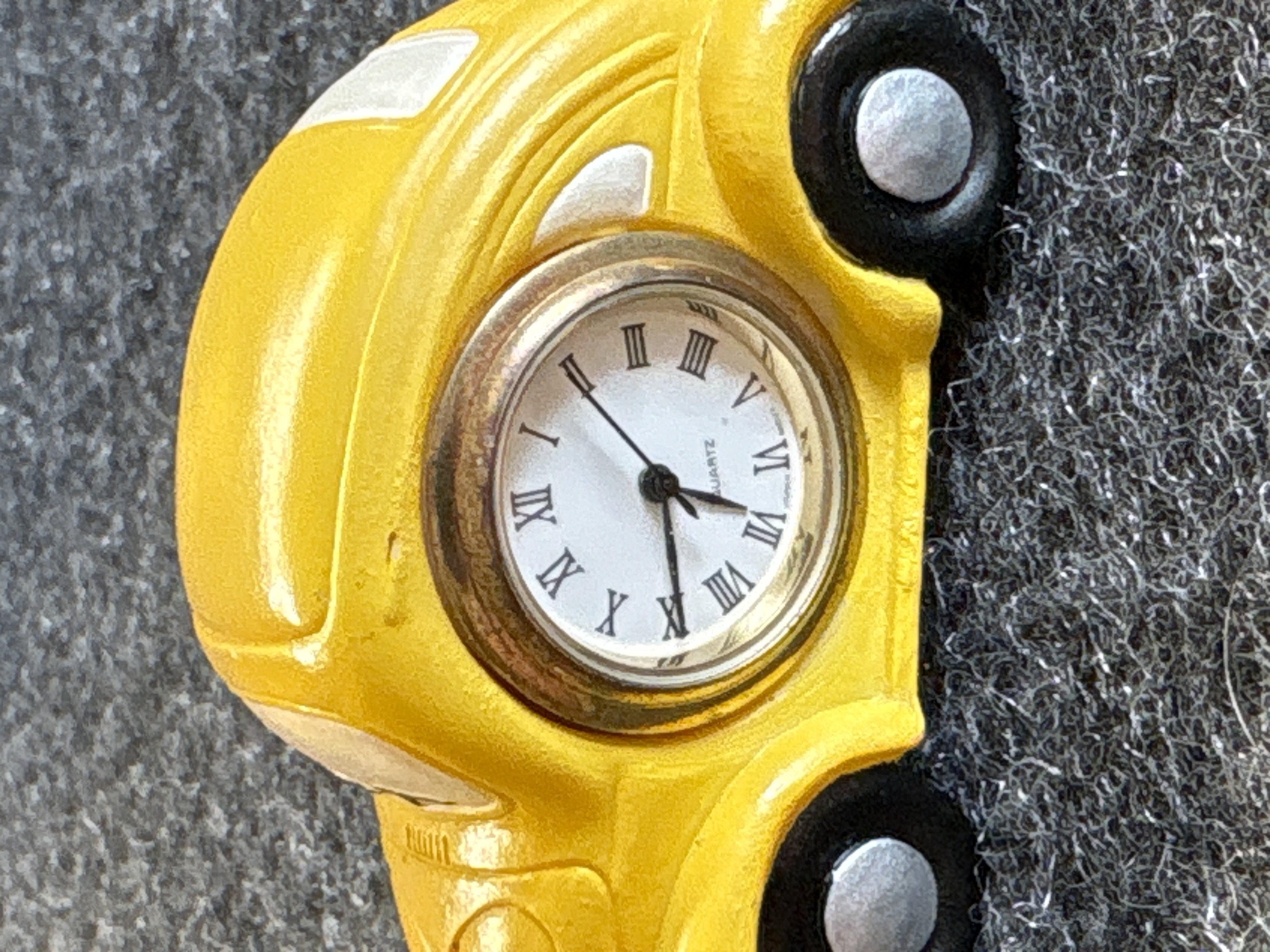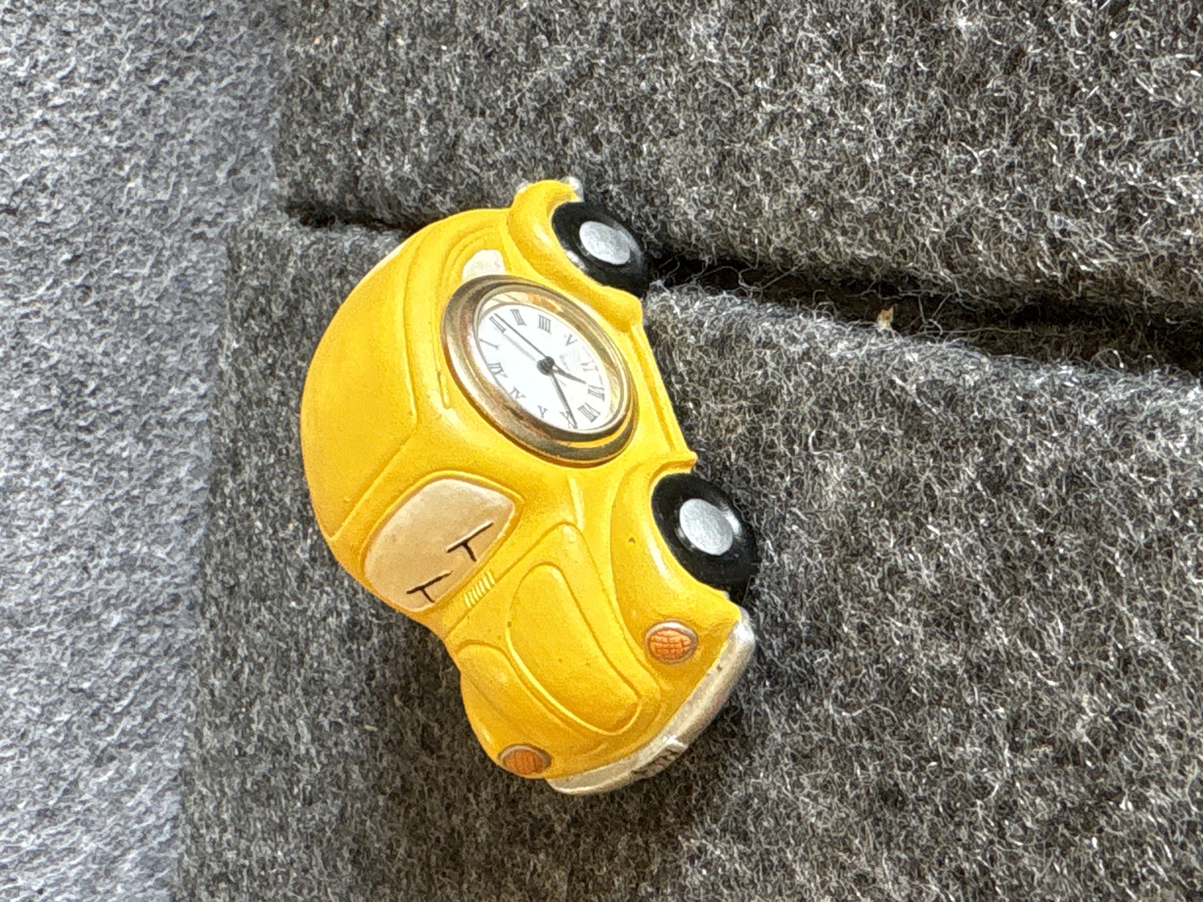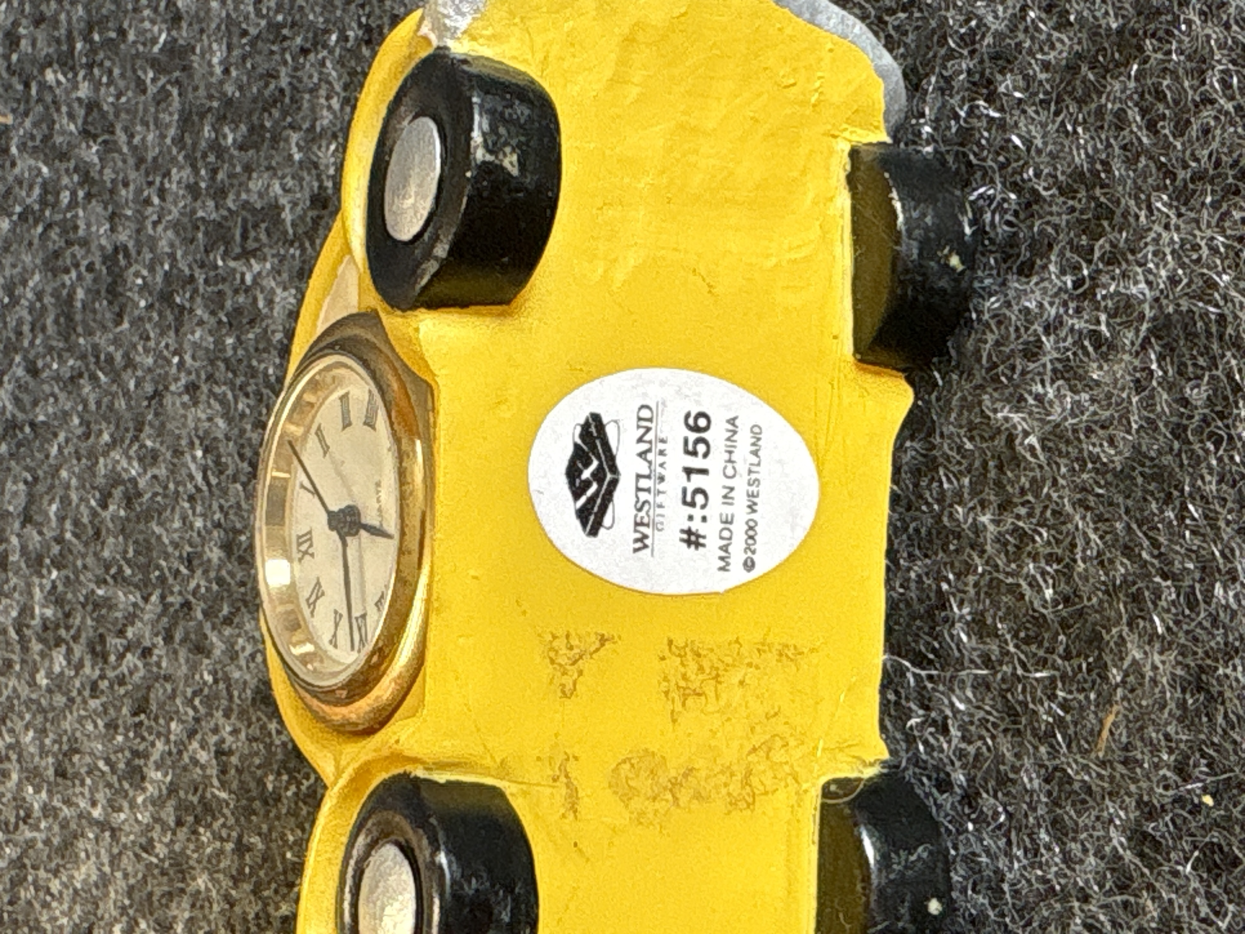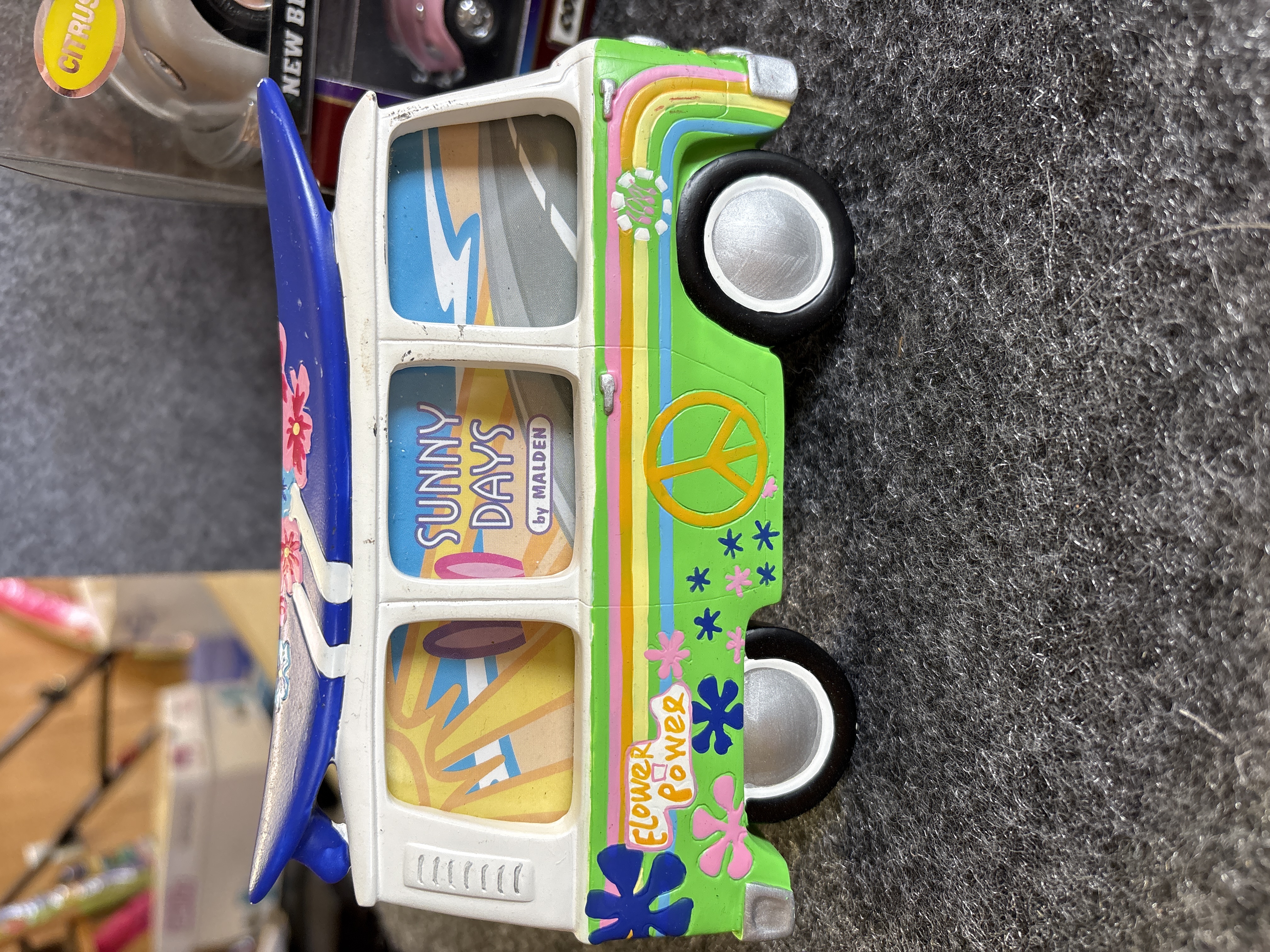 A collection of various Volkswagen themed models and decorative objects. The group includes a Bburago 1/24 scale die-cast model of a yellow 1999 New Beetle Cup racer featuring opening doors and a red roll cage, marked Made in Italy. Also included is a Road Legends by Yat Ming 1/43 scale die-cast model of a pink 1967 Volkswagen Beetle convertible in its original window box. Decorative items comprise a Westland Giftware painted resin desk clock shaped like a yellow Beetle, marked item number 5156 and dated 2000; a Malden Sunny Days painted resin surf van with hippie-themed floral and peace sign graphics; and a painted resin coin bank depicting two figures in a red convertible with floral accents. The set is completed by a silver-tone New Beetle AC-966 citrus air freshener in original packaging and a small yellow Beetle figurine. Materials include die-cast metal, plastic, resin, and ceramic.