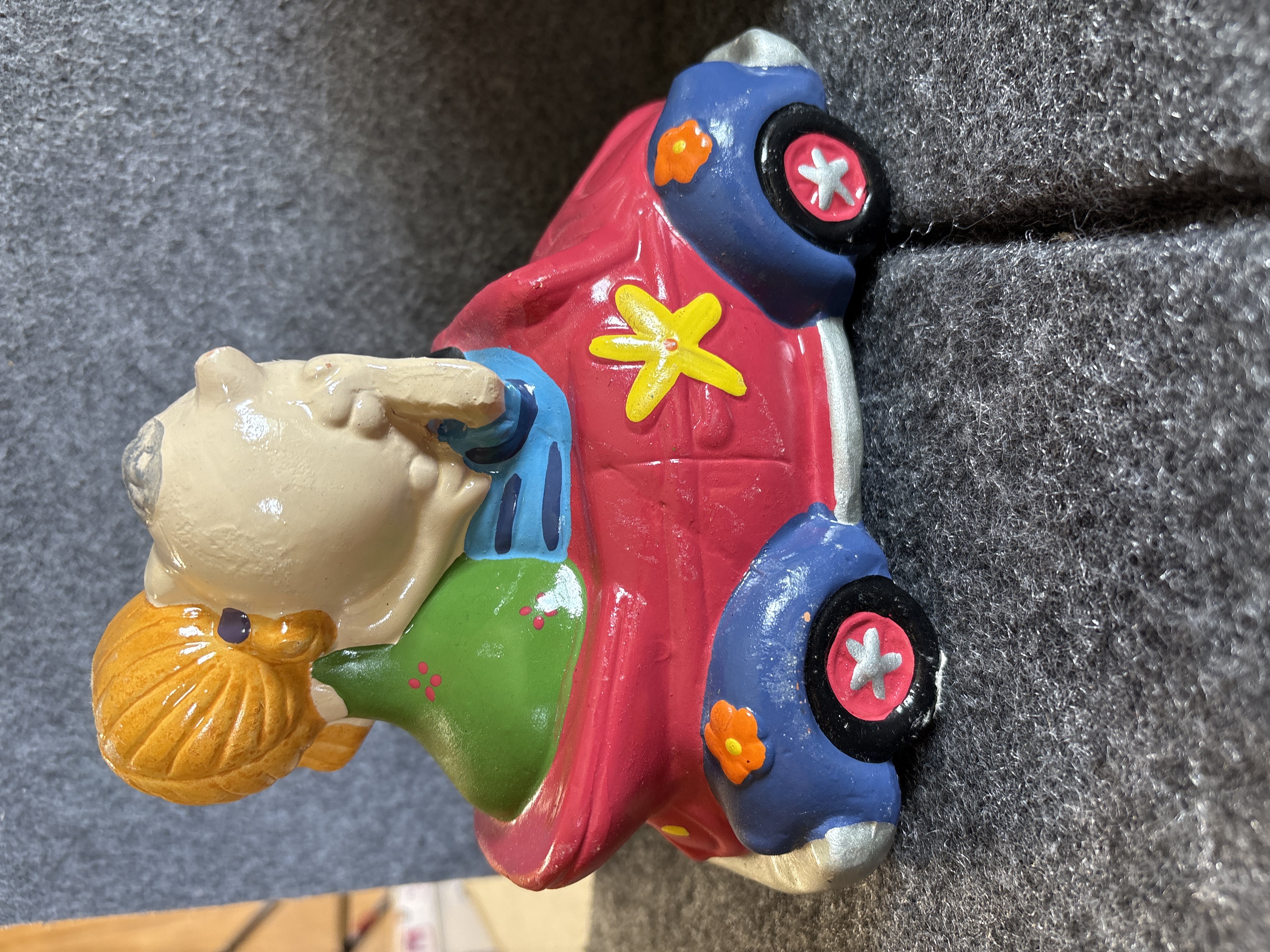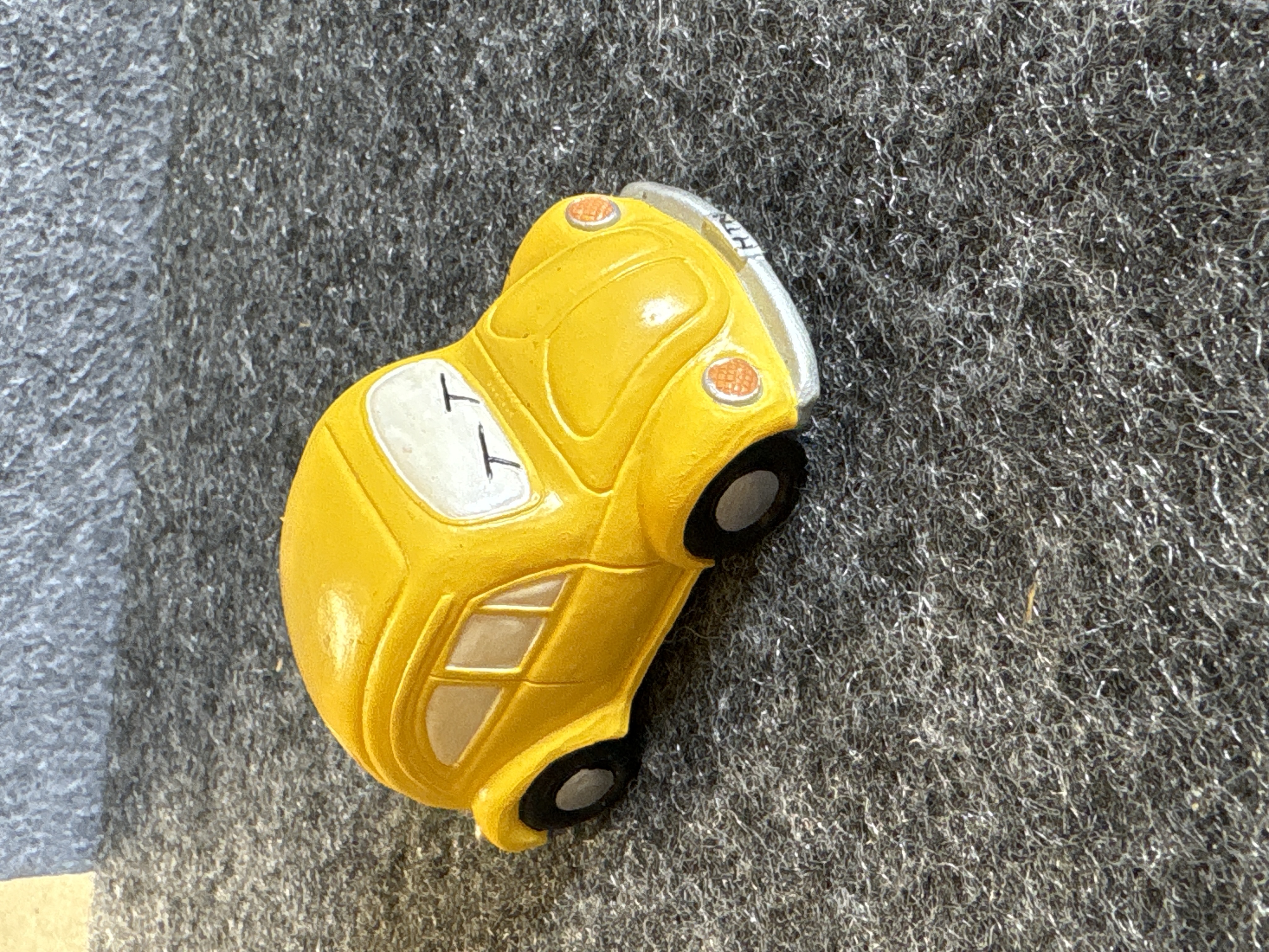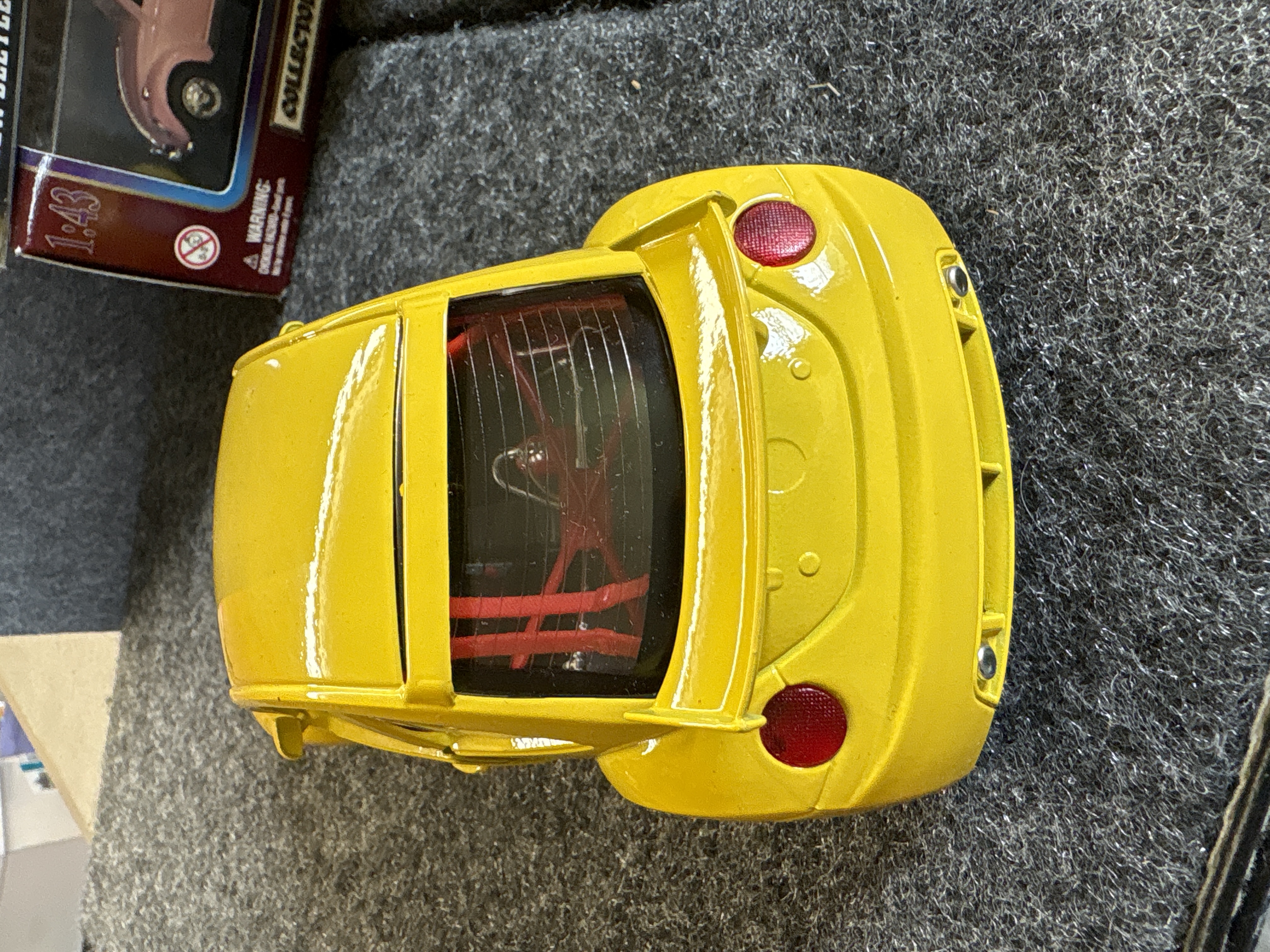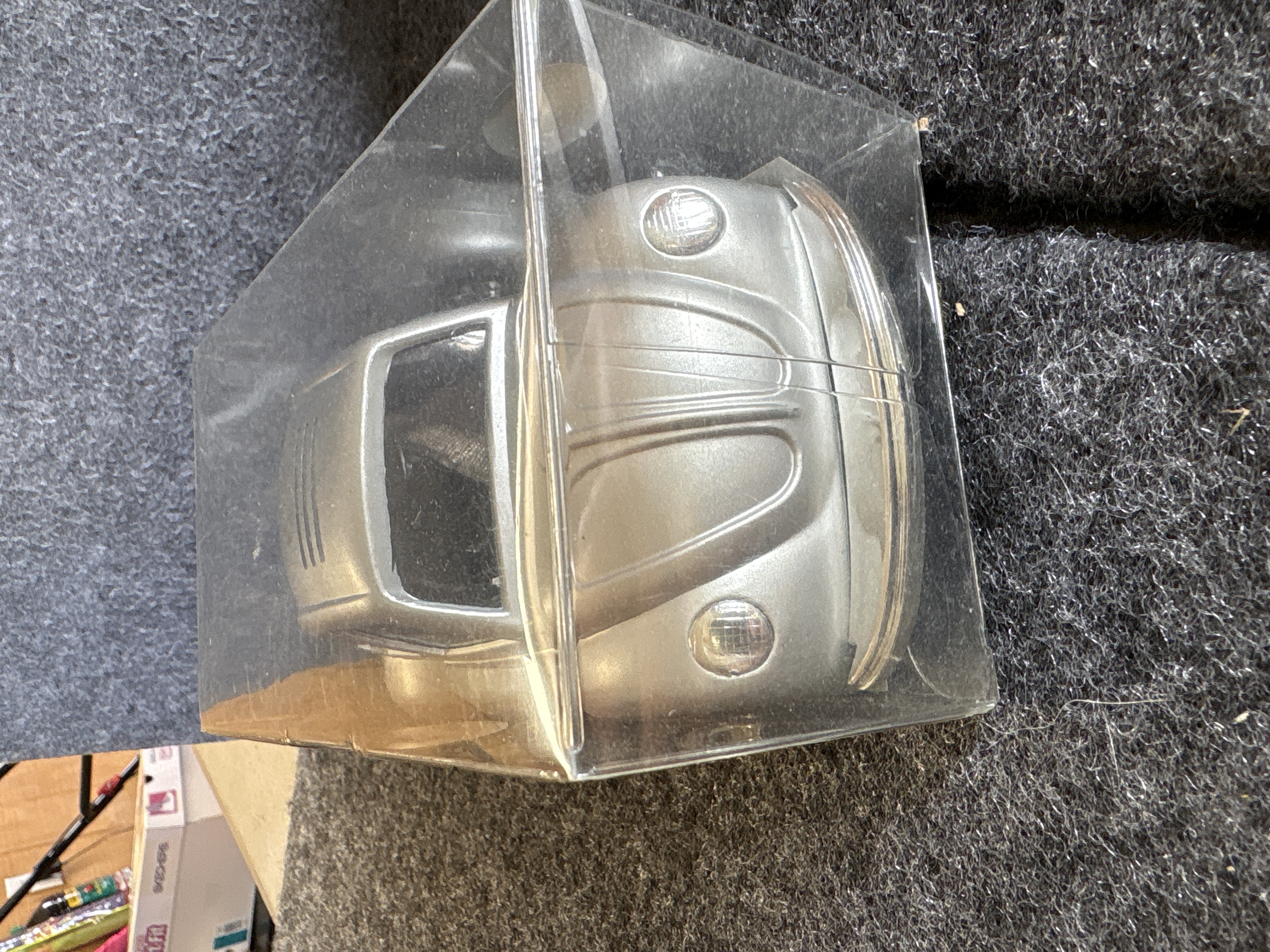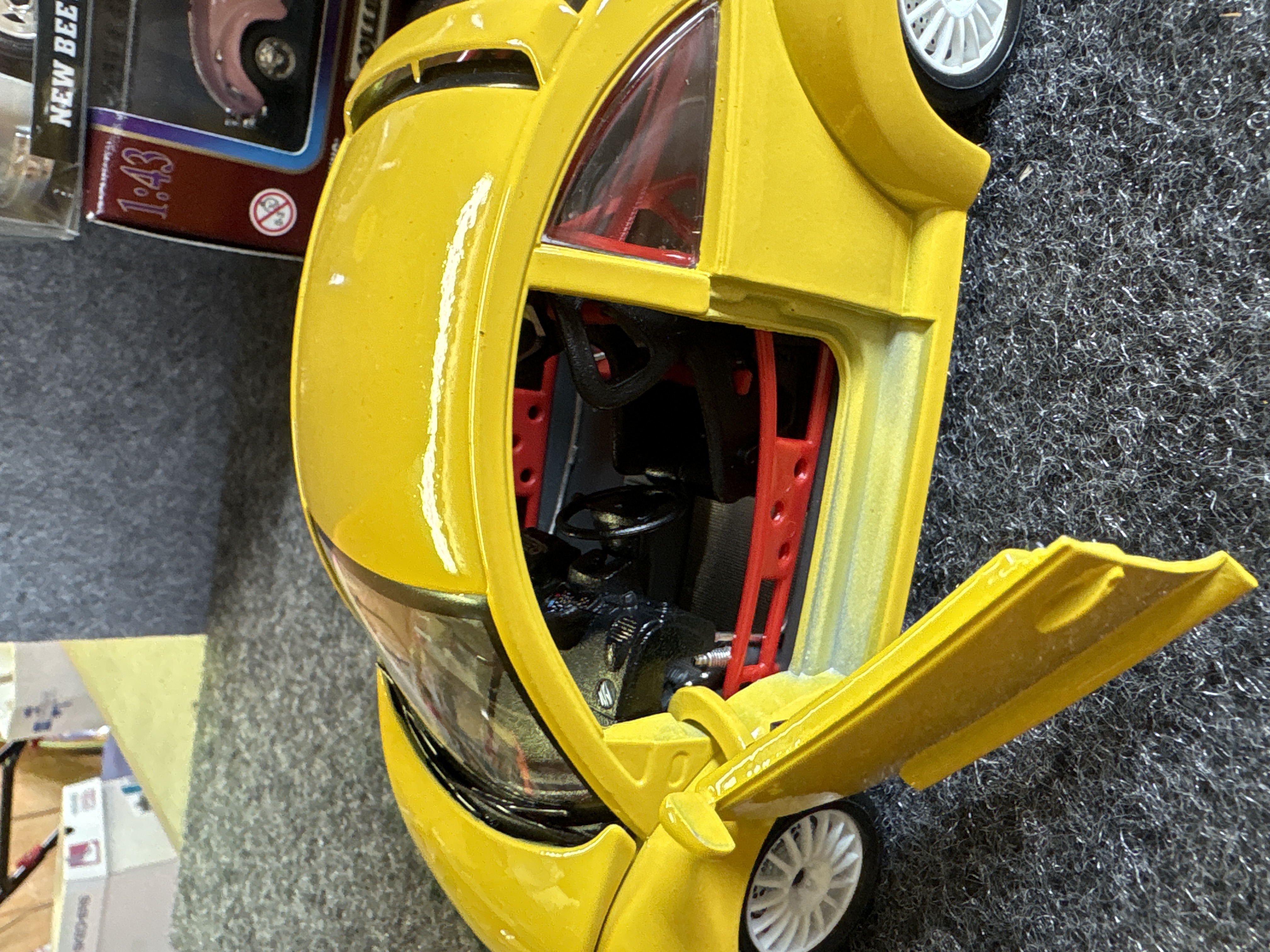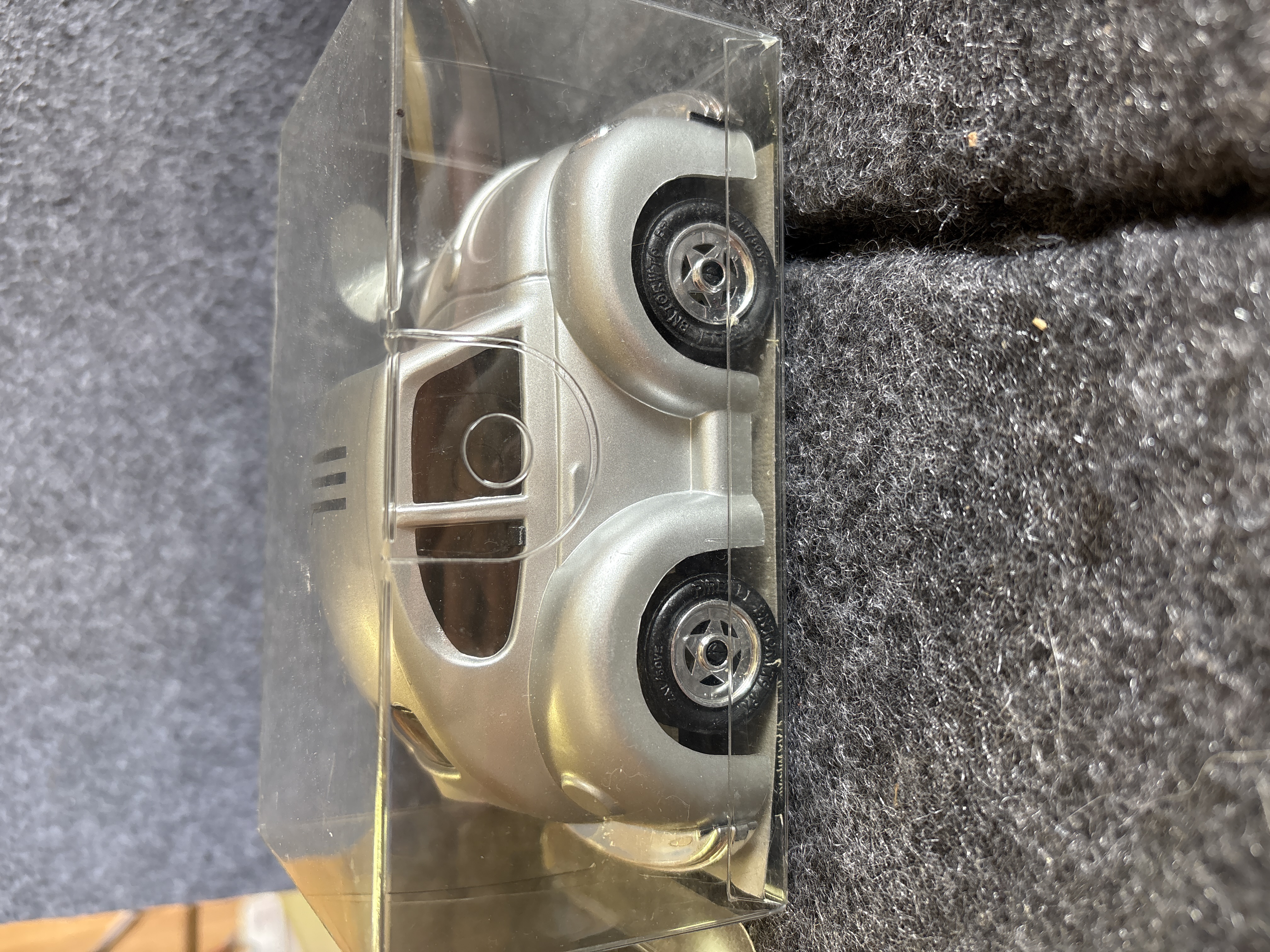 A collection of various Volkswagen themed models and decorative objects. The group includes a Bburago 1/24 scale die-cast model of a yellow 1999 New Beetle Cup racer featuring opening doors and a red roll cage, marked Made in Italy. Also included is a Road Legends by Yat Ming 1/43 scale die-cast model of a pink 1967 Volkswagen Beetle convertible in its original window box. Decorative items comprise a Westland Giftware painted resin desk clock shaped like a yellow Beetle, marked item number 5156 and dated 2000; a Malden Sunny Days painted resin surf van with hippie-themed floral and peace sign graphics; and a painted resin coin bank depicting two figures in a red convertible with floral accents. The set is completed by a silver-tone New Beetle AC-966 citrus air freshener in original packaging and a small yellow Beetle figurine. Materials include die-cast metal, plastic, resin, and ceramic.