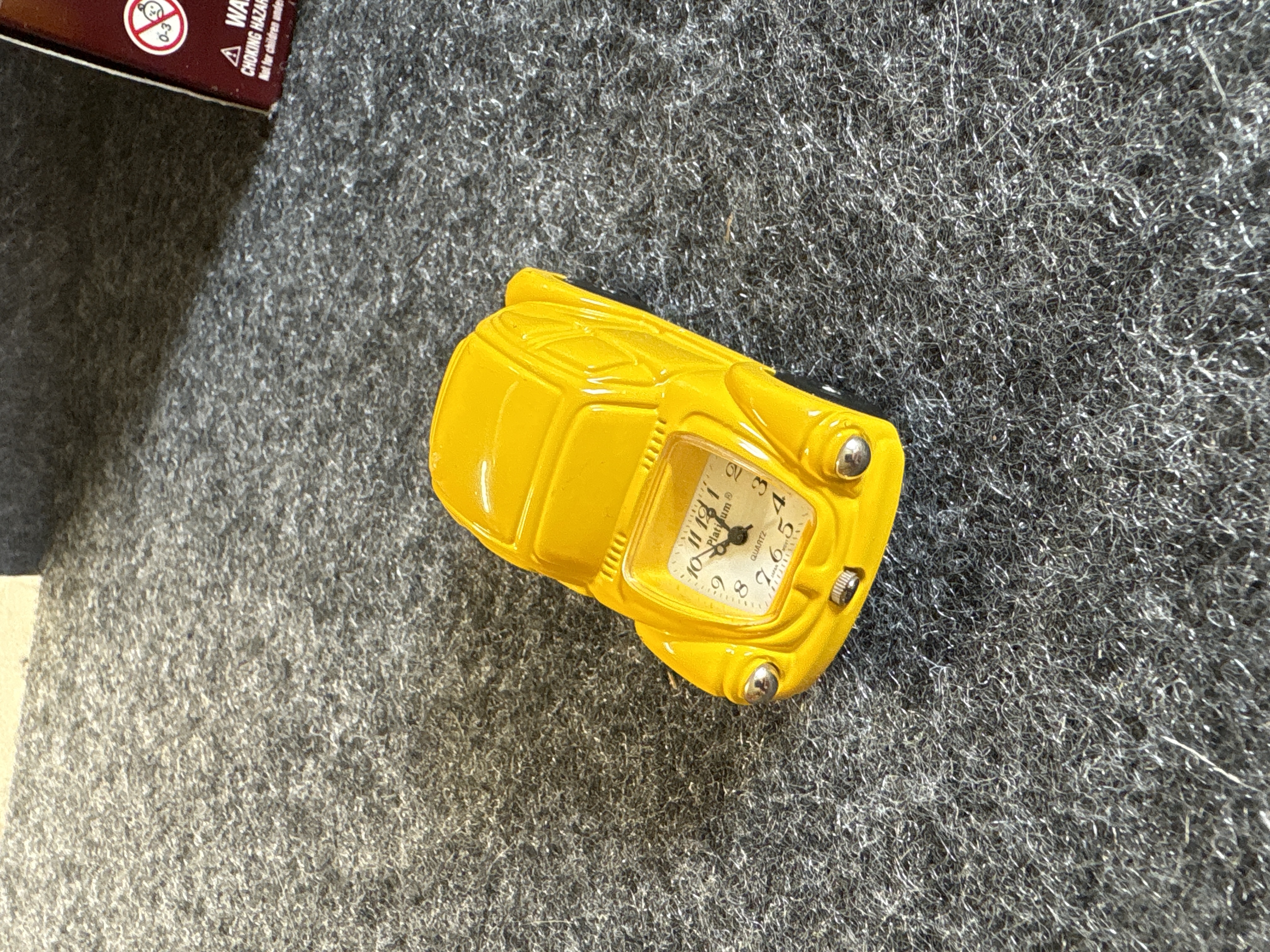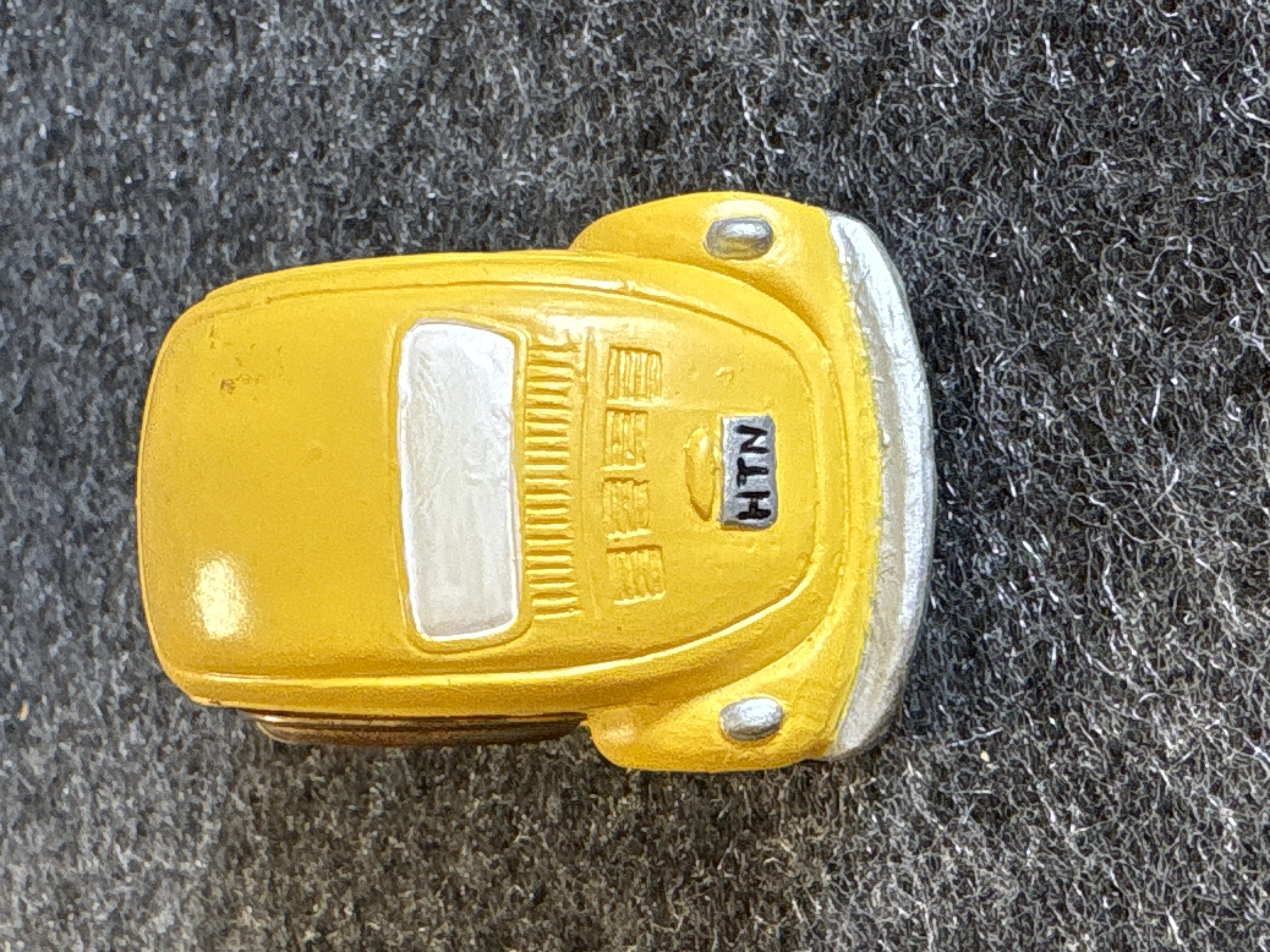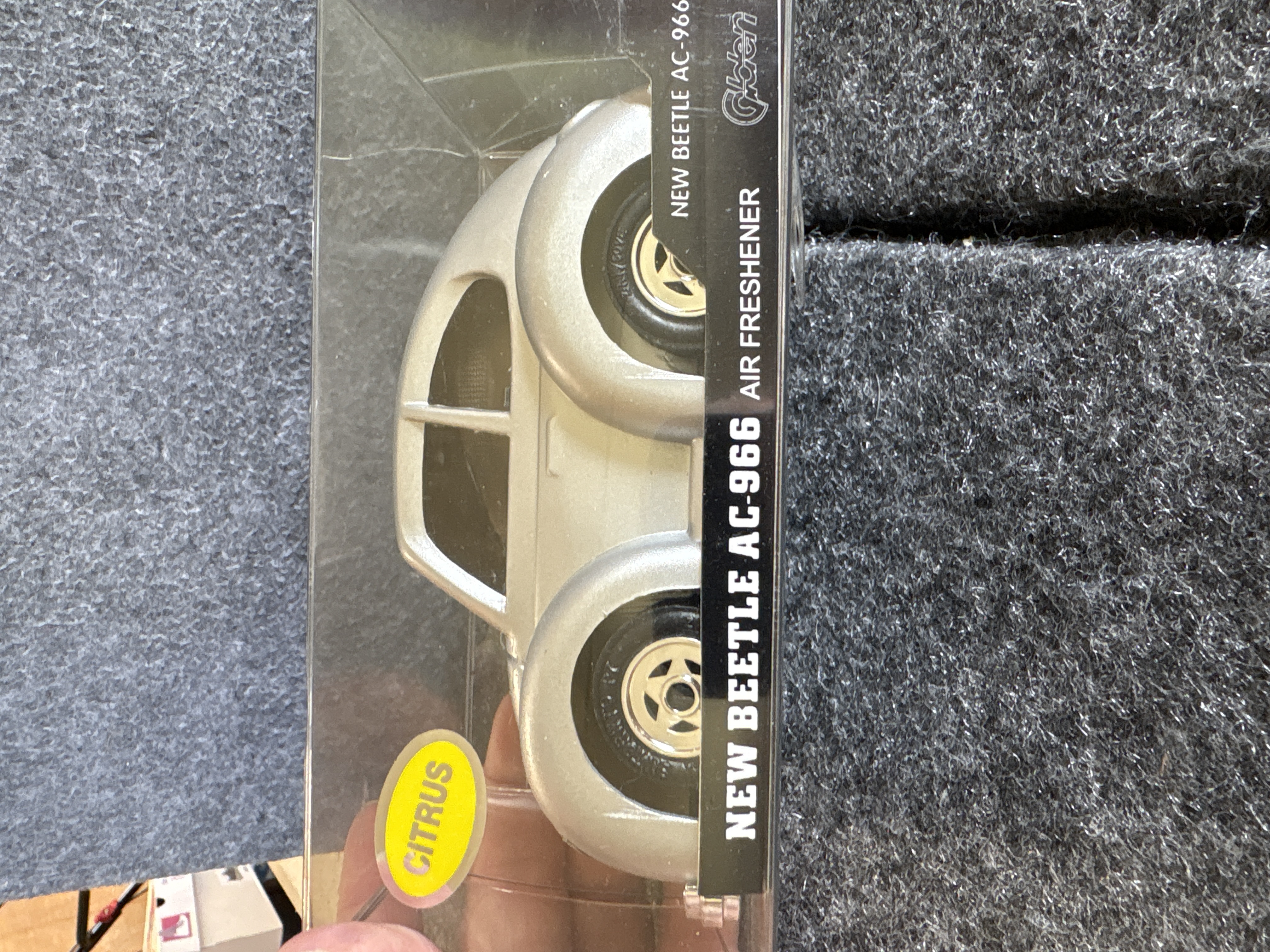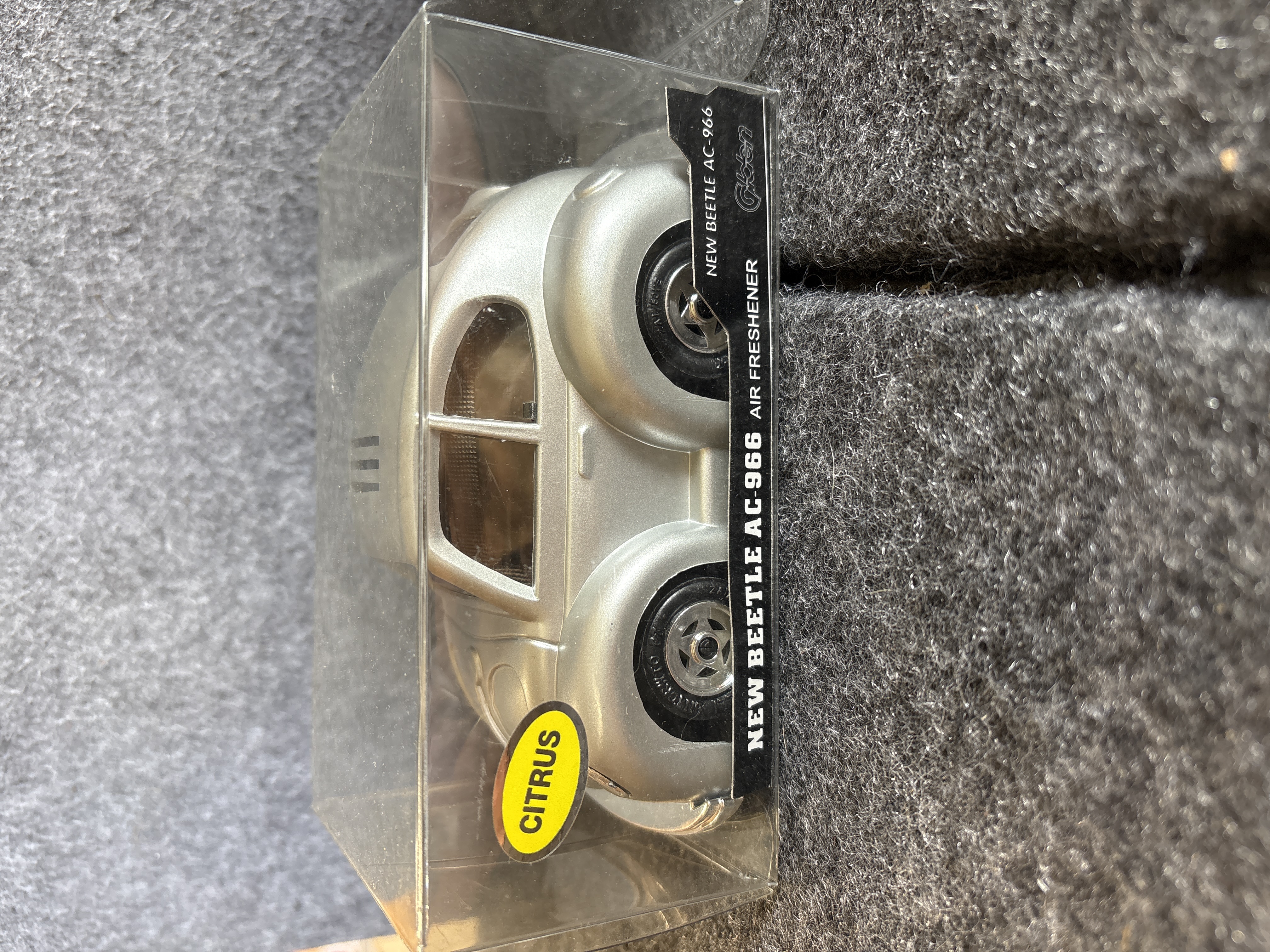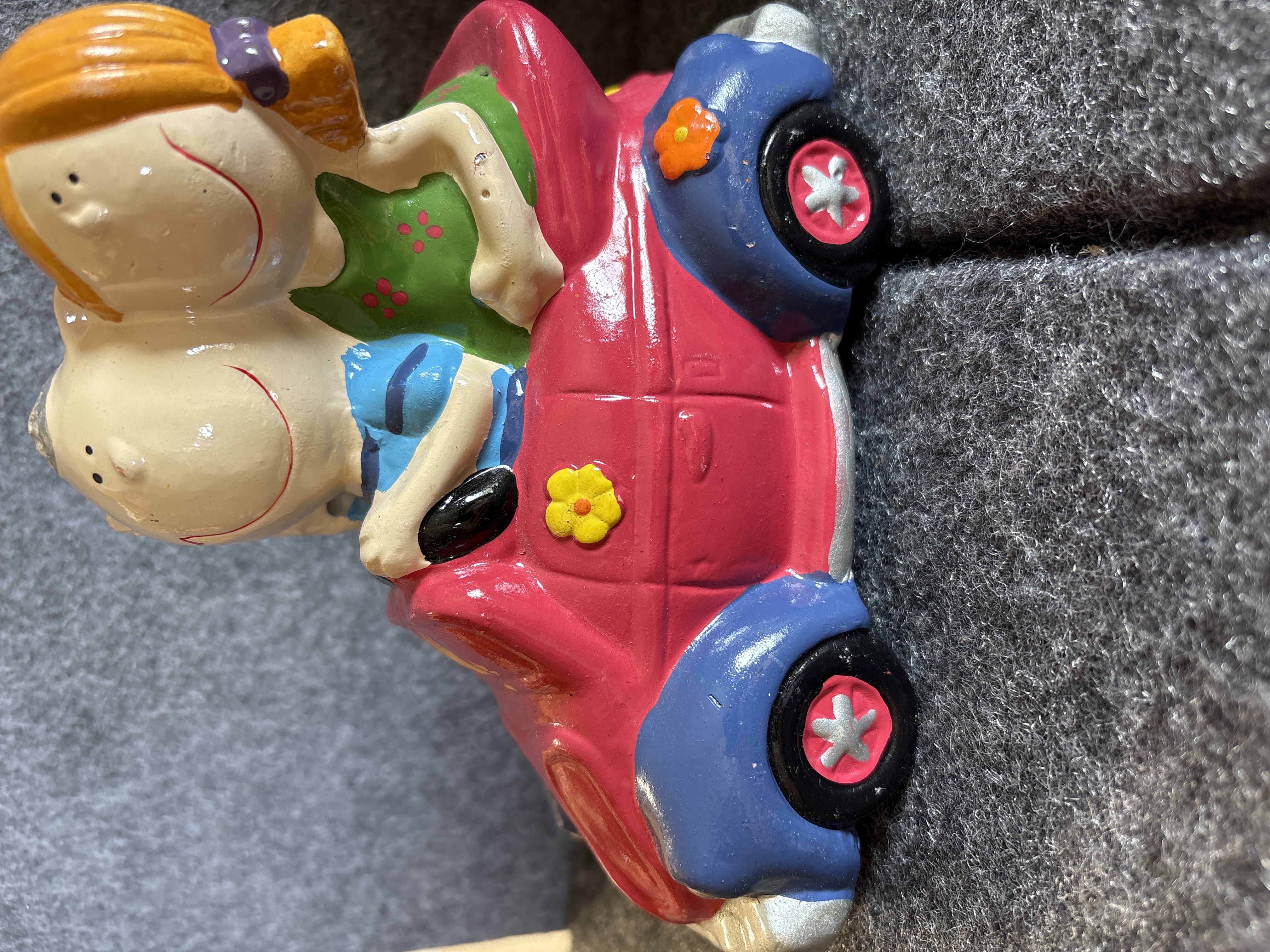 A collection of various Volkswagen themed models and decorative objects. The group includes a Bburago 1/24 scale die-cast model of a yellow 1999 New Beetle Cup racer featuring opening doors and a red roll cage, marked Made in Italy. Also included is a Road Legends by Yat Ming 1/43 scale die-cast model of a pink 1967 Volkswagen Beetle convertible in its original window box. Decorative items comprise a Westland Giftware painted resin desk clock shaped like a yellow Beetle, marked item number 5156 and dated 2000; a Malden Sunny Days painted resin surf van with hippie-themed floral and peace sign graphics; and a painted resin coin bank depicting two figures in a red convertible with floral accents. The set is completed by a silver-tone New Beetle AC-966 citrus air freshener in original packaging and a small yellow Beetle figurine. Materials include die-cast metal, plastic, resin, and ceramic.