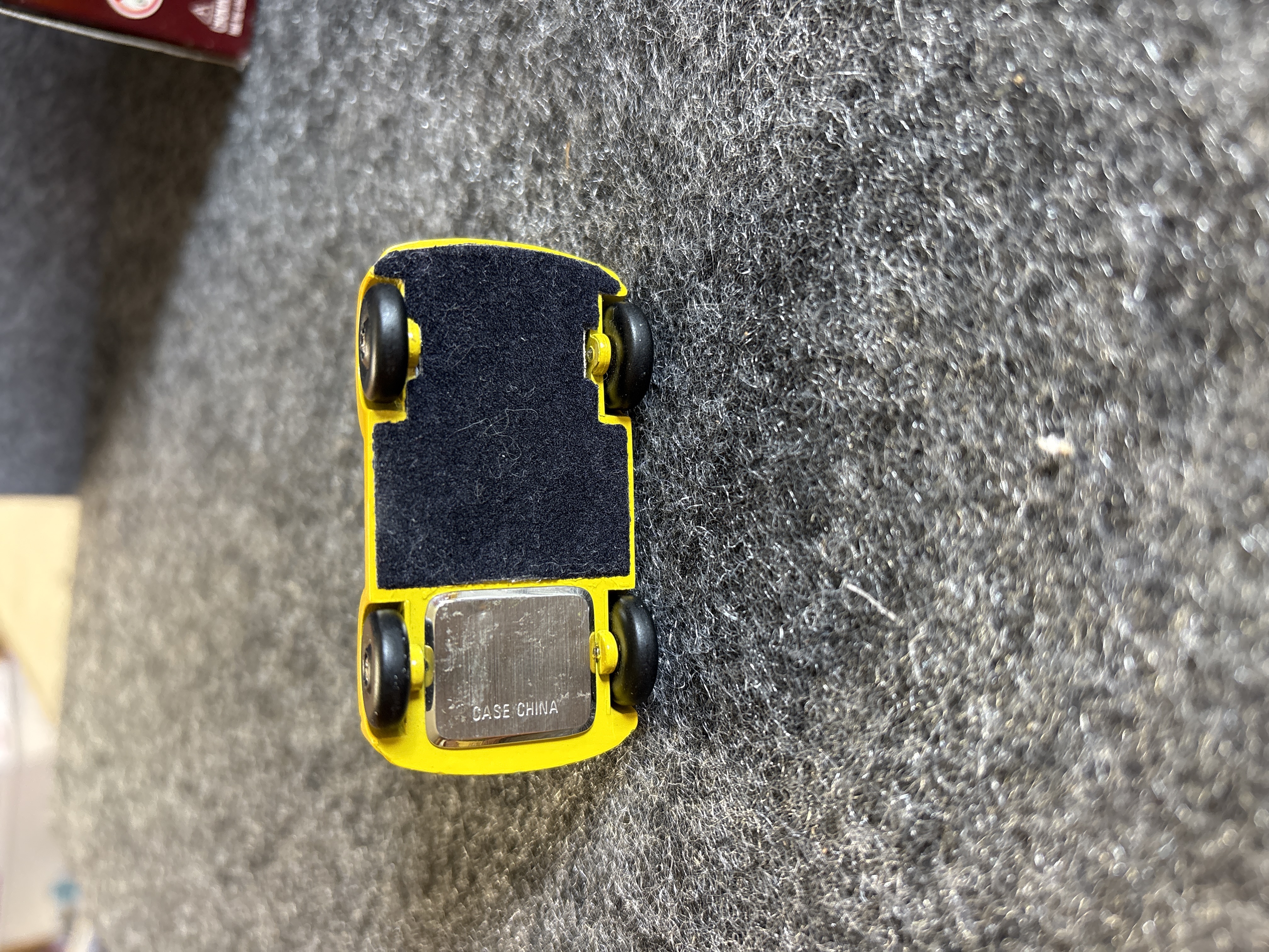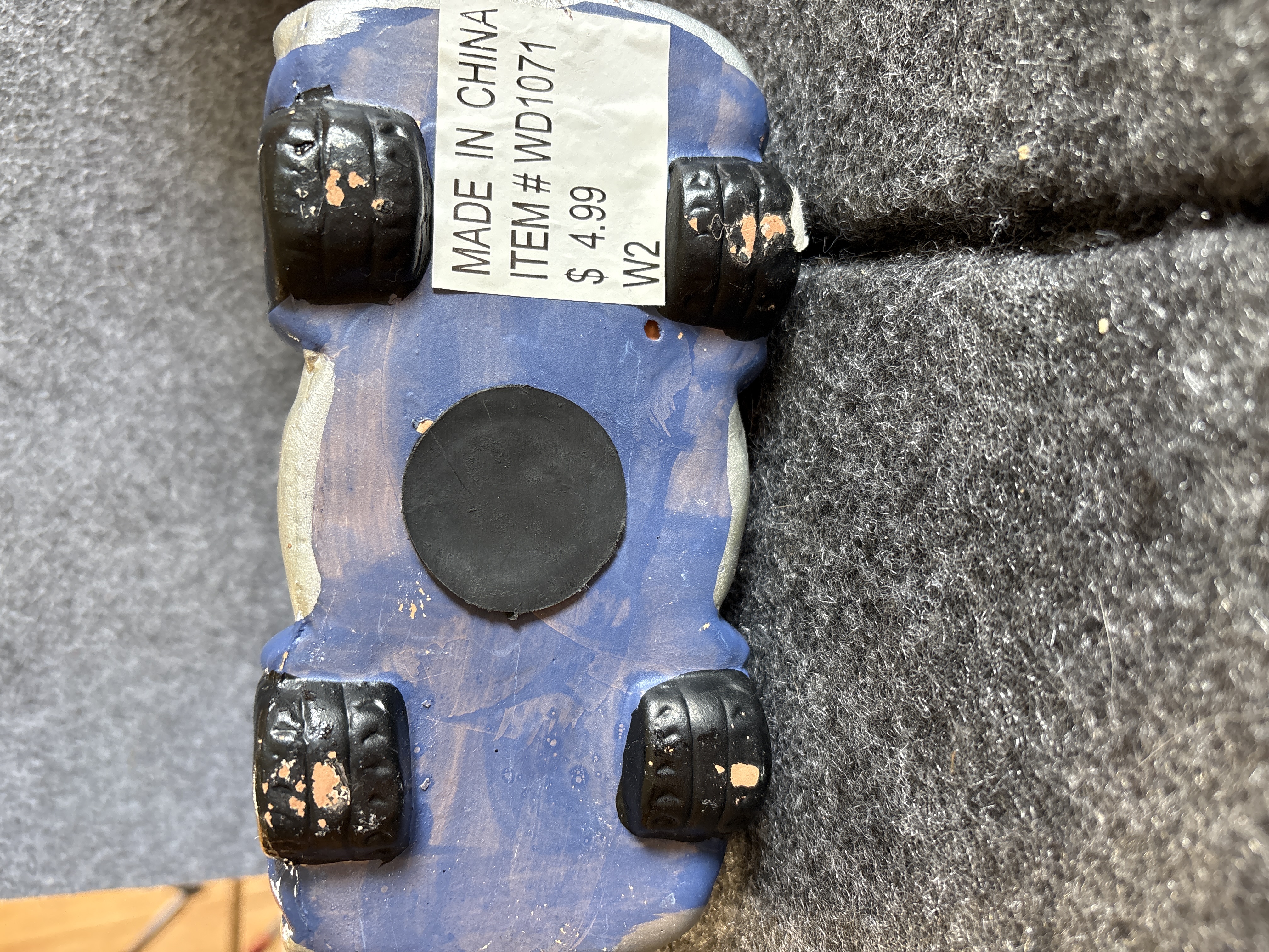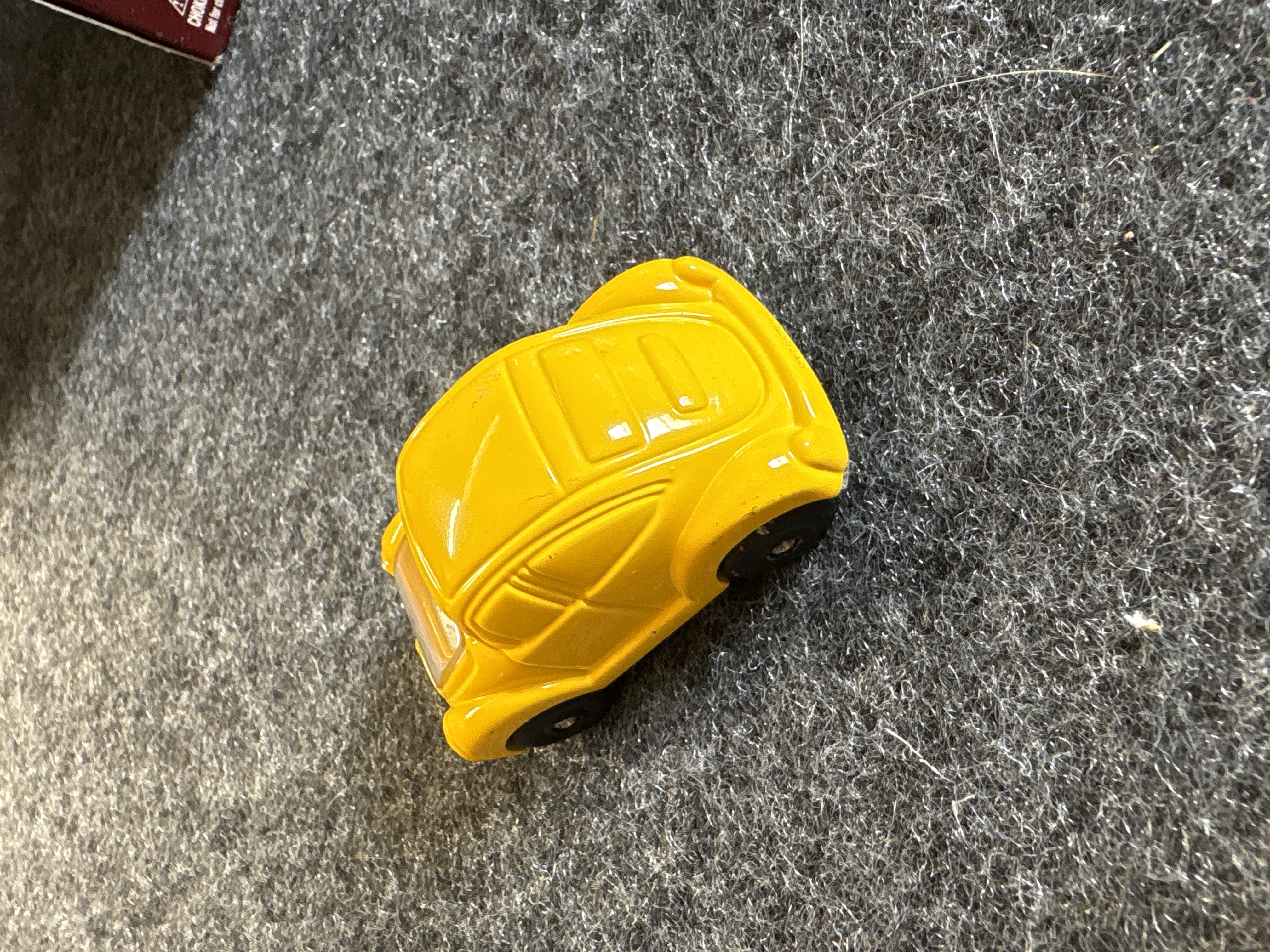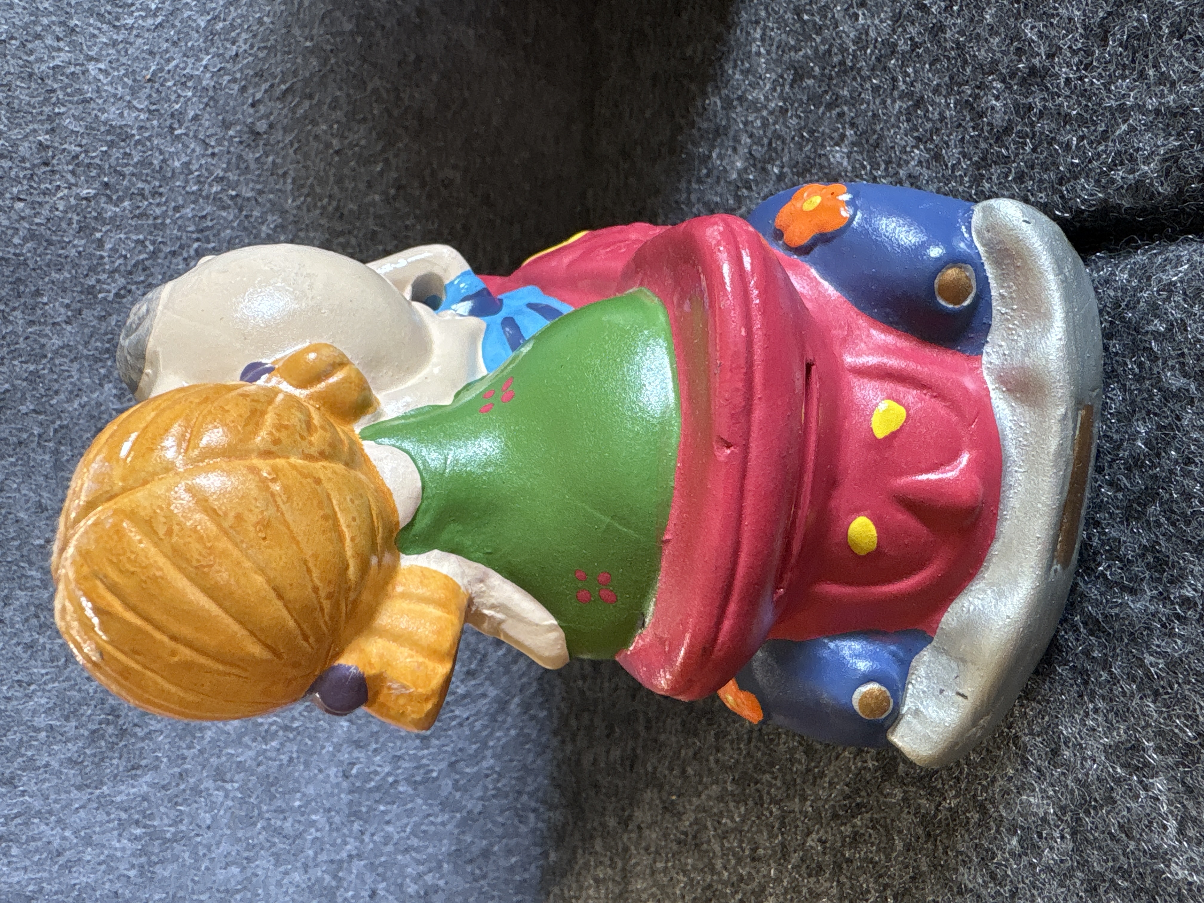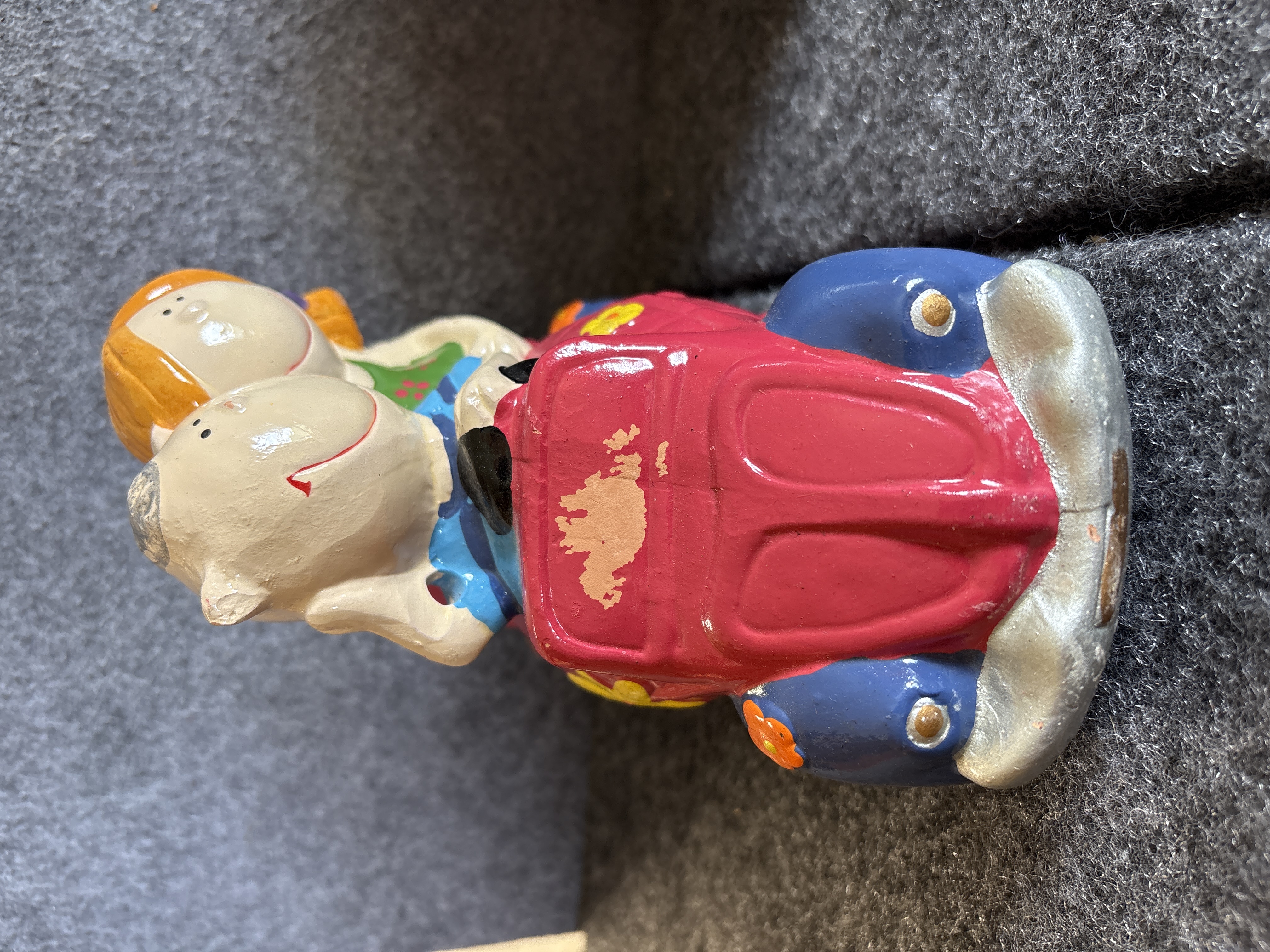 A collection of various Volkswagen themed models and decorative objects. The group includes a Bburago 1/24 scale die-cast model of a yellow 1999 New Beetle Cup racer featuring opening doors and a red roll cage, marked Made in Italy. Also included is a Road Legends by Yat Ming 1/43 scale die-cast model of a pink 1967 Volkswagen Beetle convertible in its original window box. Decorative items comprise a Westland Giftware painted resin desk clock shaped like a yellow Beetle, marked item number 5156 and dated 2000; a Malden Sunny Days painted resin surf van with hippie-themed floral and peace sign graphics; and a painted resin coin bank depicting two figures in a red convertible with floral accents. The set is completed by a silver-tone New Beetle AC-966 citrus air freshener in original packaging and a small yellow Beetle figurine. Materials include die-cast metal, plastic, resin, and ceramic.
