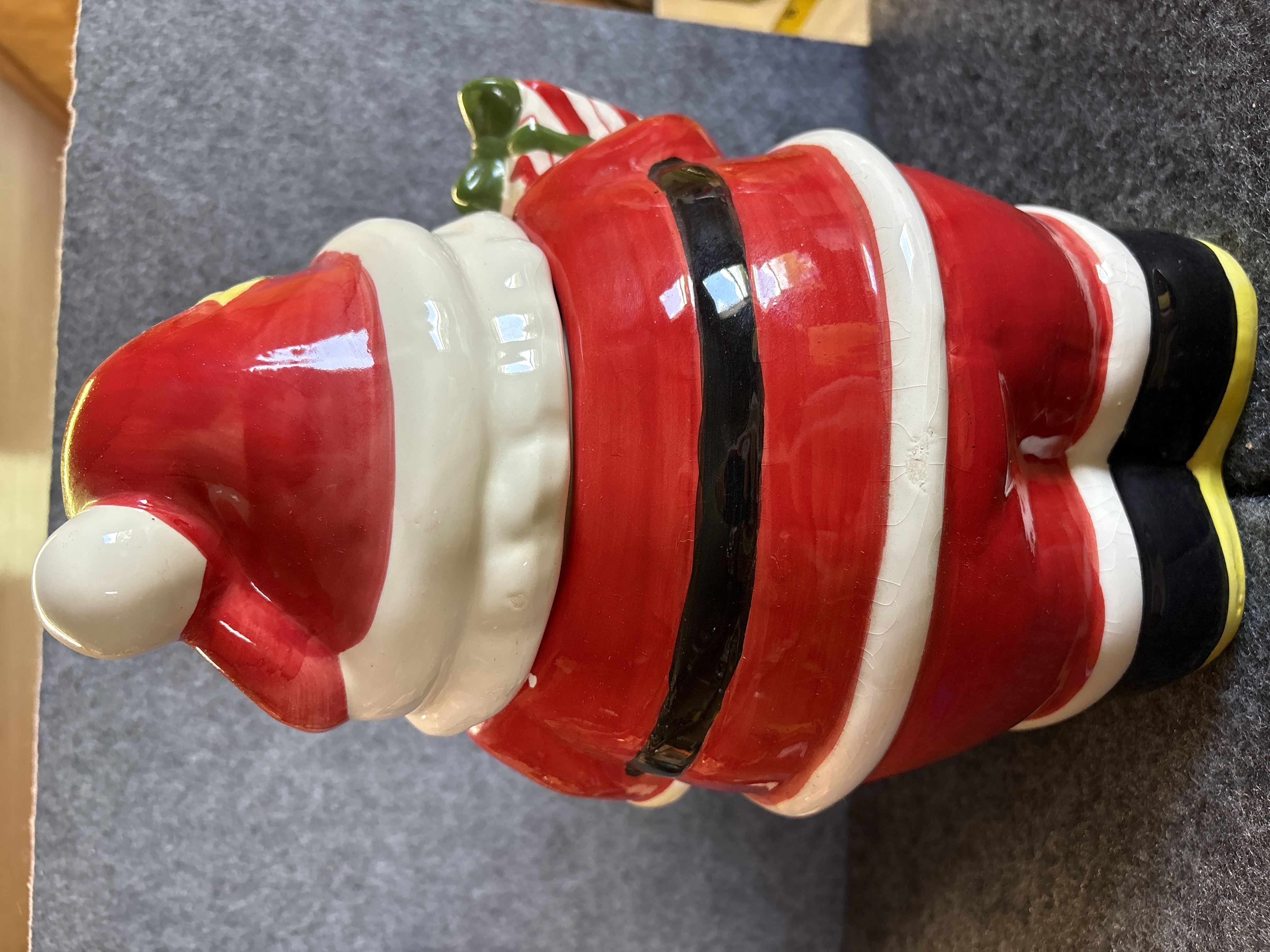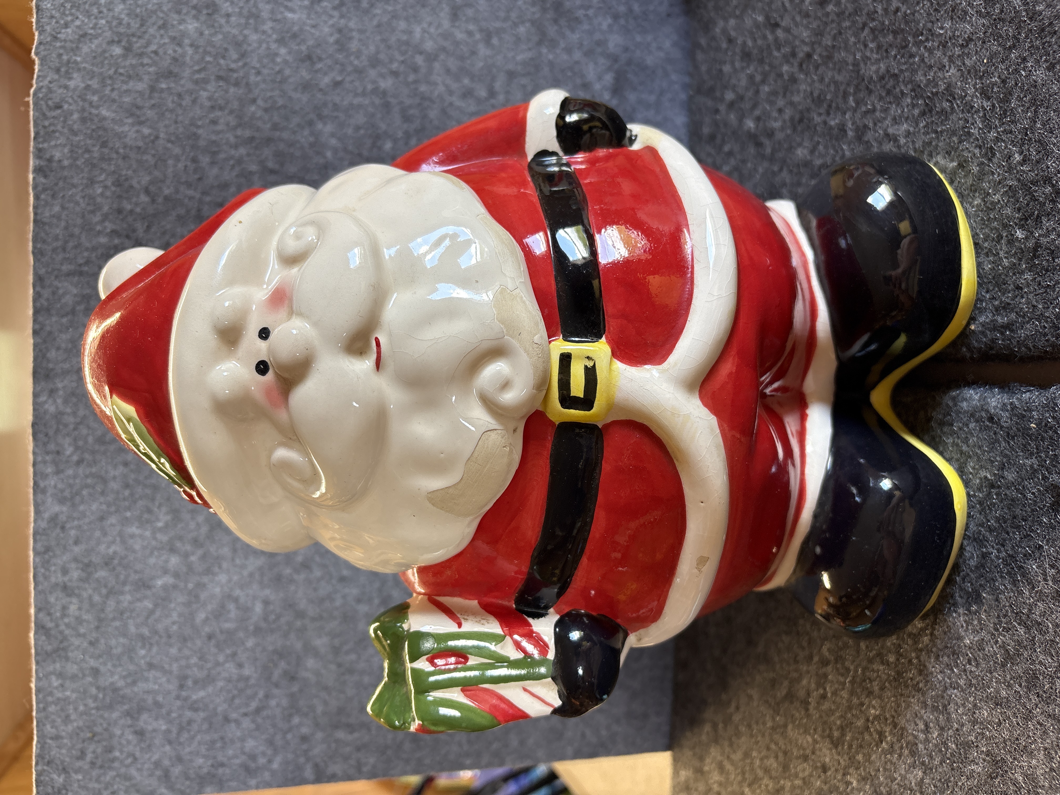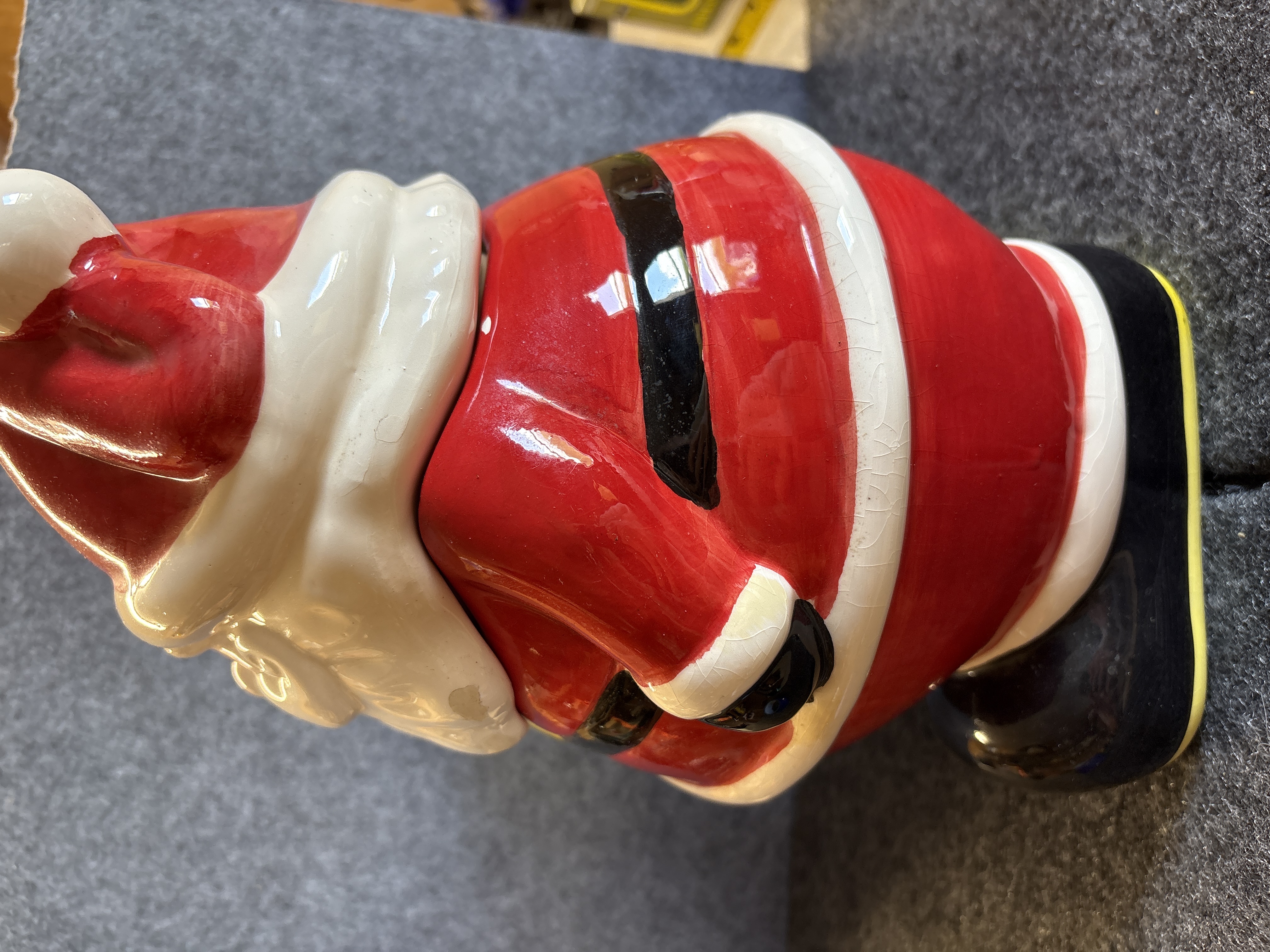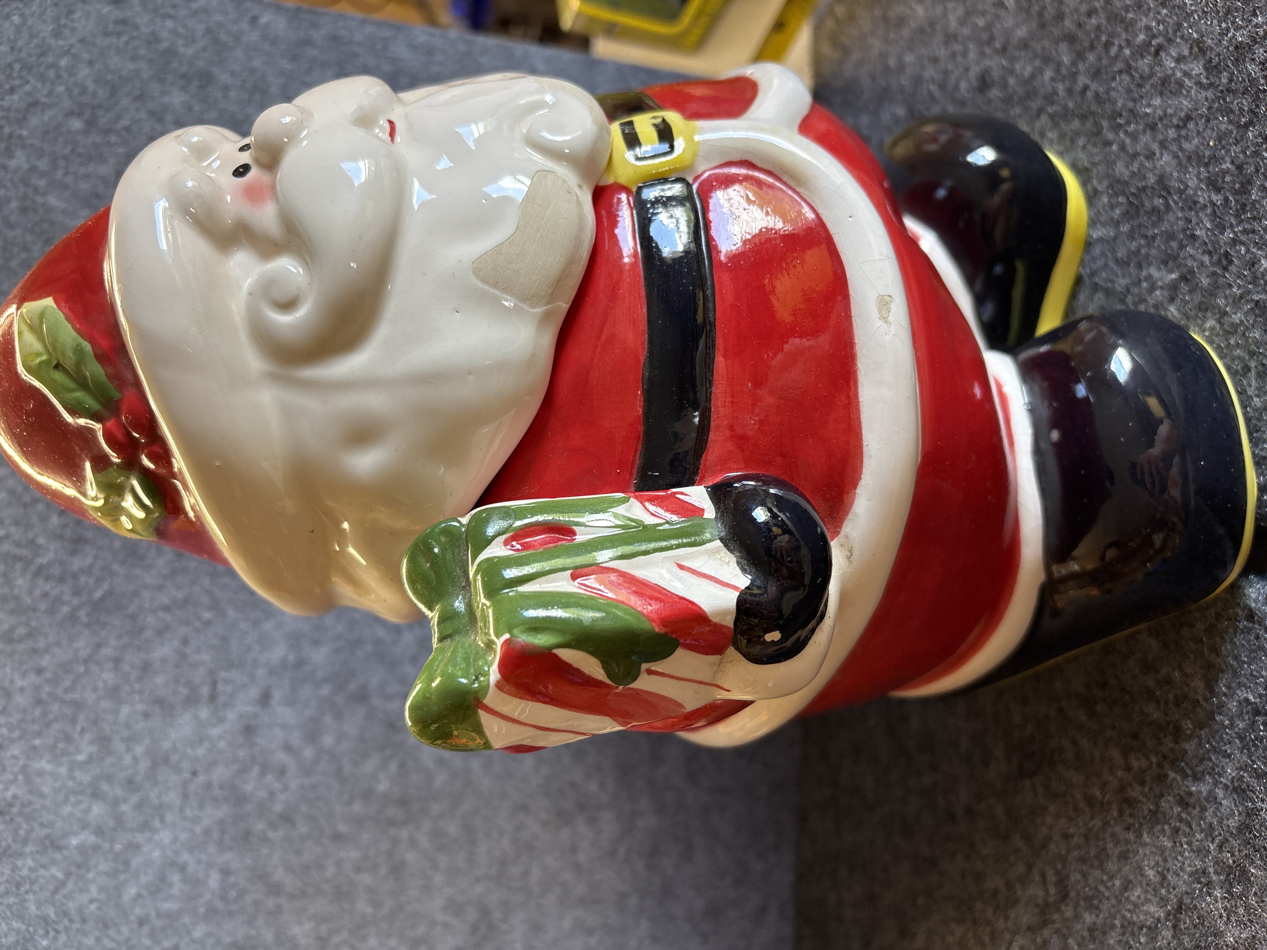 This glazed ceramic cookie jar is modeled in the form of a rotund Santa Claus and is attributed to Gibson. The two-piece jar features a lid formed by the head and shoulders, depicting the character in a traditional red suit with white trim, a black belt with a yellow buckle, and black boots with yellow soles. Santa is shown holding a collection of candy canes tied with a green bow. The piece features a high-gloss finish over polychrome decoration.
