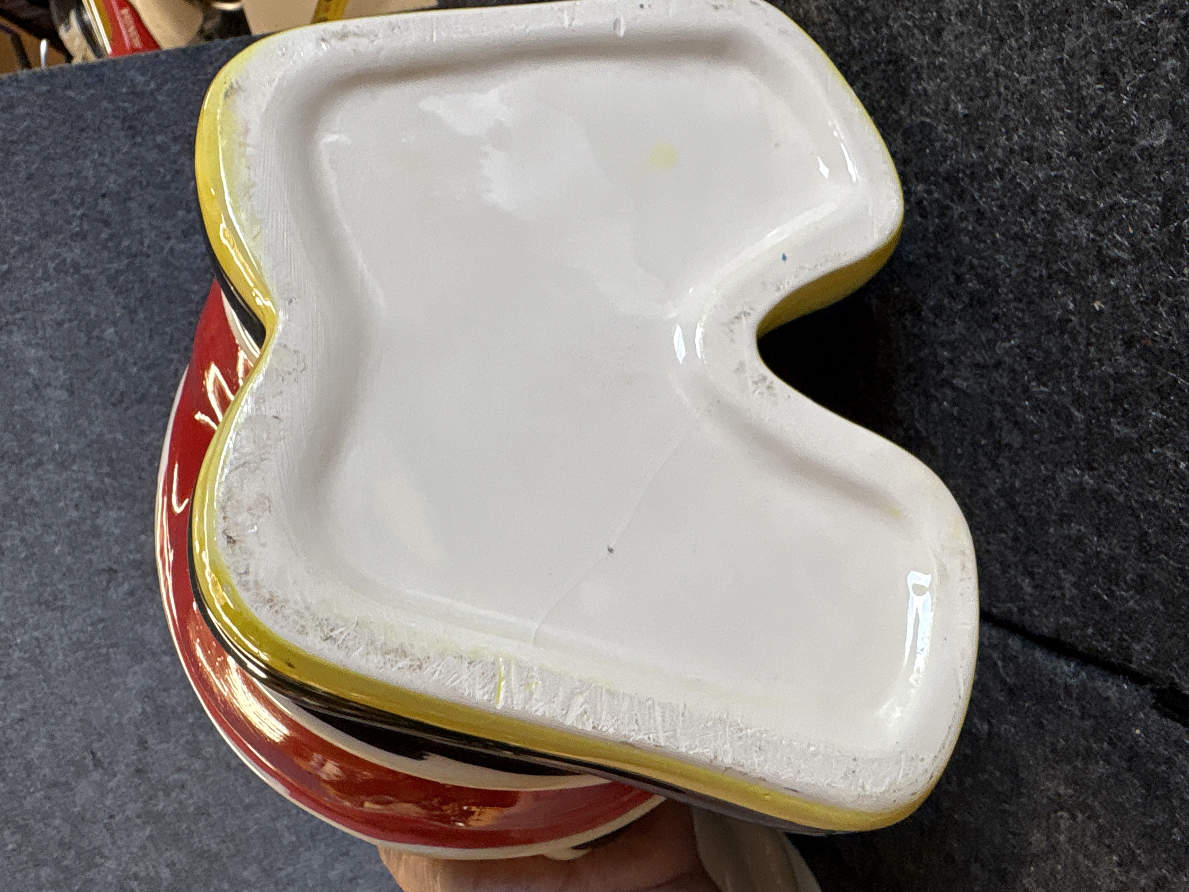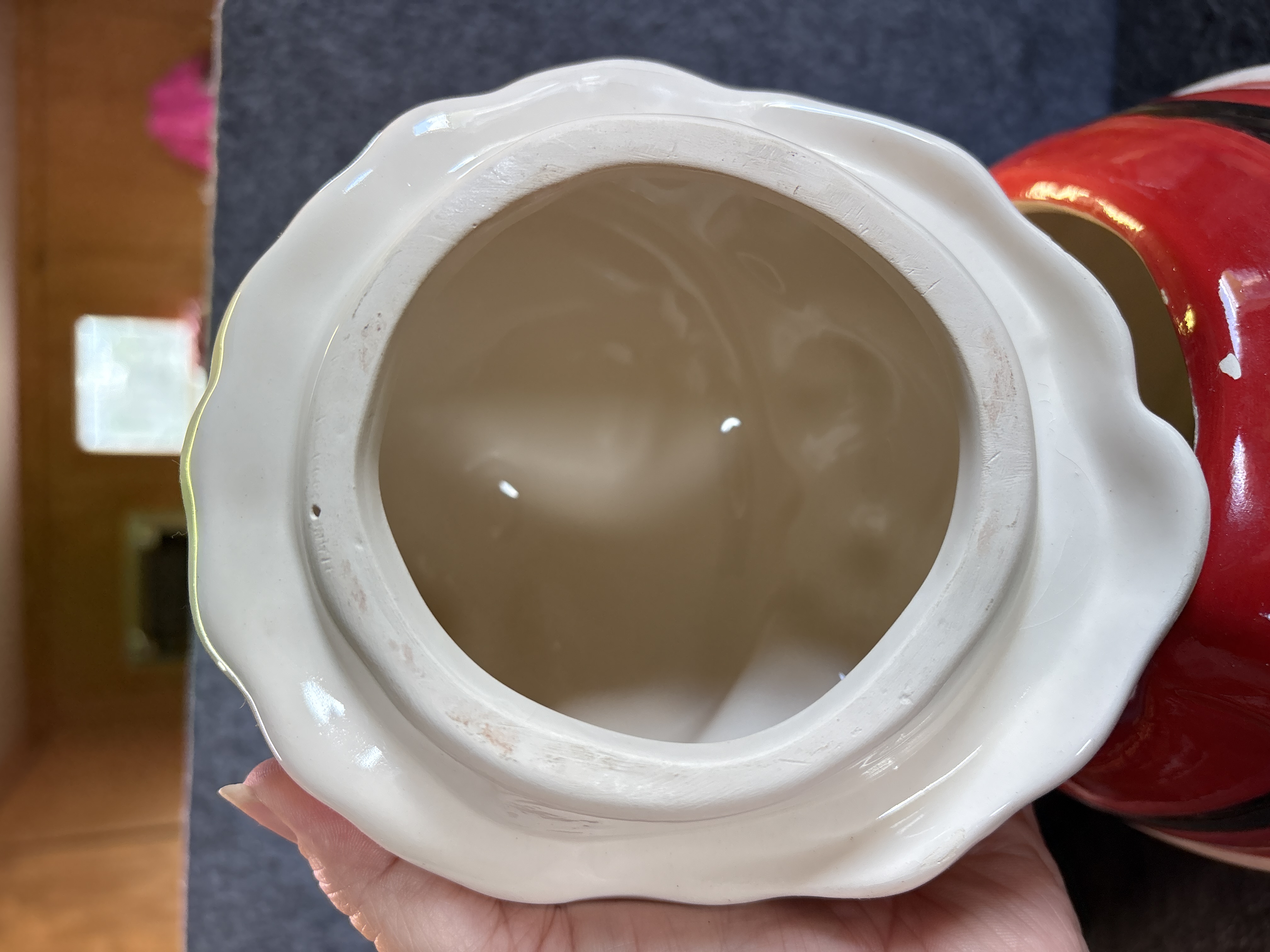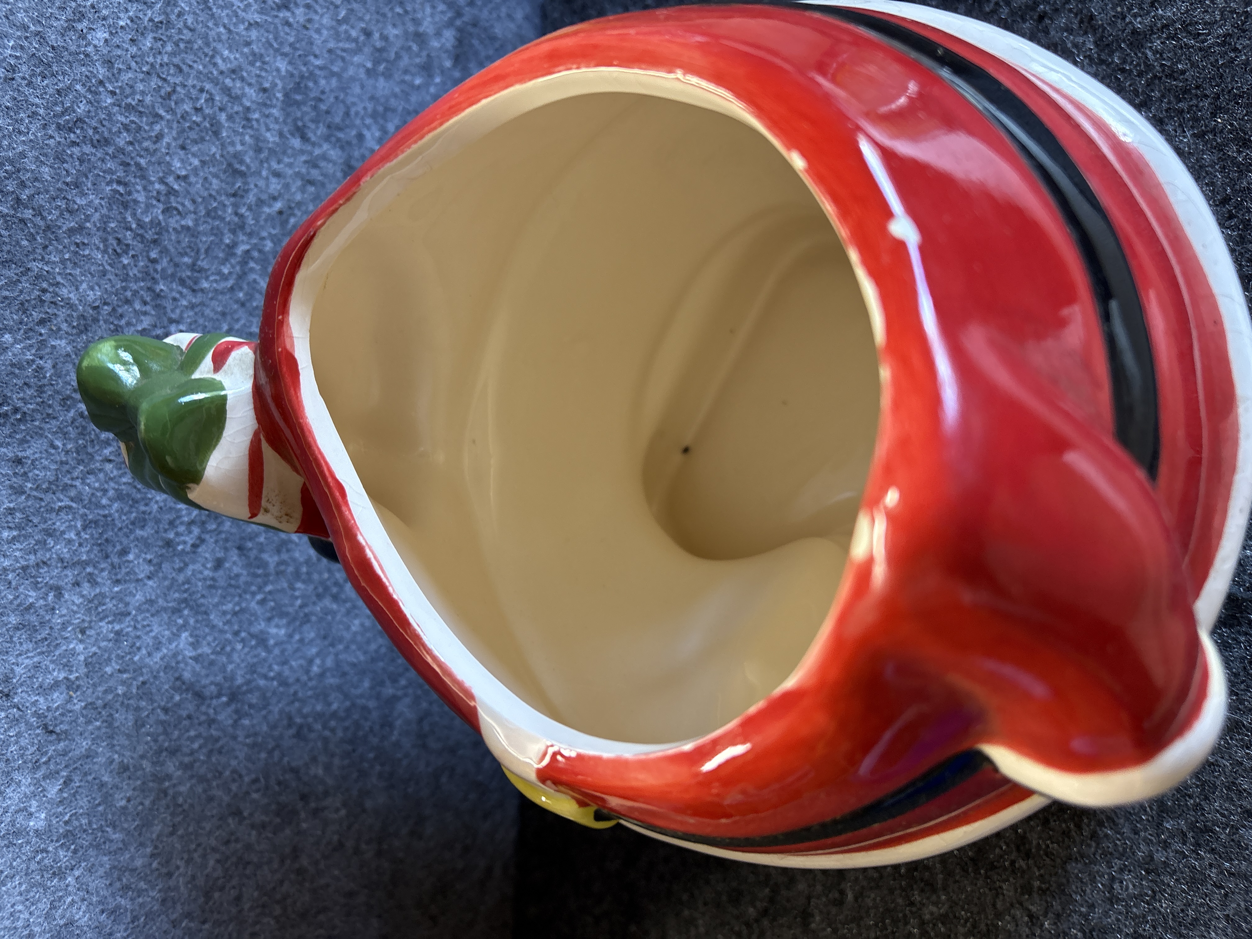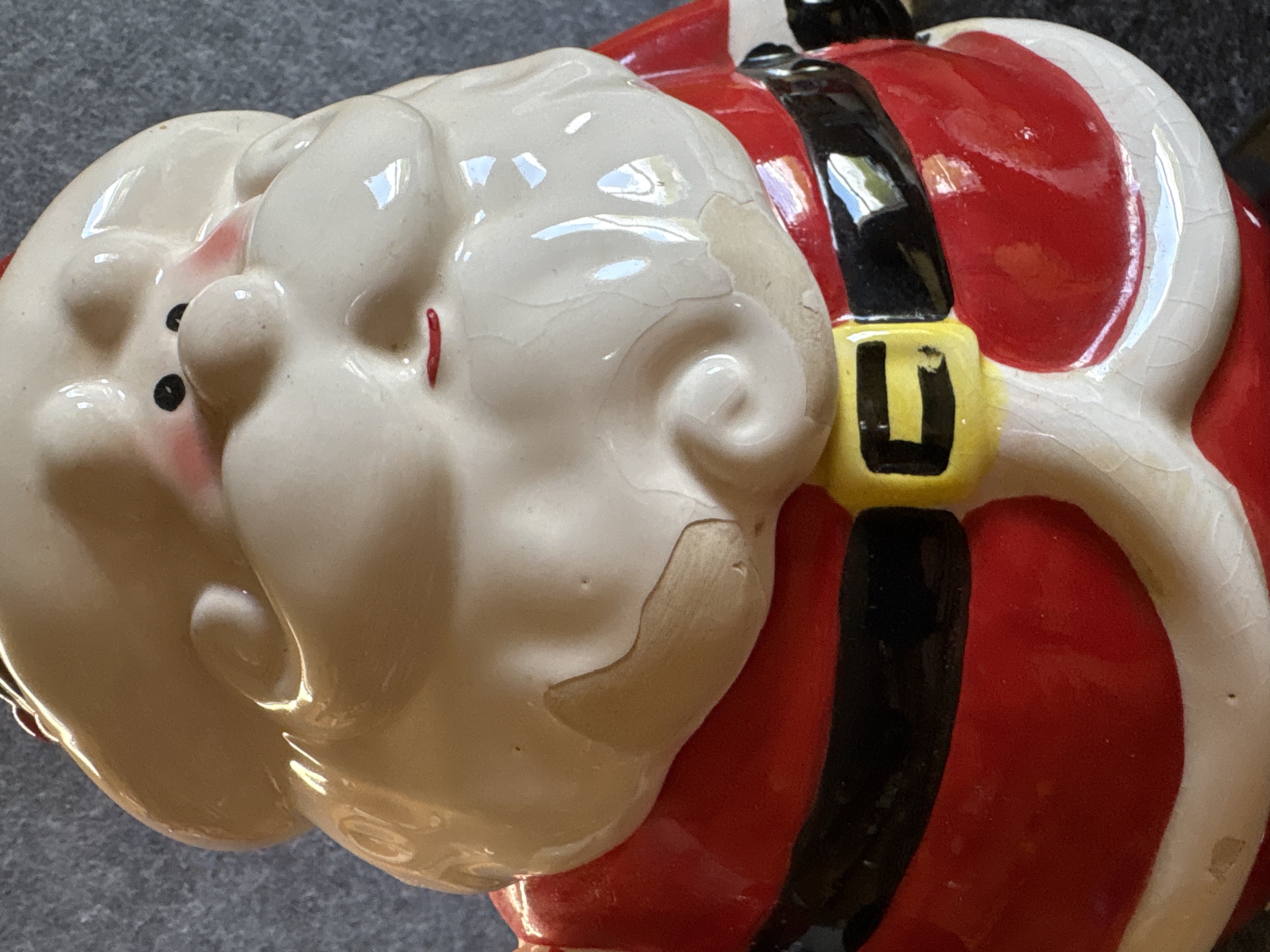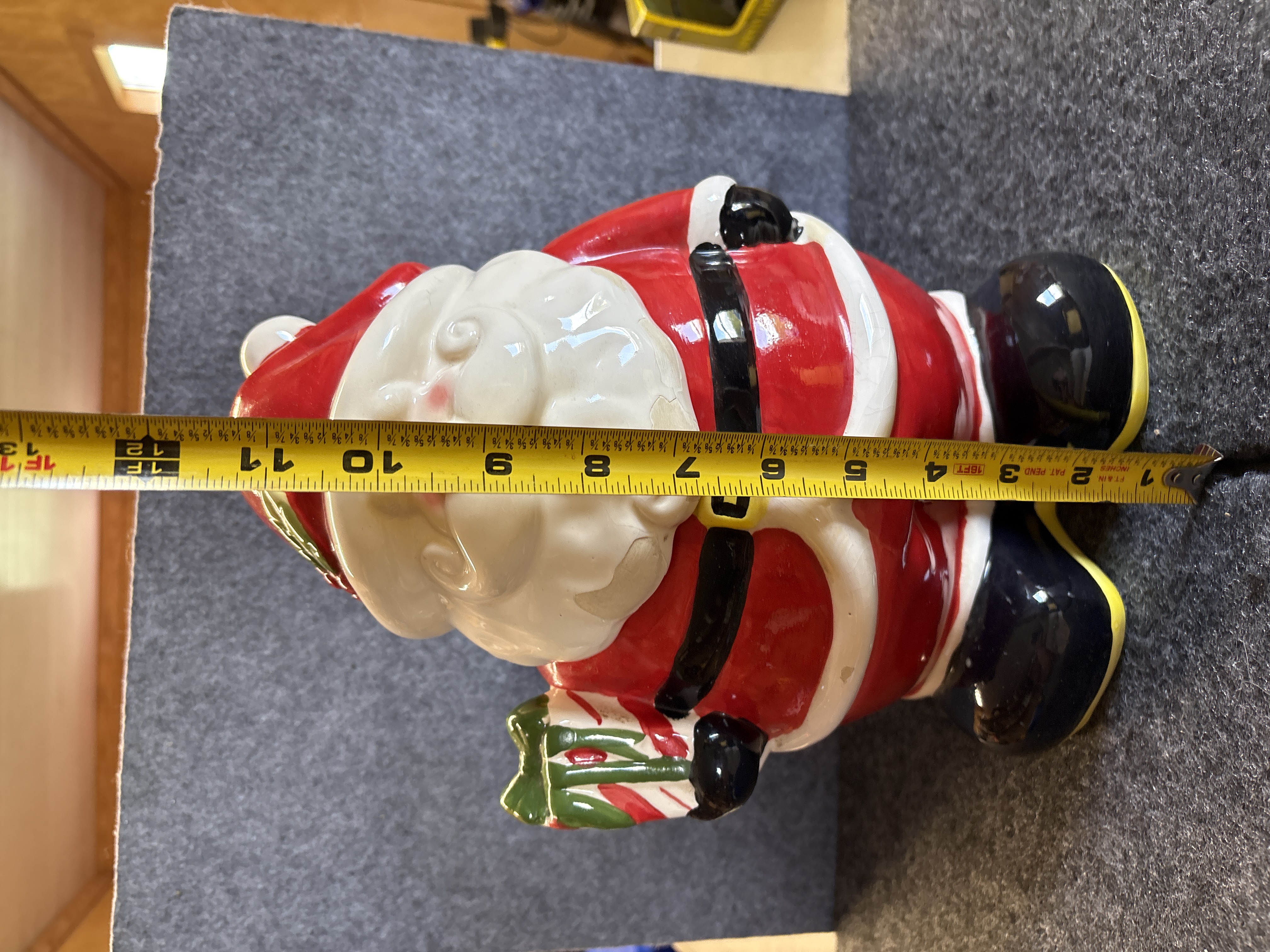 This glazed ceramic cookie jar is modeled in the form of a rotund Santa Claus and is attributed to Gibson. The two-piece jar features a lid formed by the head and shoulders, depicting the character in a traditional red suit with white trim, a black belt with a yellow buckle, and black boots with yellow soles. Santa is shown holding a collection of candy canes tied with a green bow. The piece features a high-gloss finish over polychrome decoration.