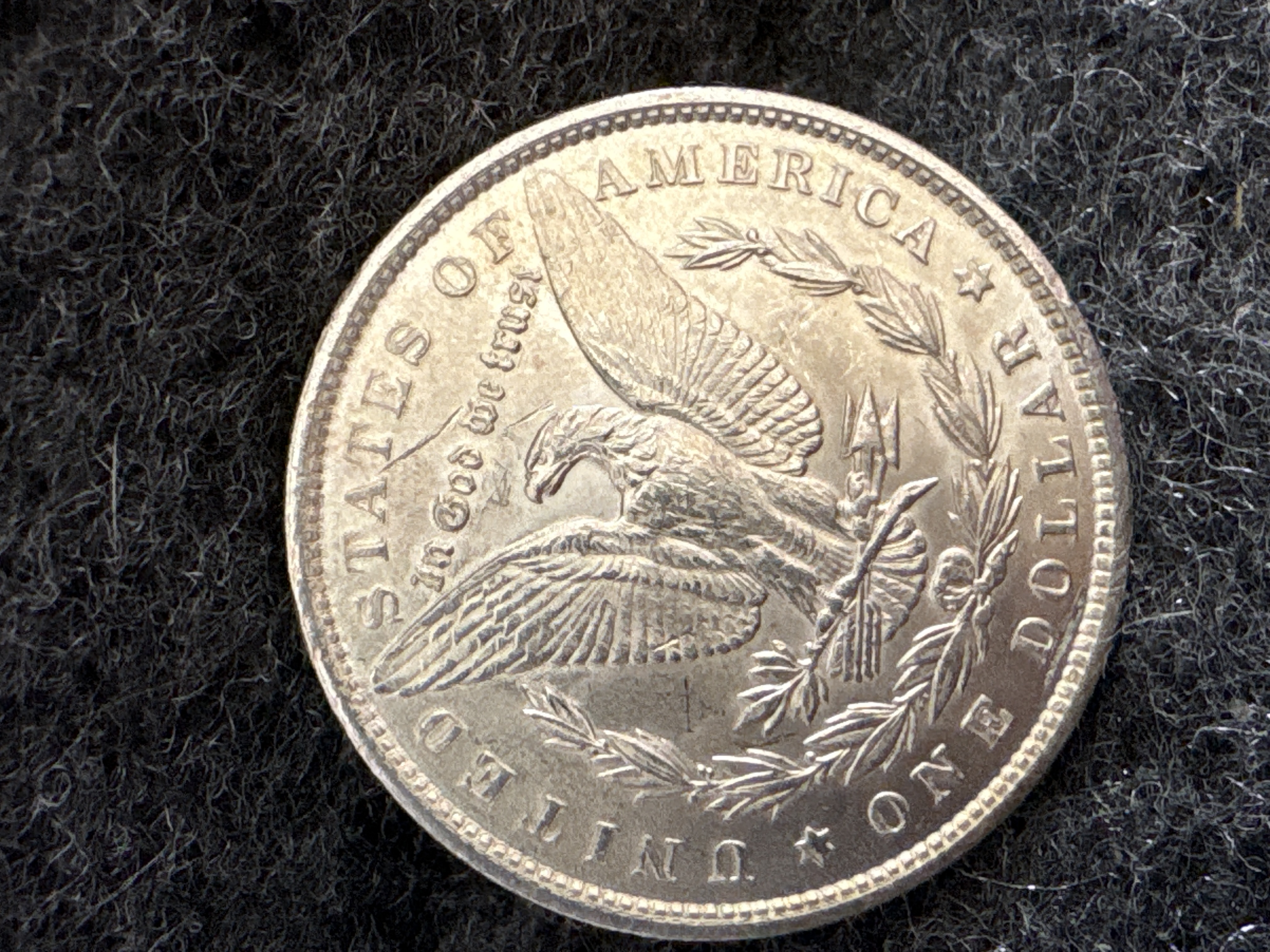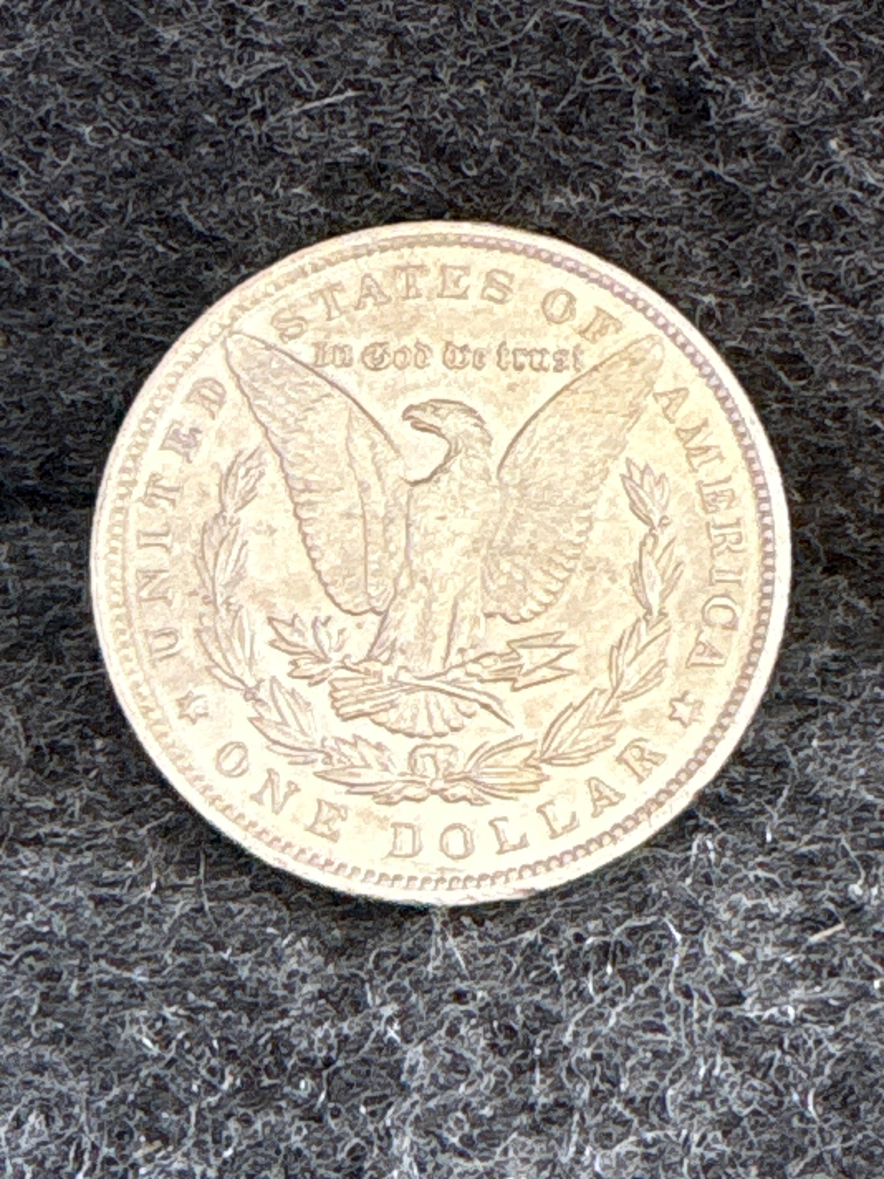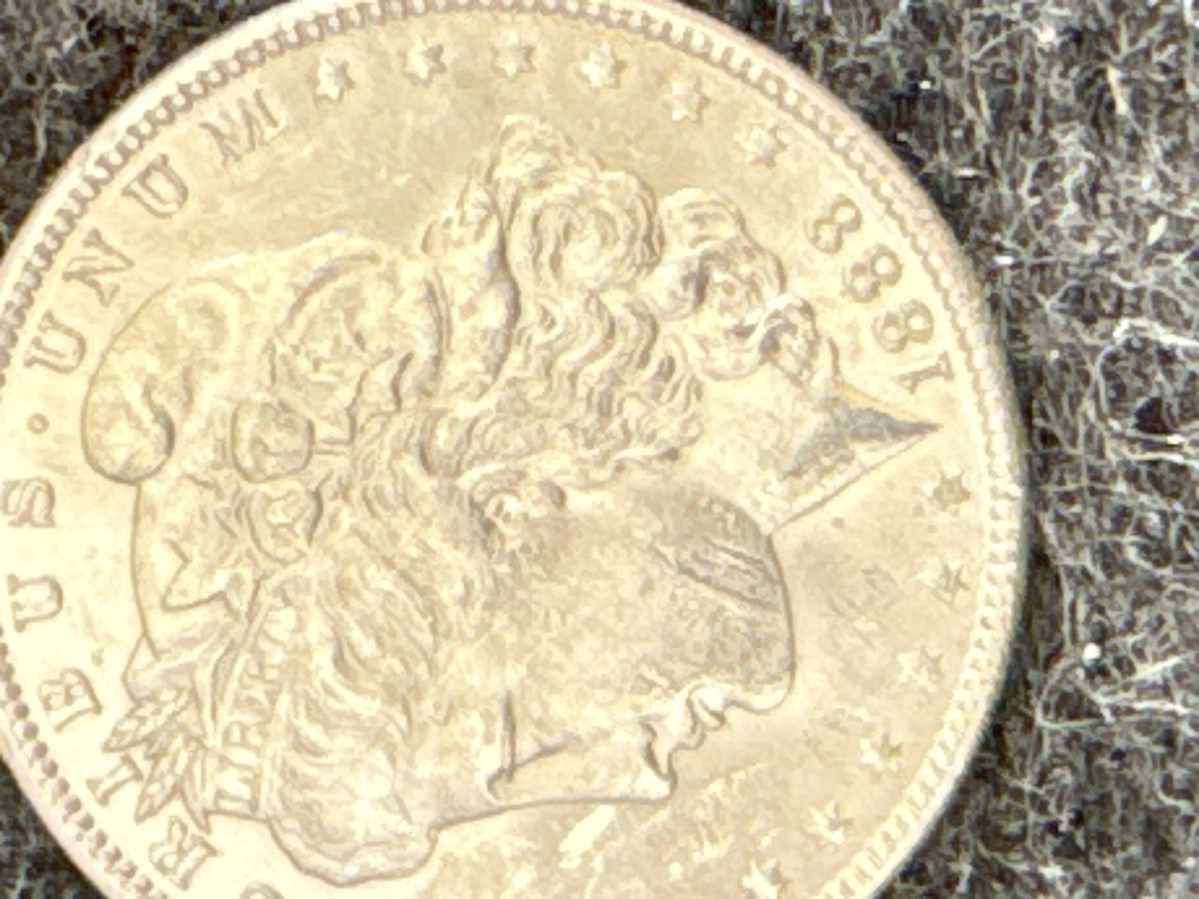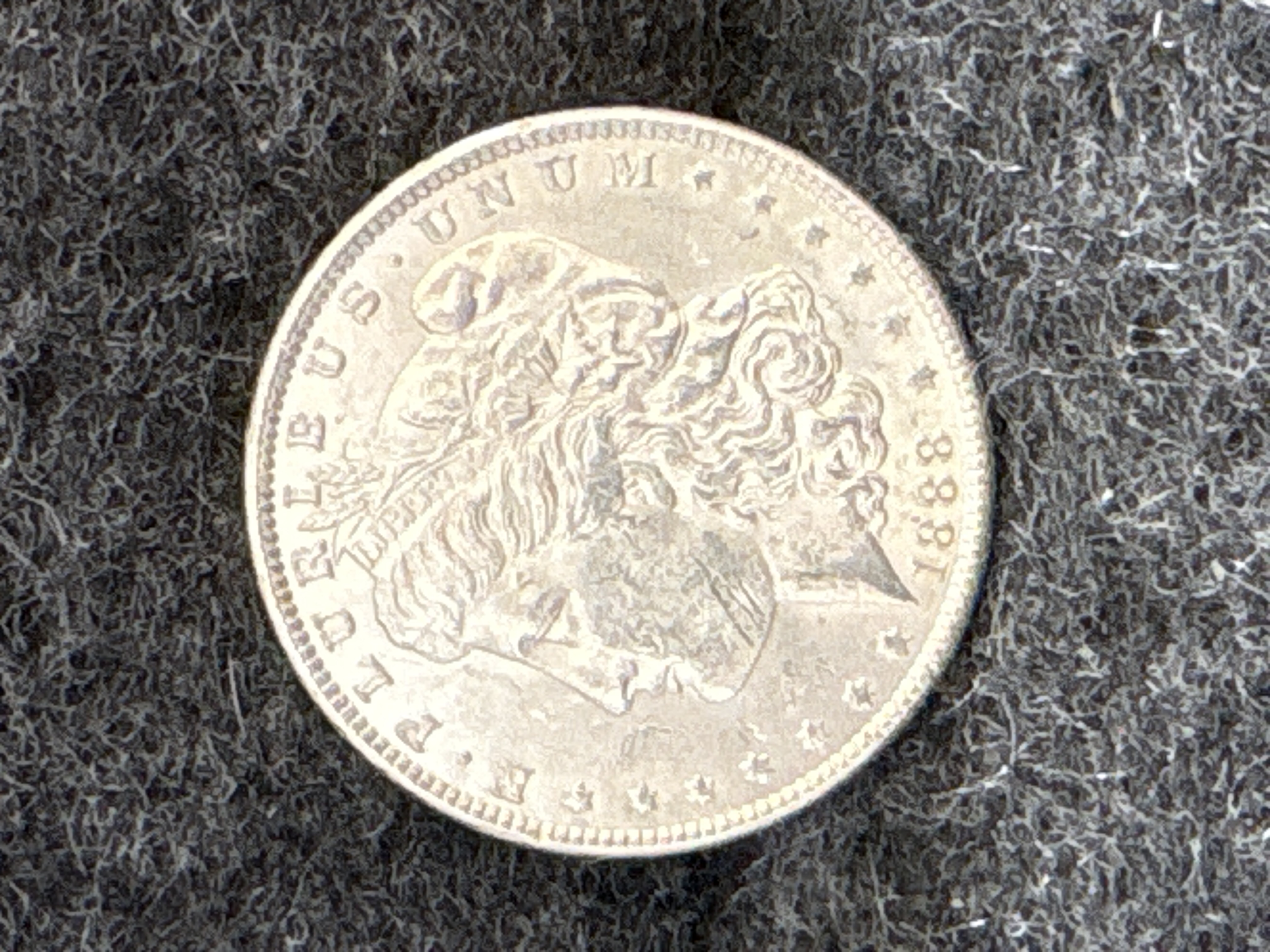 An 1888 Morgan silver dollar featuring Liberty on the obverse and an eagle with a wreath on the reverse.