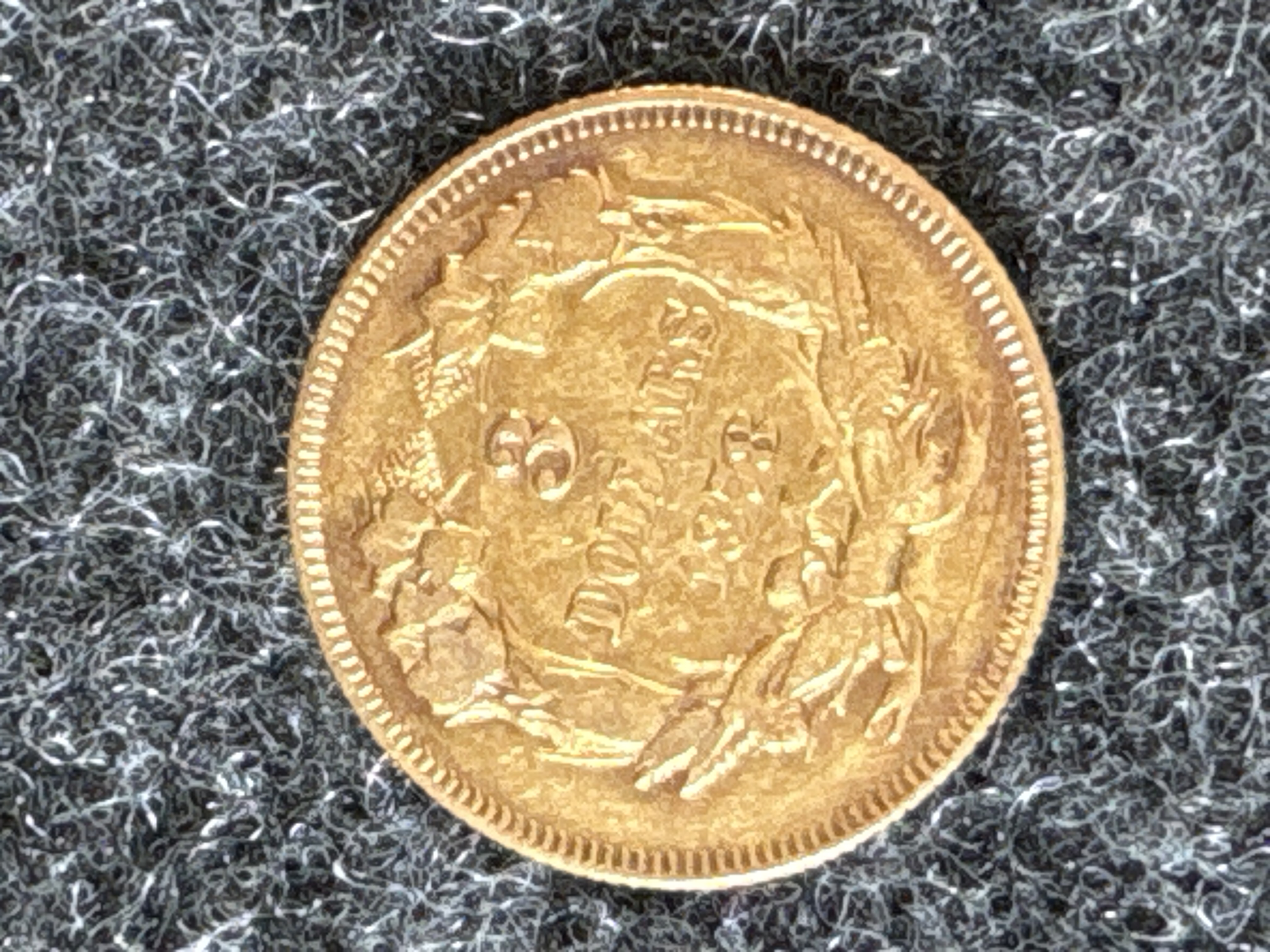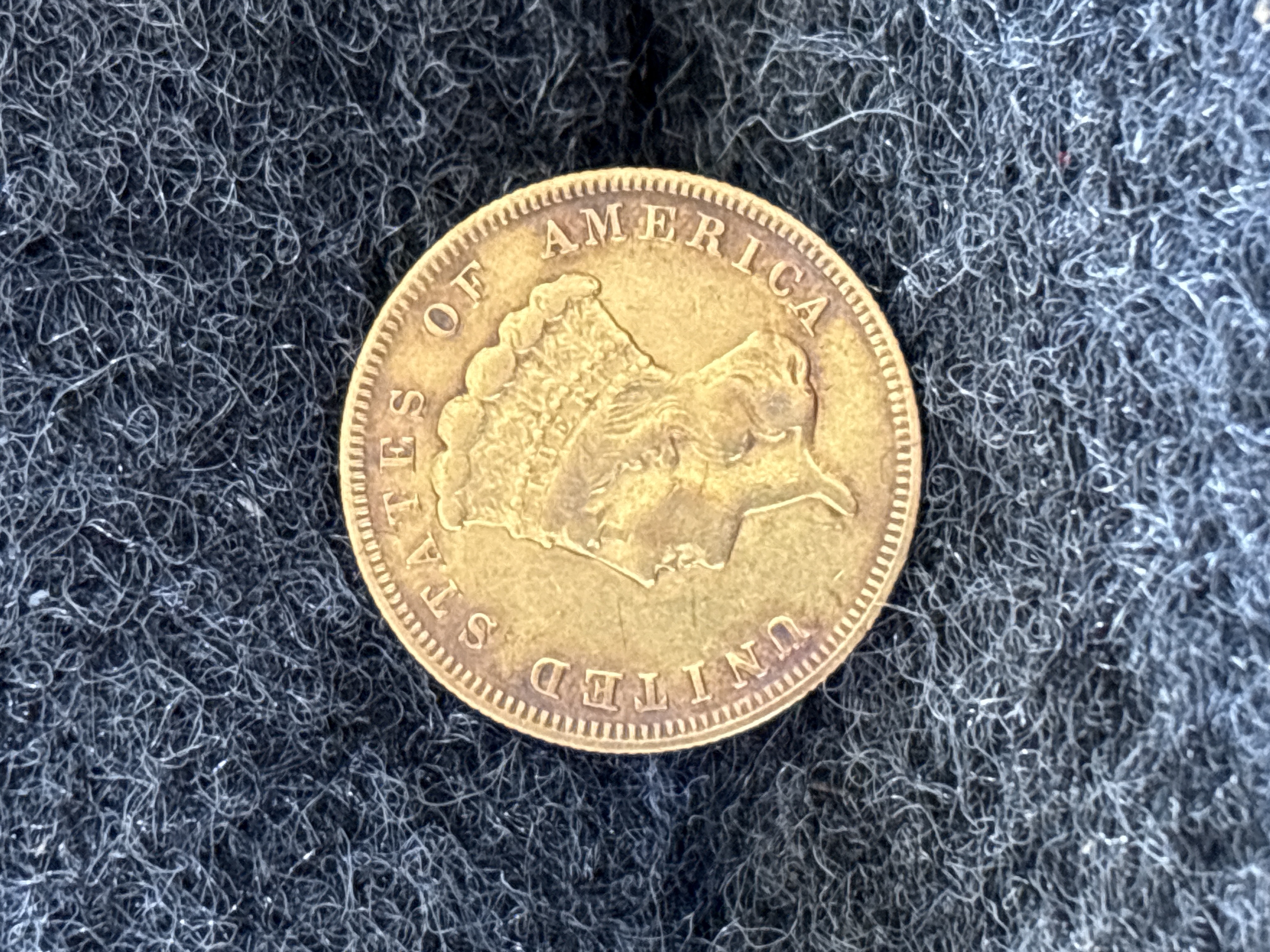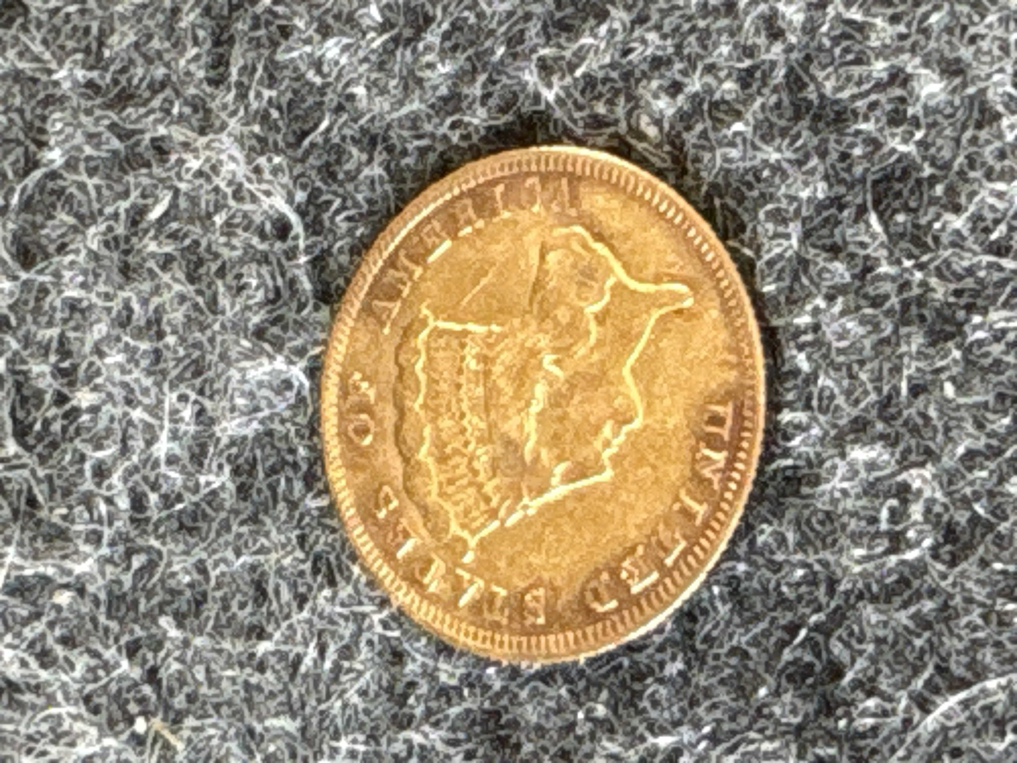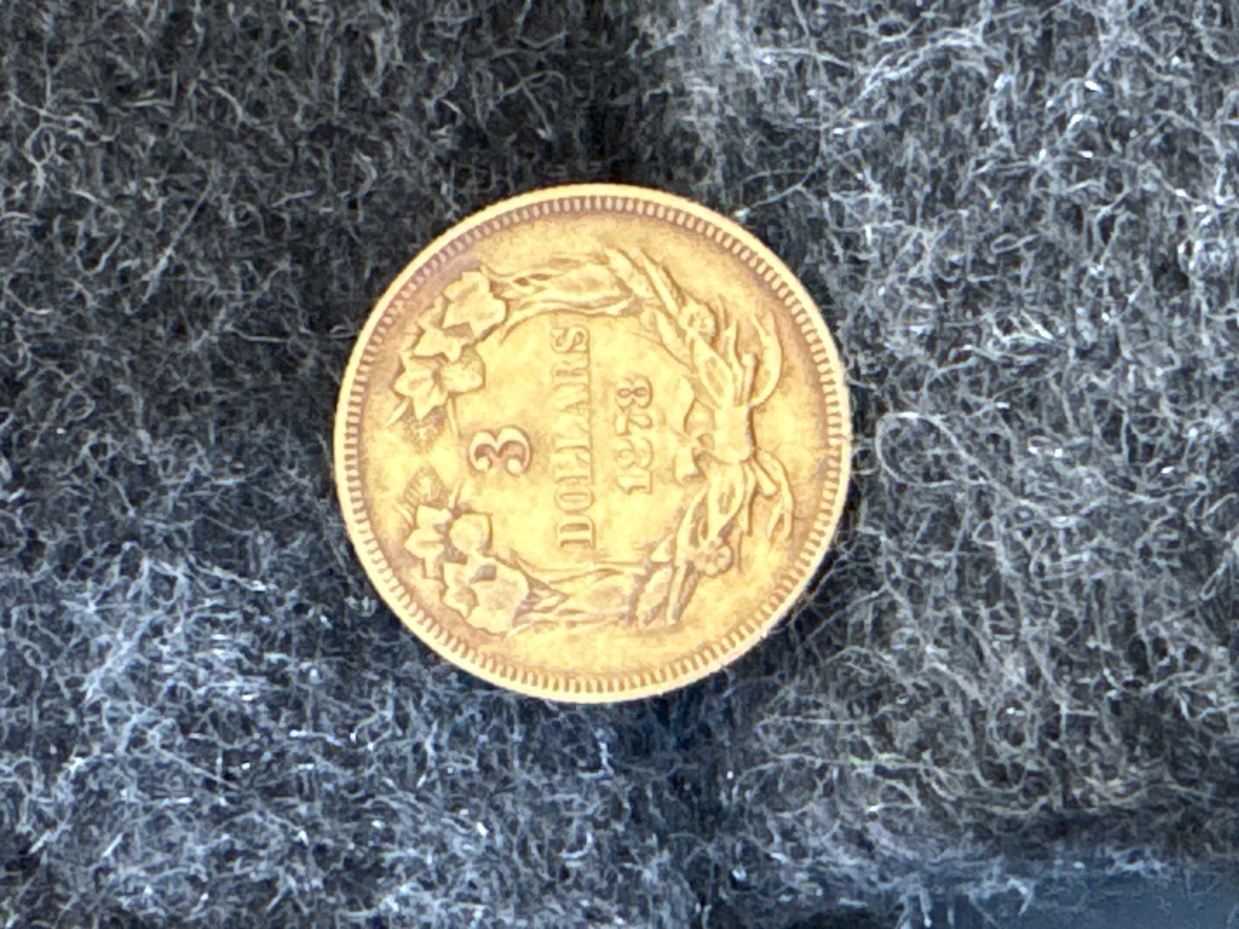 A gold-colored coin featuring an Indian Princess head on the obverse and the denomination 3 Dollars 1878 within a wreath on the reverse.