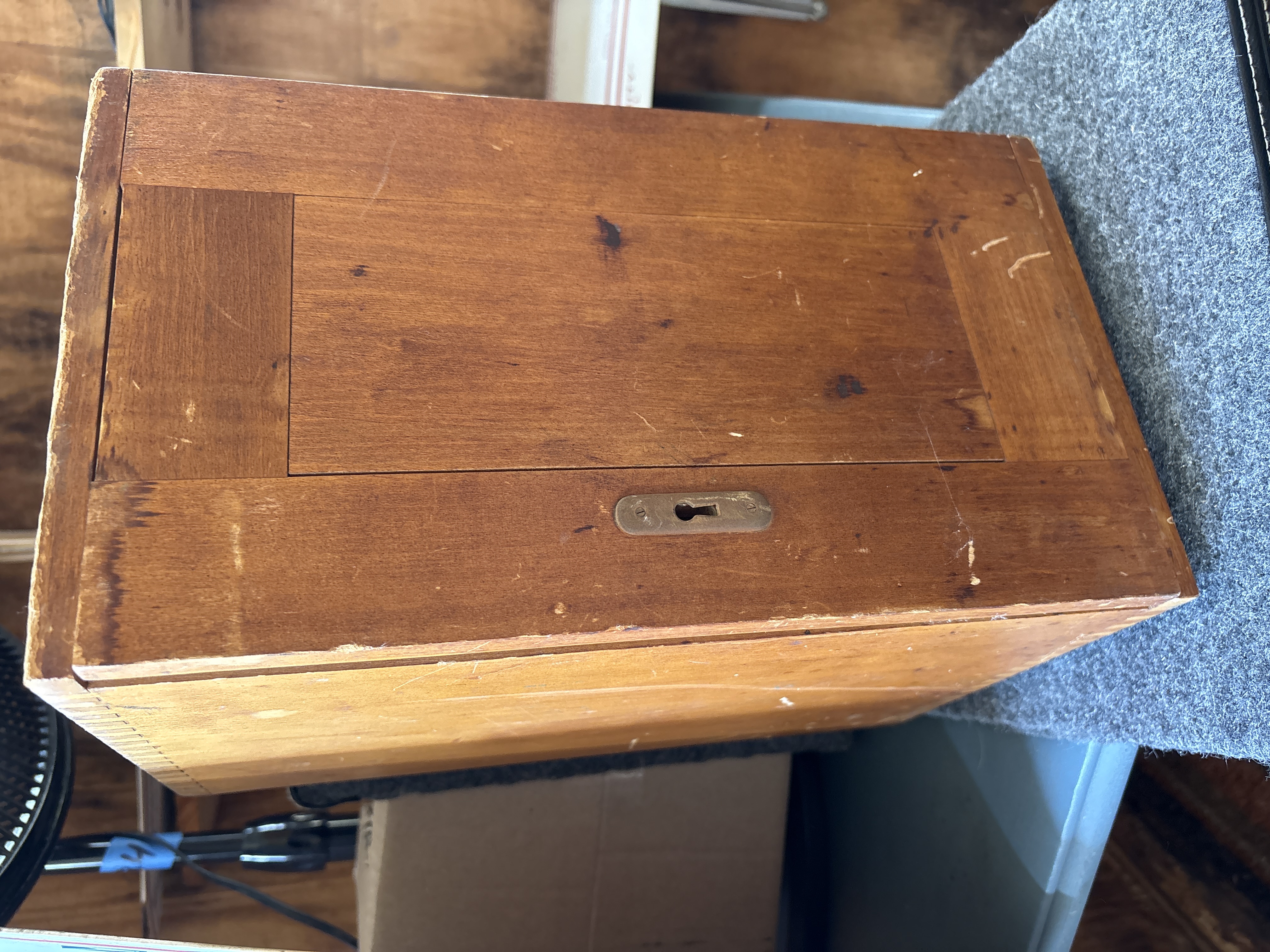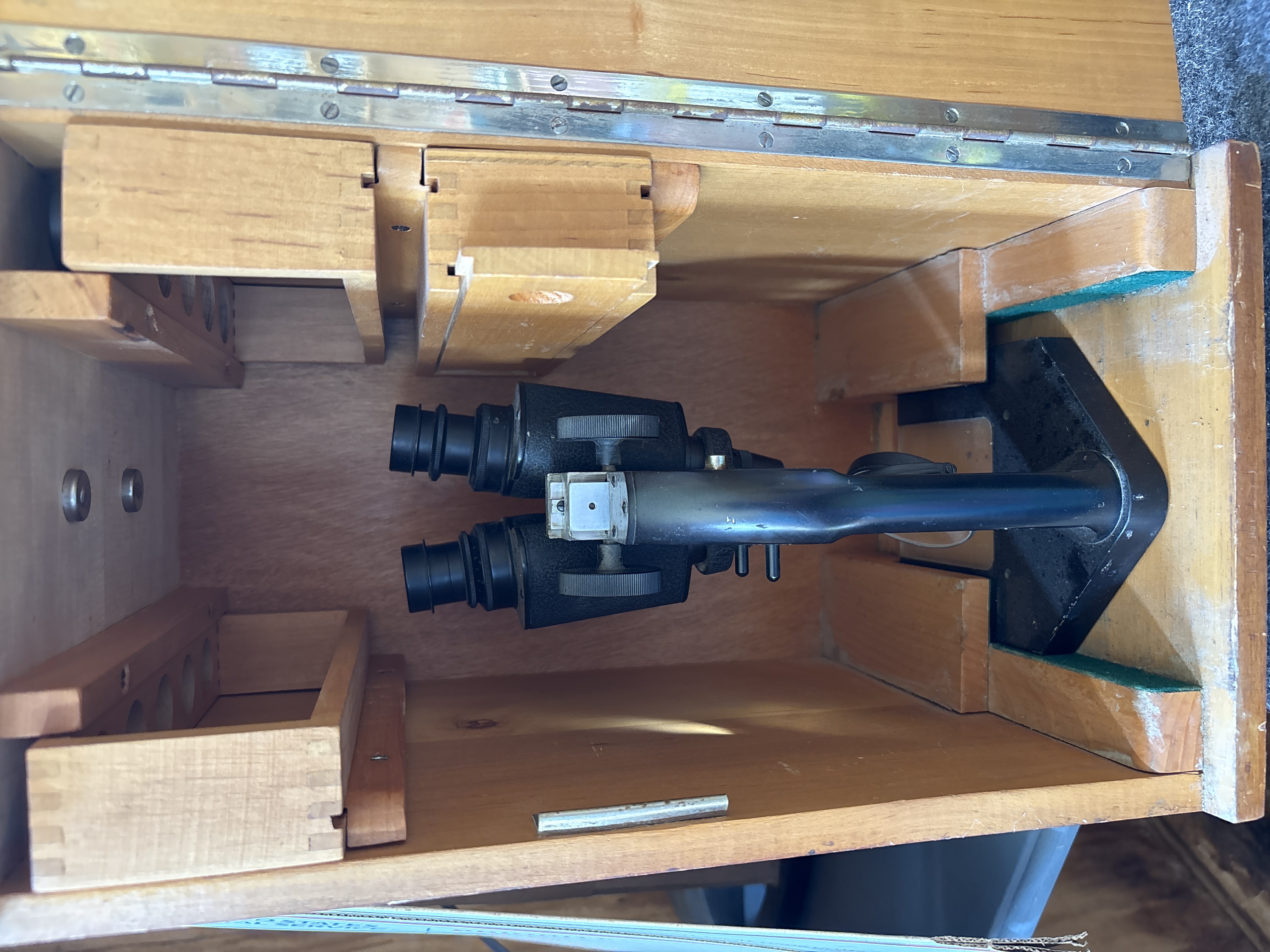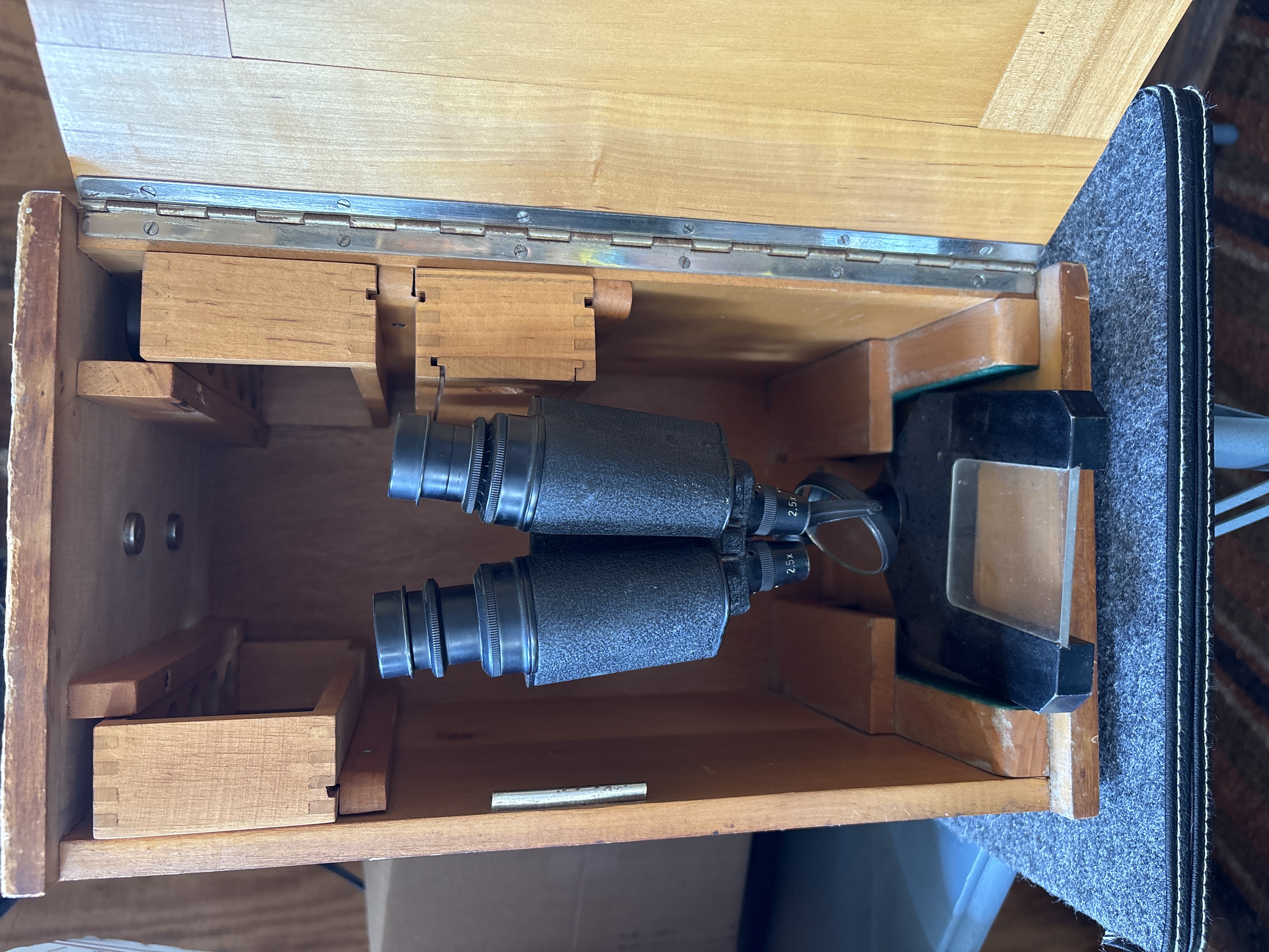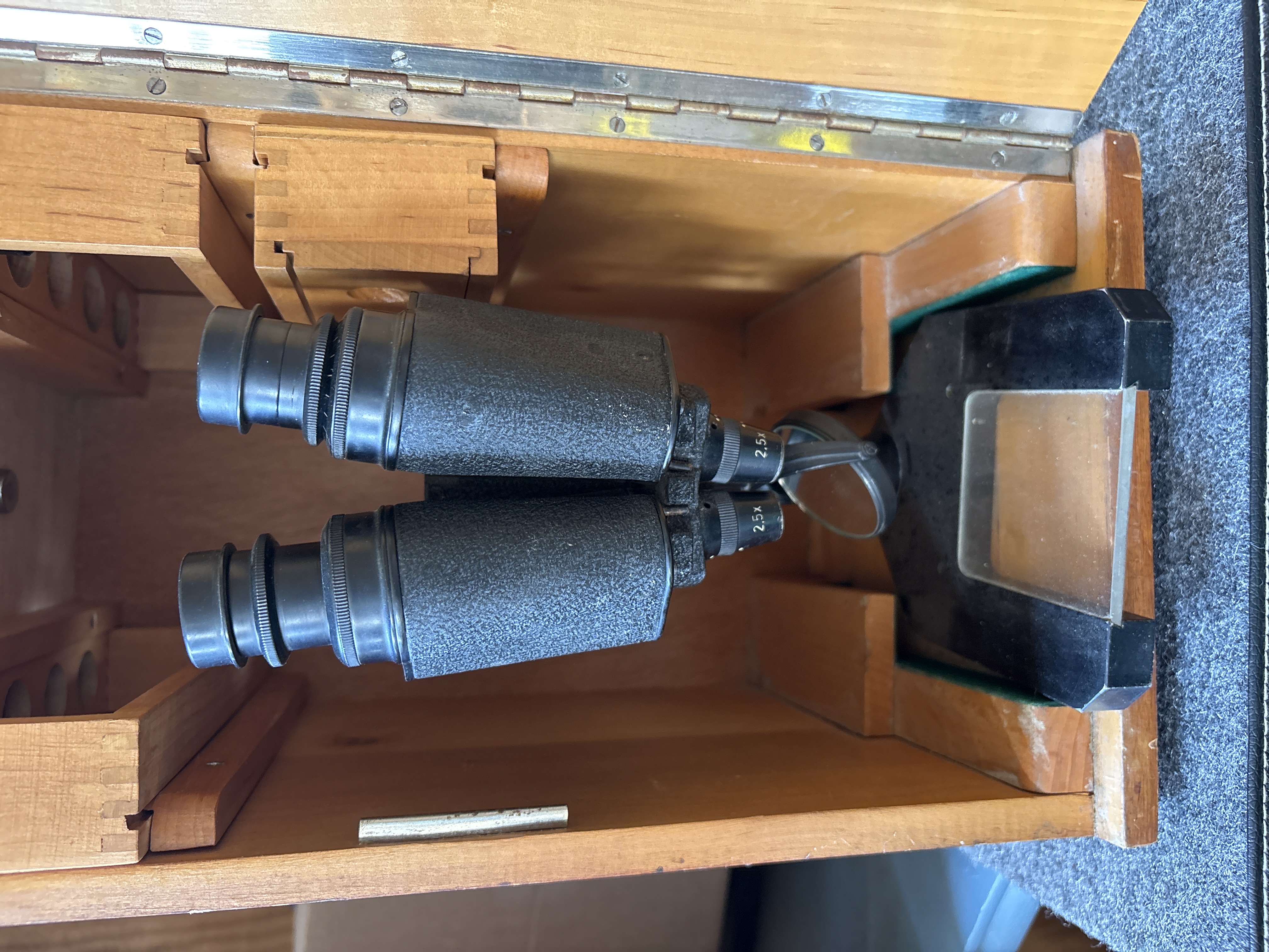 A German-made Dewöhler Kassel Prilux 2.5x binocular optical instrument with serial number 50049, featuring a black finish and adjustable stand, housed in a fitted light brown wooden storage box.