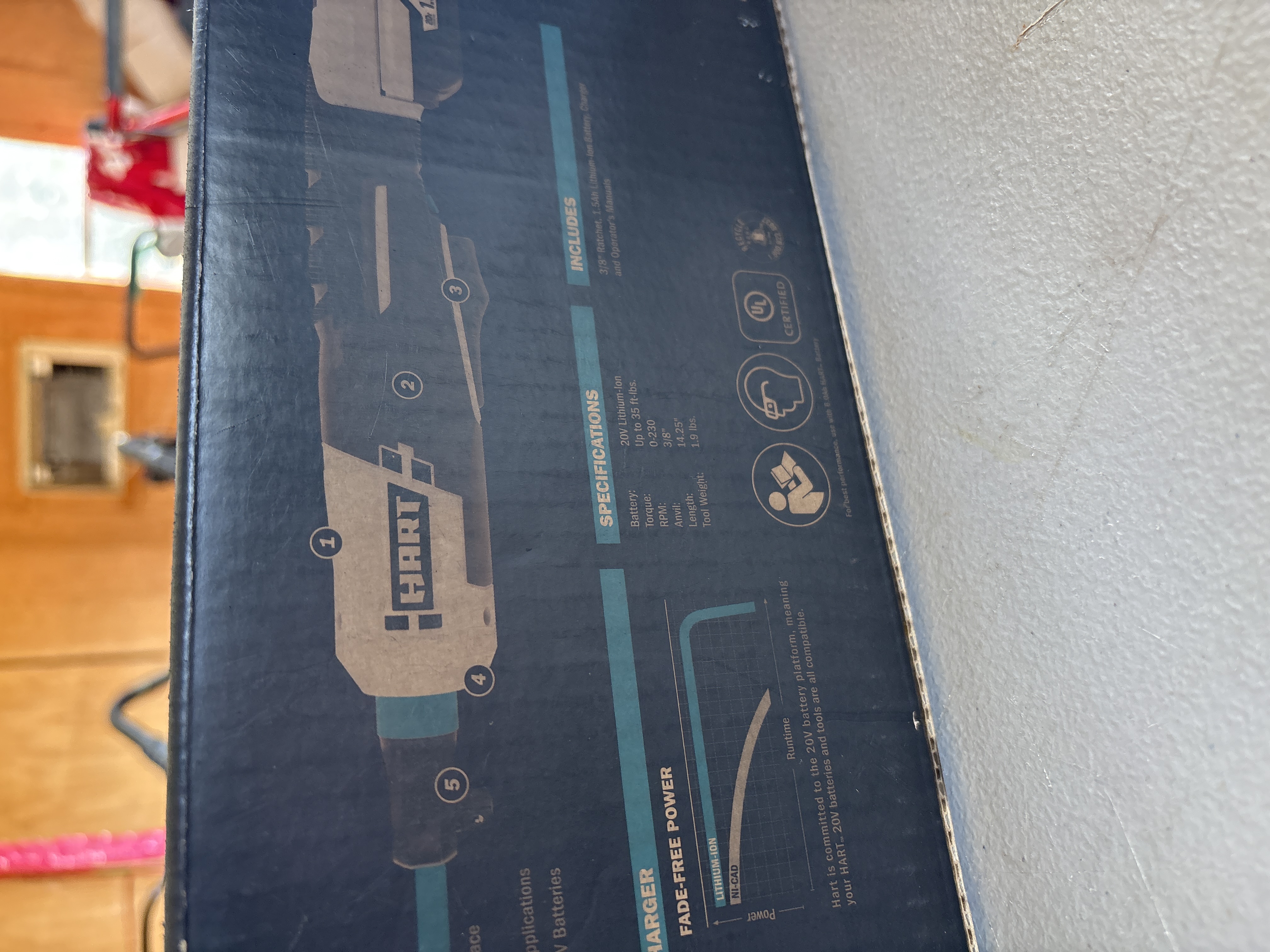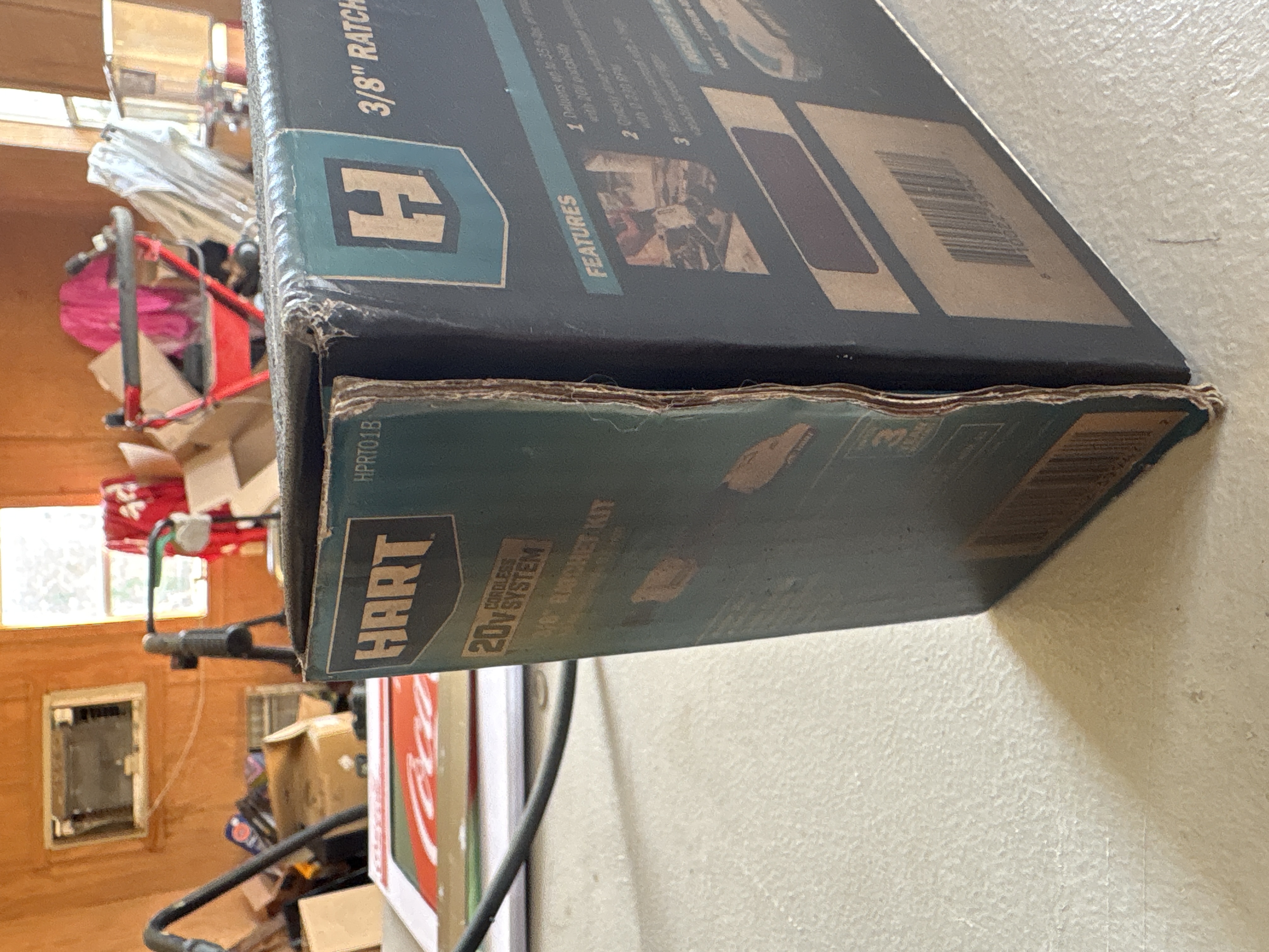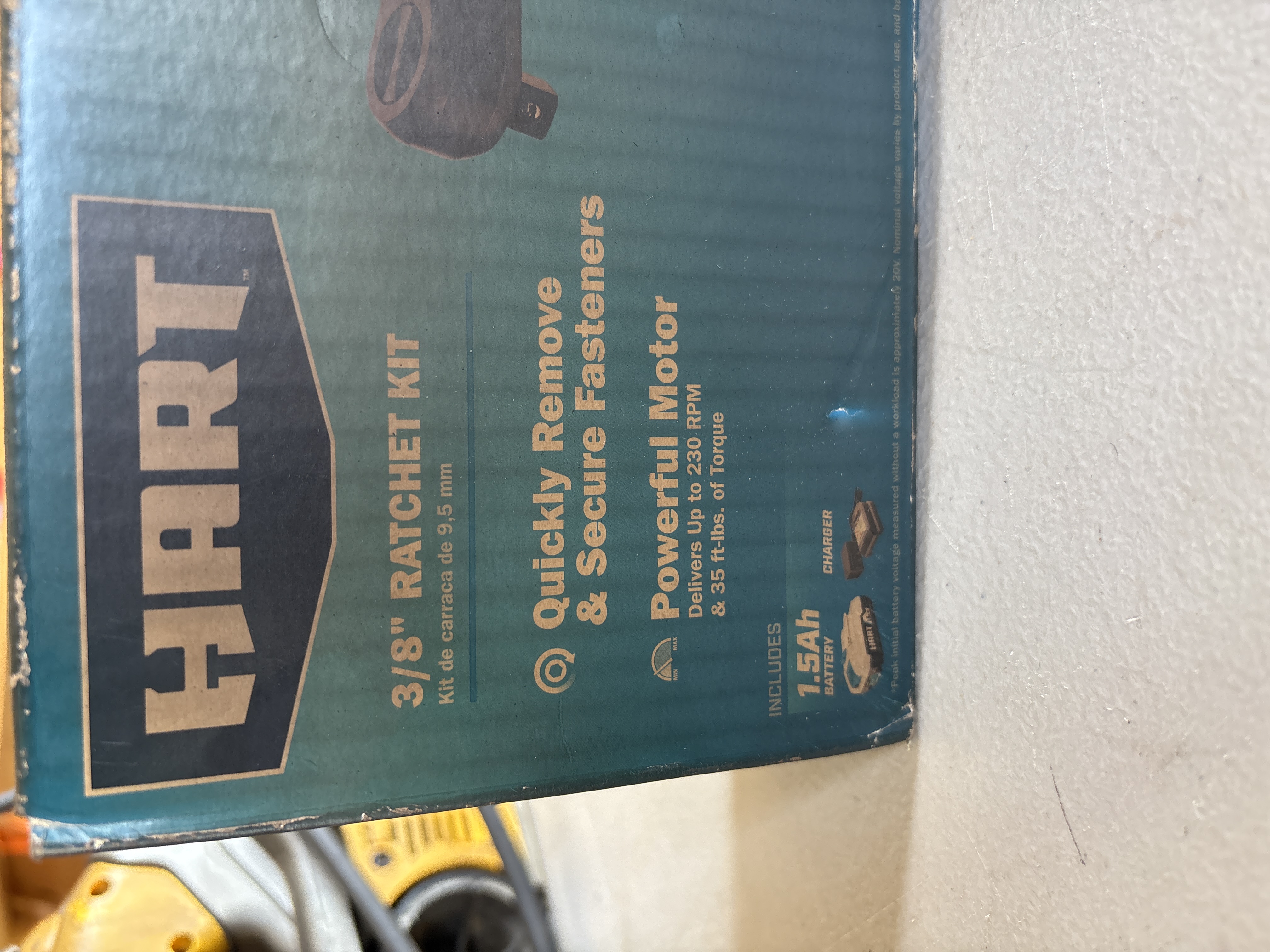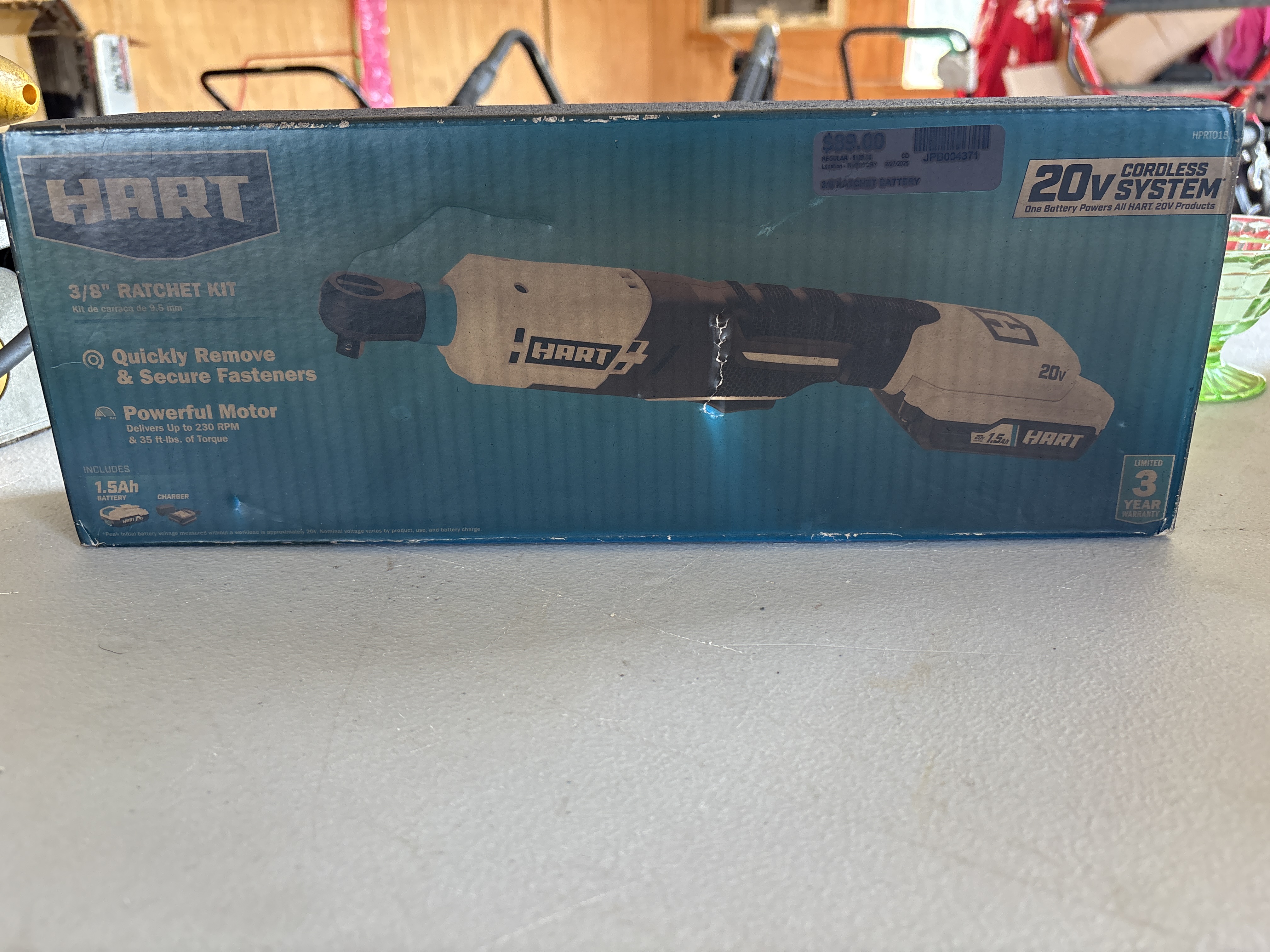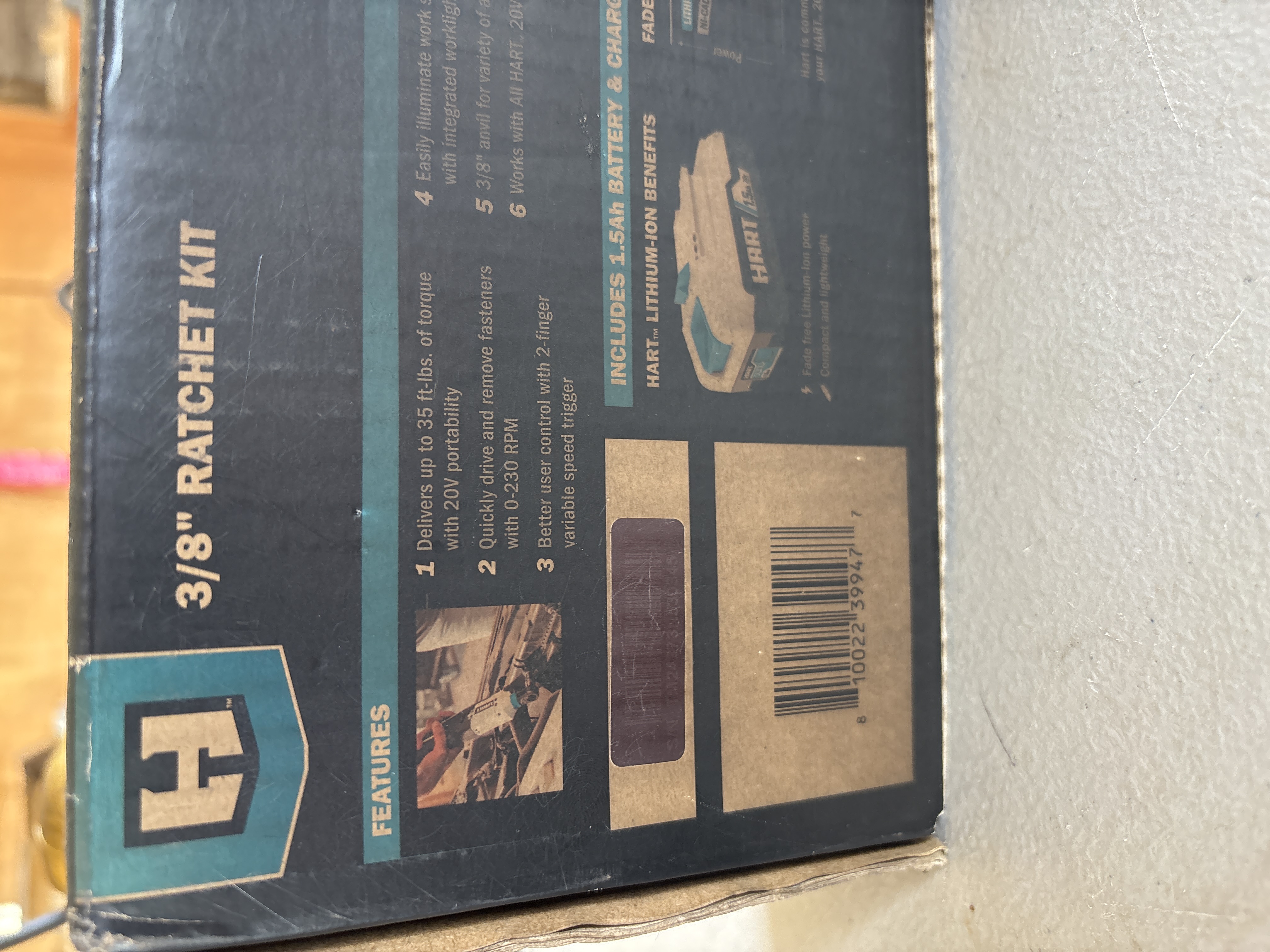 HART 20V cordless 3/8-inch ratchet kit including a 1.5Ah lithium-ion battery and charger, model HPRT01B, featuring a motor delivering up to 230 RPM and 35 ft-lbs of torque. New in Box. Never opened. Box has some smoke damage.