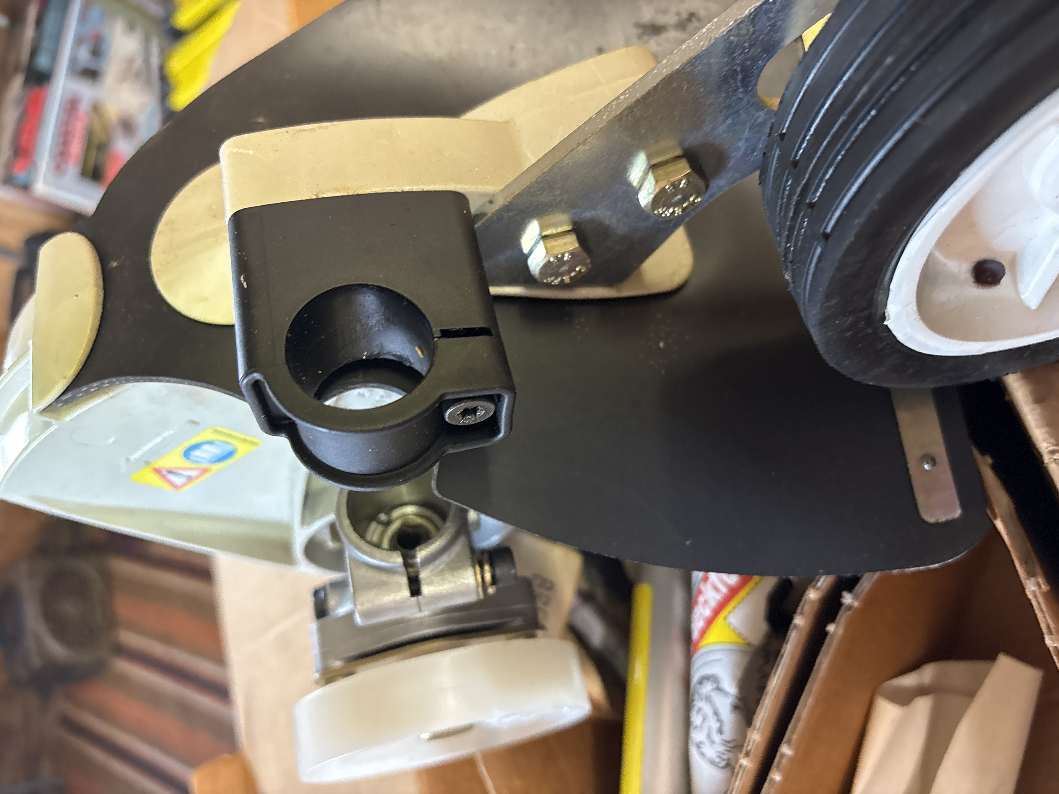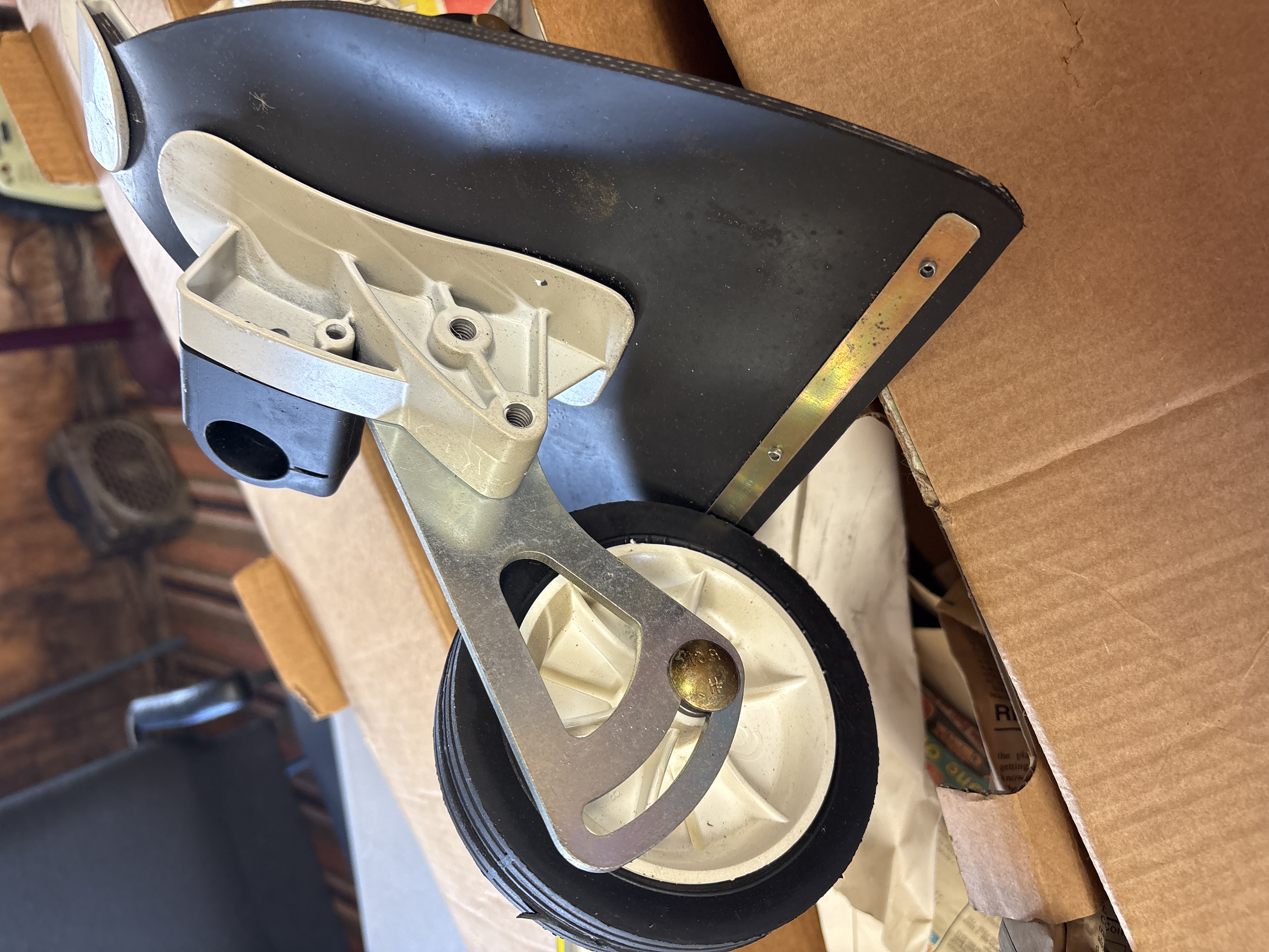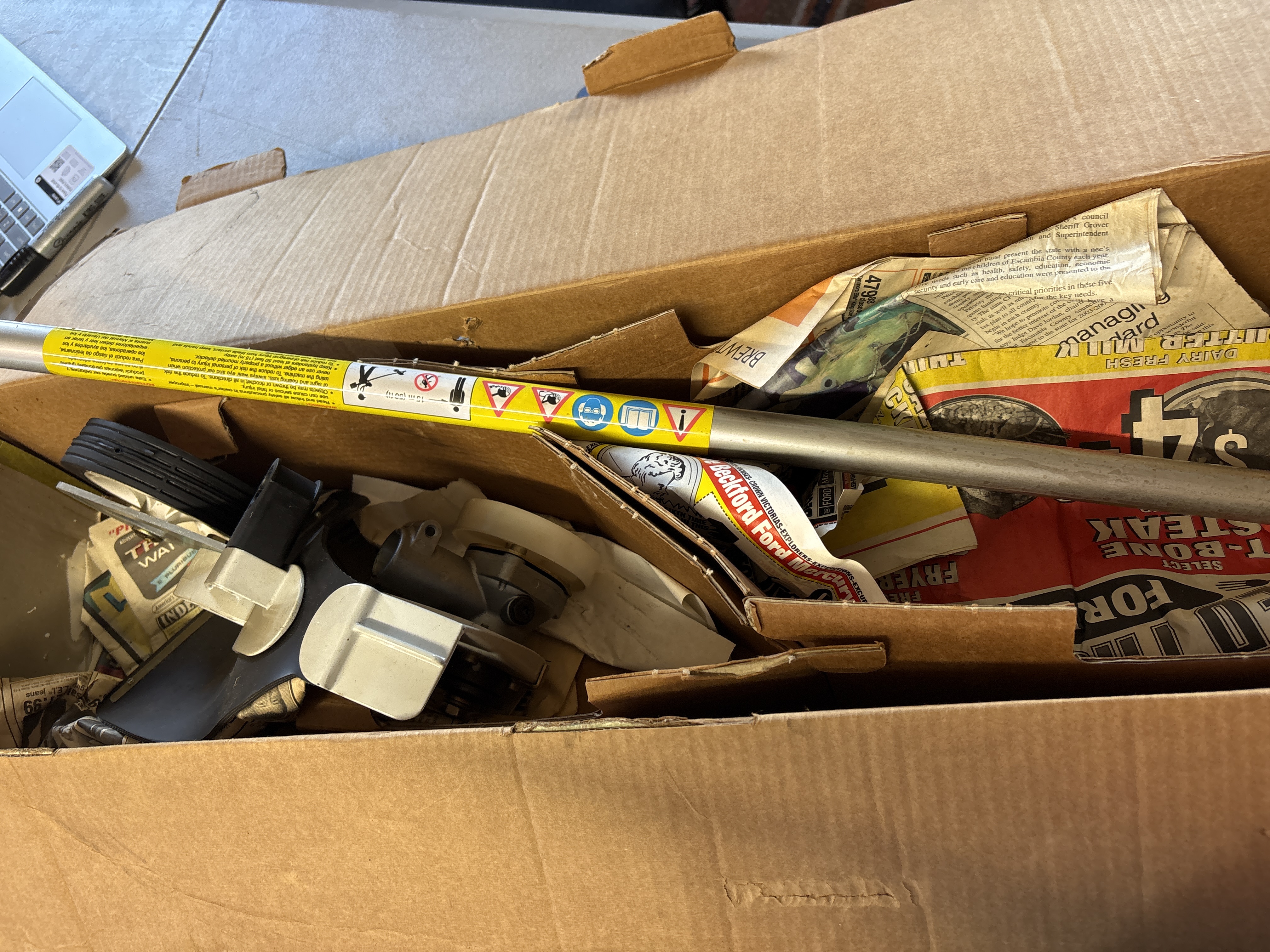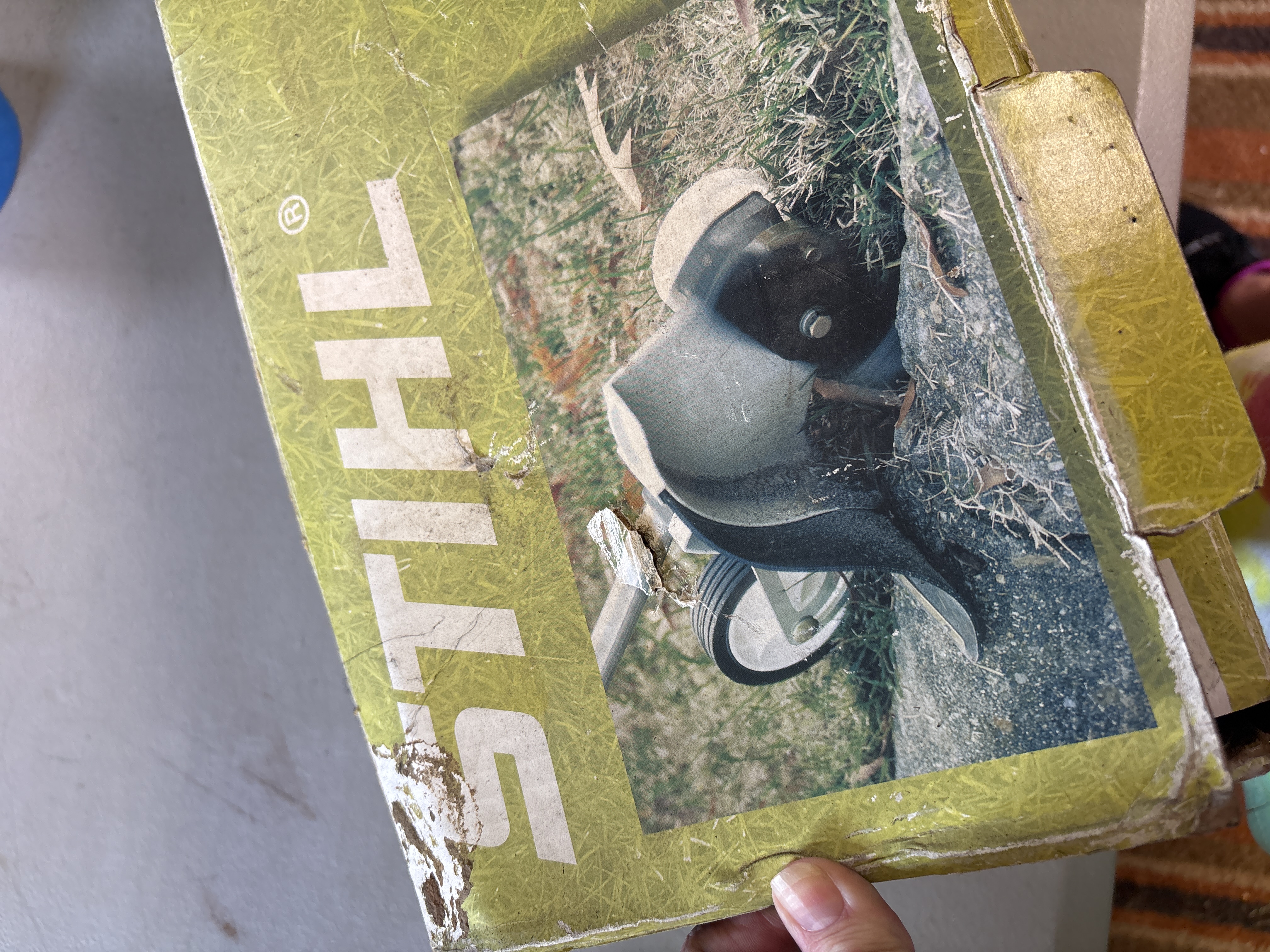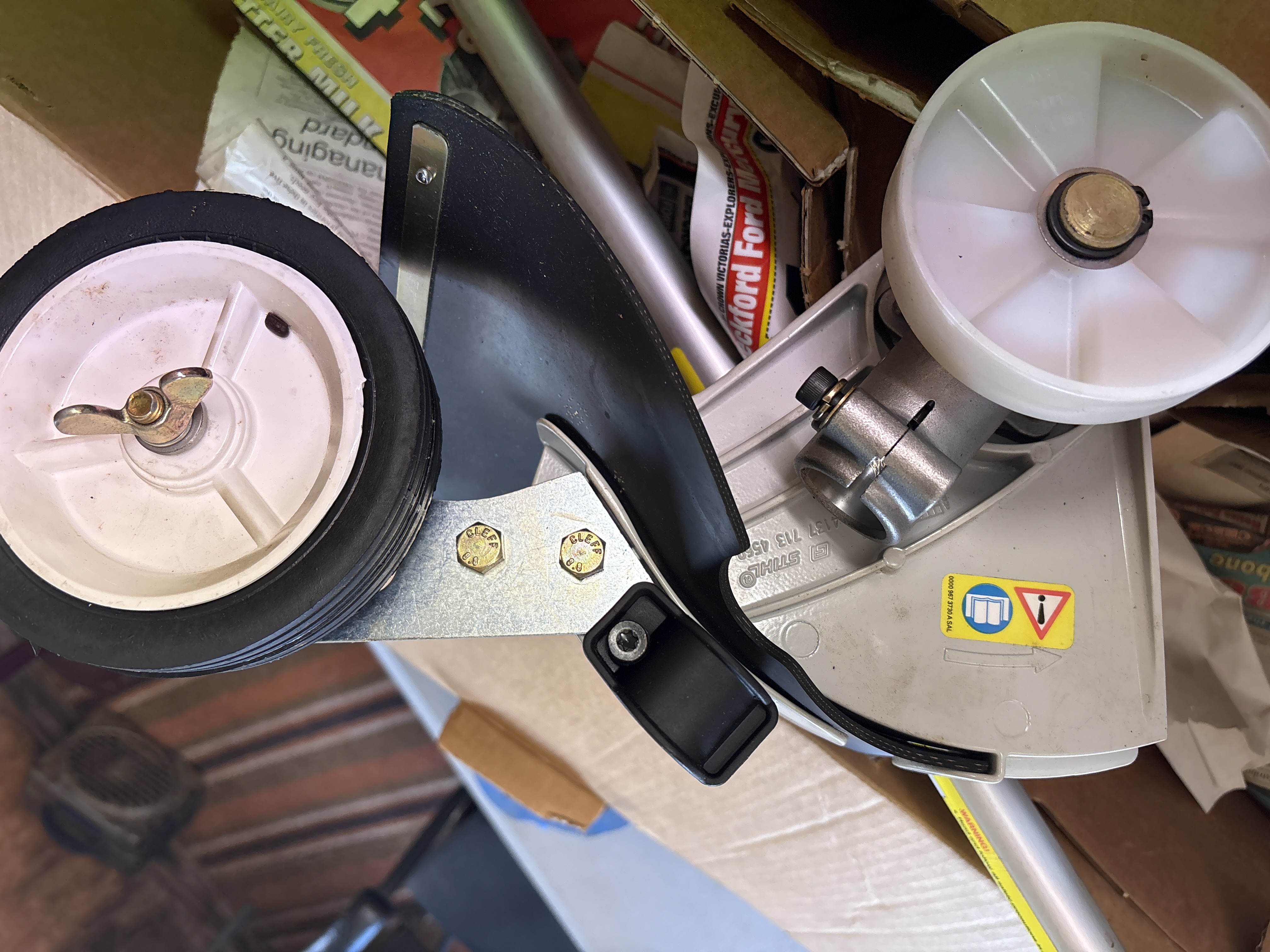A STIHL lawn edger attachment featuring a silver metal shaft, a black and white wheeled head assembly, and an edger blade.