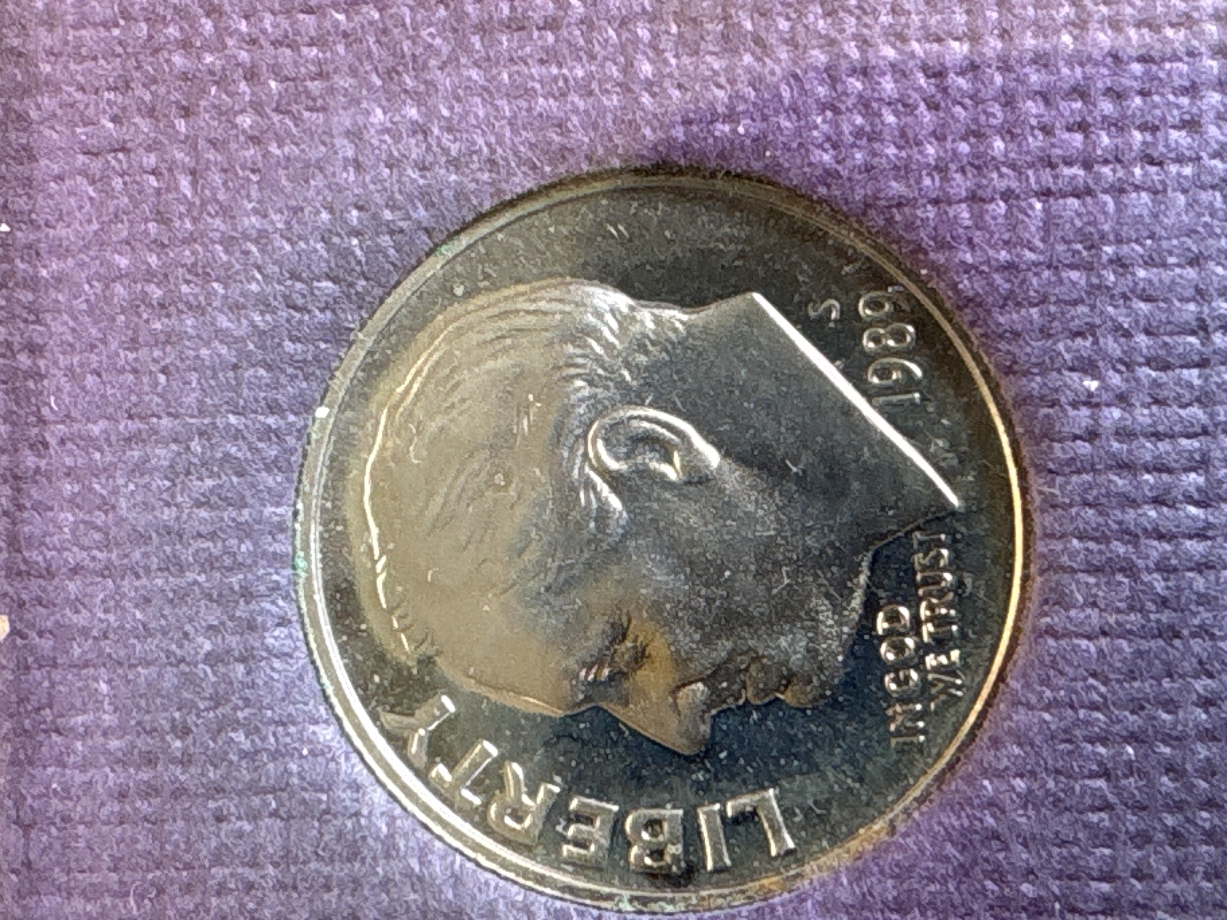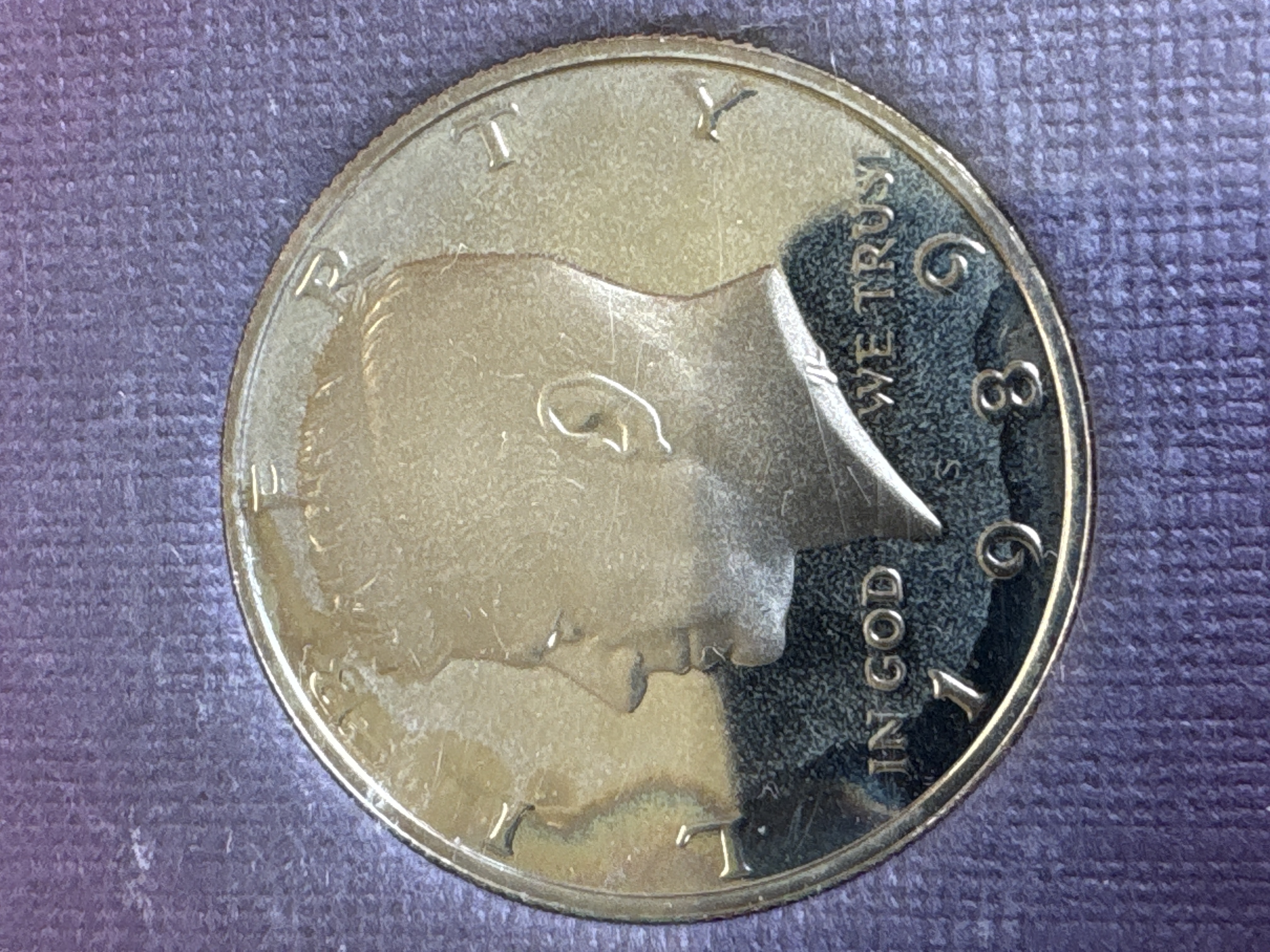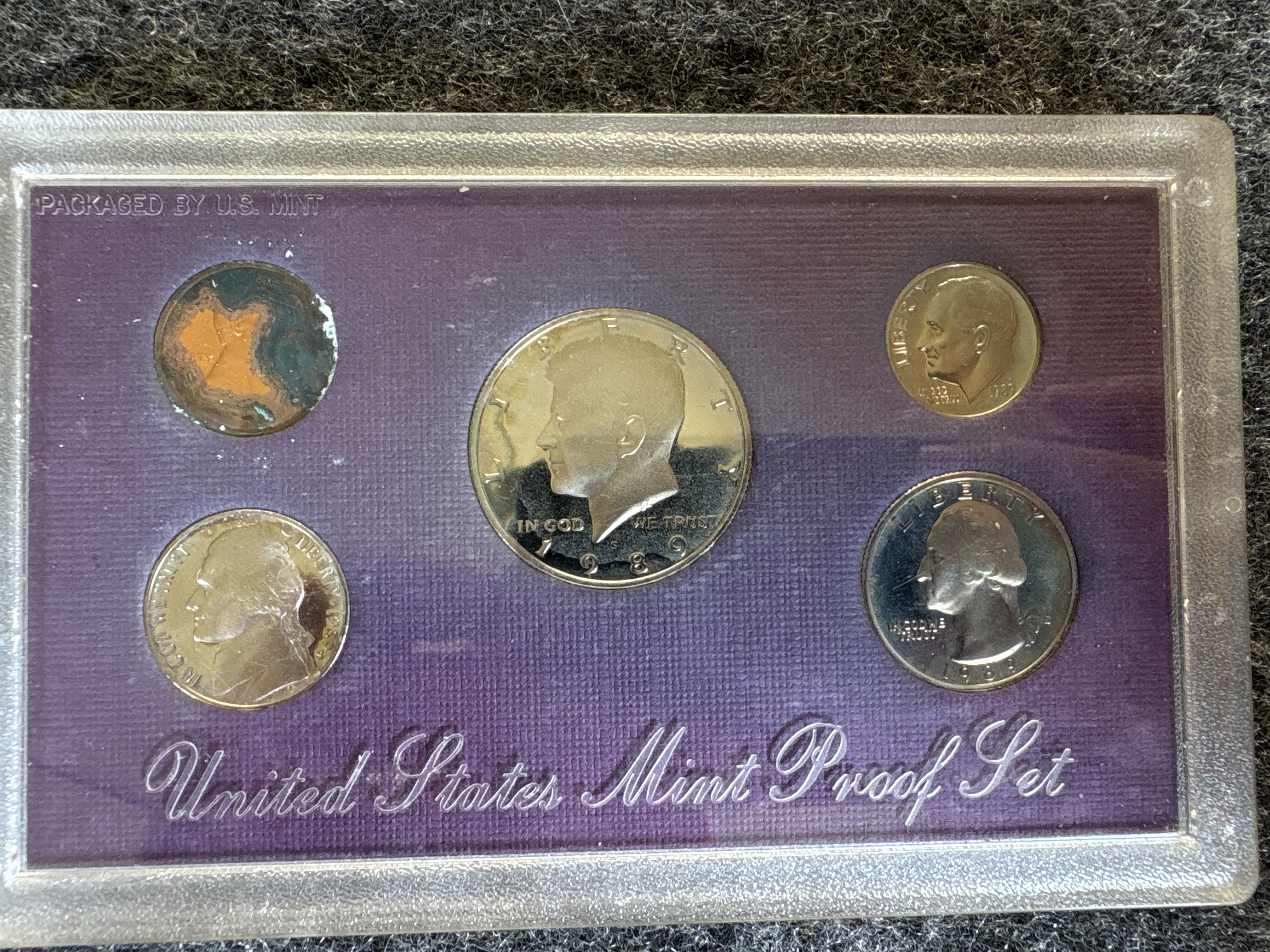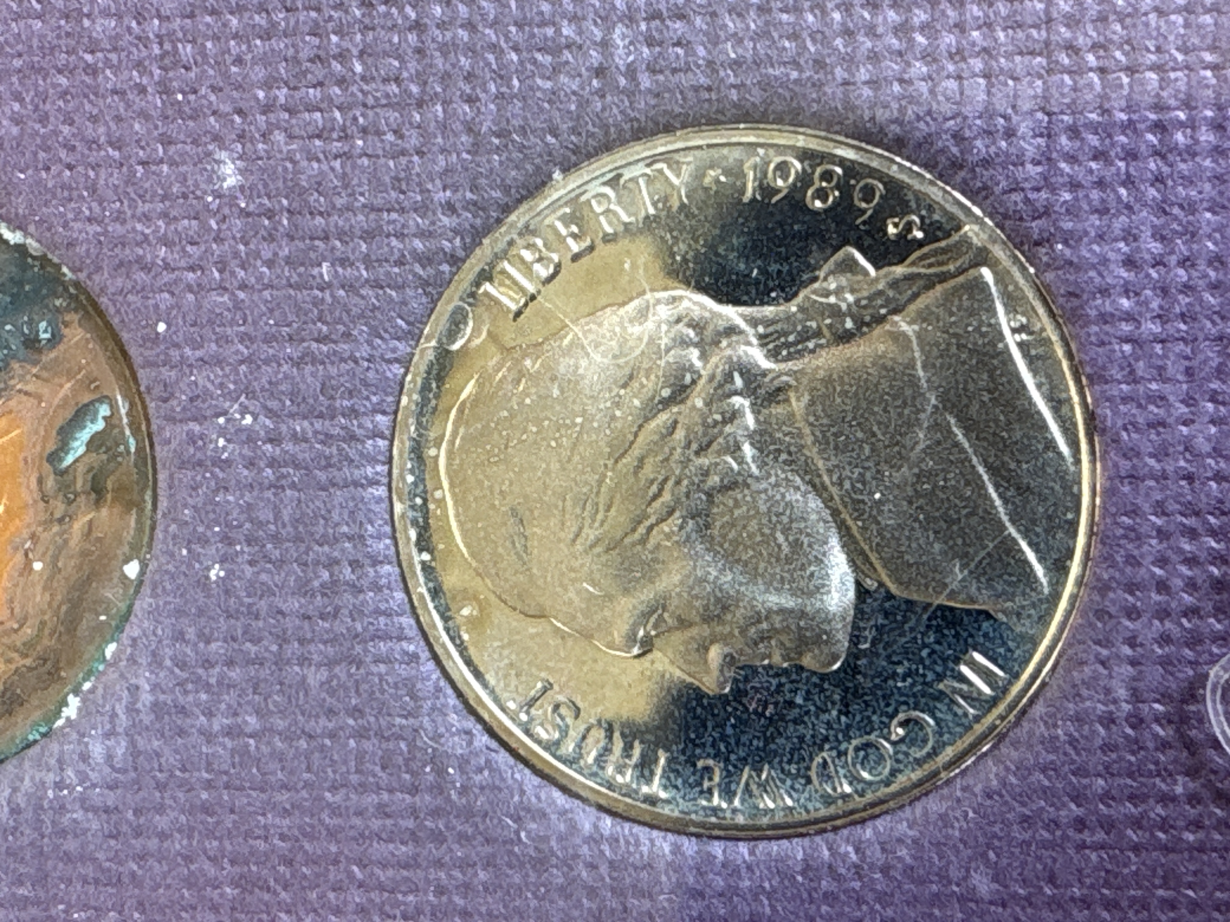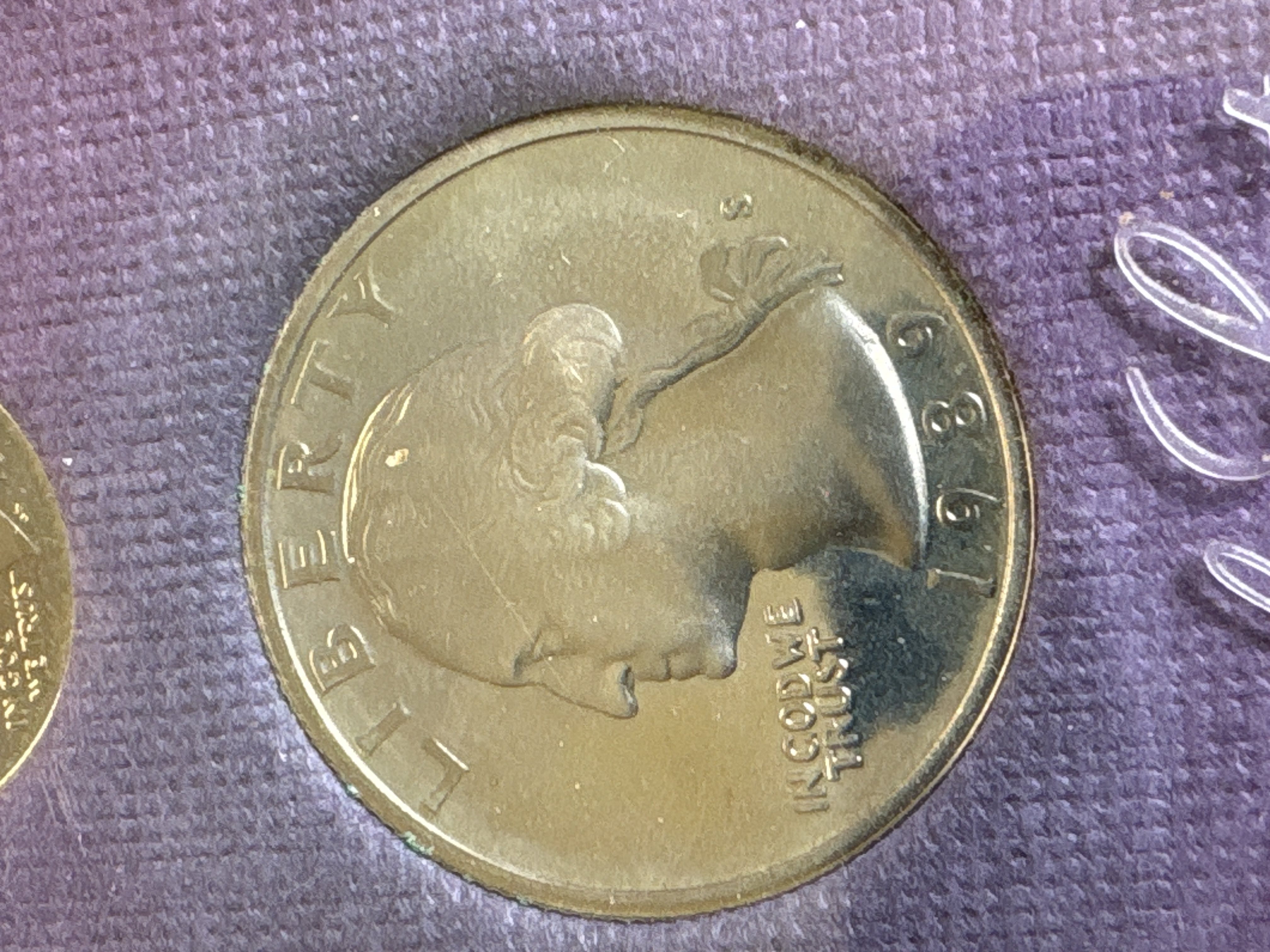 This 1989 United States Mint Proof Set consists of a set of five proof-strike coins including a Kennedy half dollar, Washington quarter, Roosevelt dime, Jefferson nickel, and Lincoln cent. Each coin features the S mint mark, signifying production at the San Francisco Mint. The coins are secured in the original government packaging, which comprises a purple textured plastic insert held within a clear acrylic display case. the case is embossed with the inscriptions PACKAGED BY U.S. MINT and United States Mint Proof Set. The reverse of the acrylic case features an embossed Great Seal of the United States.