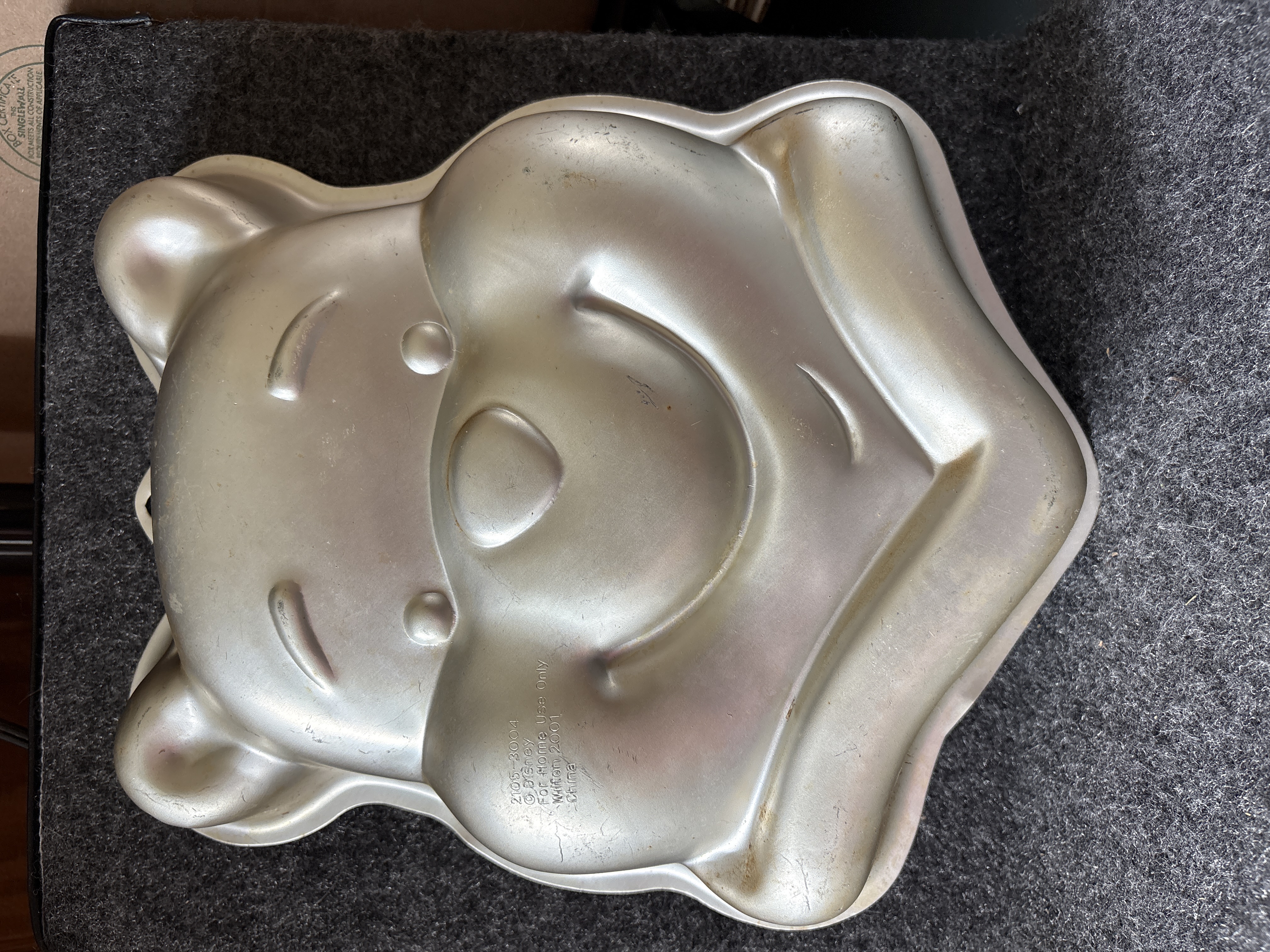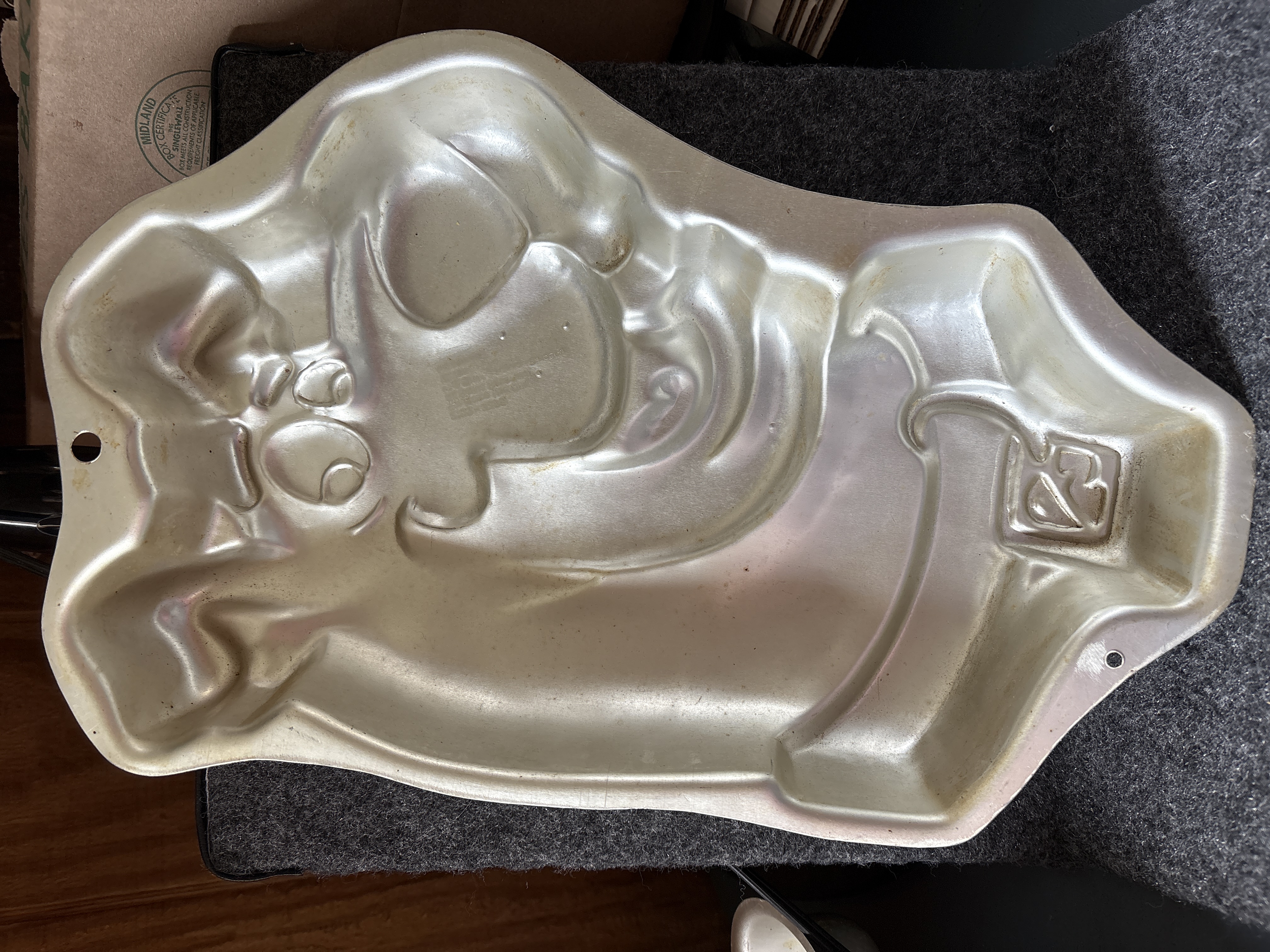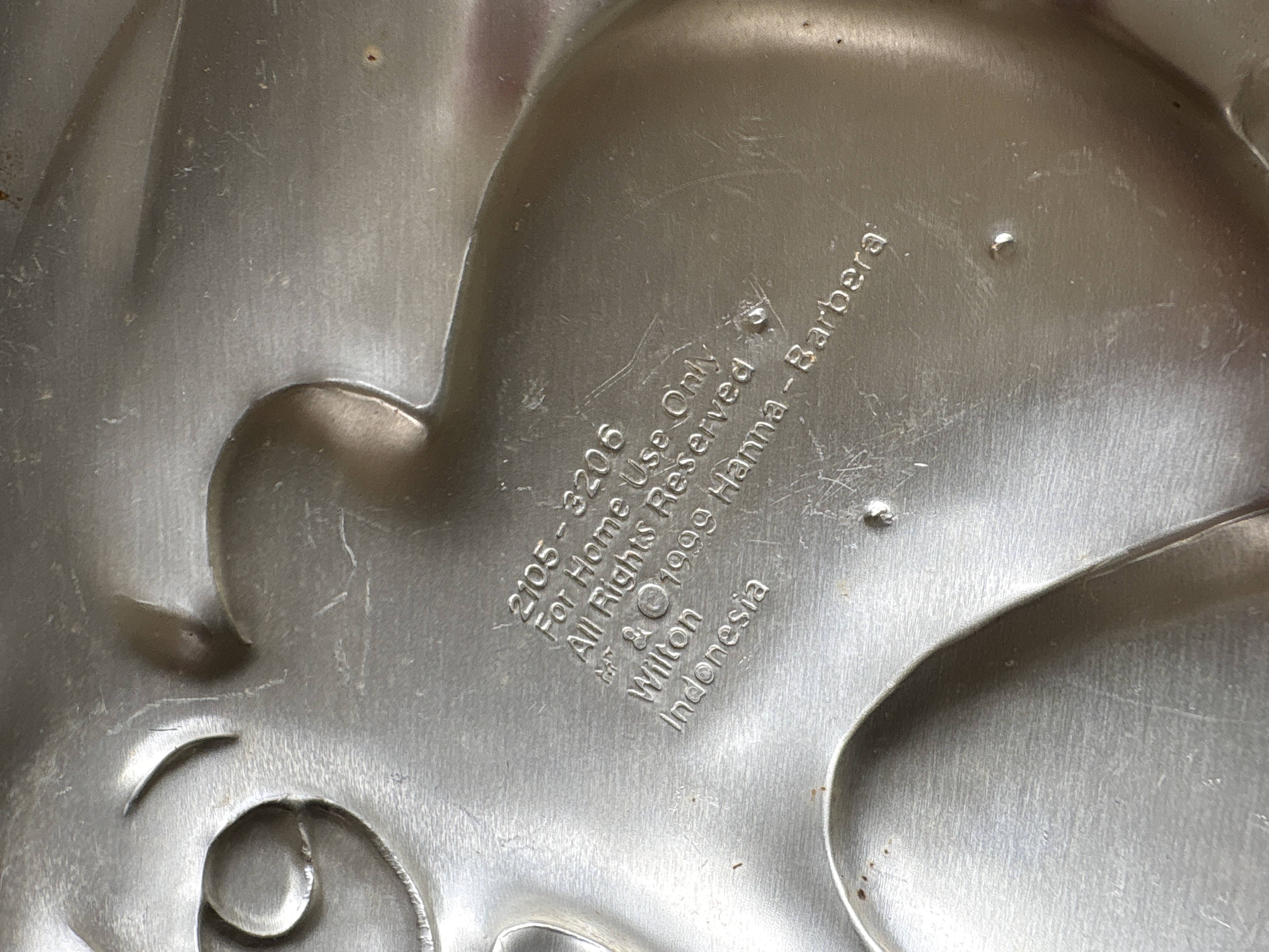 Two silver-colored aluminum character cake pans featuring a 2001 Disney Winnie the Pooh and a 1999 Hanna-Barbera Scooby-Doo.